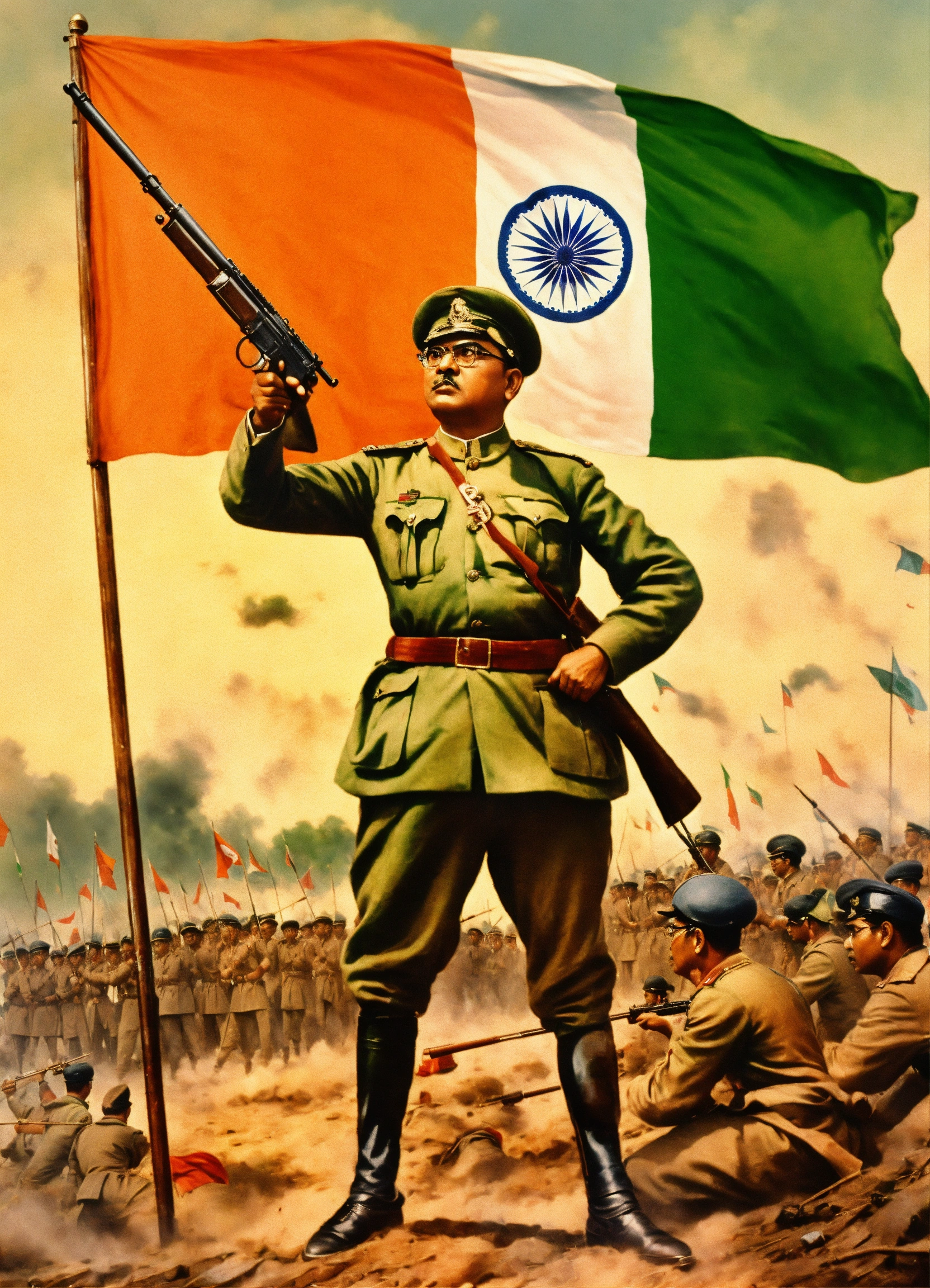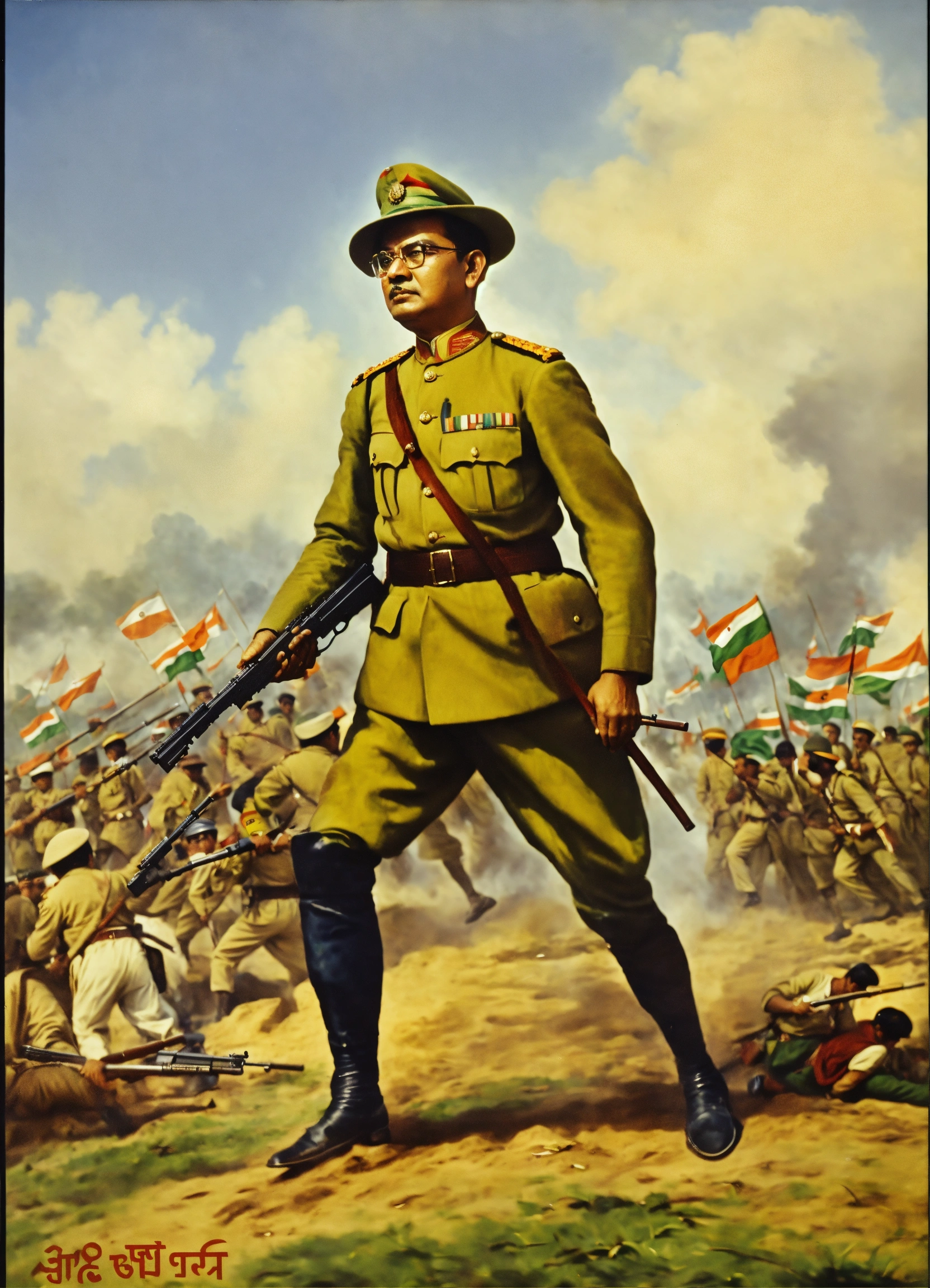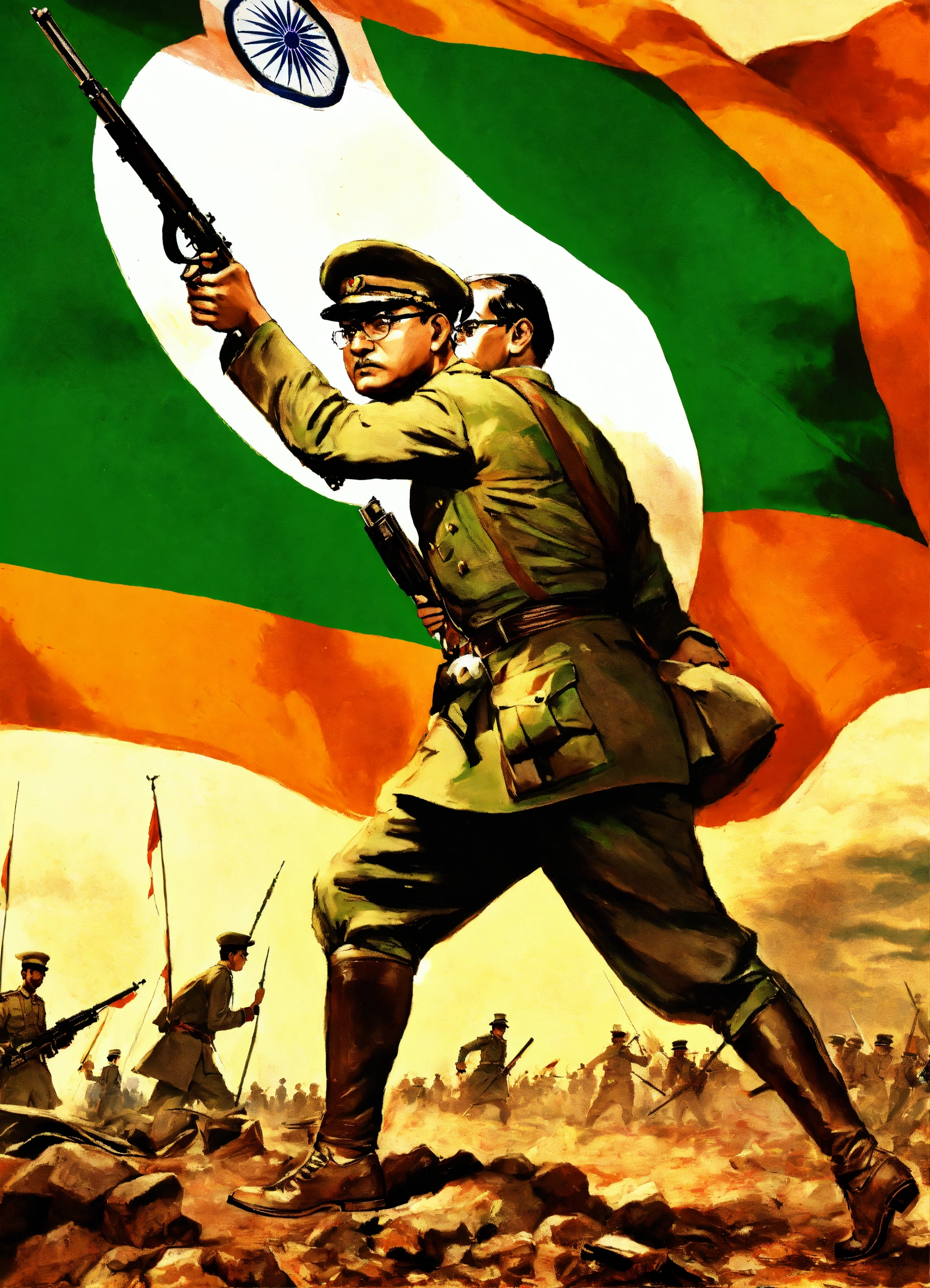 Subash chandra bose fighting with gun with indian flag at a battlefield