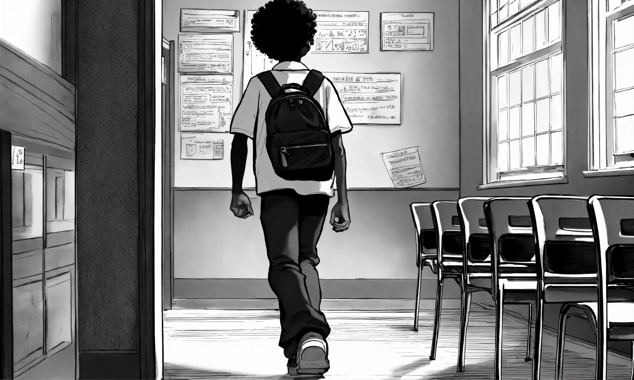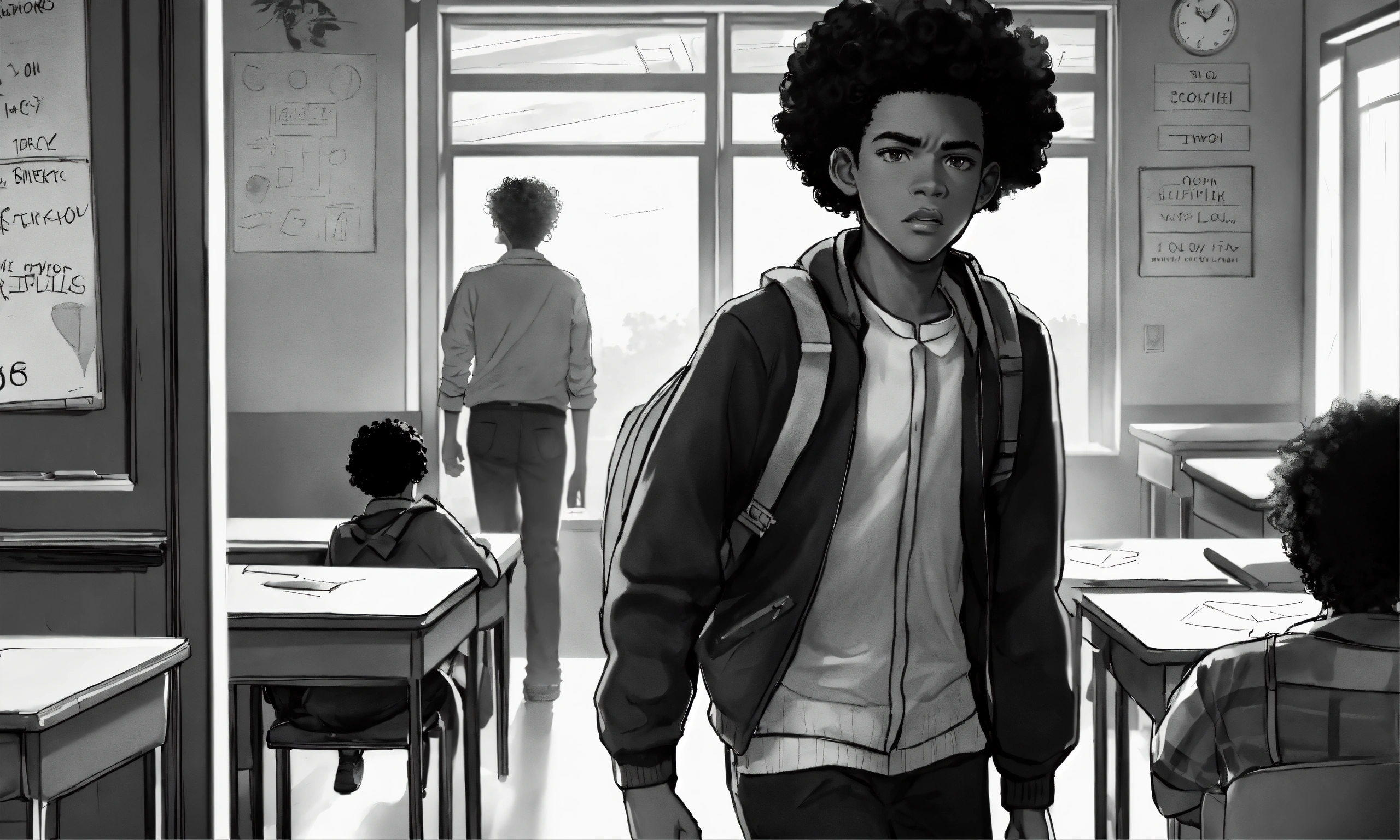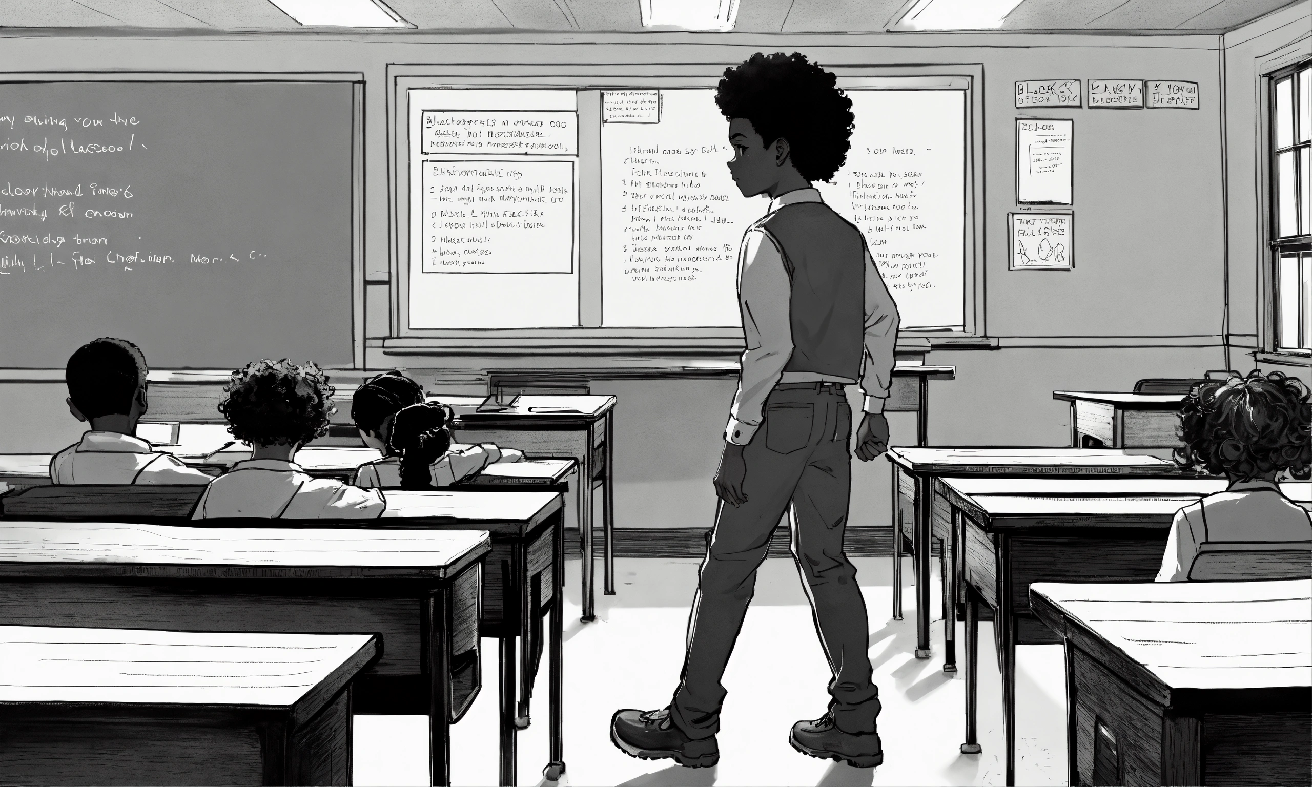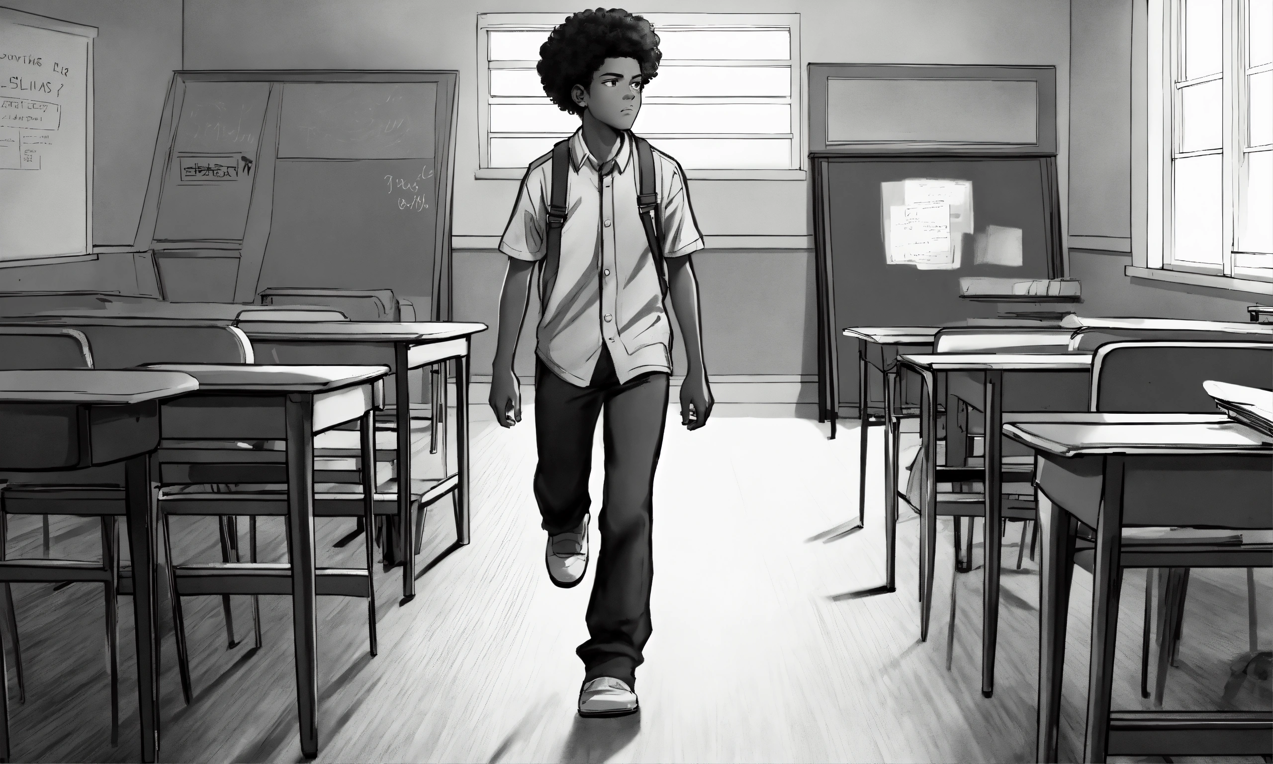 A black and white illustration of a 16 year old black boy, determined, full body shot, stomping foot, with curly hair, walking into classroom, determined, serious face