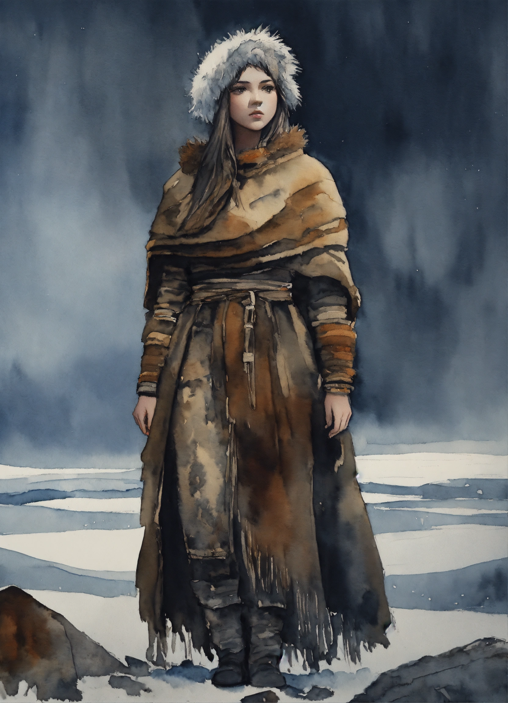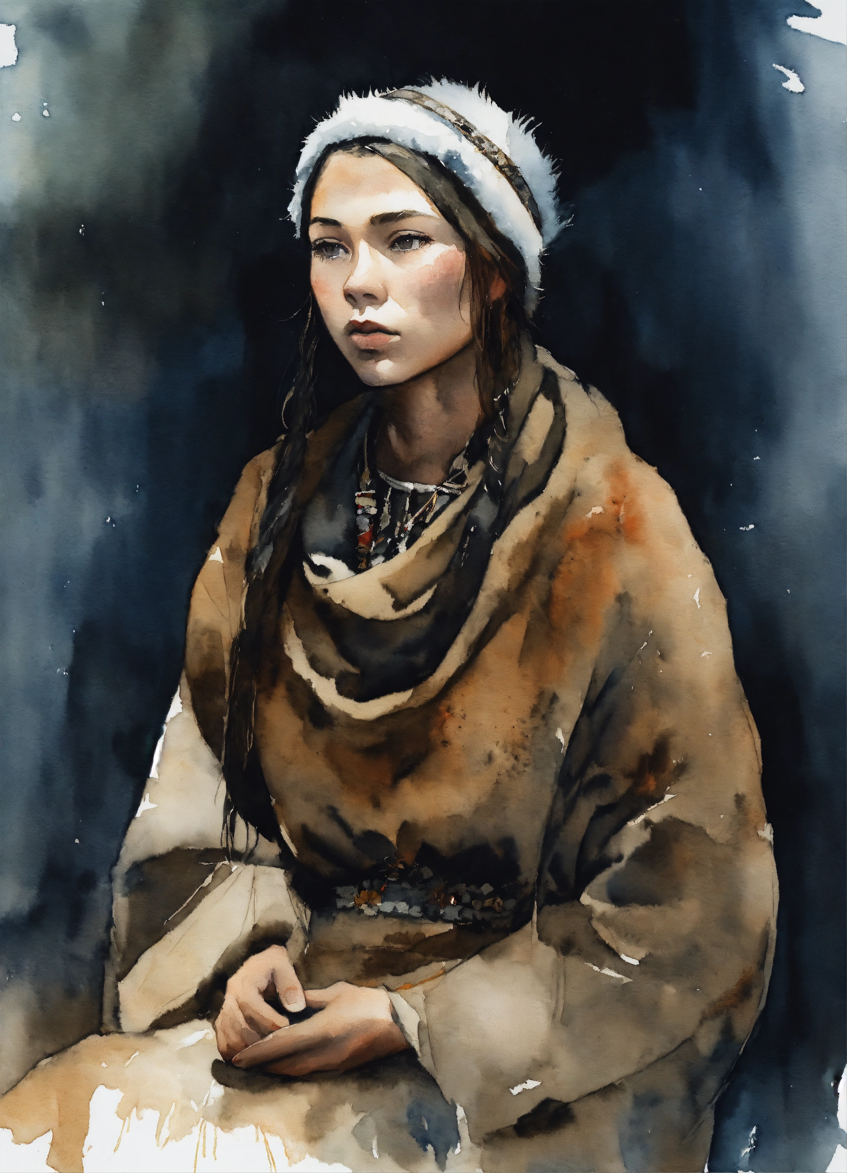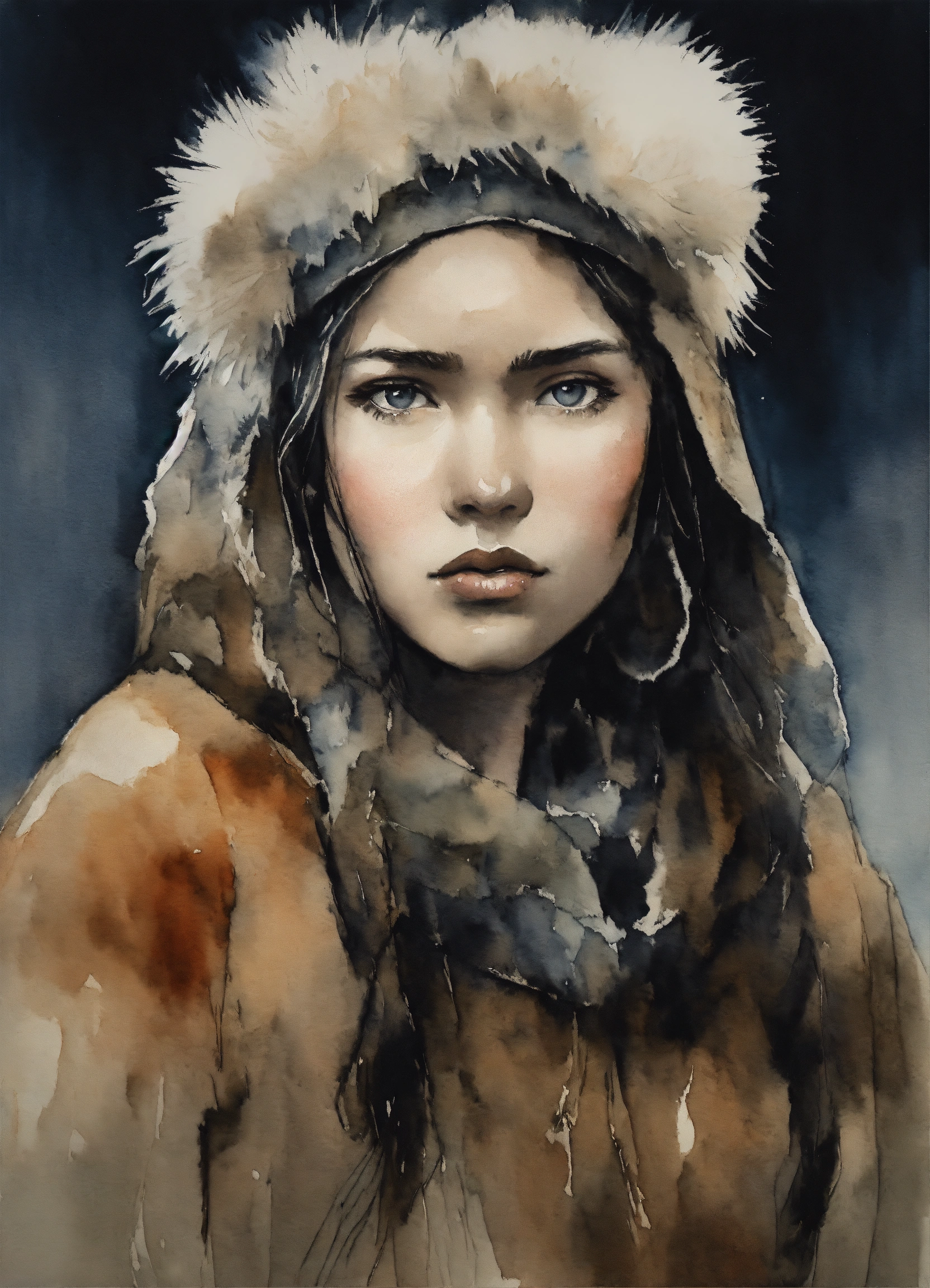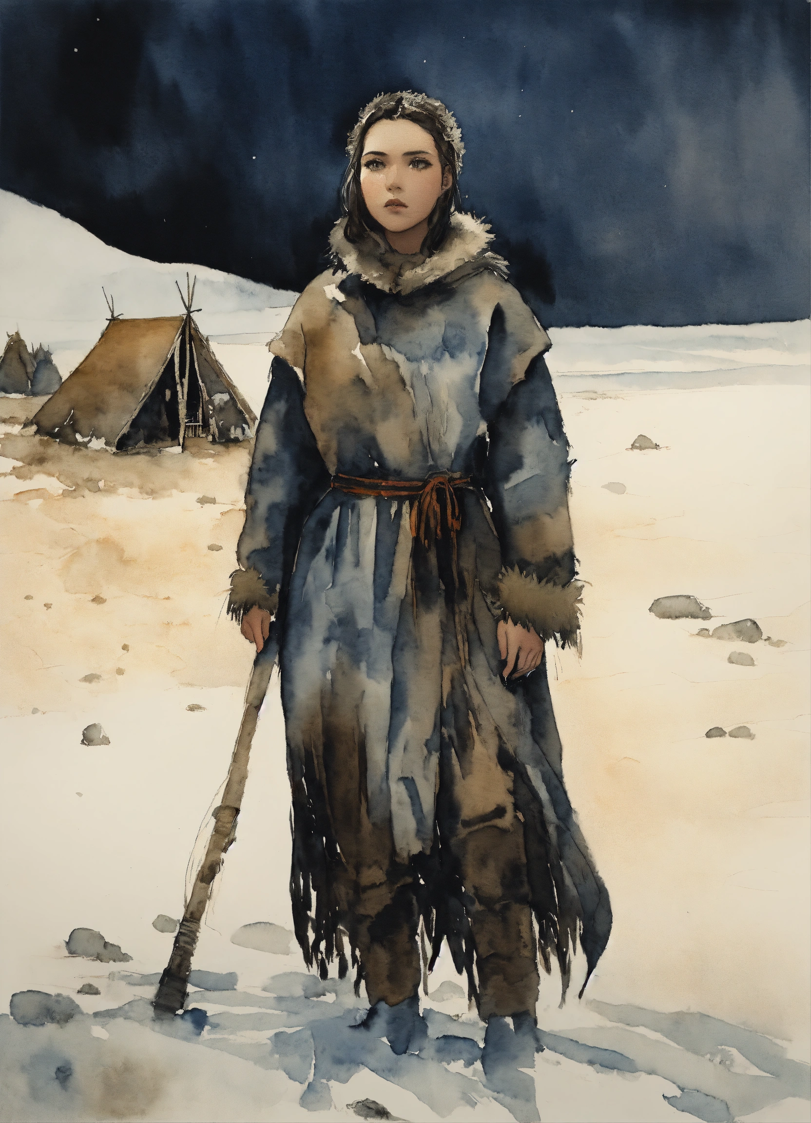 Illustration by tom björklund of a nivkh young woman wearing arctic paleolithic clothing. watercolor painting by tom björklund, dark hues, gloomy and depressing, masterpiece.