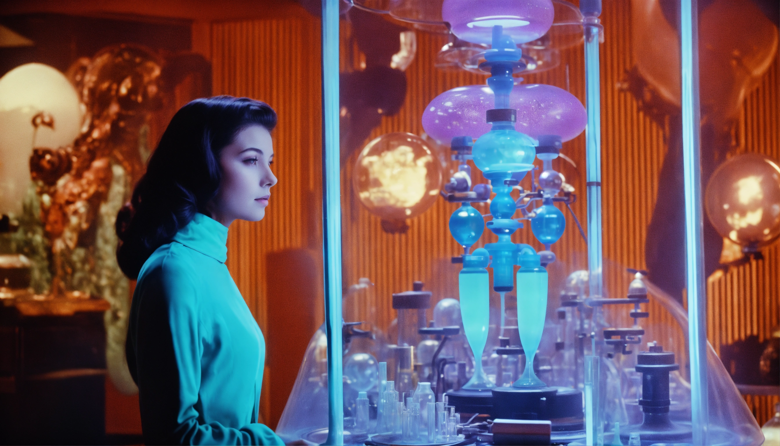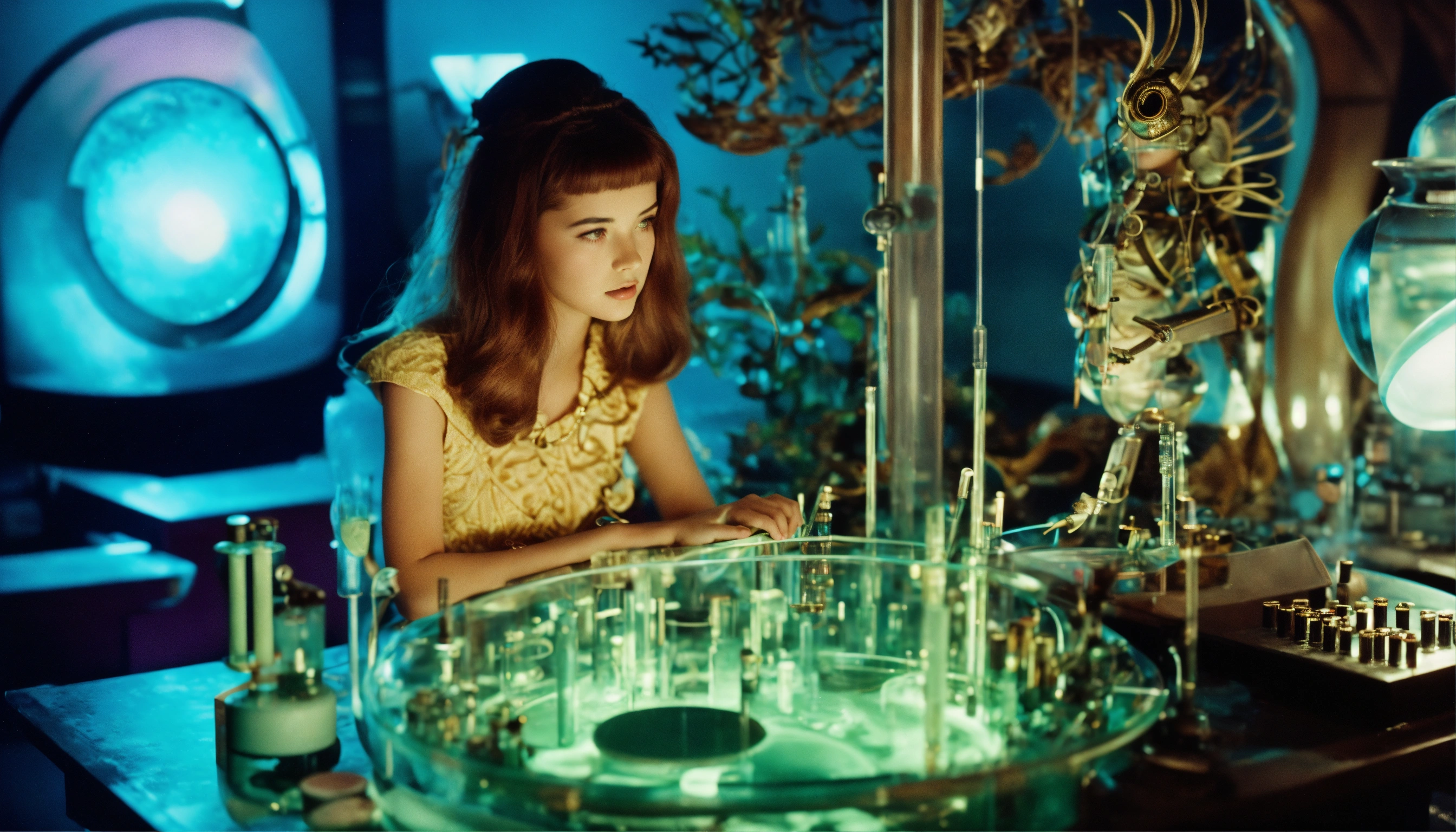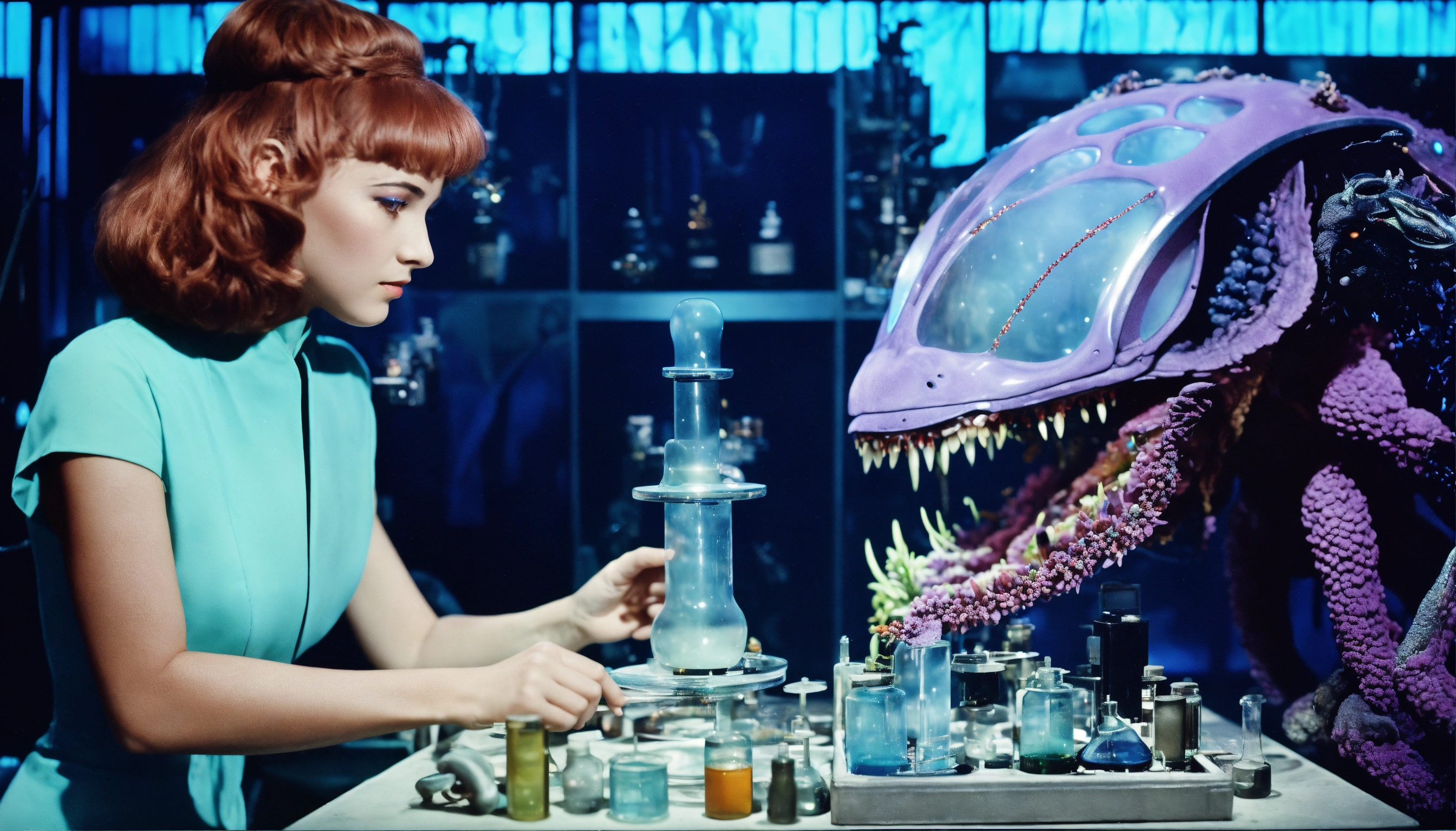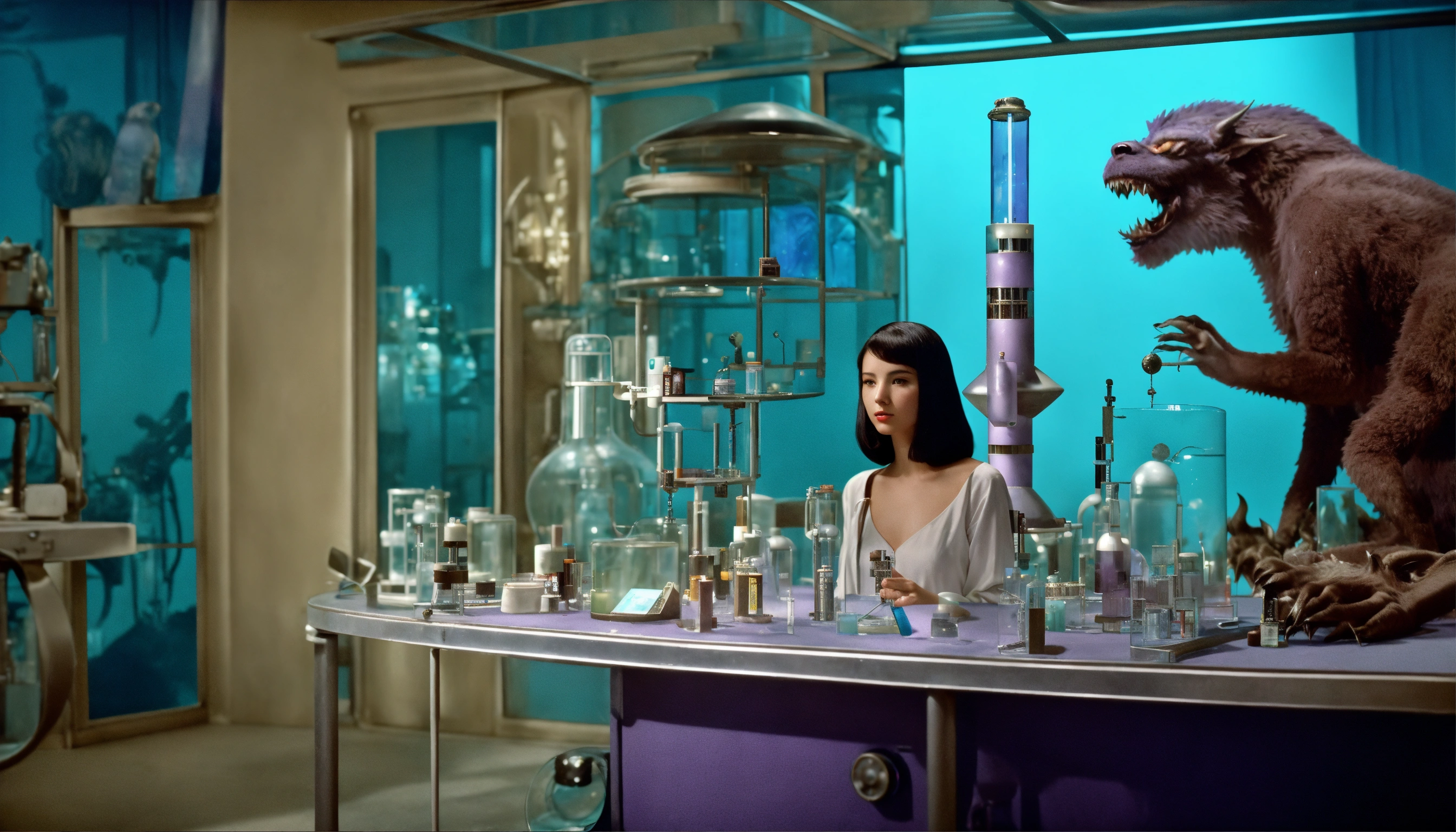 1964, old photography, kodak film colour, surreal sci fi, old film, unknown beautiful 16 years old futuristic fortune teller lady with a big unknown fantasy beast monster, futuristic glass lab with myriad of research instruments, a myriad of futuristic test tubes, pale cyan blue and pale purple, regenerative plants and ai and big unknown magic beast