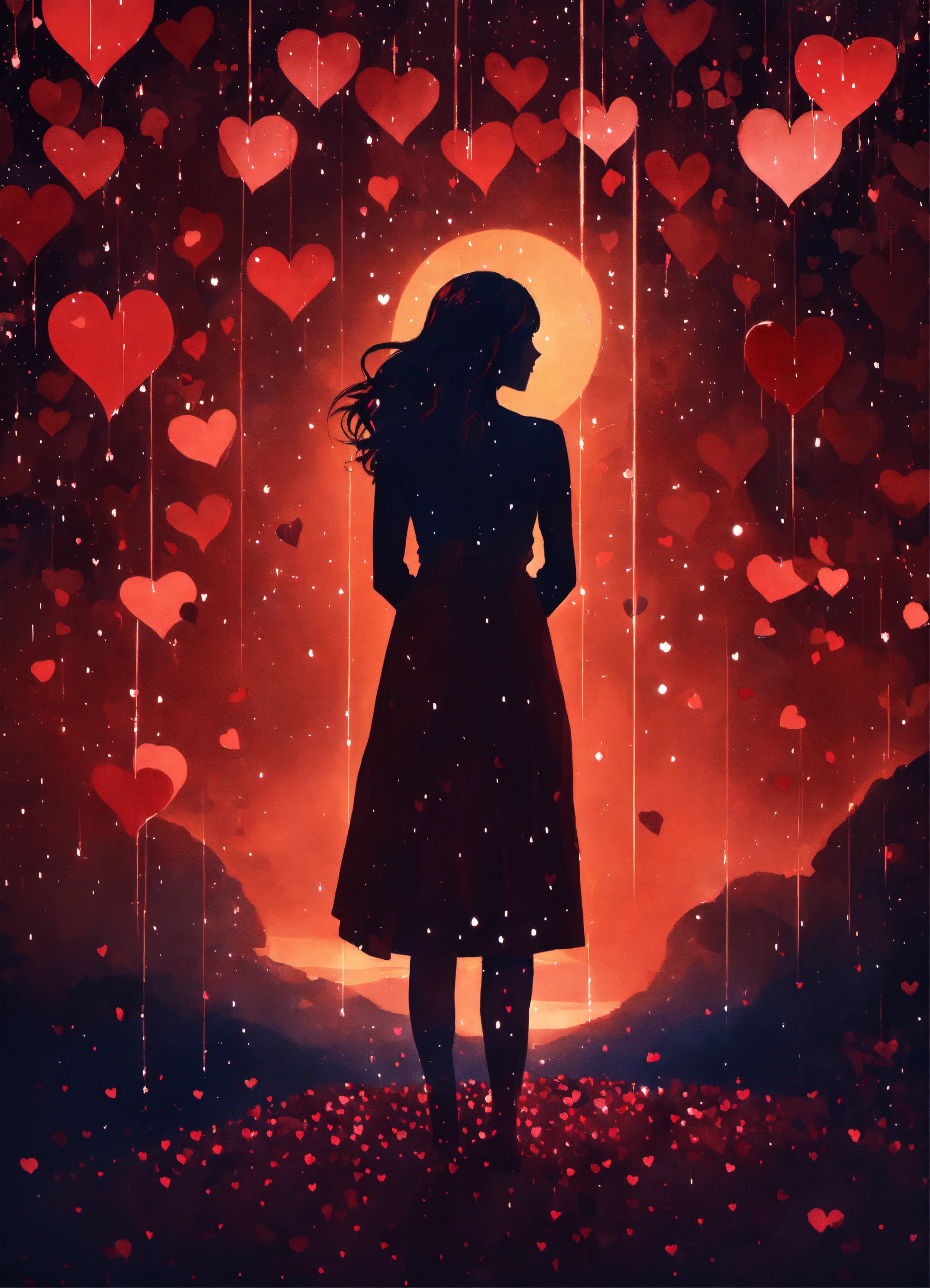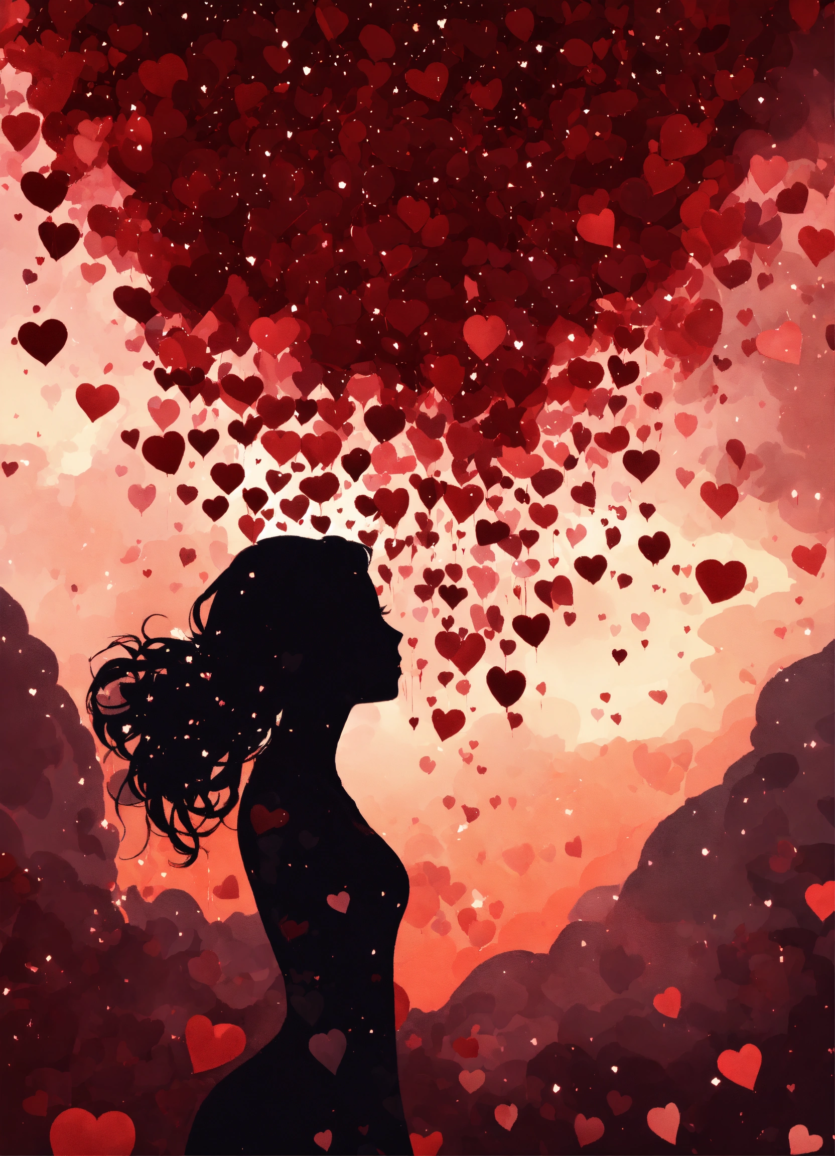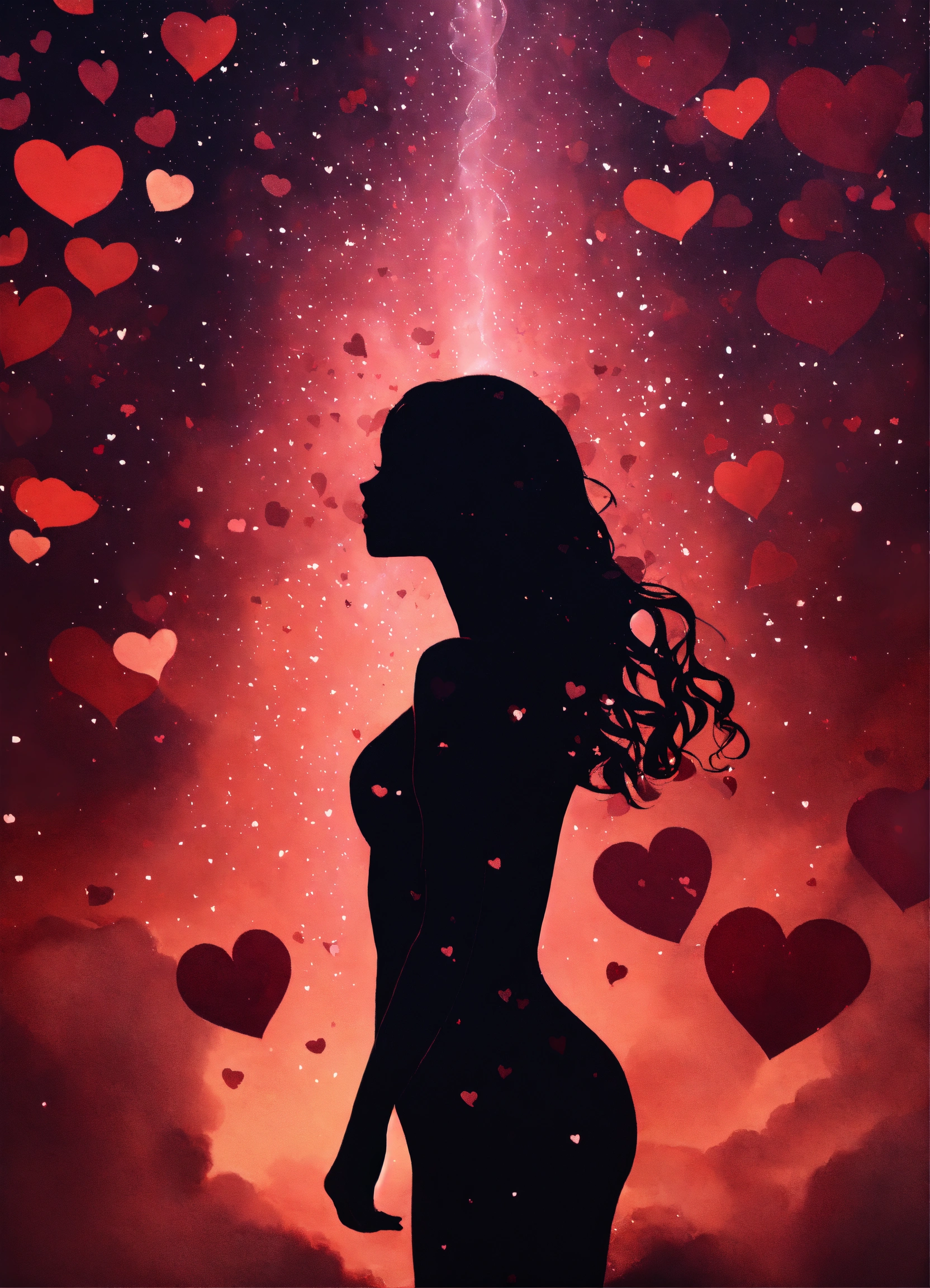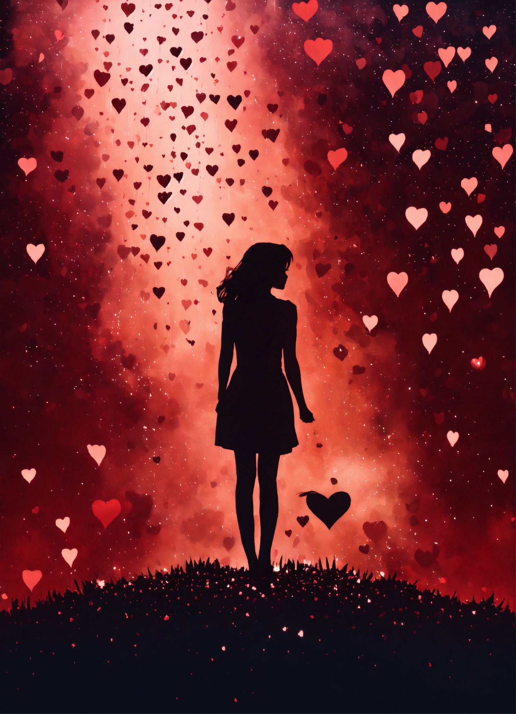 A garnet constallation background with a rain of hearts in front with the silhouette of a woman