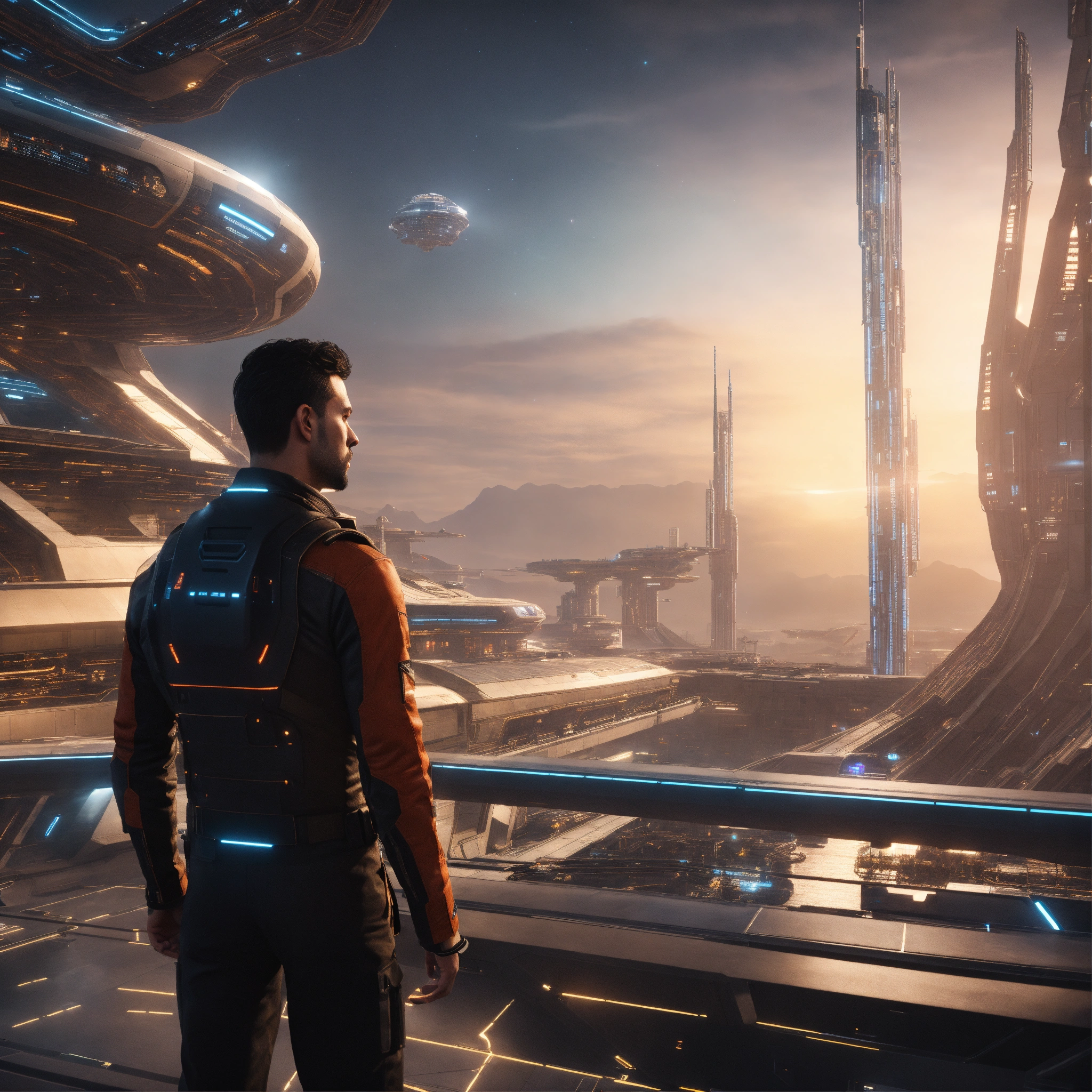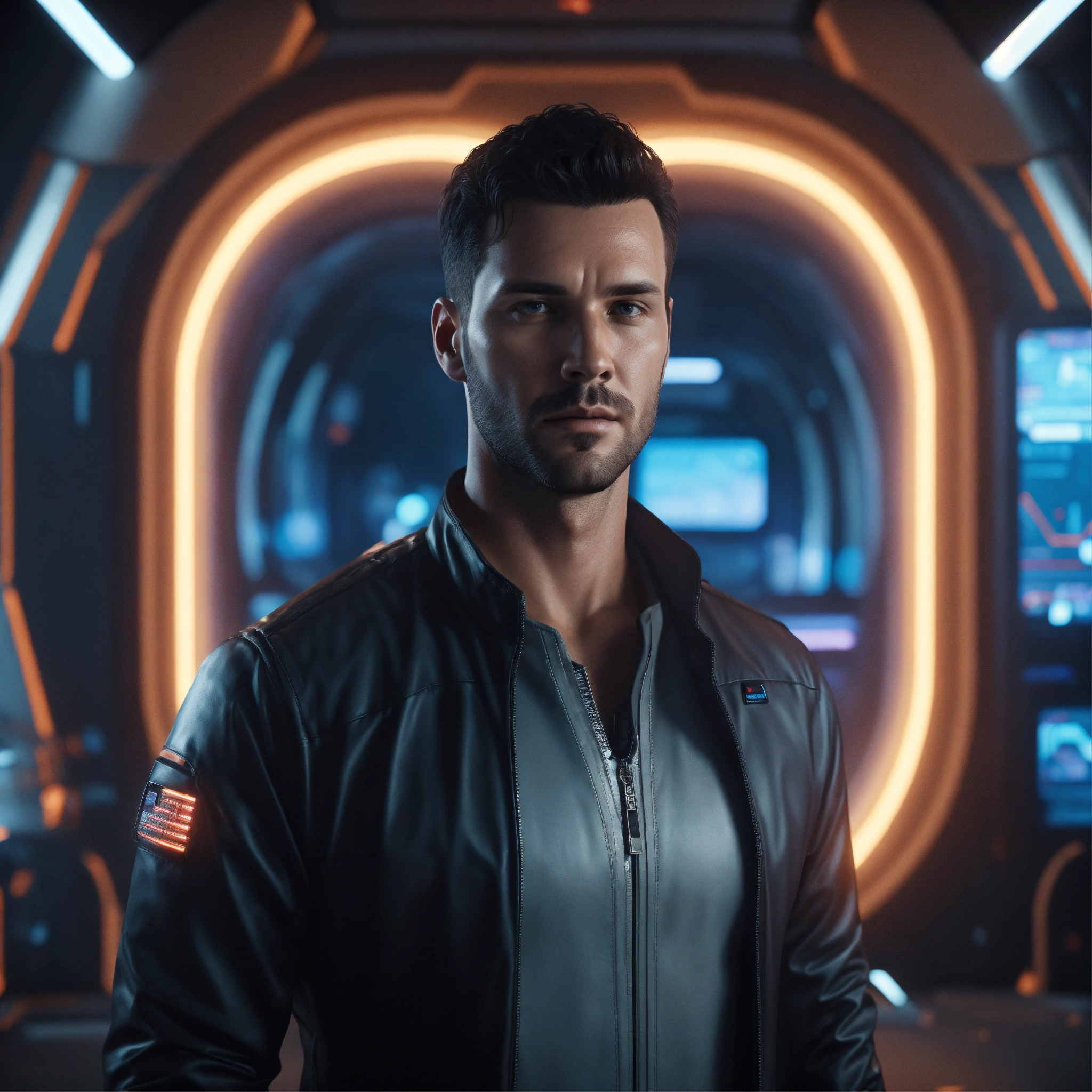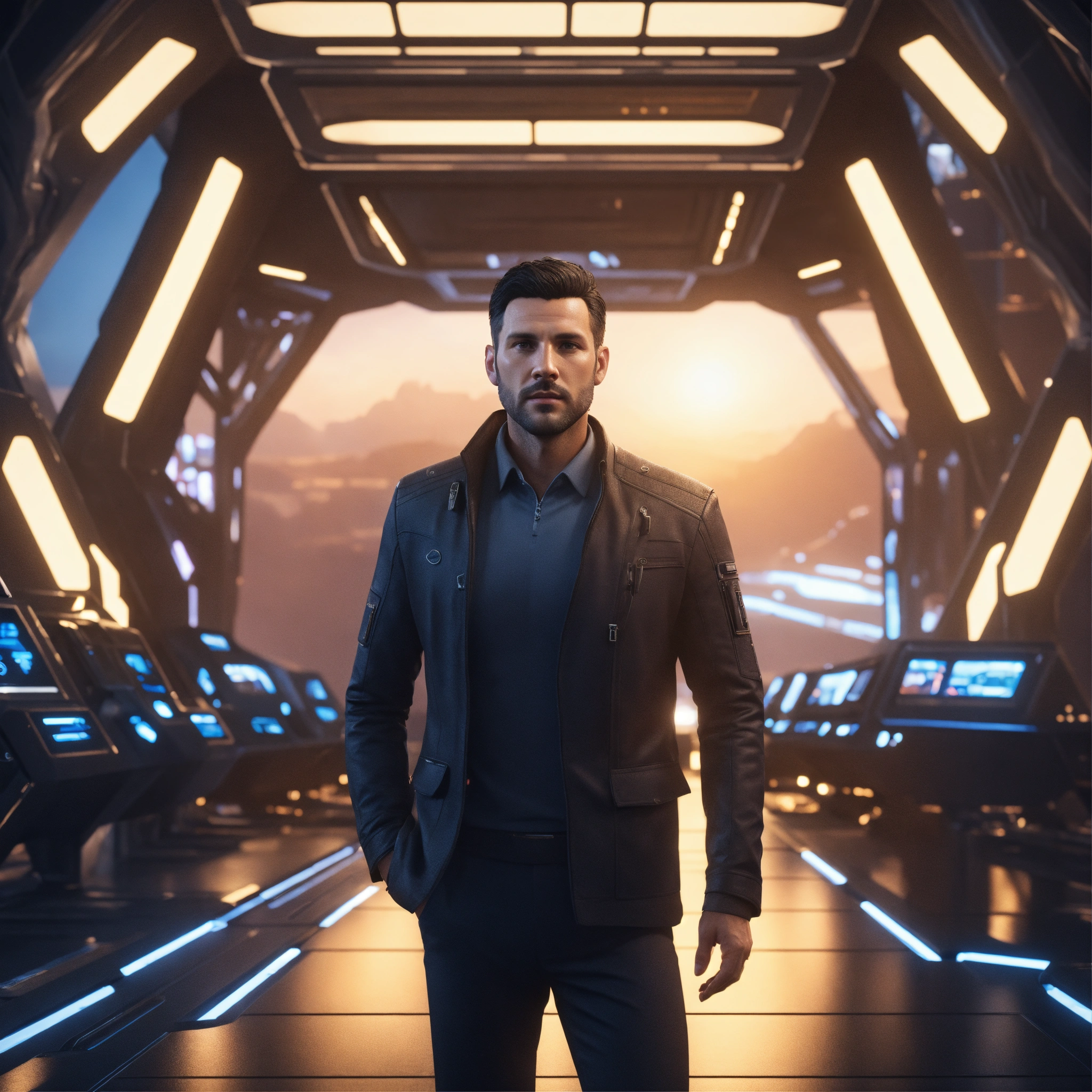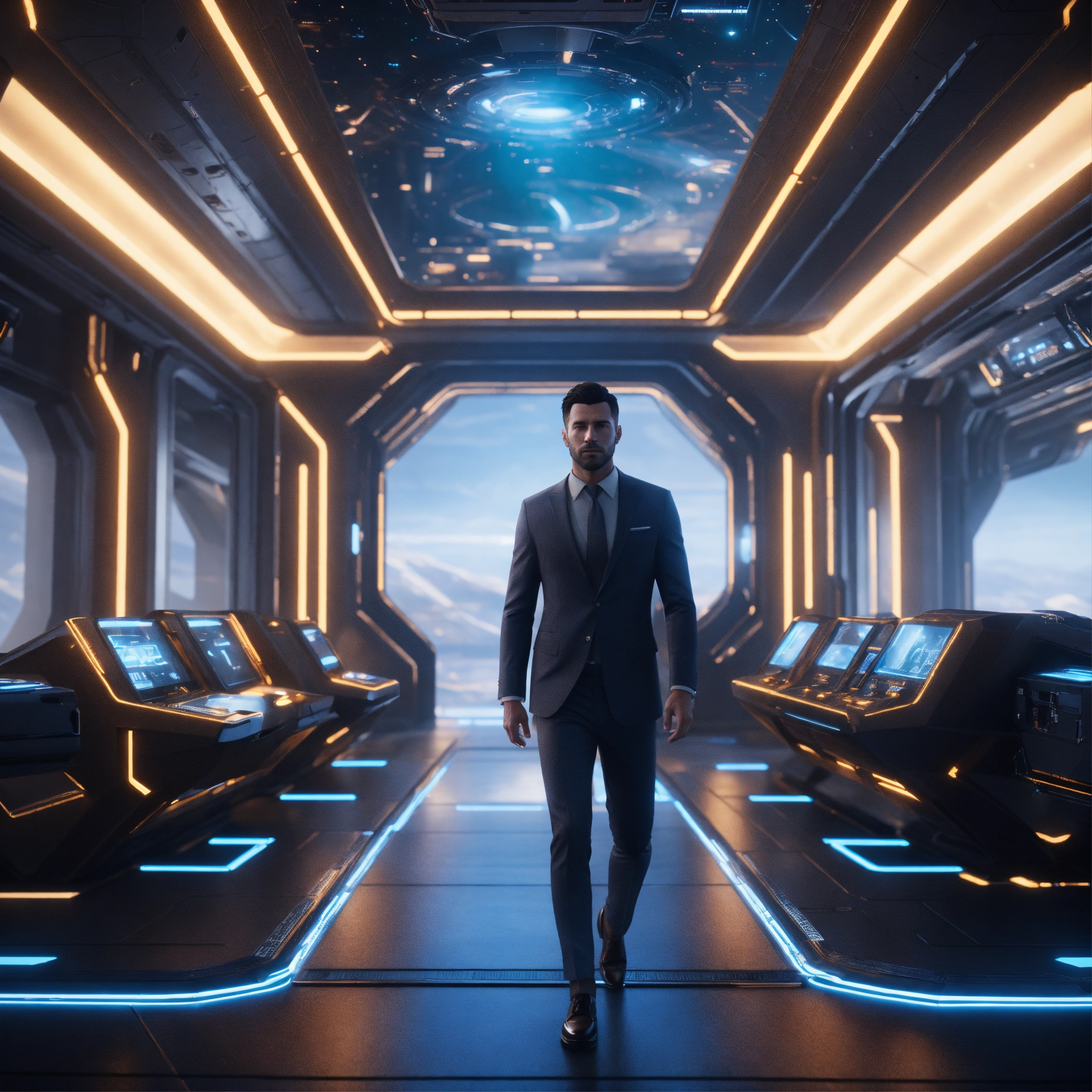 35 year old clean cut man with dark hair boarding a luxurious hi tech space port, realistic, futuristic, sci-fi, 8k, unreal engine