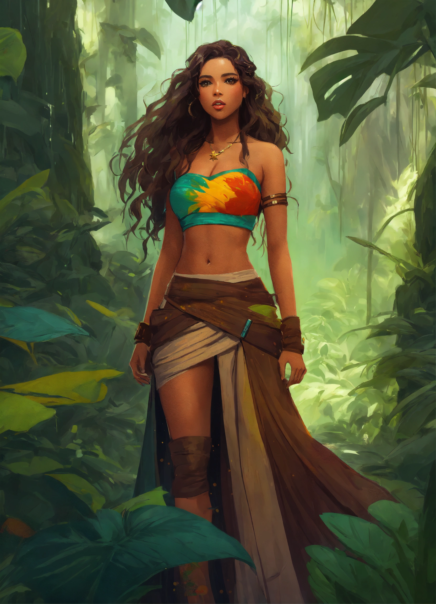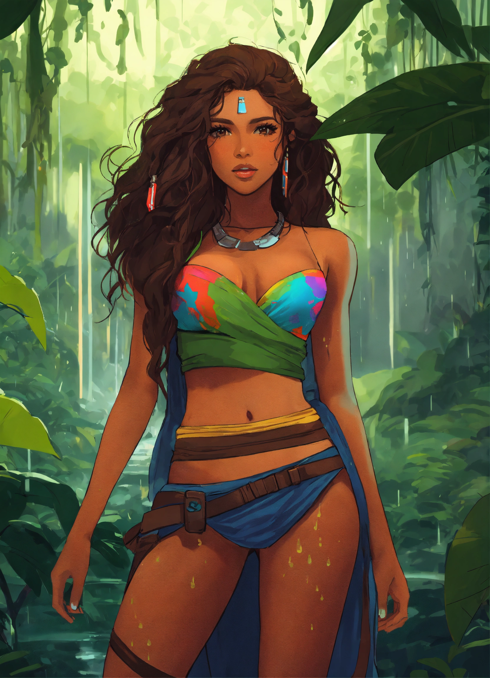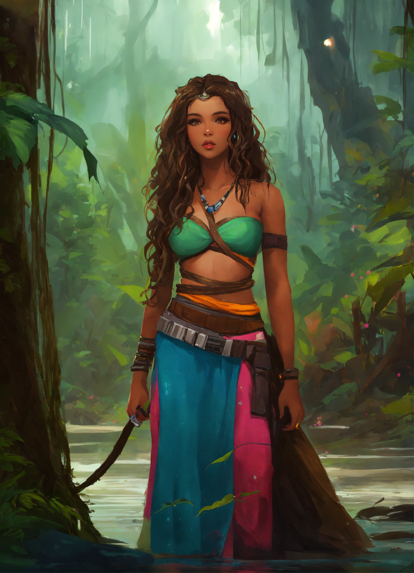 Digital art of a pretty brown star wars woman with long wavy hair wearing a colorful bandeau top and slit skirt. in a muddy, rainy jungle with vines.