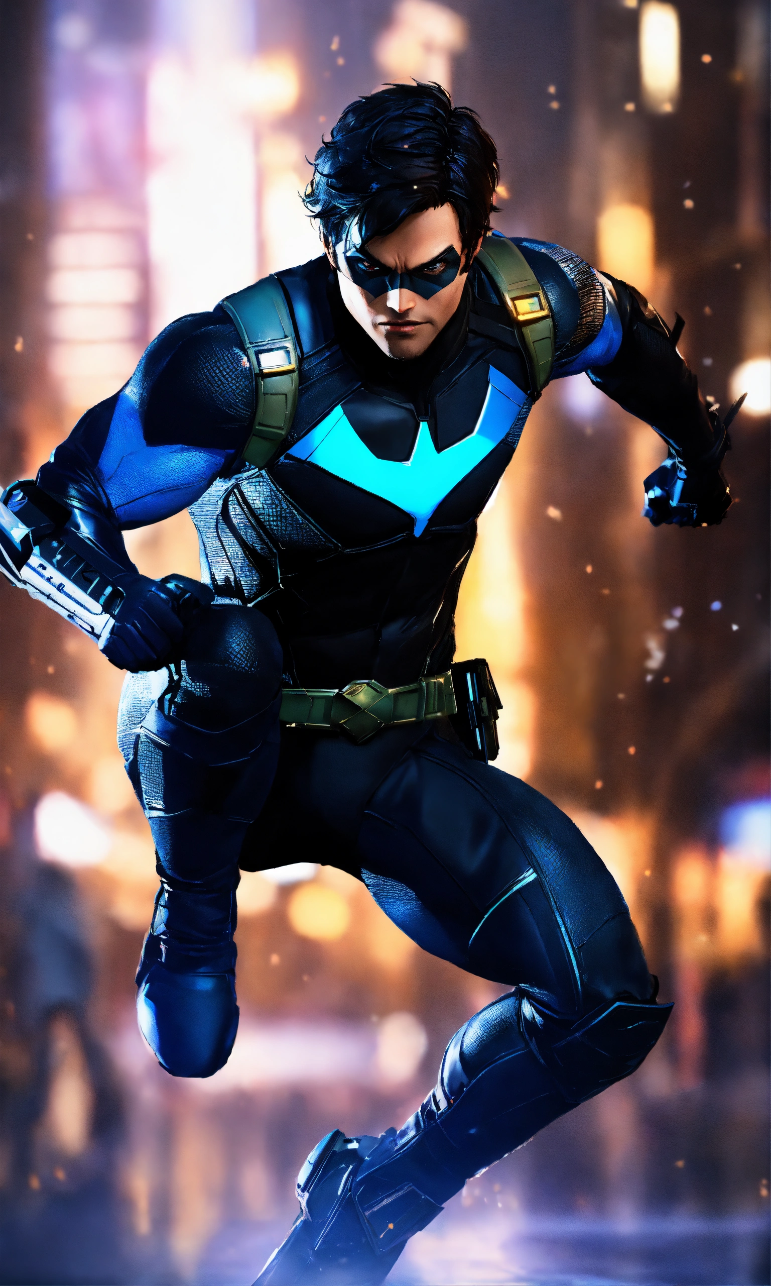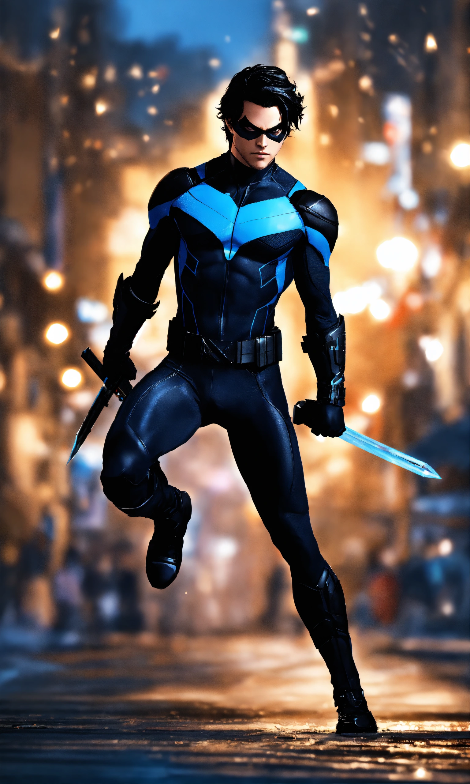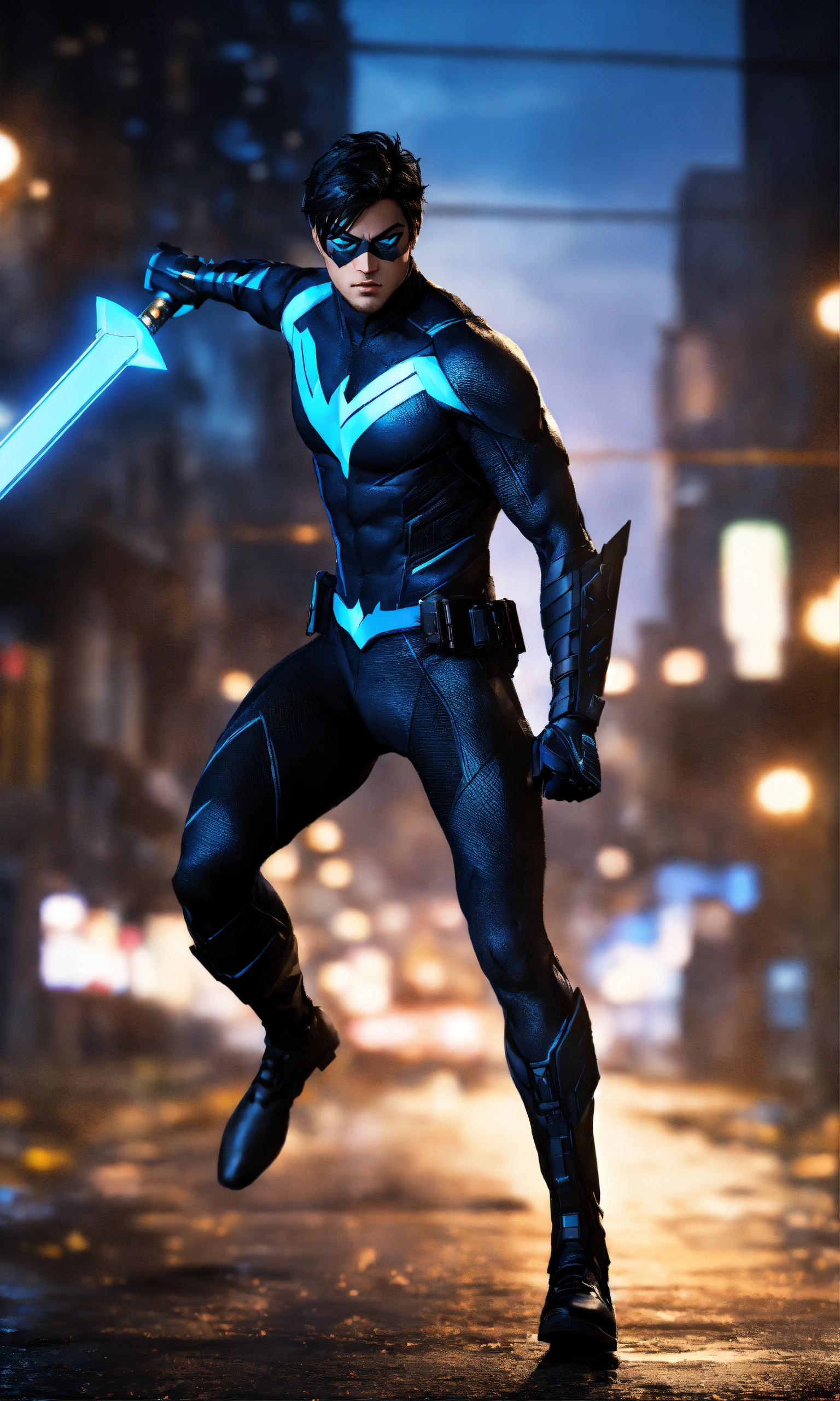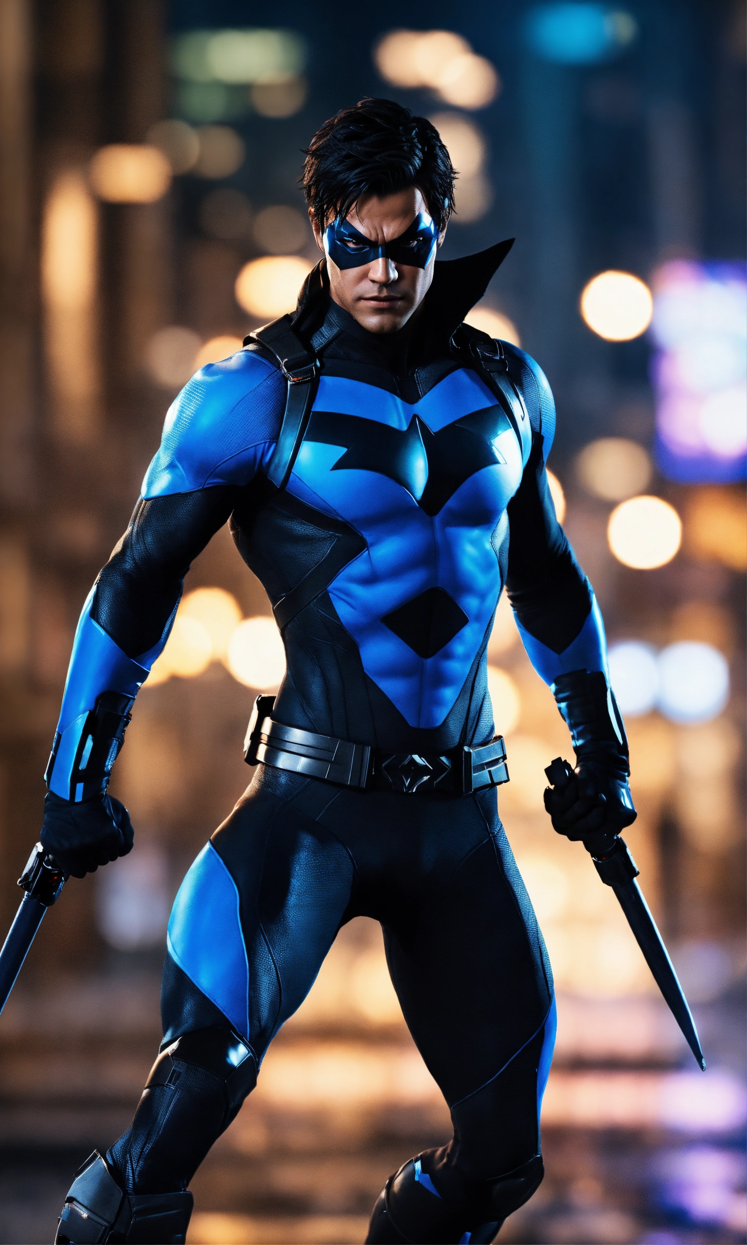 Nightwing, holding batons, action shot, feeling of a chase, stunning unreal engine render, bokeh effect, lights, cityscape in background