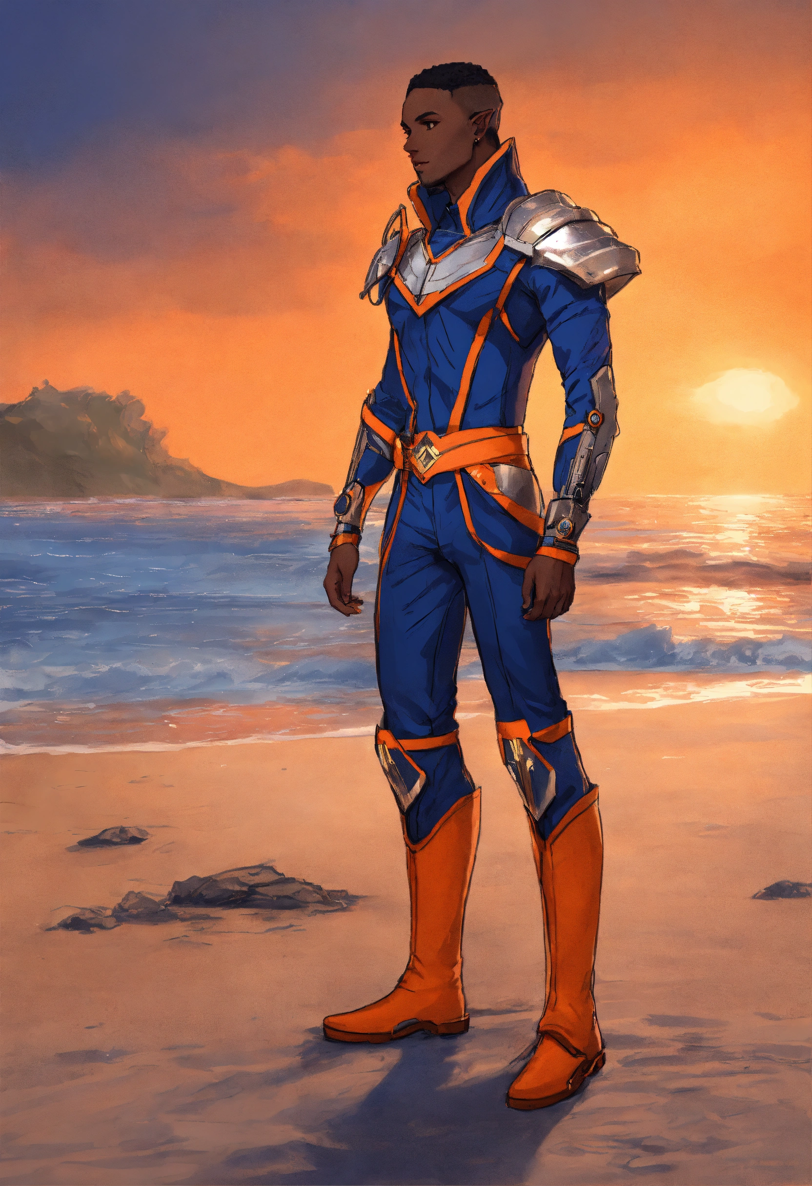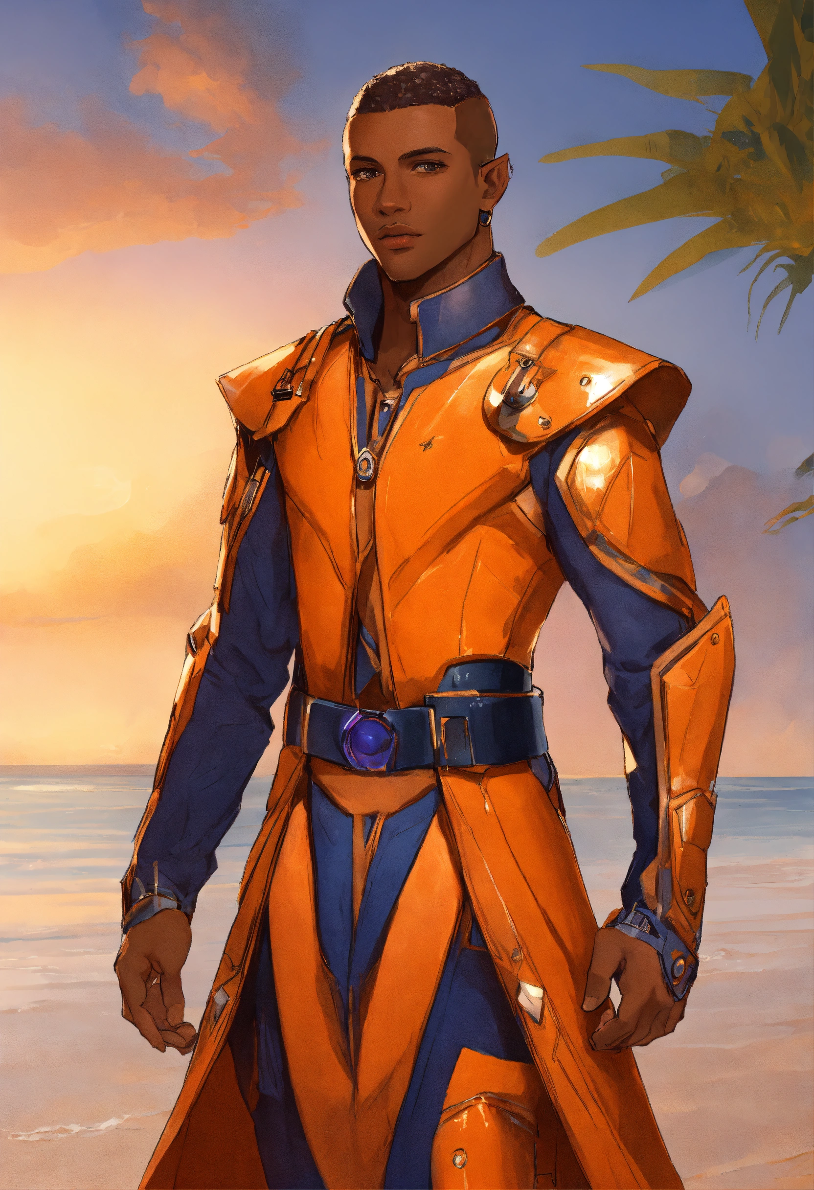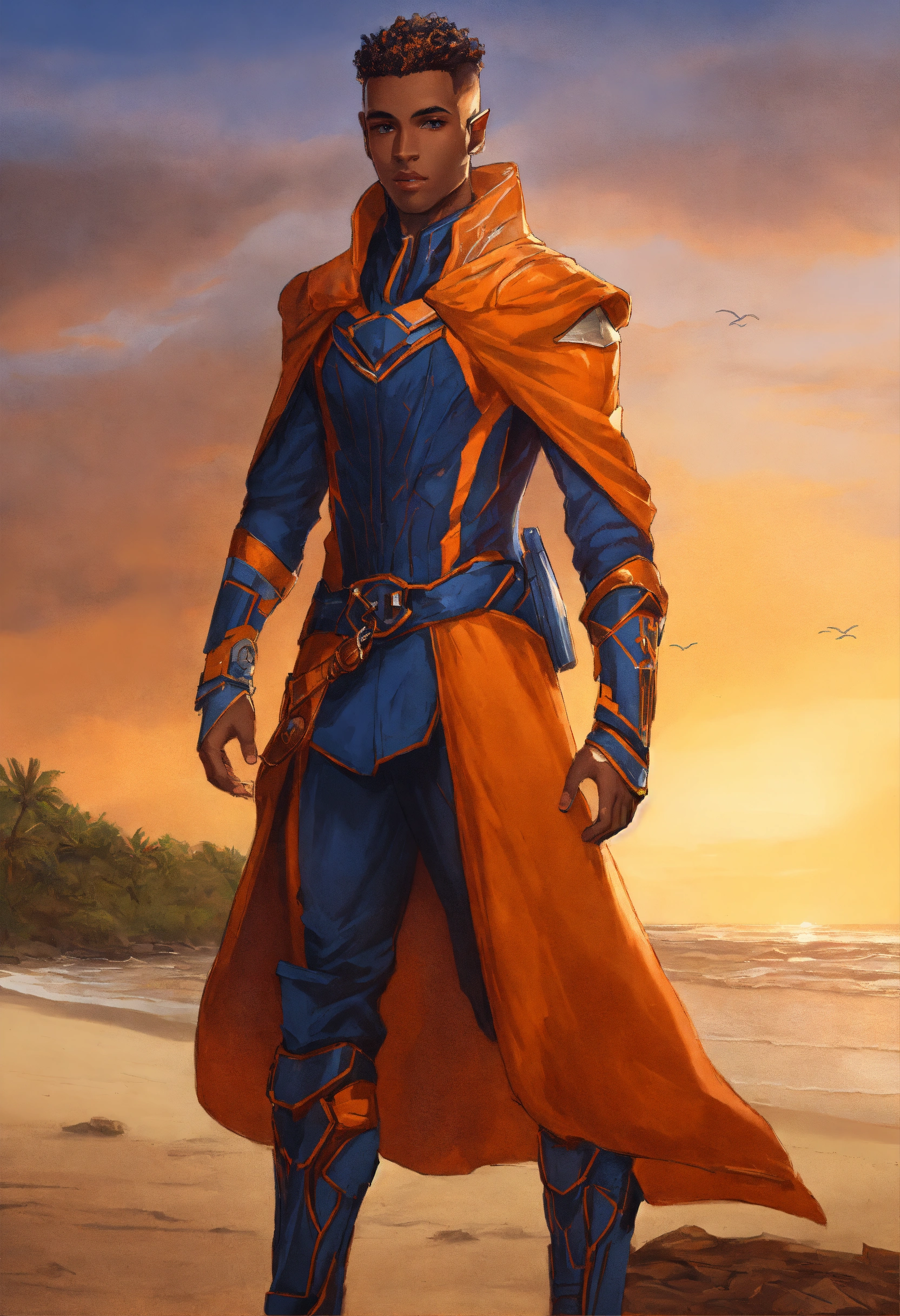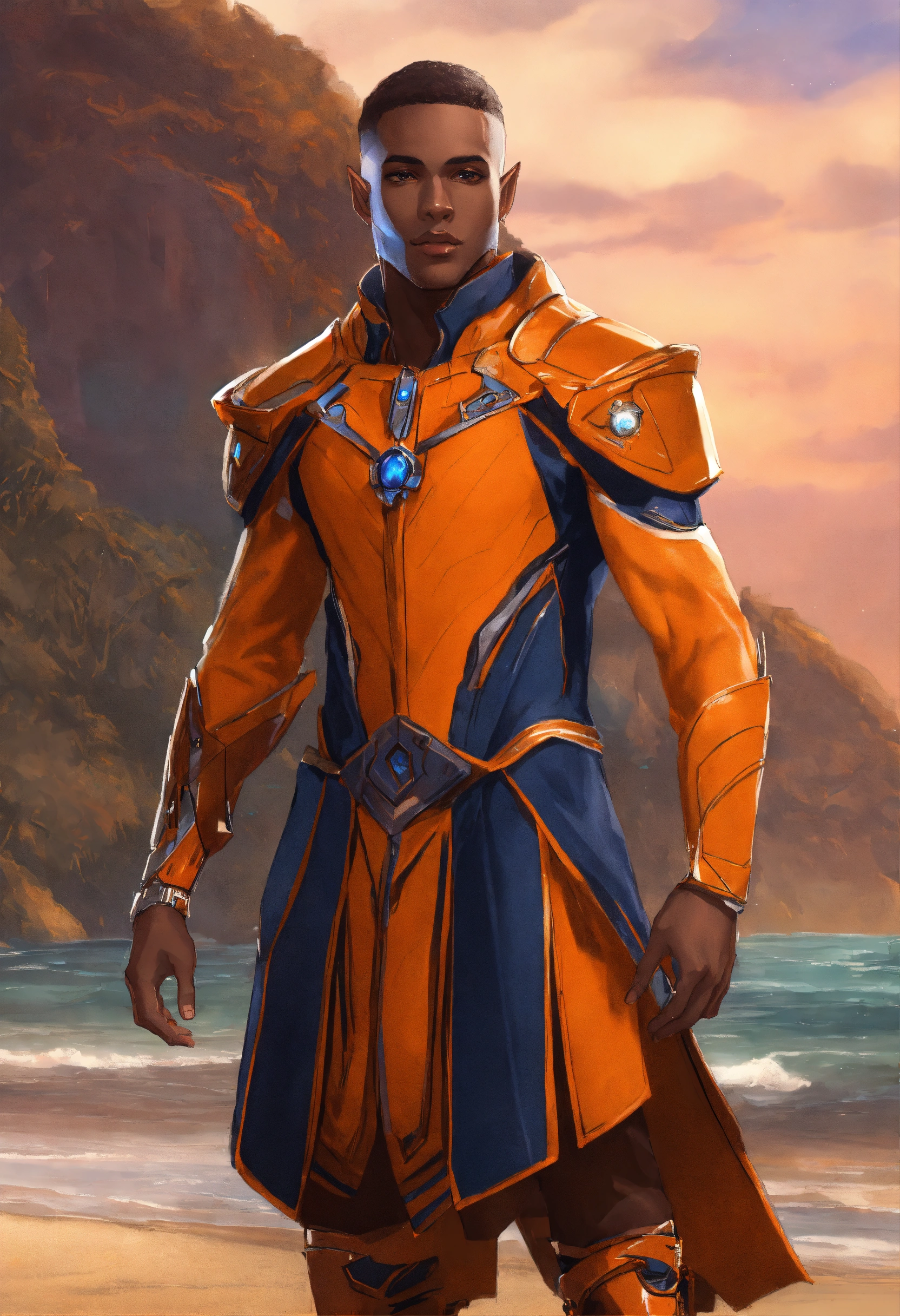 Drawing of an elf, royalty, sci fi, cybernetic, orange and navy blue royal sci fi outfit and boots, african elf, clean shaven, standing on a beach, handsome, male elf, 28 years old