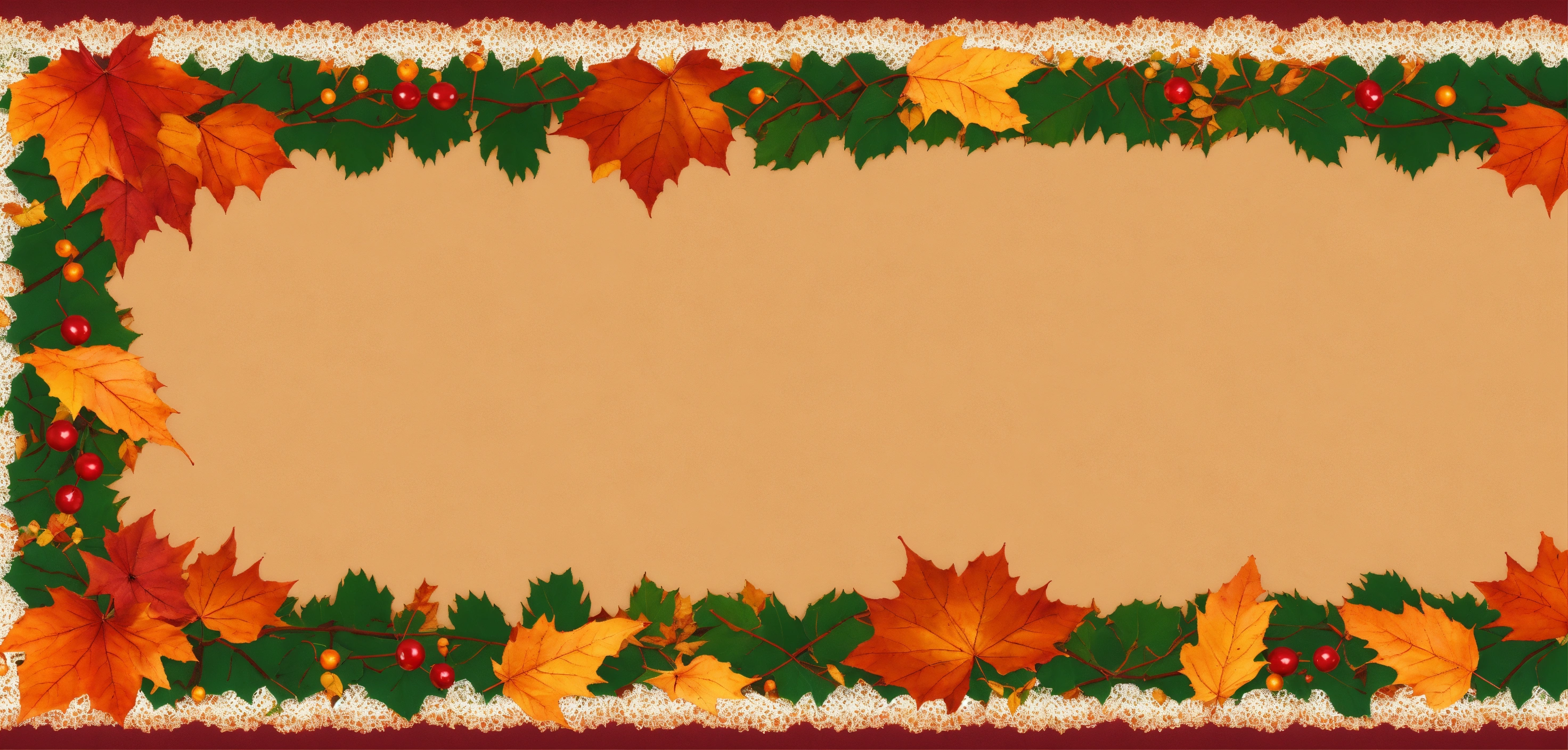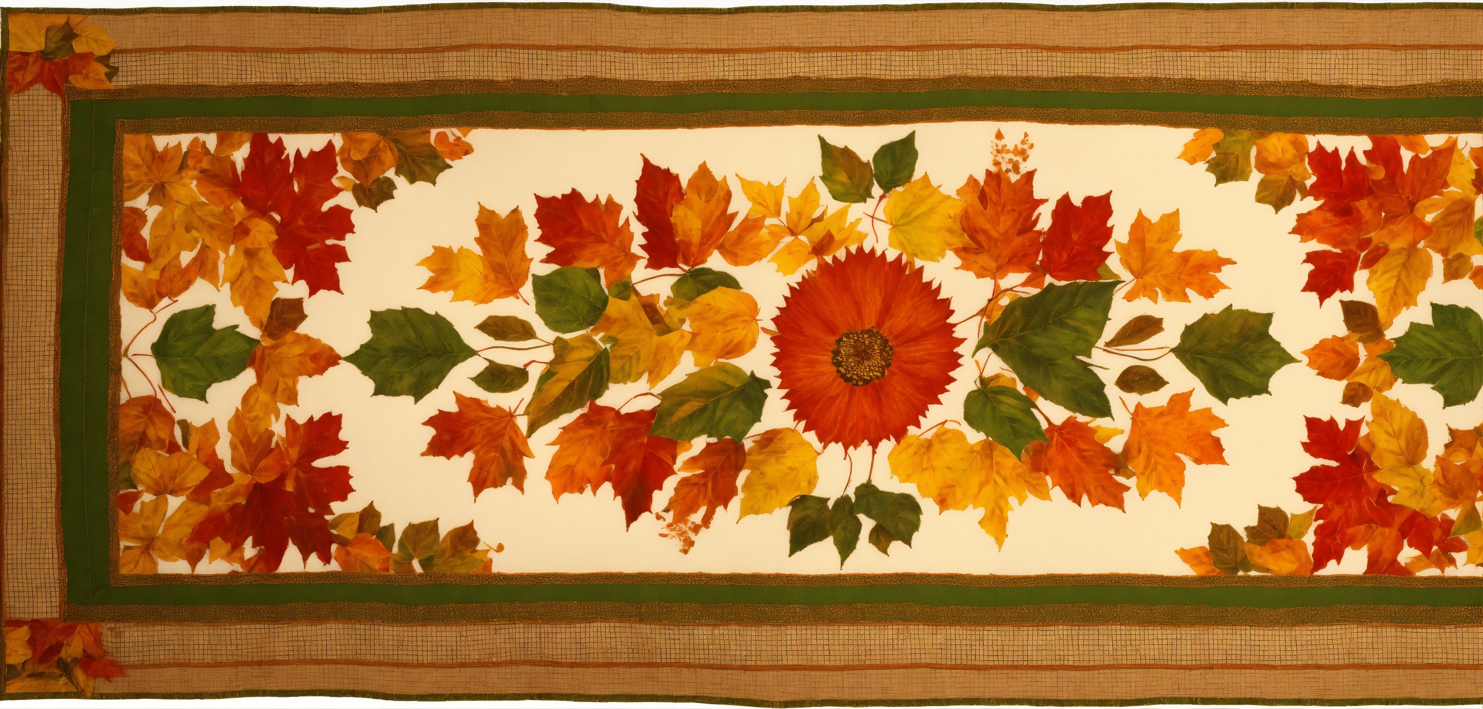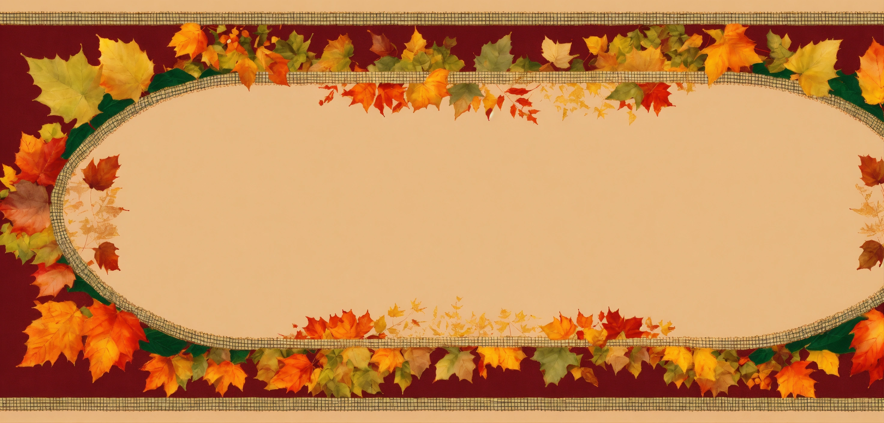 Illustrate an oblong tablecloth with an oblong center panel with a tan lacy design. draw 2 pretty borders. border 2 is filled with many small orange, red, and gold autumn leaves. orange and brown, gingham border lined with a pretty scrolling design. border 1 is a combination of autumn colors. symmetry on all sides. green and orange, gold, and red.