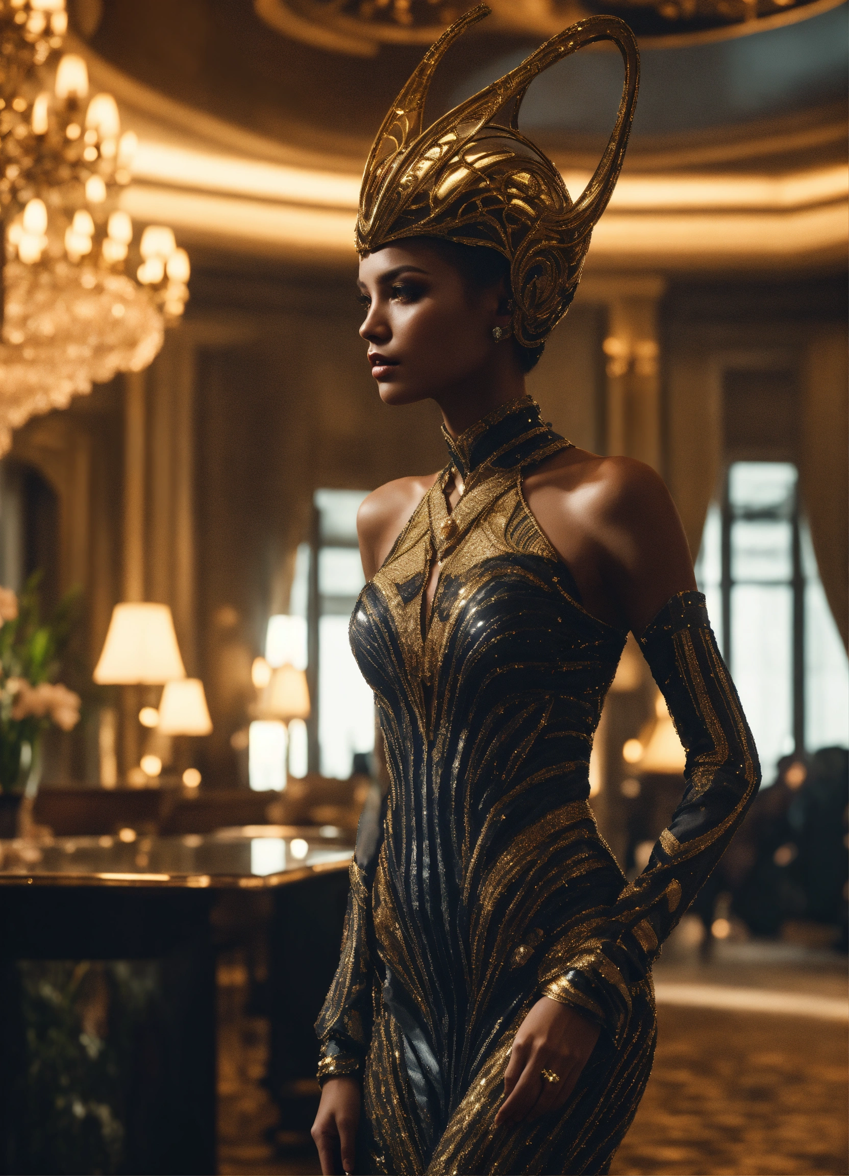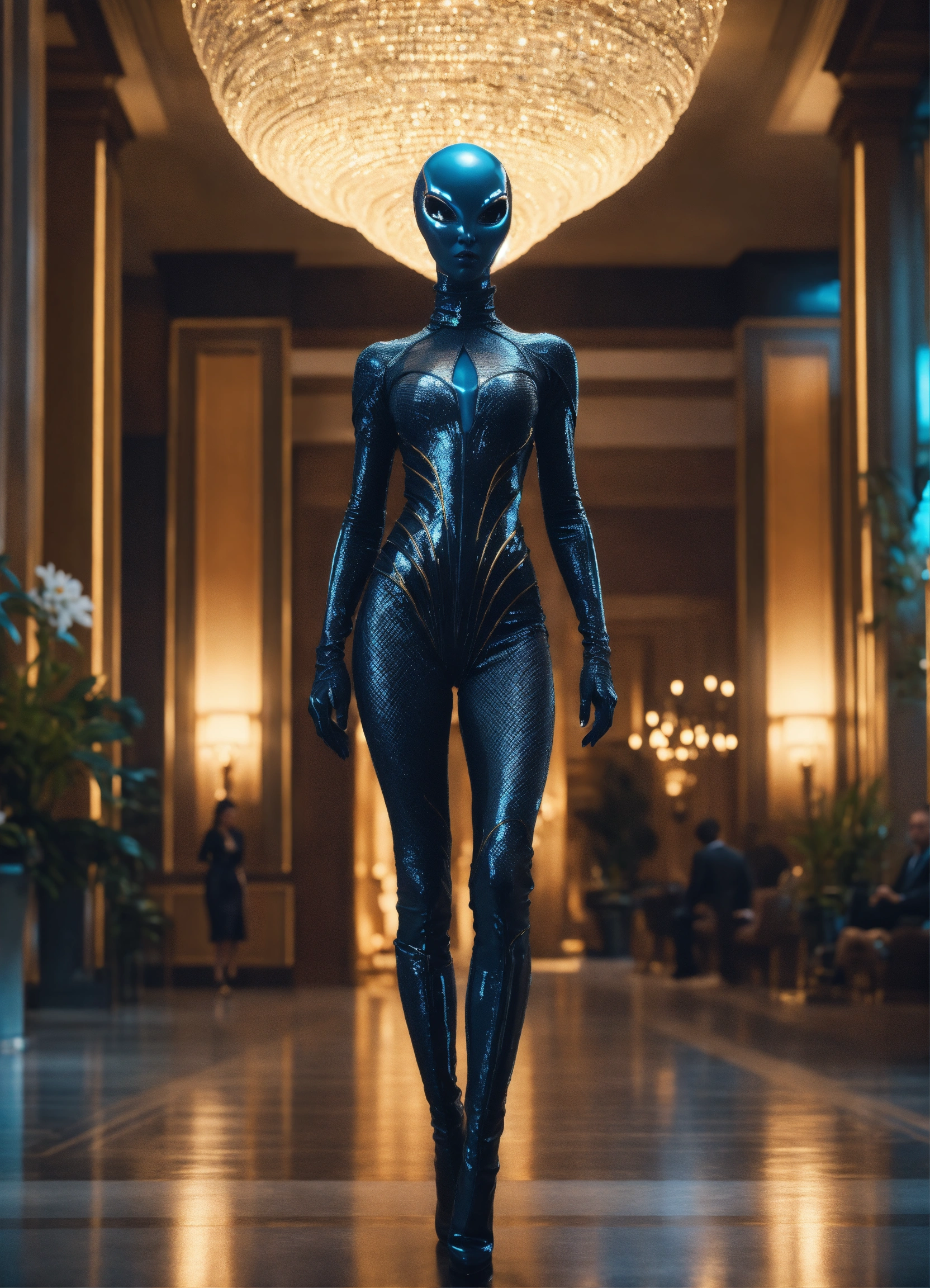 Human looking alien female with obsidian skin, wide hips, dressed in haute couture dress. regal demeanor, in hotel lobby, cinematic style, high detail, realistic physics, photorealistic, unreal engine, hdr, 8k