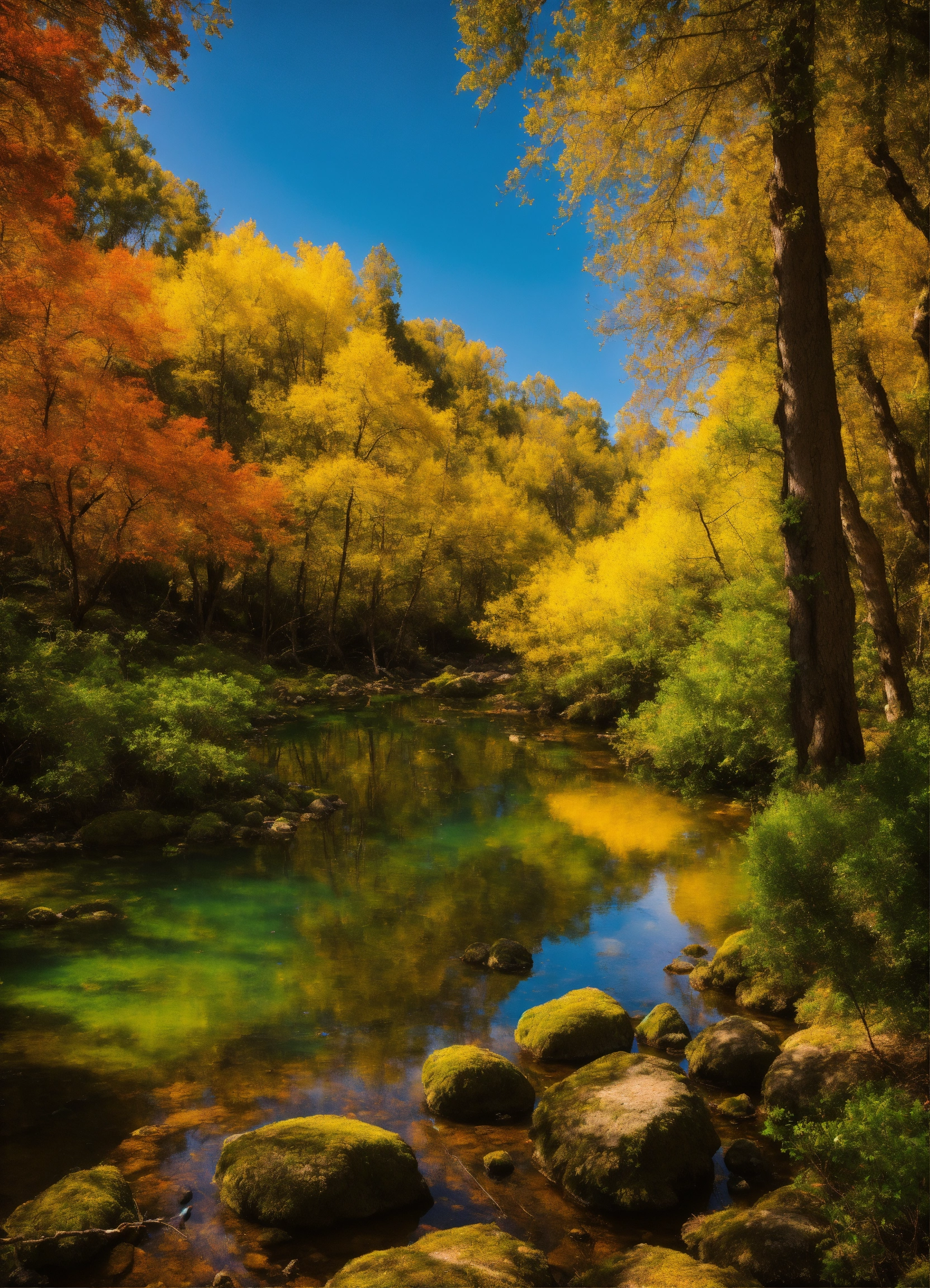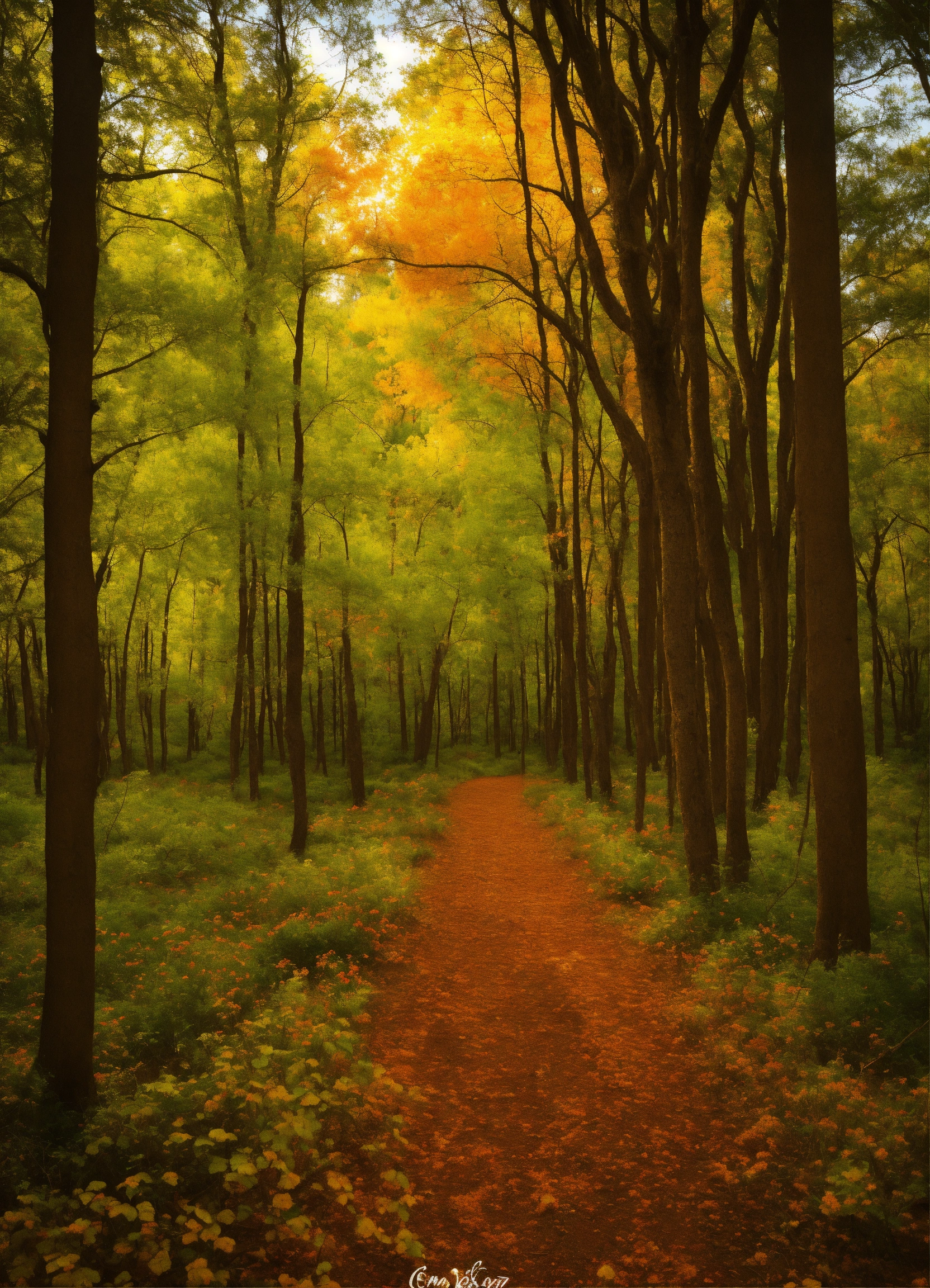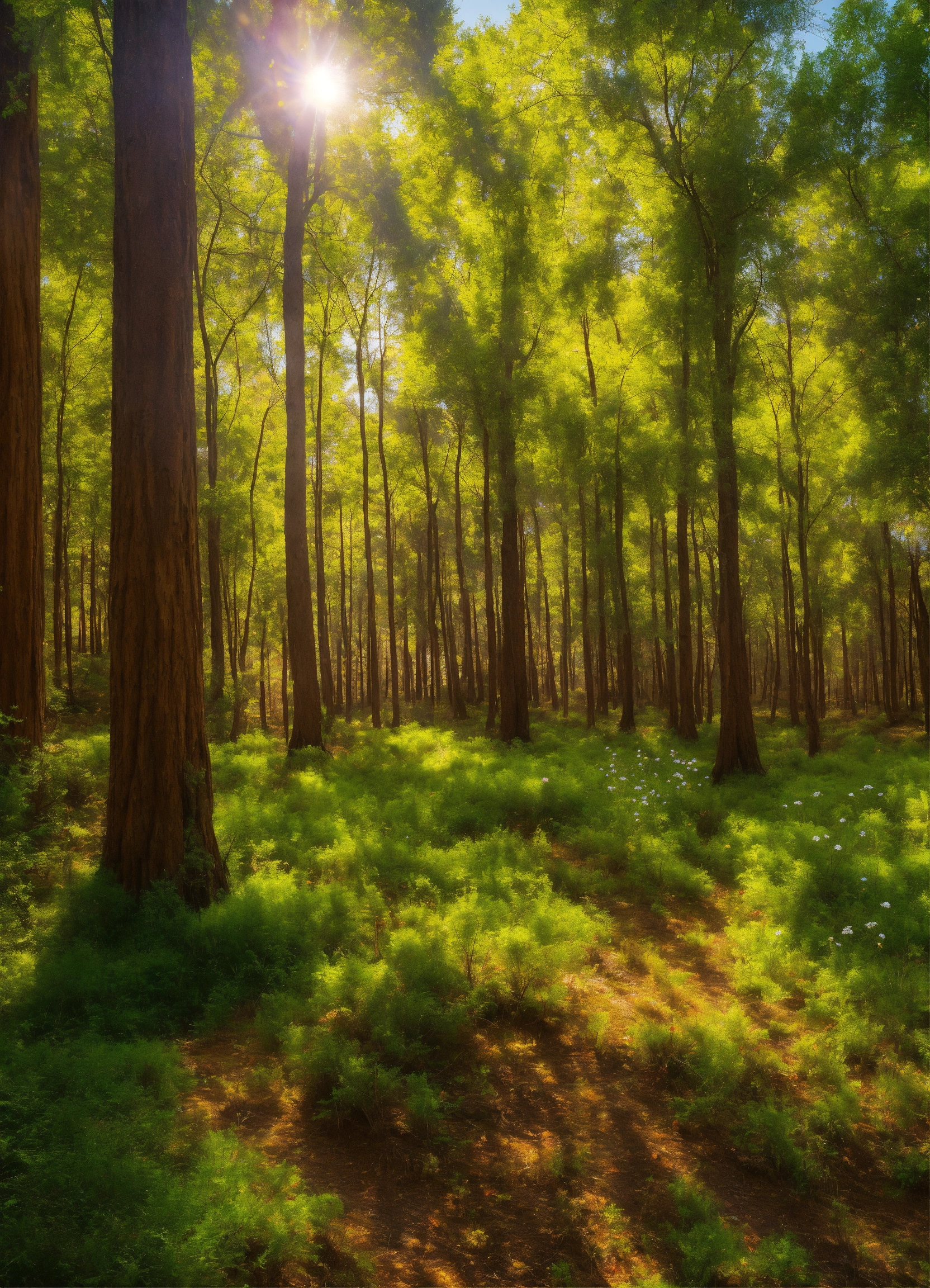 Una vista panorámica del bosque encantado, con árboles majestuosos, flores brillantes y criaturas del bosque. en el centro, niño llamado teo pelirrojo, guapo, pelo ondulado y ojos grandes, marrones, está parado junto a la lechuza sabia, ambos mirando con expresiones de asombro y admiración.