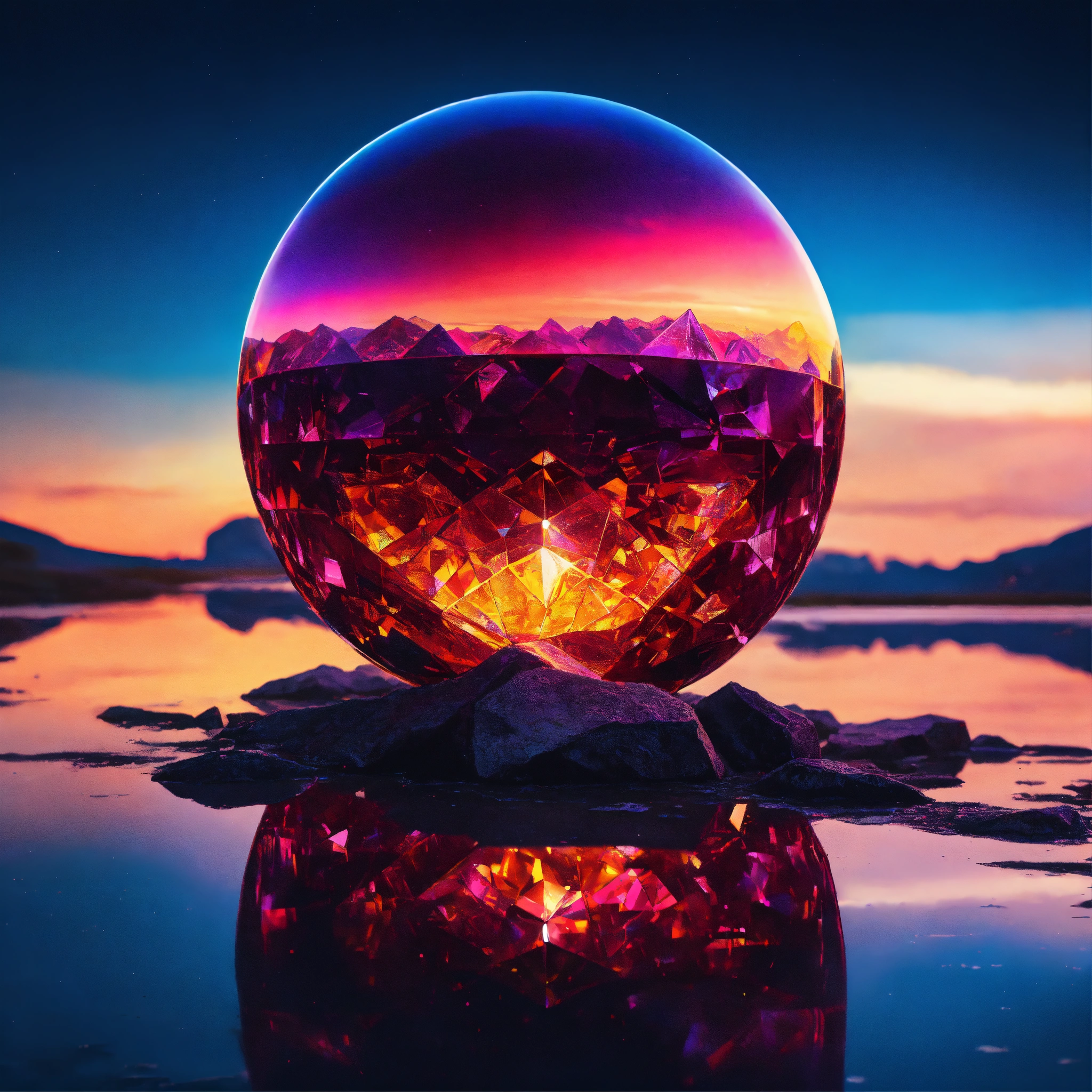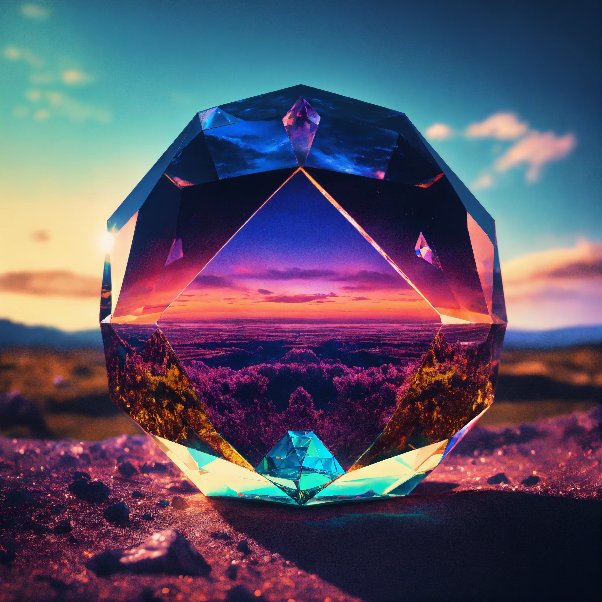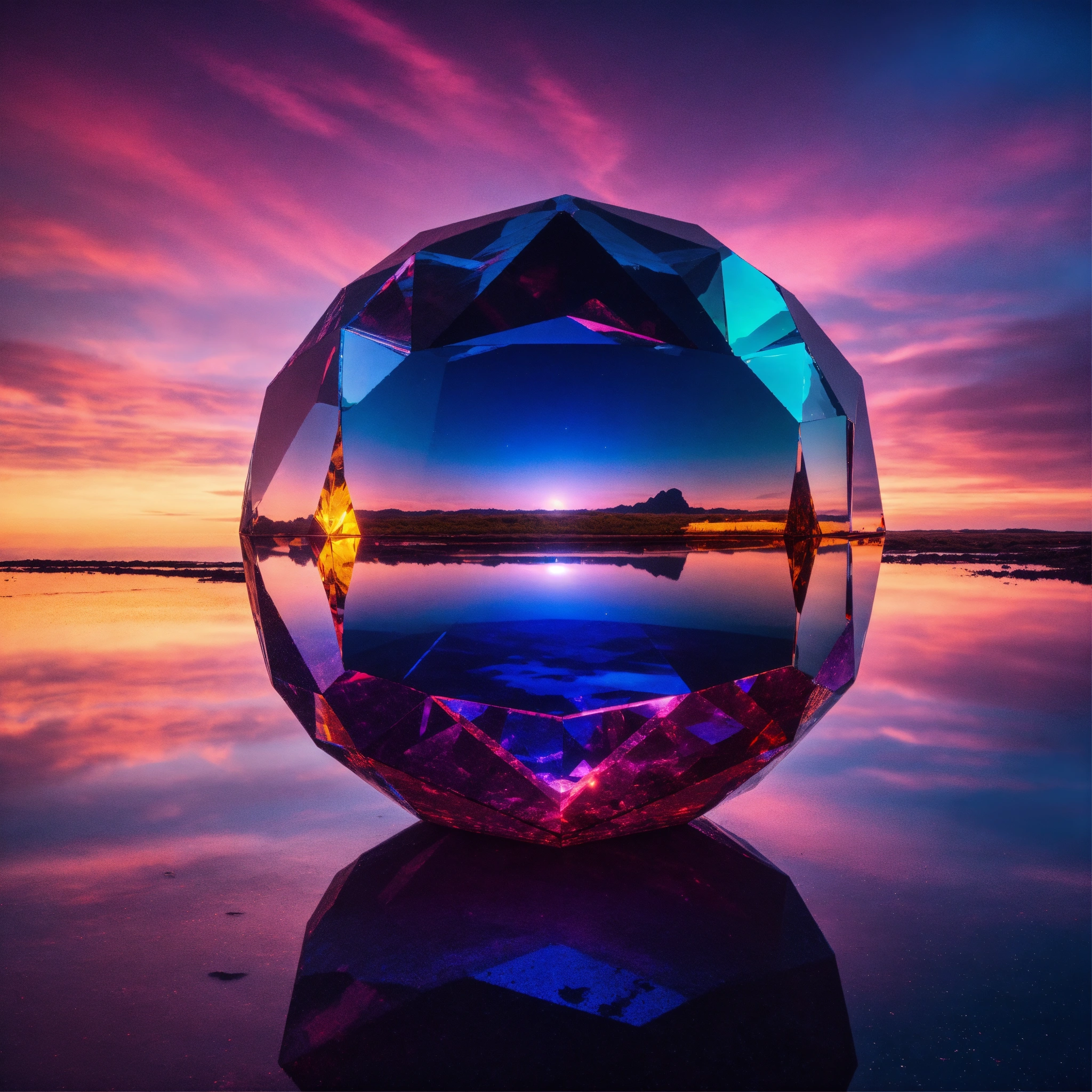 Very complex gigantic reflective glowing crystal tesseract orb, retrofuturistic sky, masterpiece, deep colours, geometric shapes, minimalistic, stunning photo, vast expanse, surreal, 8k photo