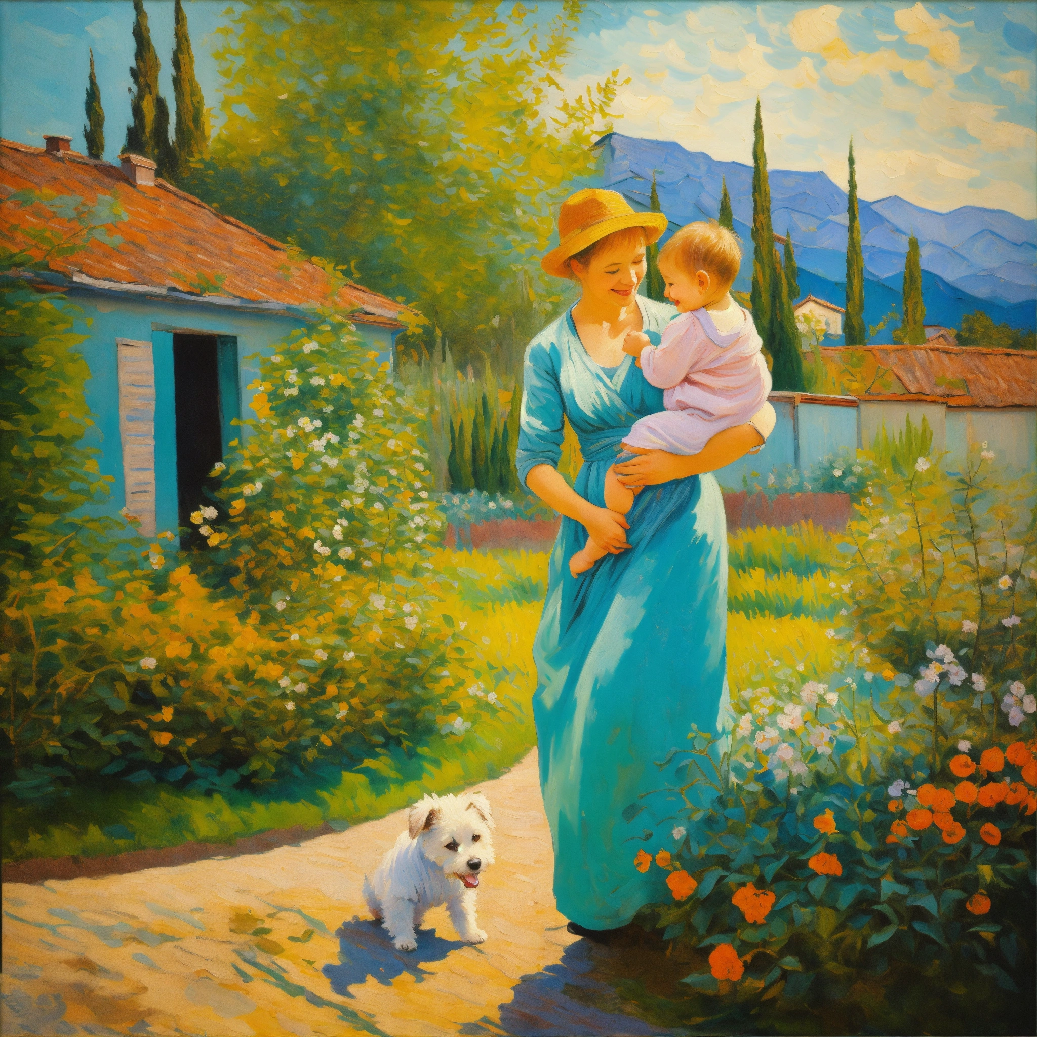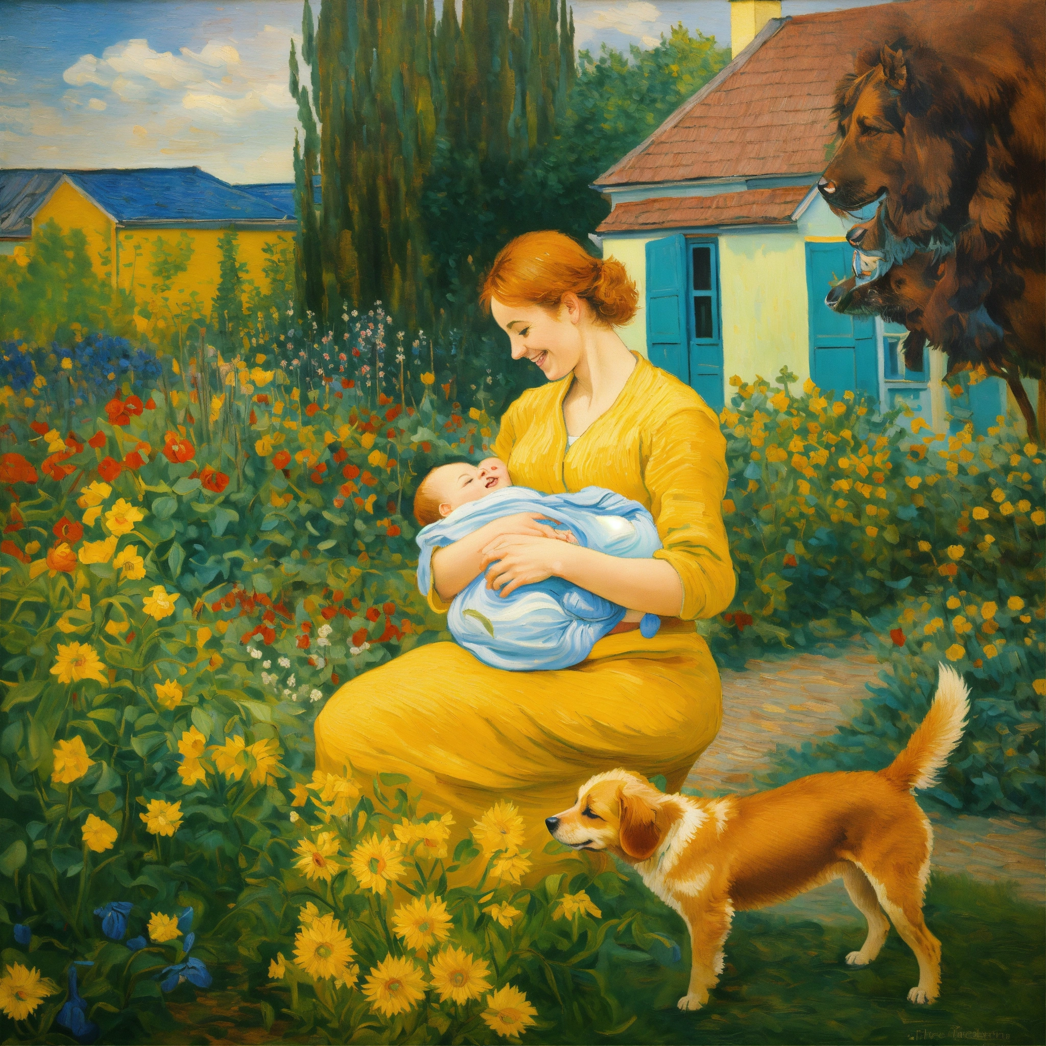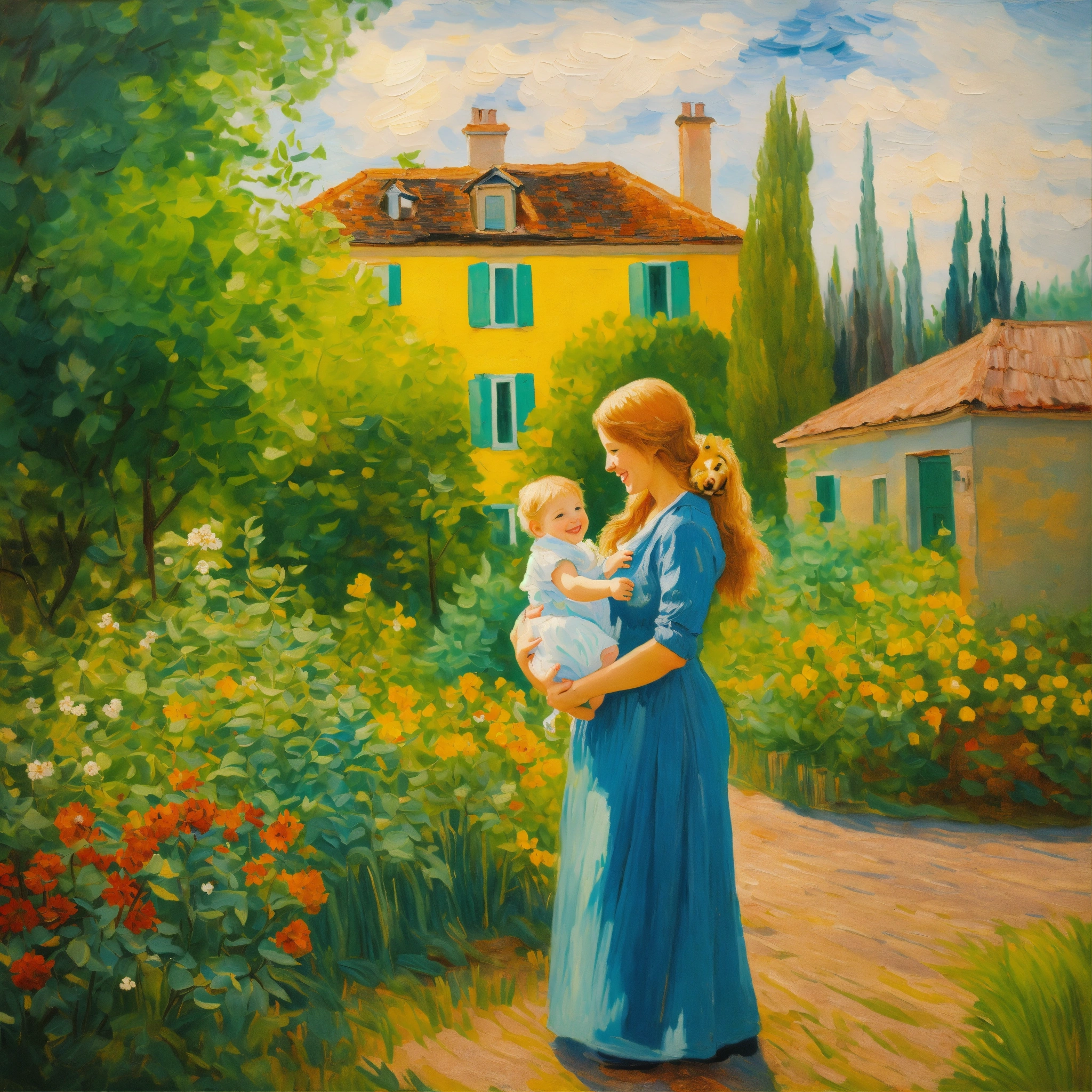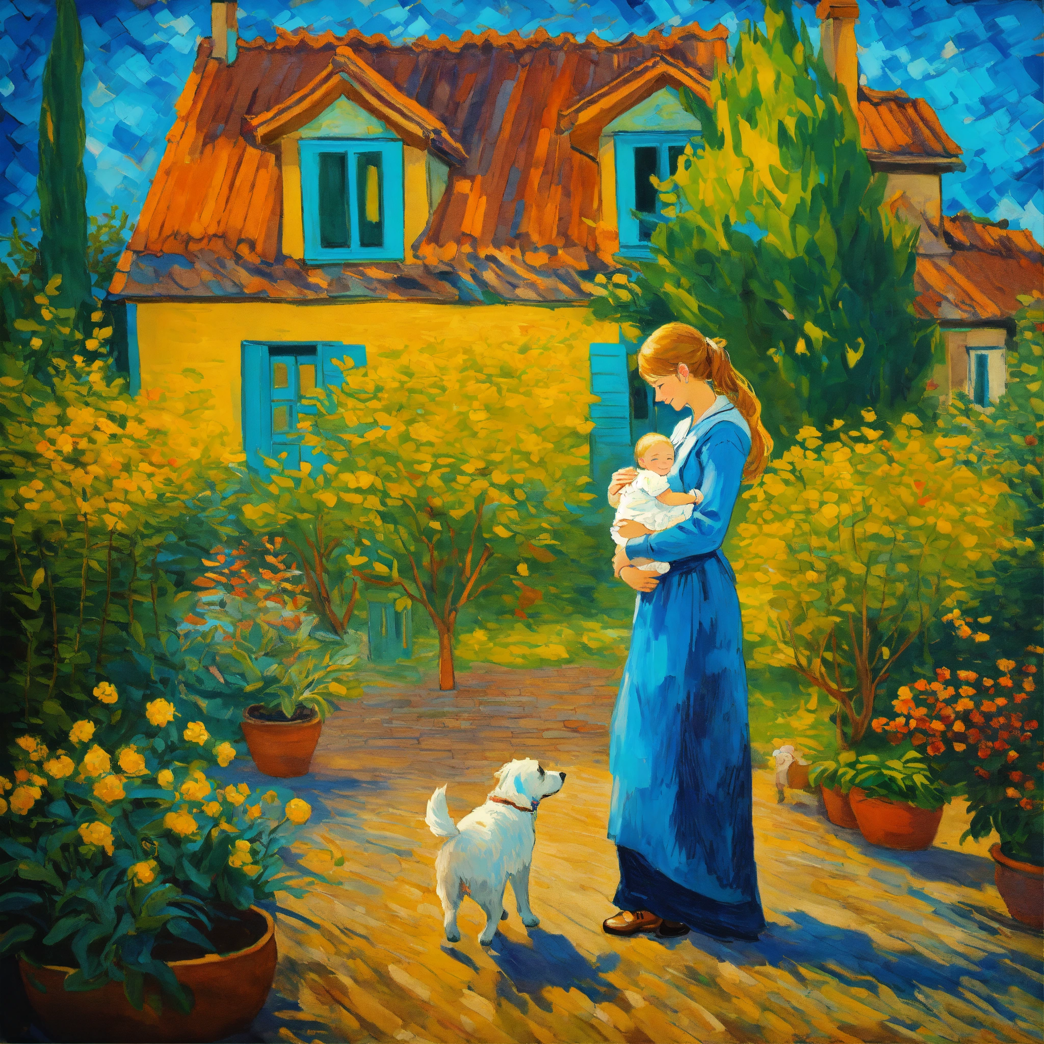 Vangogh style painting of beautiful mother smiling baby in arms playing in the garden of her house, in the background their house with a garden and a dog