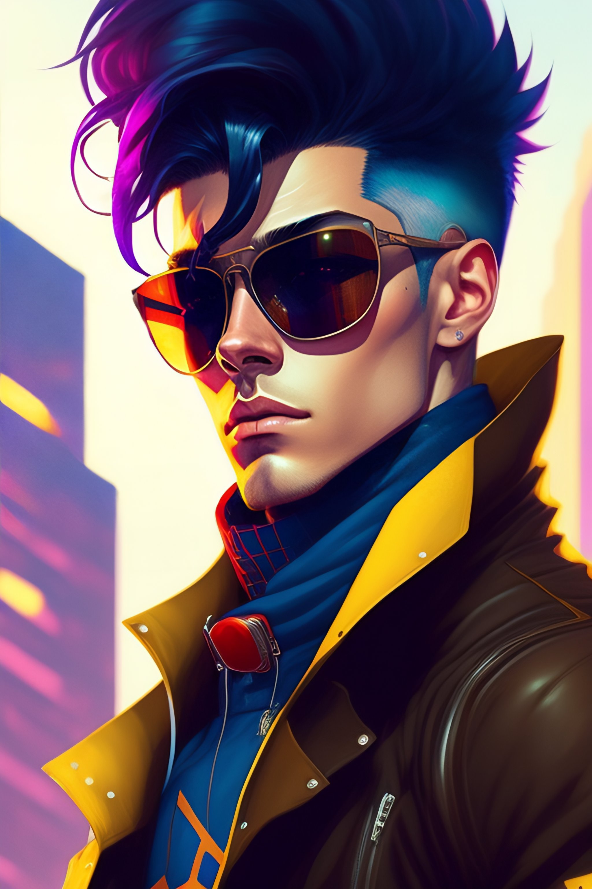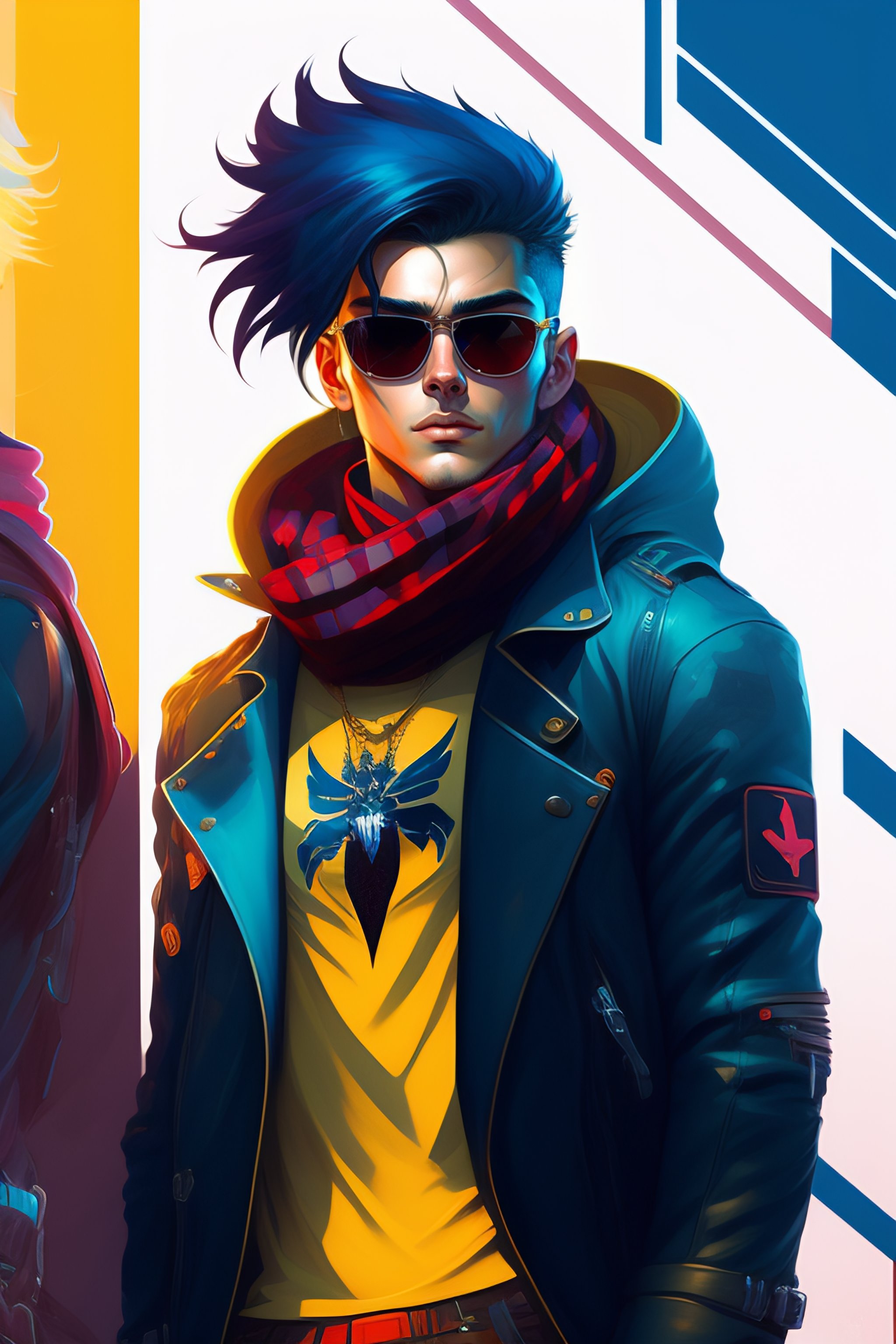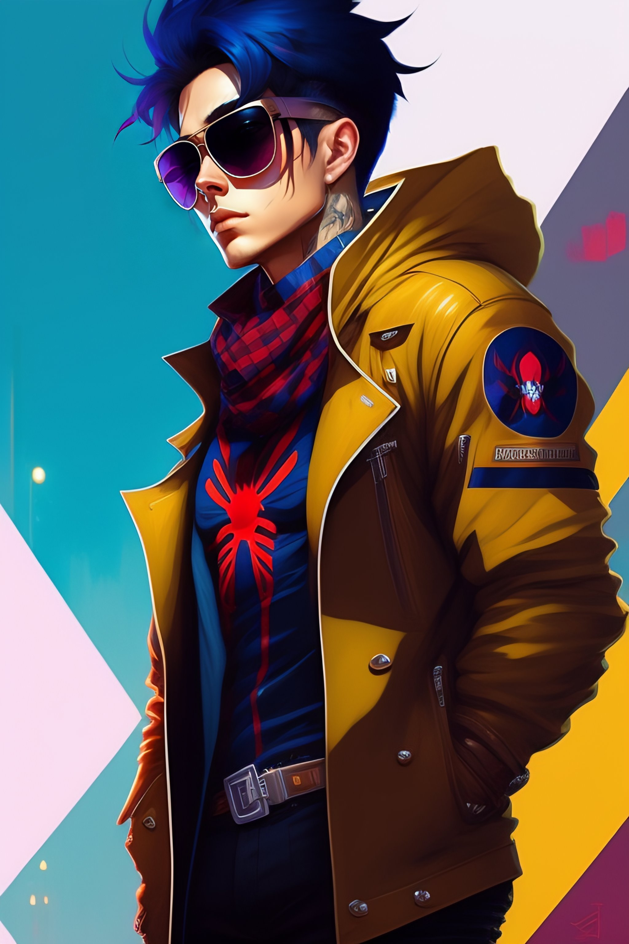 Full body highly detailed portrait of muscular spiderman emo punk, sunglasses, blue eyes, tartan scarf, white hair by atey ghailan, by greg rutkowski, by greg tocchini, by james gilleard, by joe fenton, by kaethe butcher, gradient yellow, black, brown and magenta color scheme, grunge aesthetic!!! graffiti tag wall background