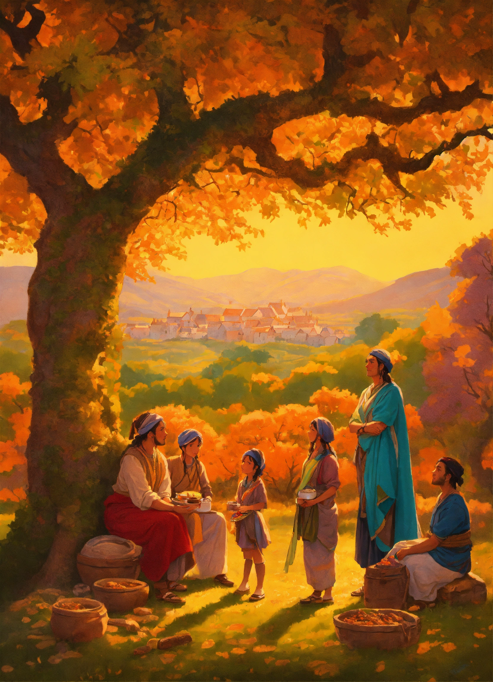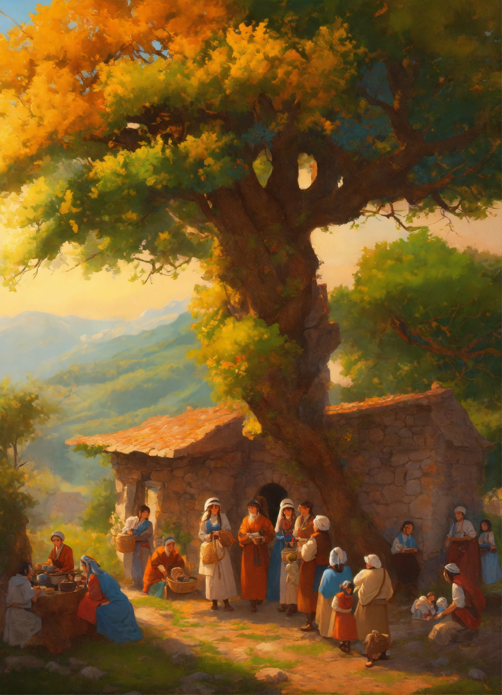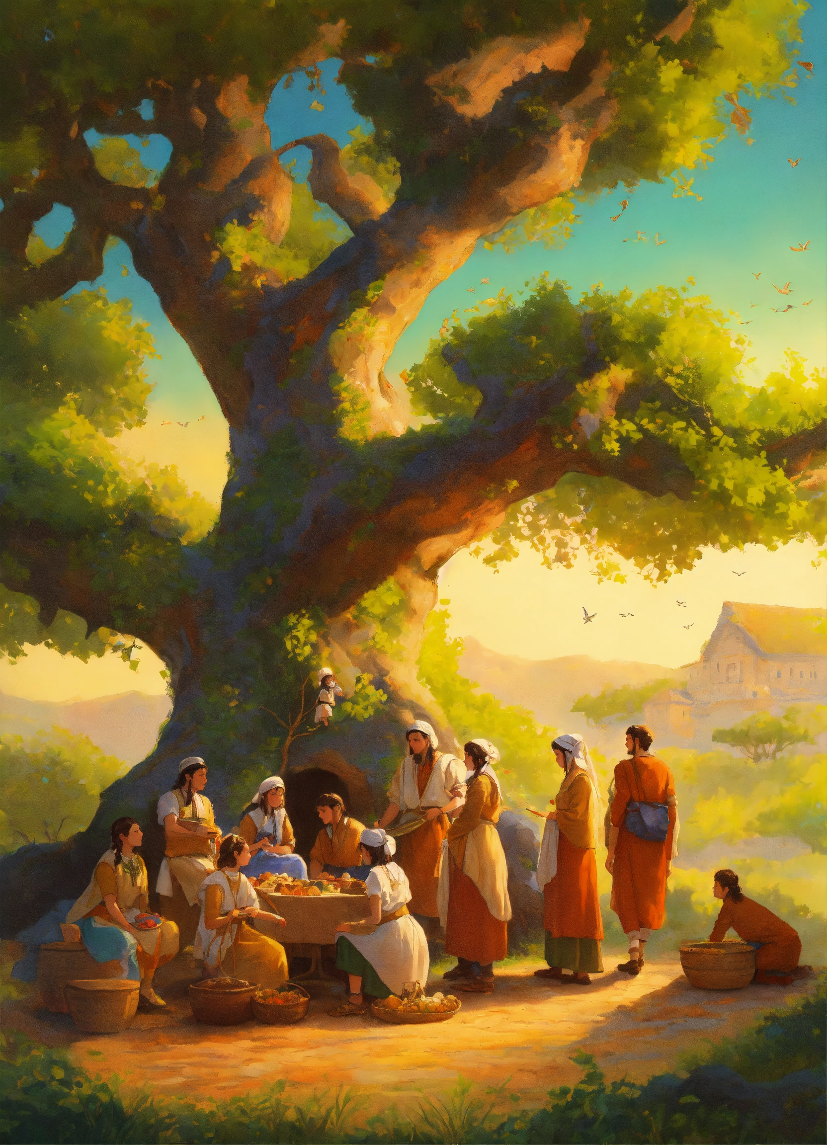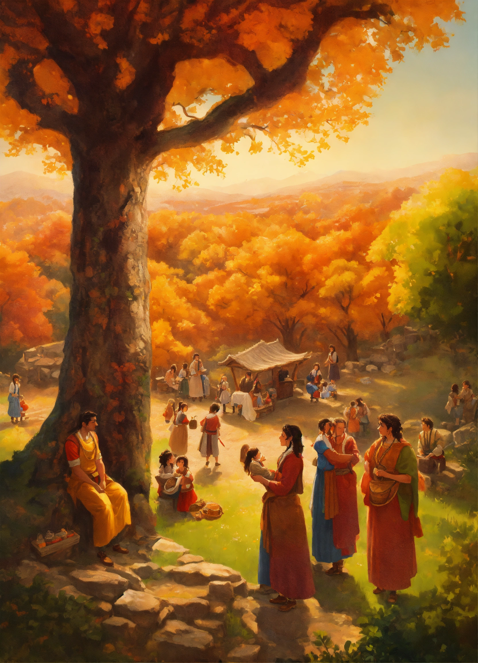 A vivid depiction of ancient gaulish life, portraying peasant families around a sacred oak. the scene captures the essence of gaulish daily life, showcasing families, including children, in a vibrant and historically rich setting. remove the background, focusing solely on the characters