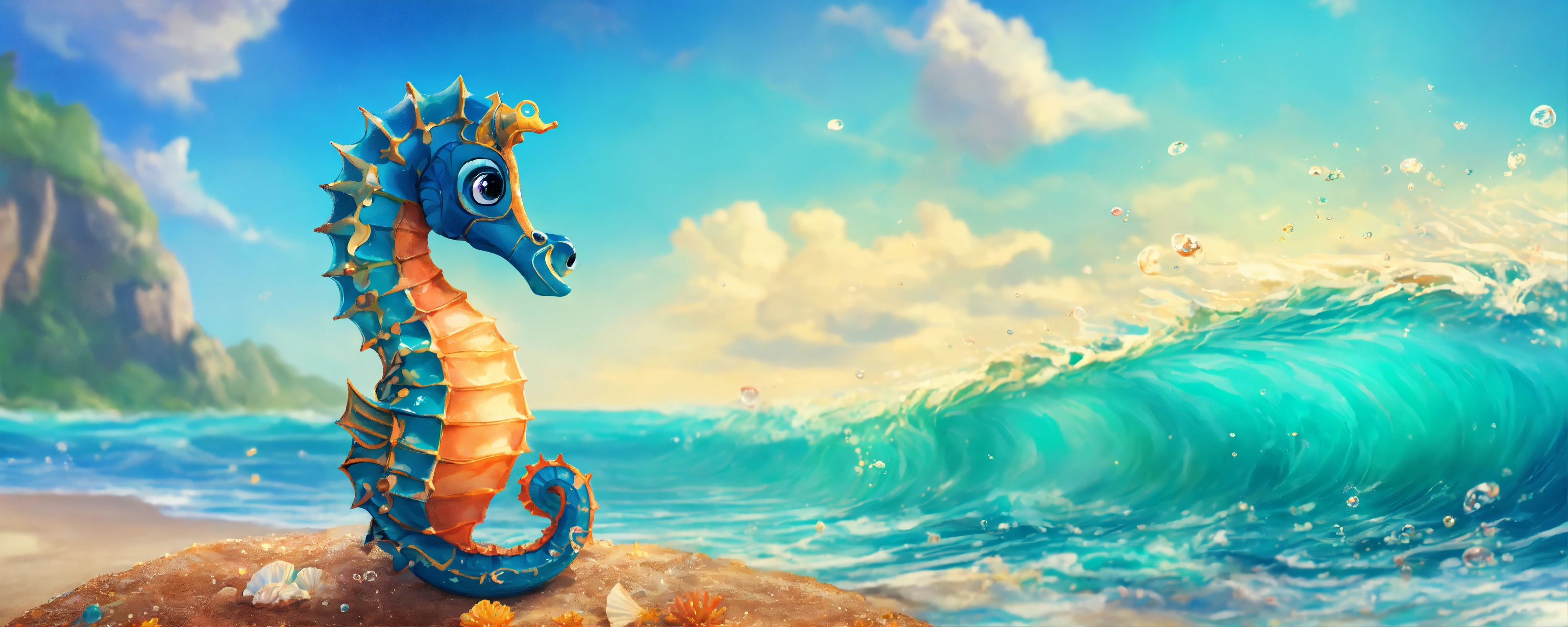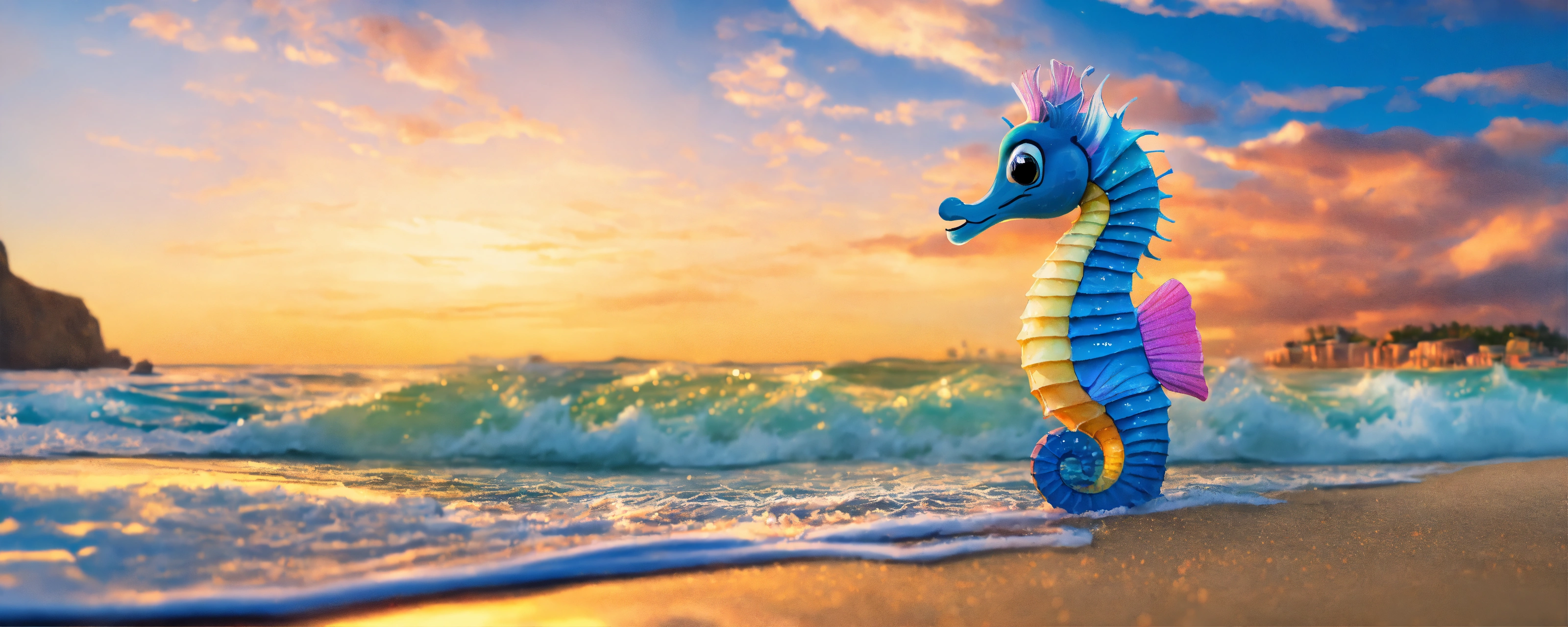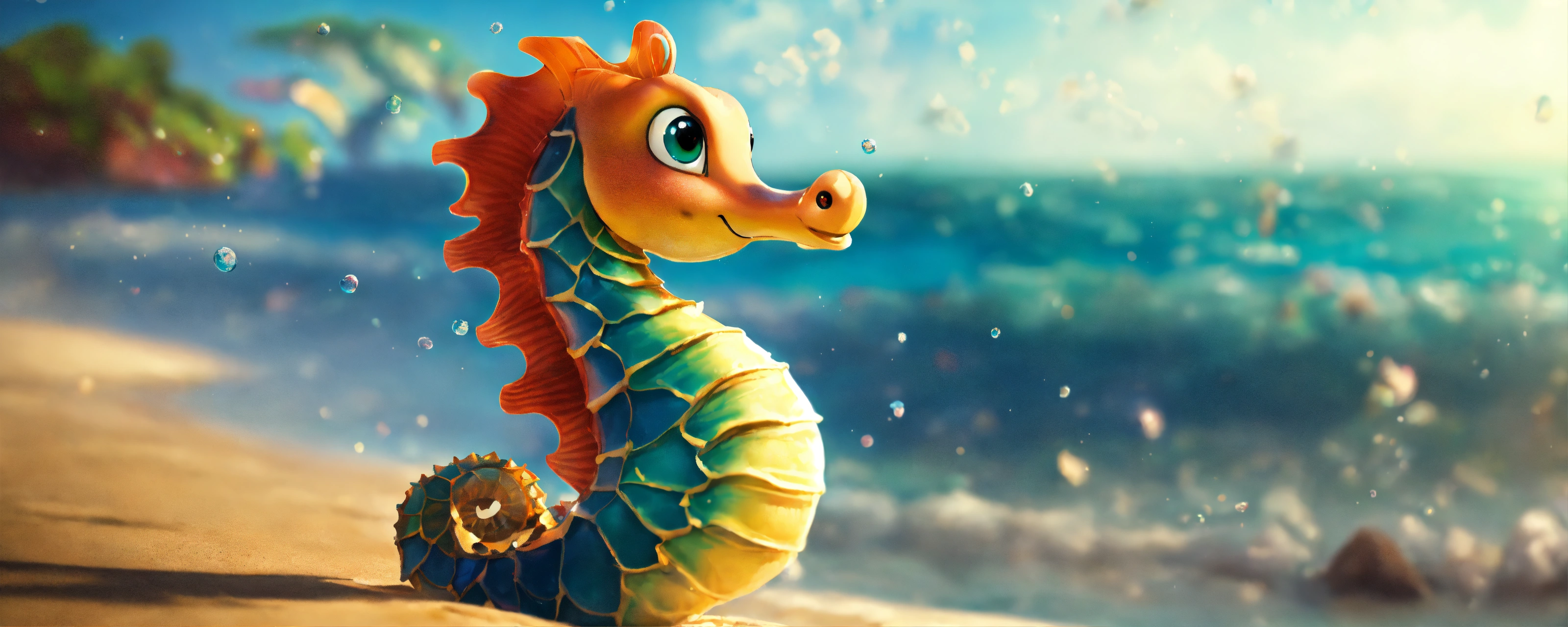 /imagine promptsee a smiling seahorse named coral. he is sitting on the beach, looking at the sky, and in the background you can see the beautiful blue sea and high waves, disney, --v 4 --chaos 1 --stylize 551 --ar 11