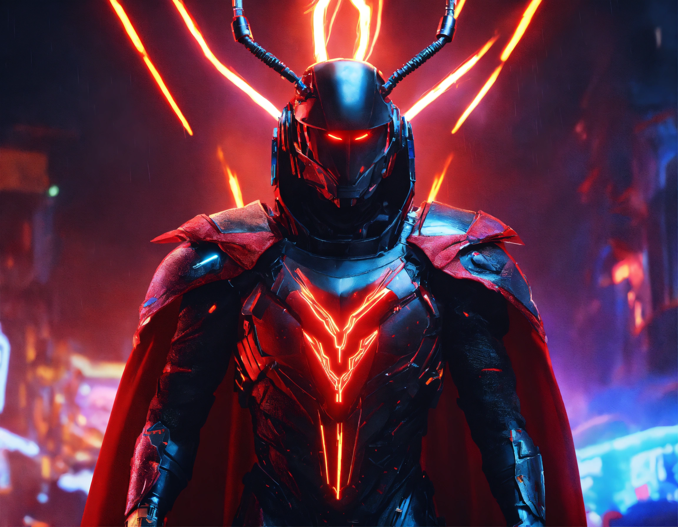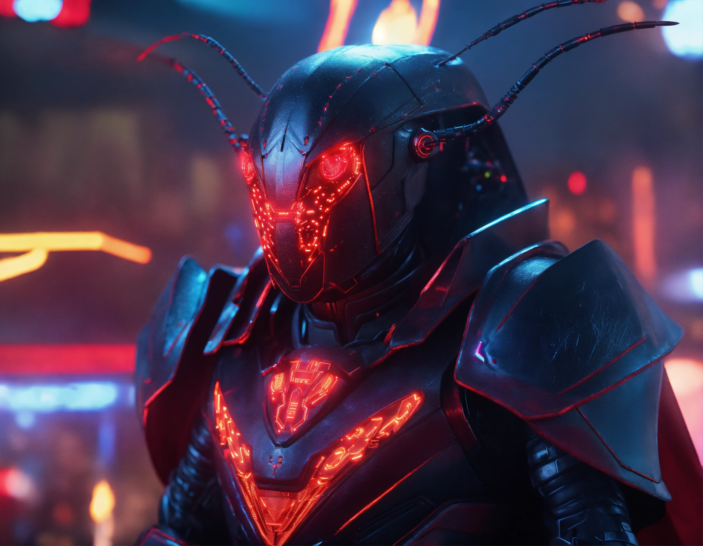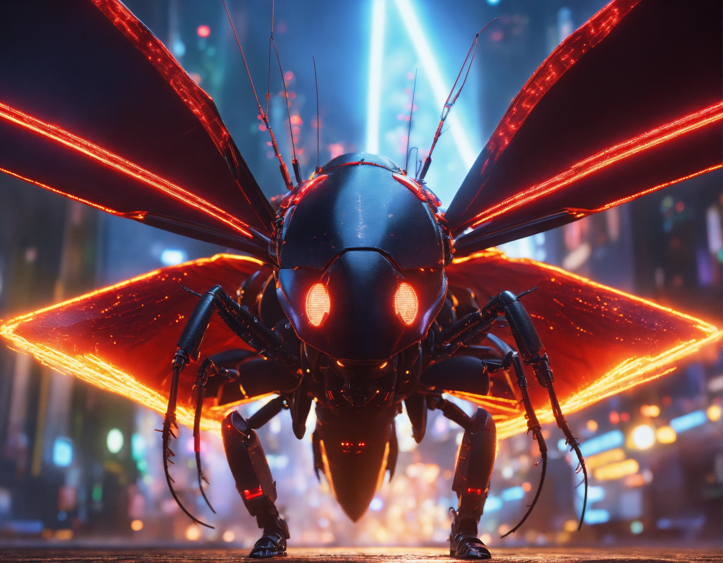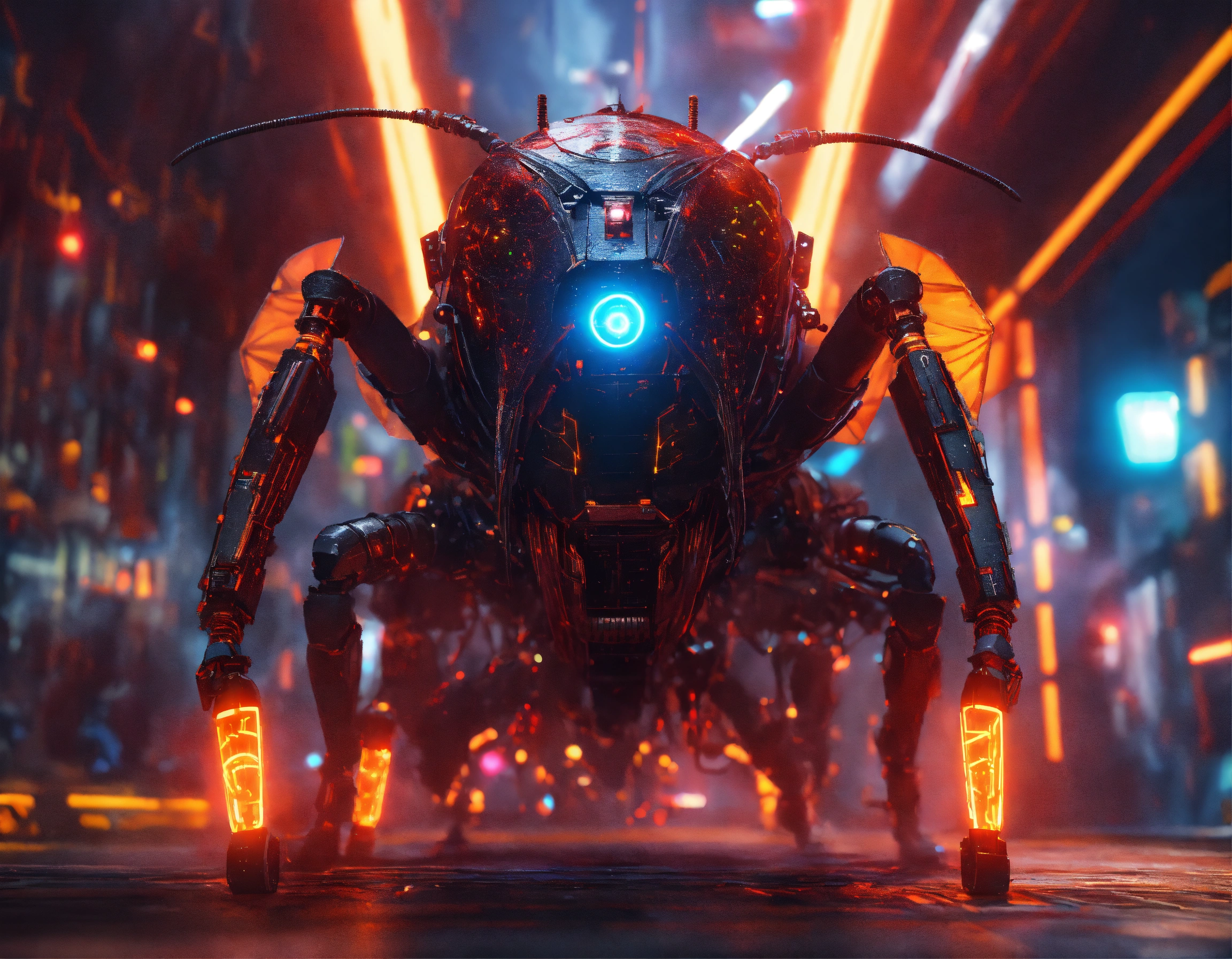 Zoom out shot of black cockroach faced humanoid with red glowing eyes, detailed circuitry decor, and long draped down colorful cape, he is sending digital electric electric lightning bolts with his antenna, attacking creatures in spaceship, realistic, pixar, 8k