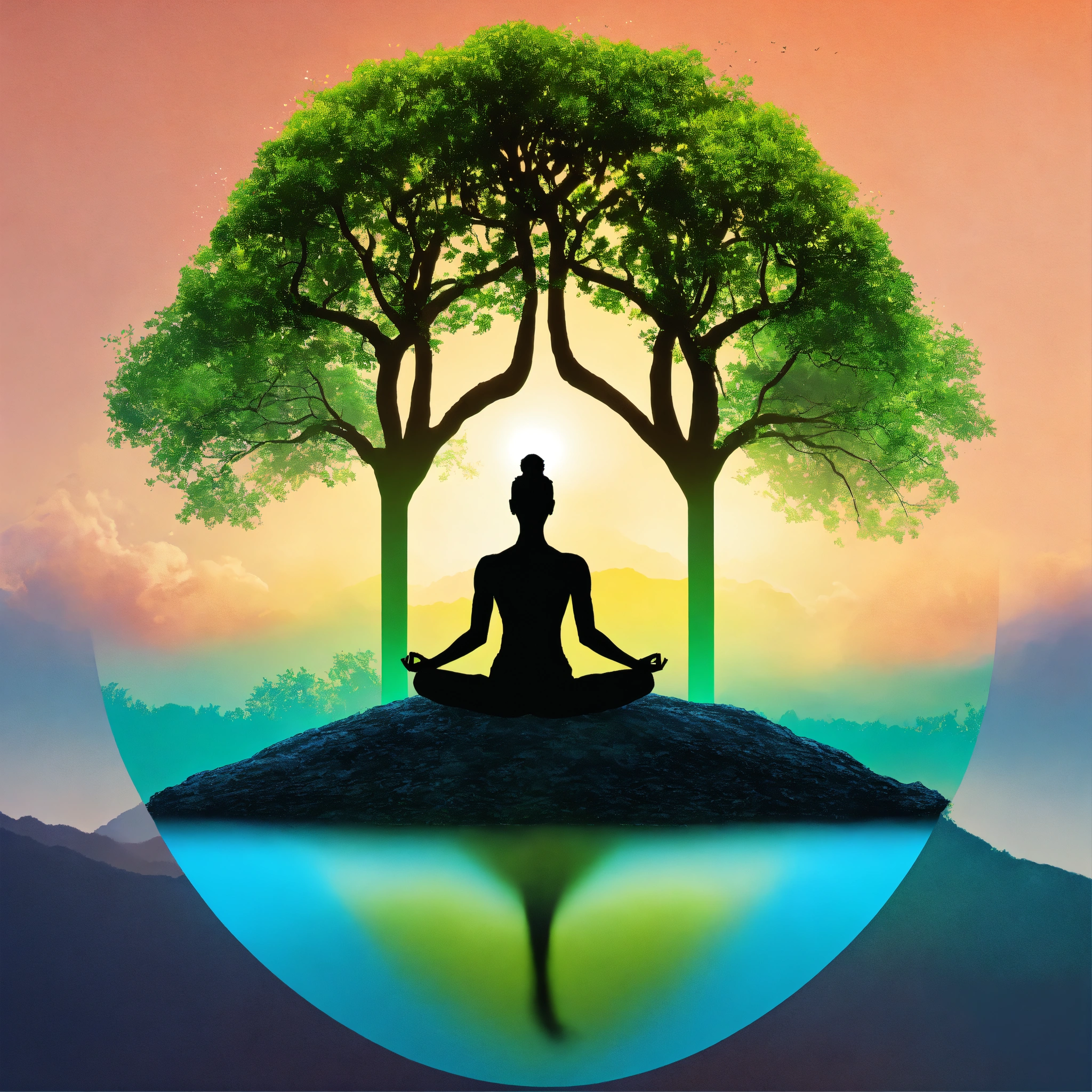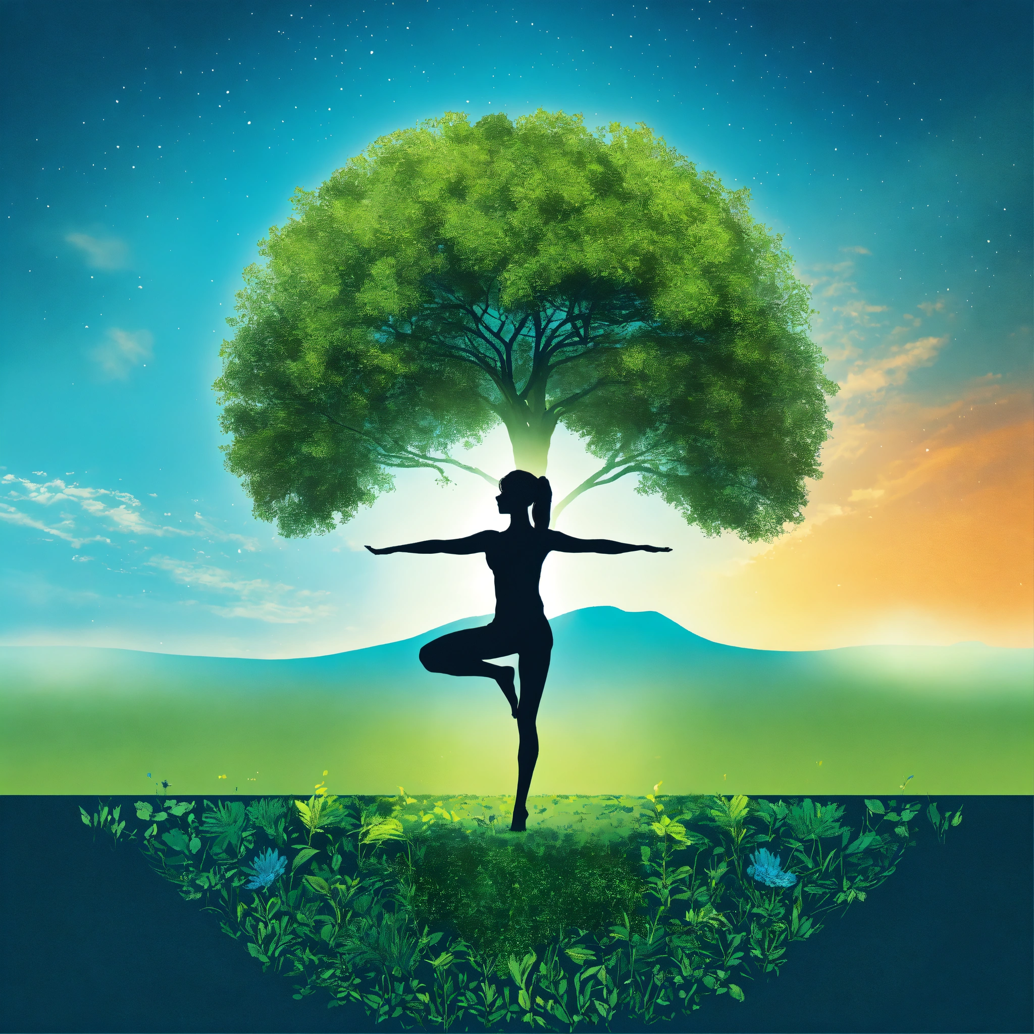 A harmonious blend of nature and wellness, representing a horizon where health meets vitality. a gradient background transitioning from a calming sky blue at the top to a vibrant green at the bottom, representing the sky meeting the earth, symbolizing the horizon. a silhouette of a tree with deep roots on one side, representing growth and grounding. on the opposite side, a human figure in a yoga pose, representing wellness and balance. put the text as "health horizon hub" should be centrally placed. the text color should be white to stand out against the gradient background. colors sky blue, vibrant green, and white.