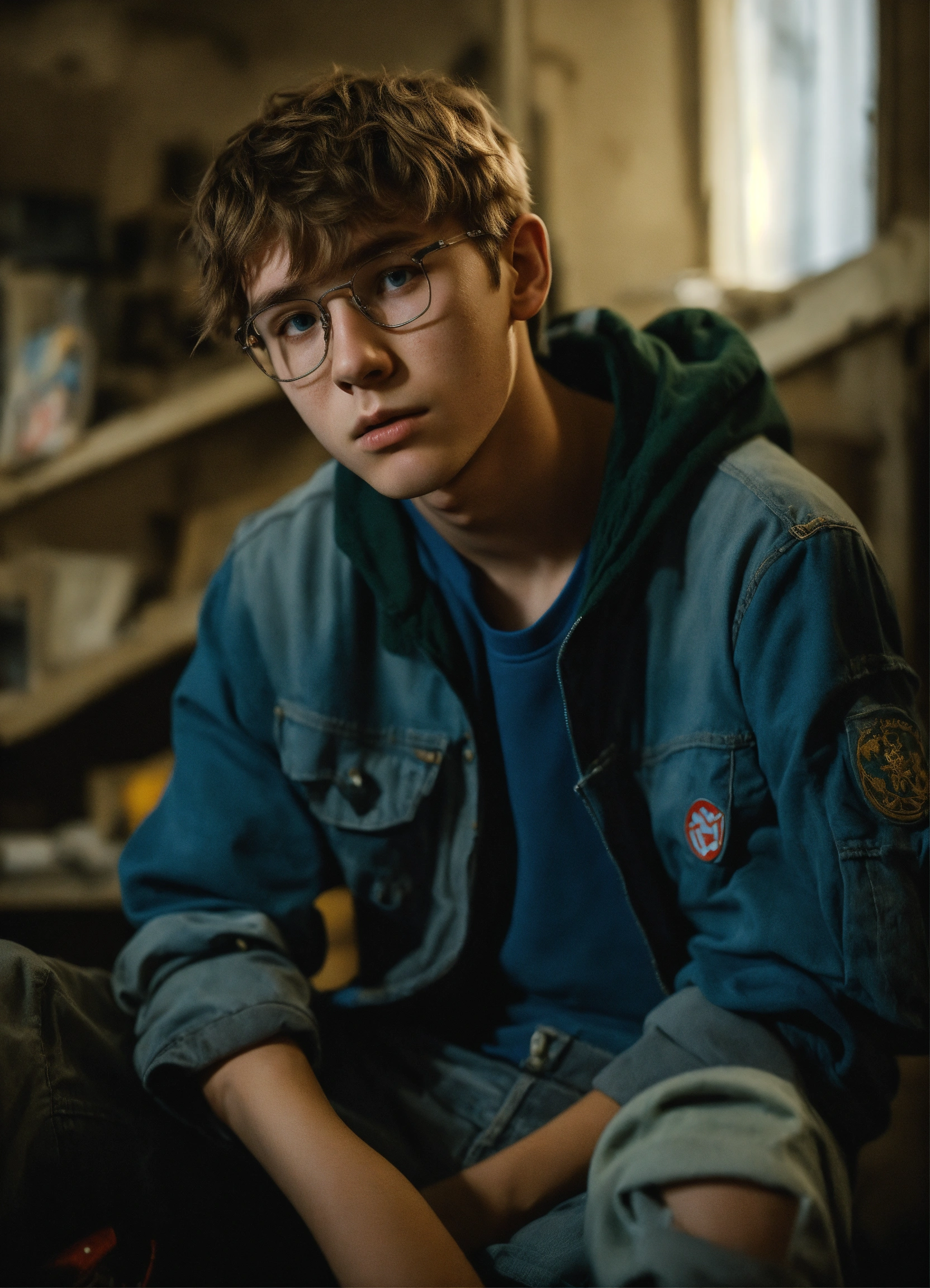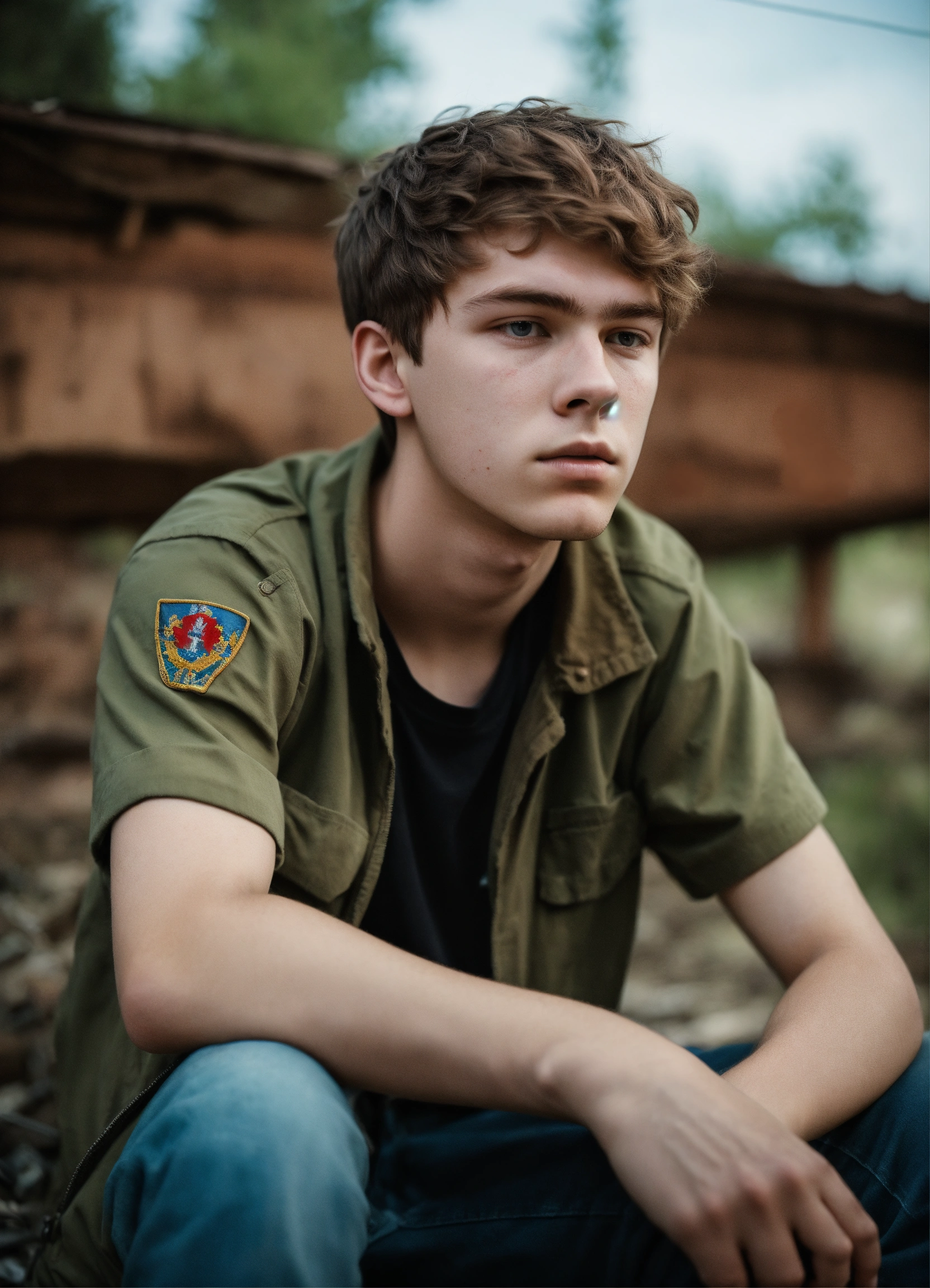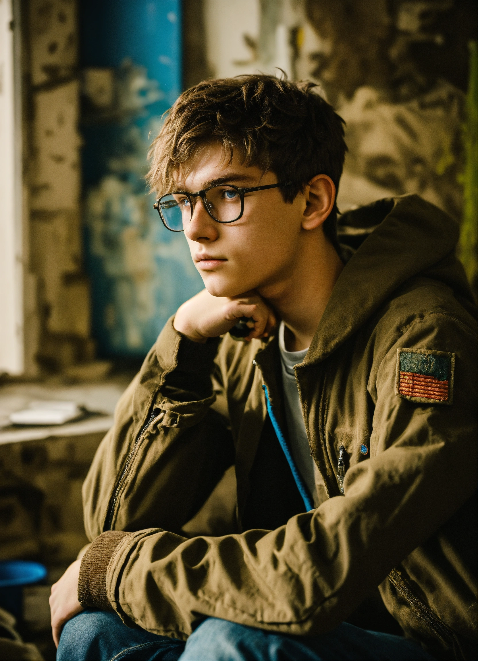 17 year old boy, russian looking, post apocalypse world, sitting, nerdy, clean face, look away, deep in thought