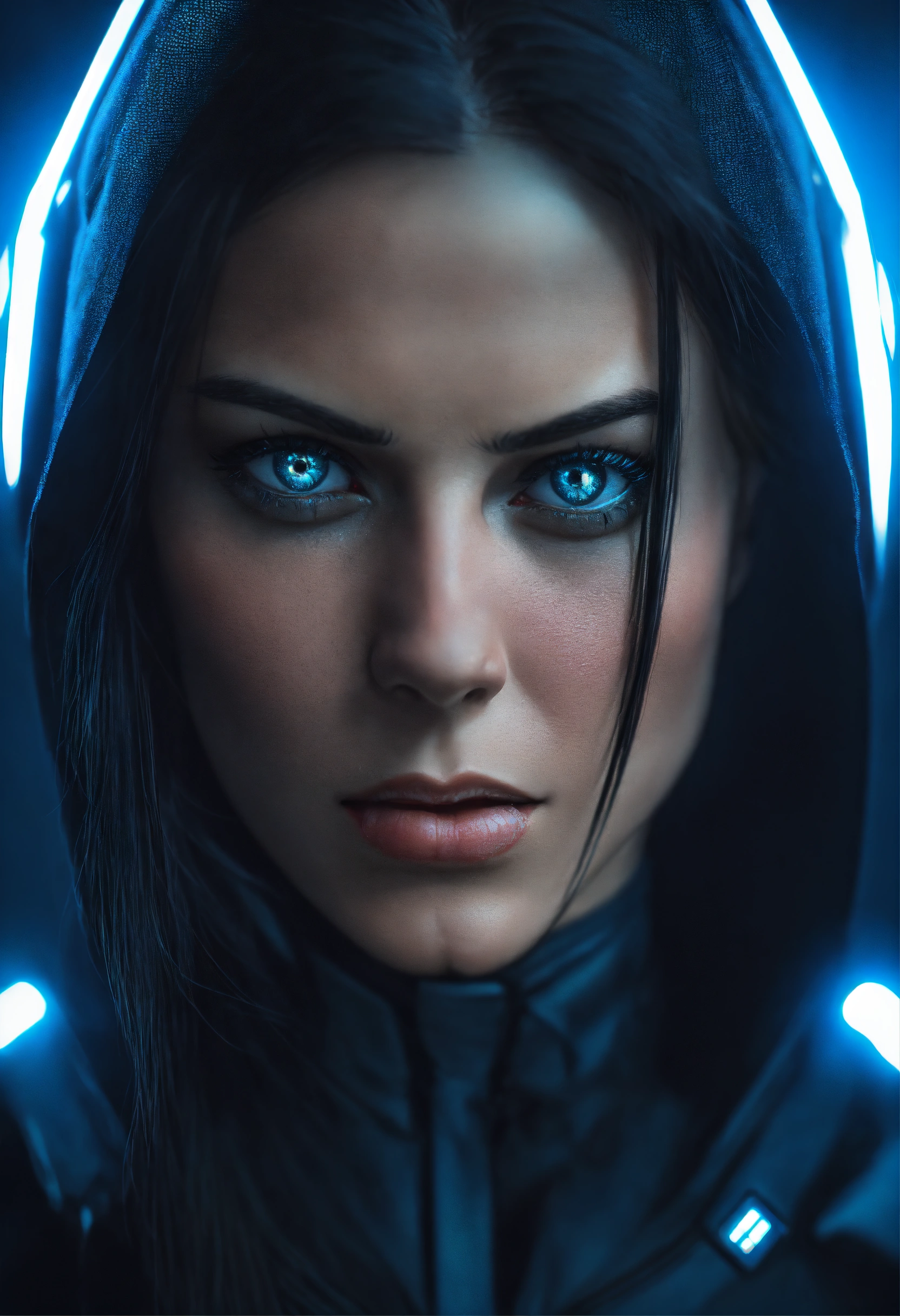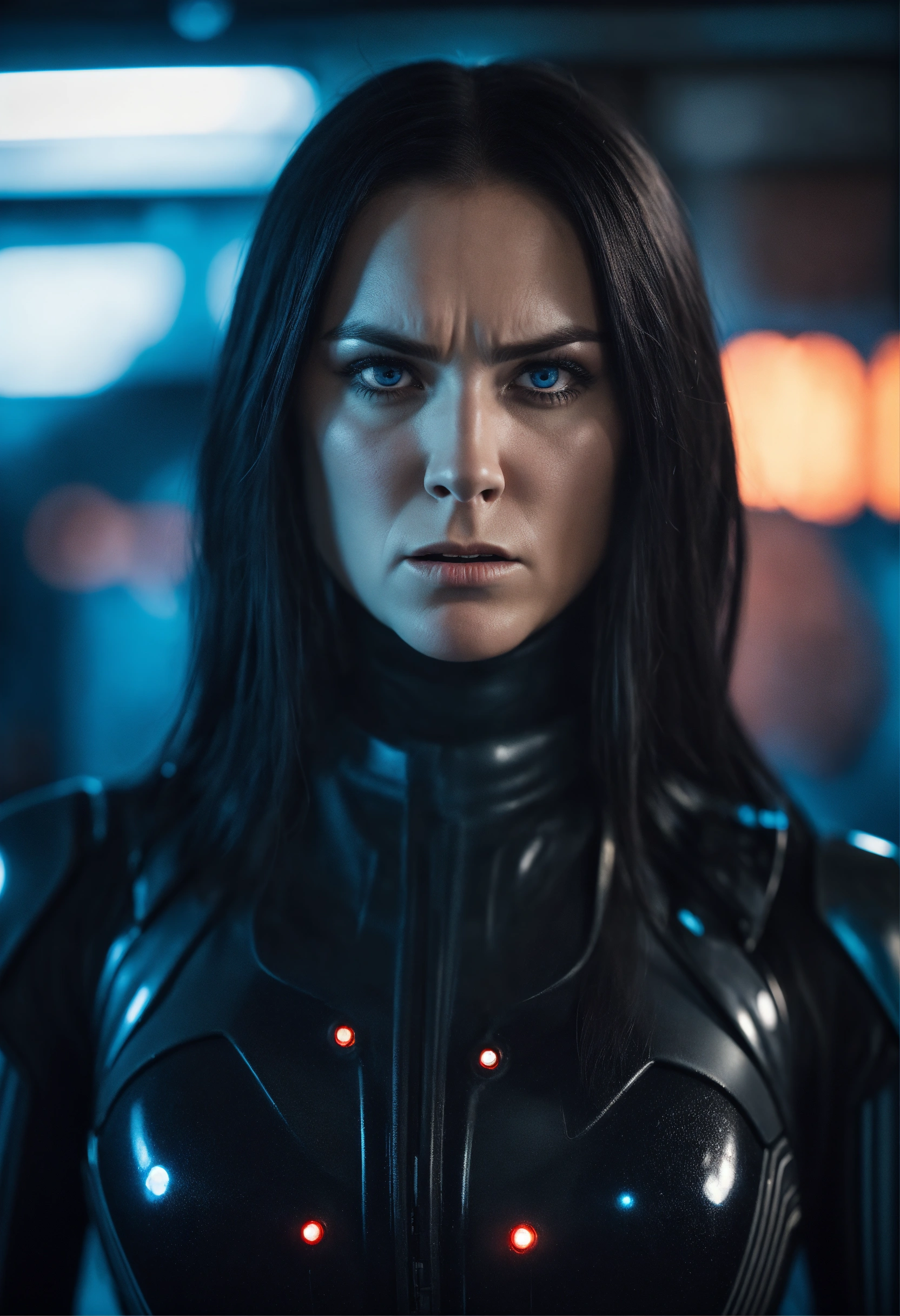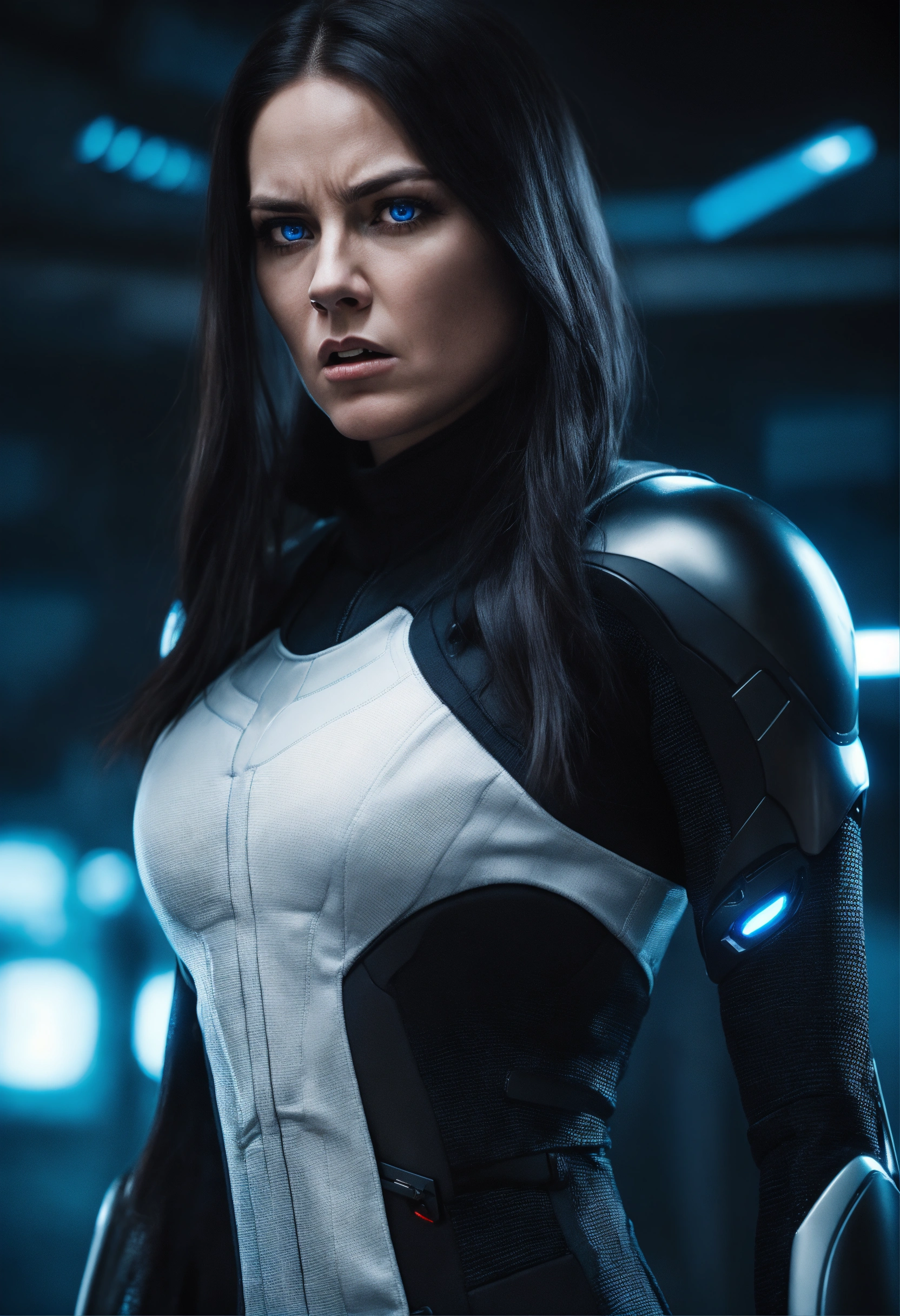 A realistic photograph of a white furious 30-year-old woman, with a choleric expression, scary face, with black long straight hair, deep blue eyes, wearing a black polymer sci-fi training suit, strong body, dramatic illumination, hyperdetailed, hyperrealistic, 8 k
