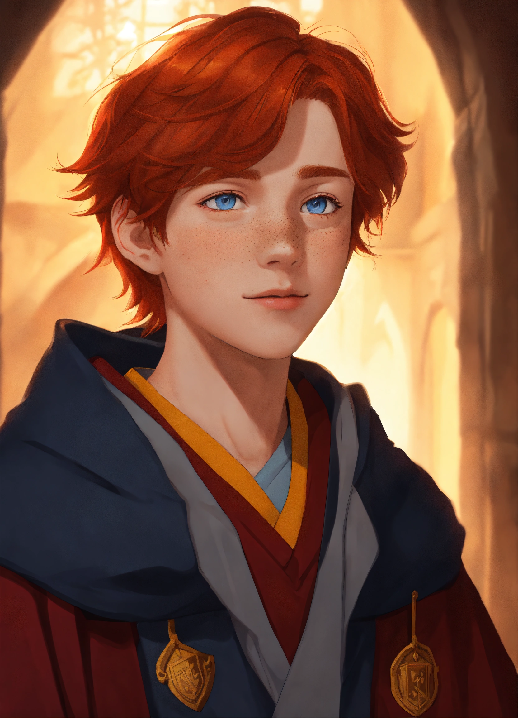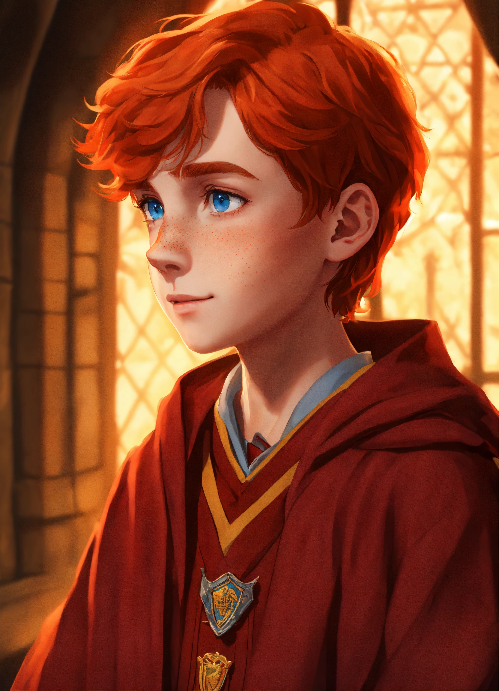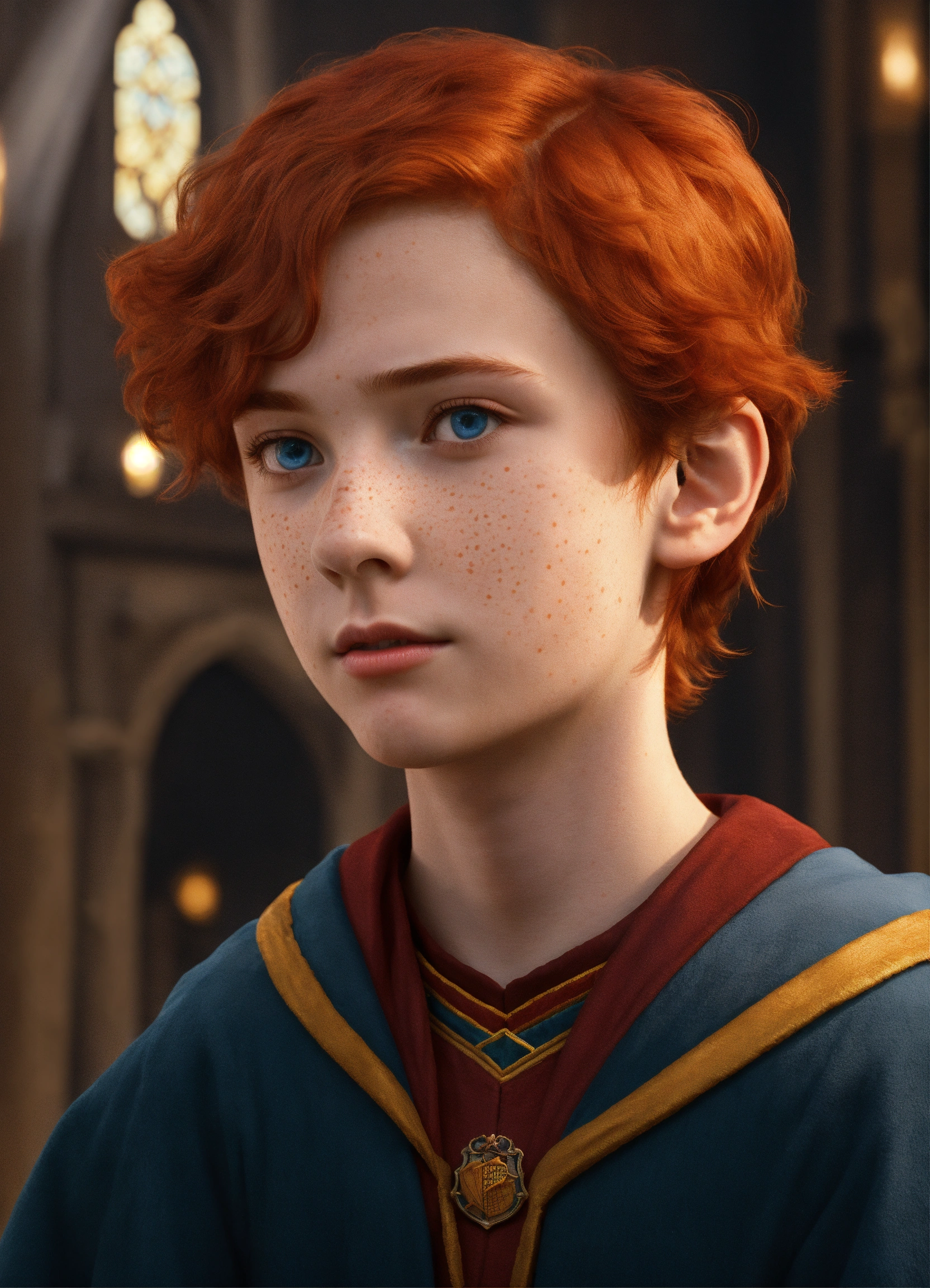 11-year-old male, red hair, freckles, blue eyes, long nose, tall lanky, gryffindor robes, facing camera, facing forward, animated