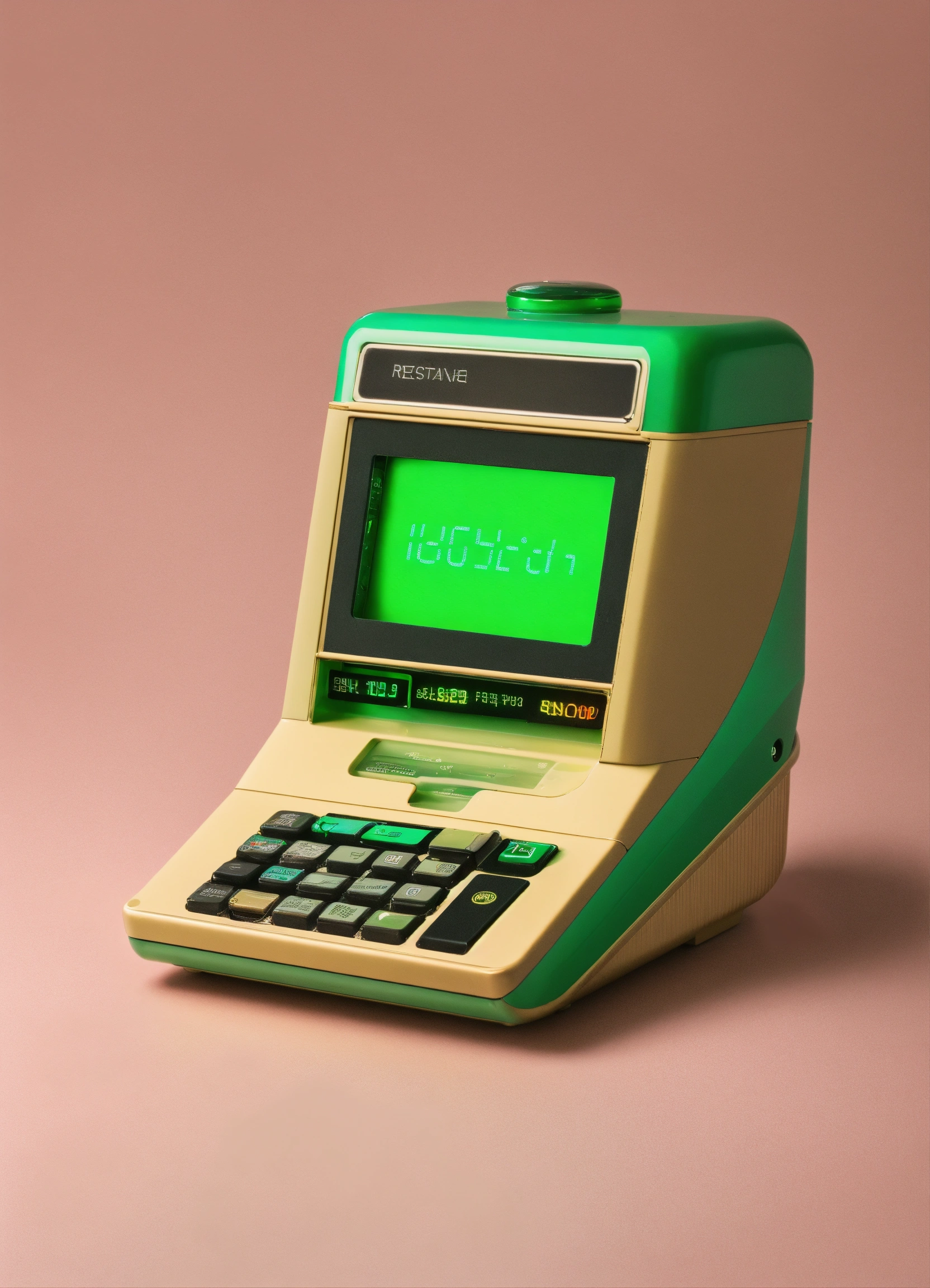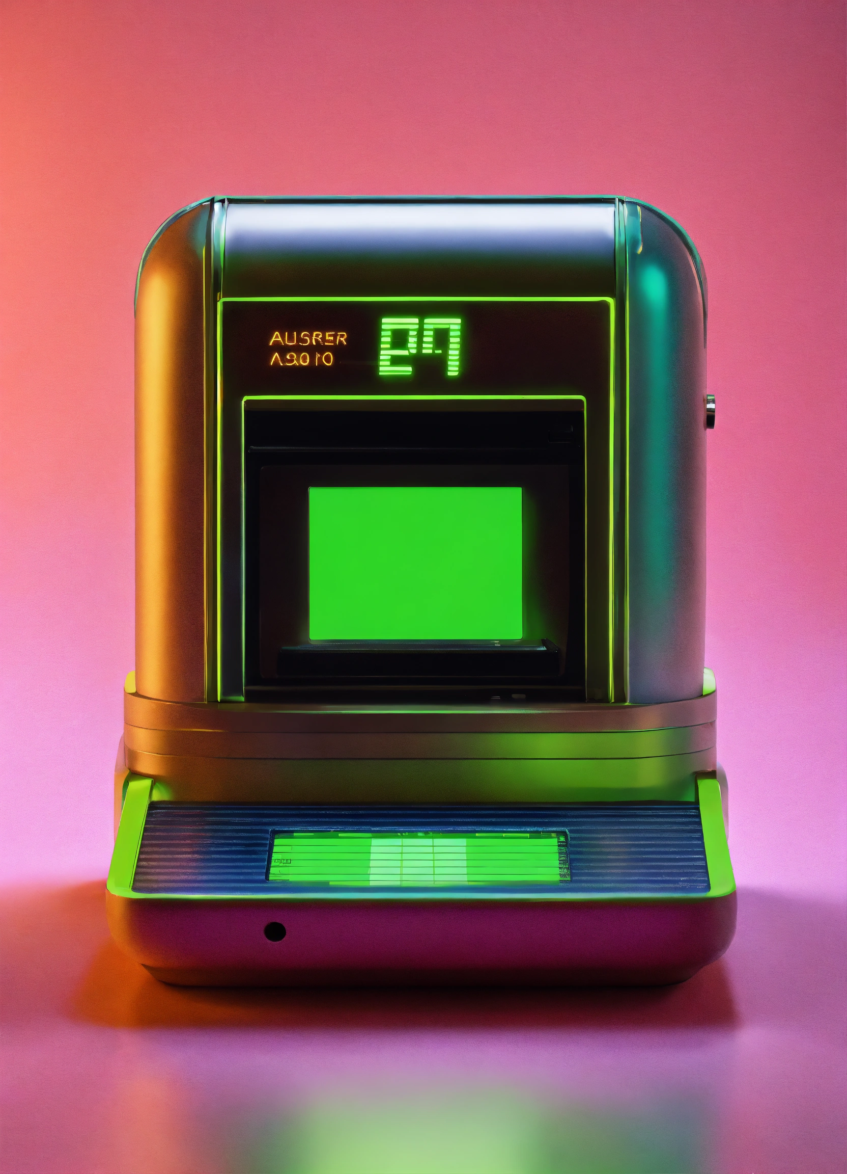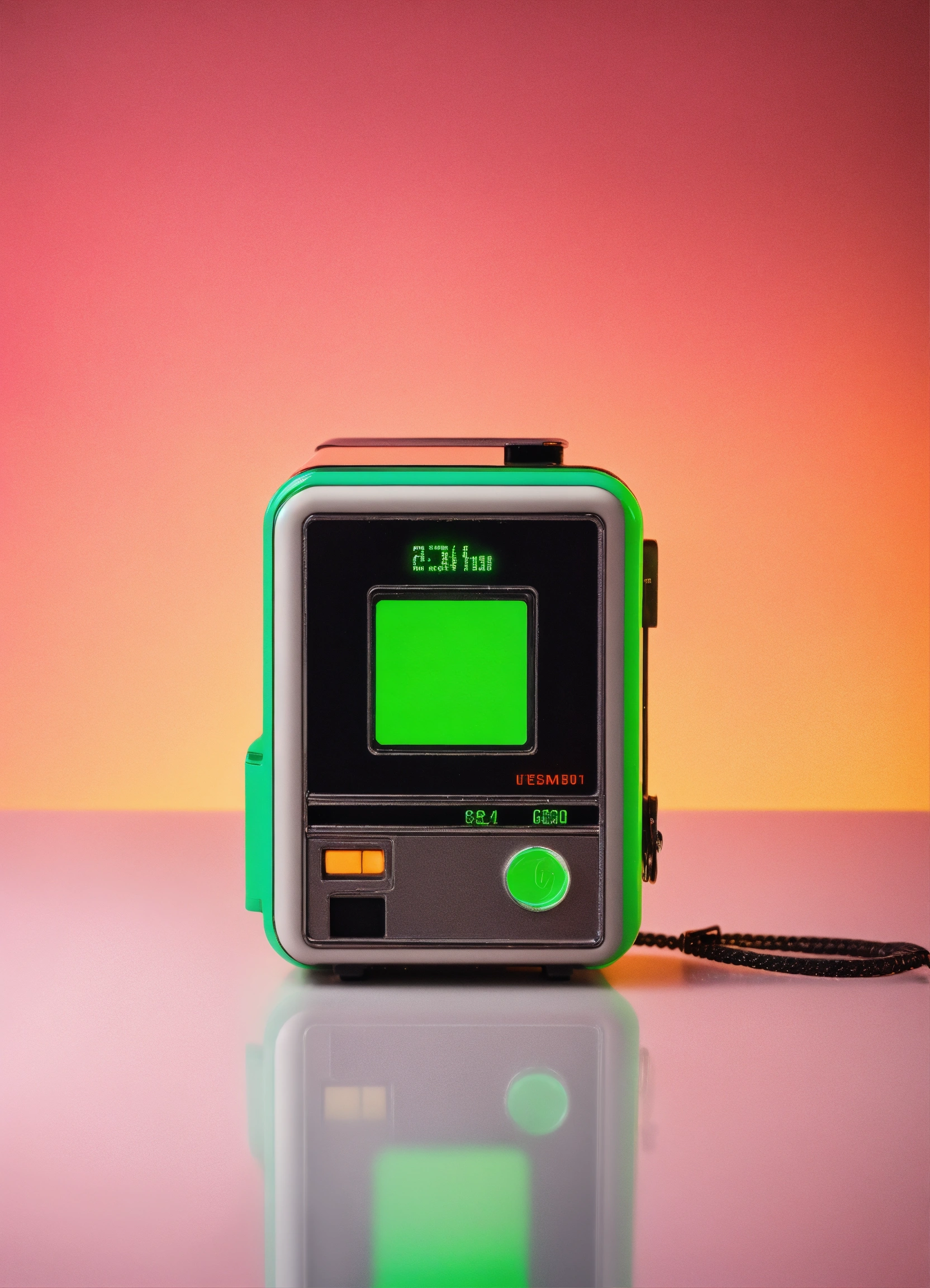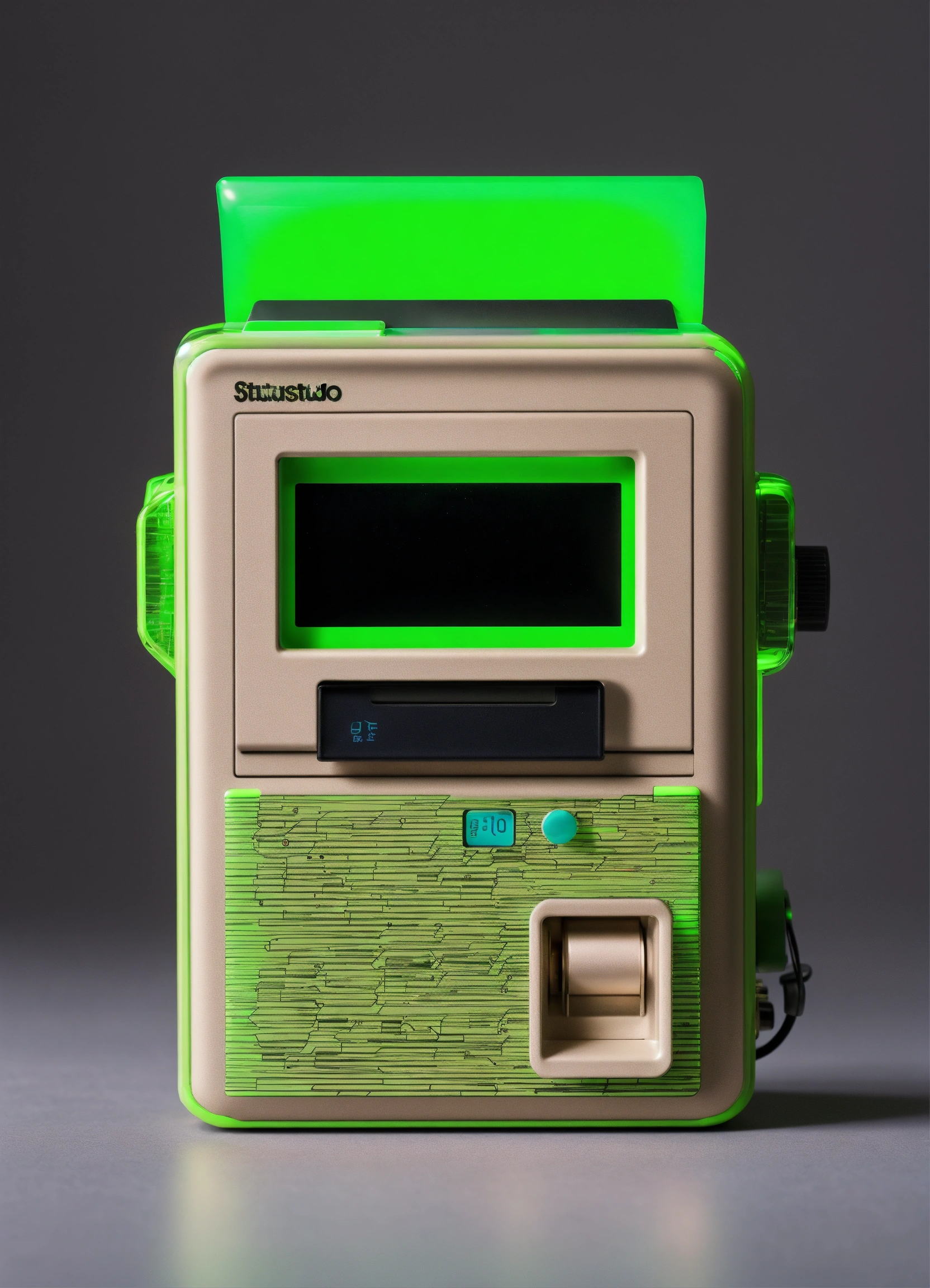 Retro futuristic very simple small compact device that accepts money and shows a digital screen that takes up the majority of the front, realistic, studio photography, neutral background, small pops of neon green