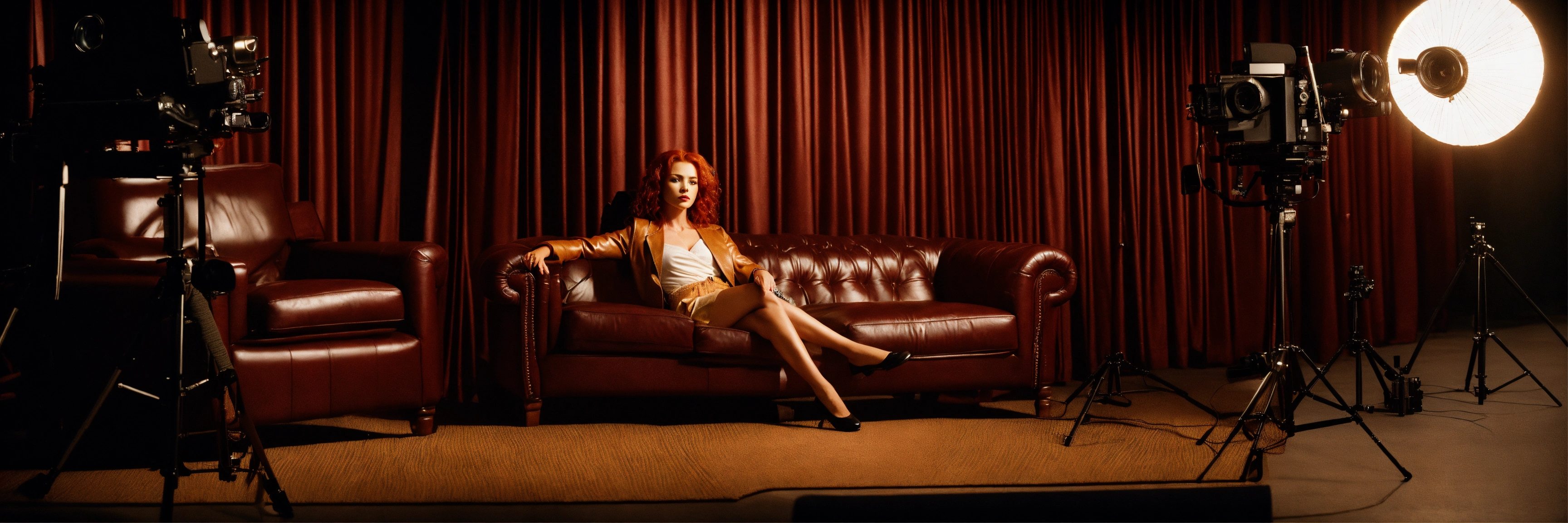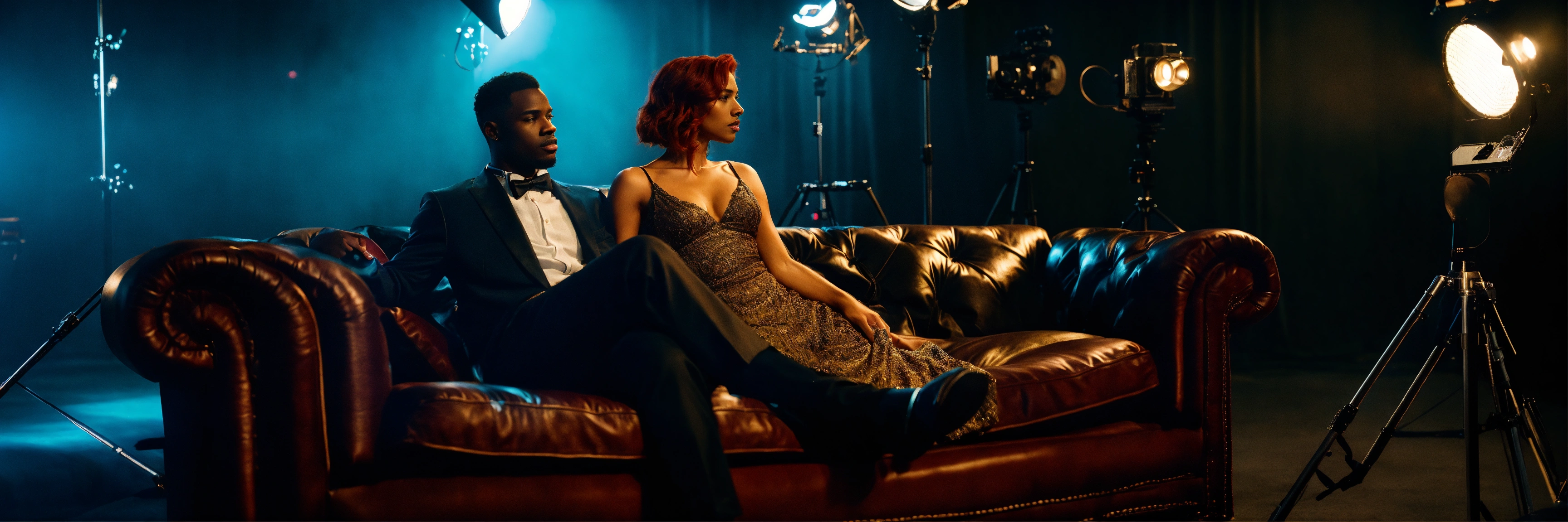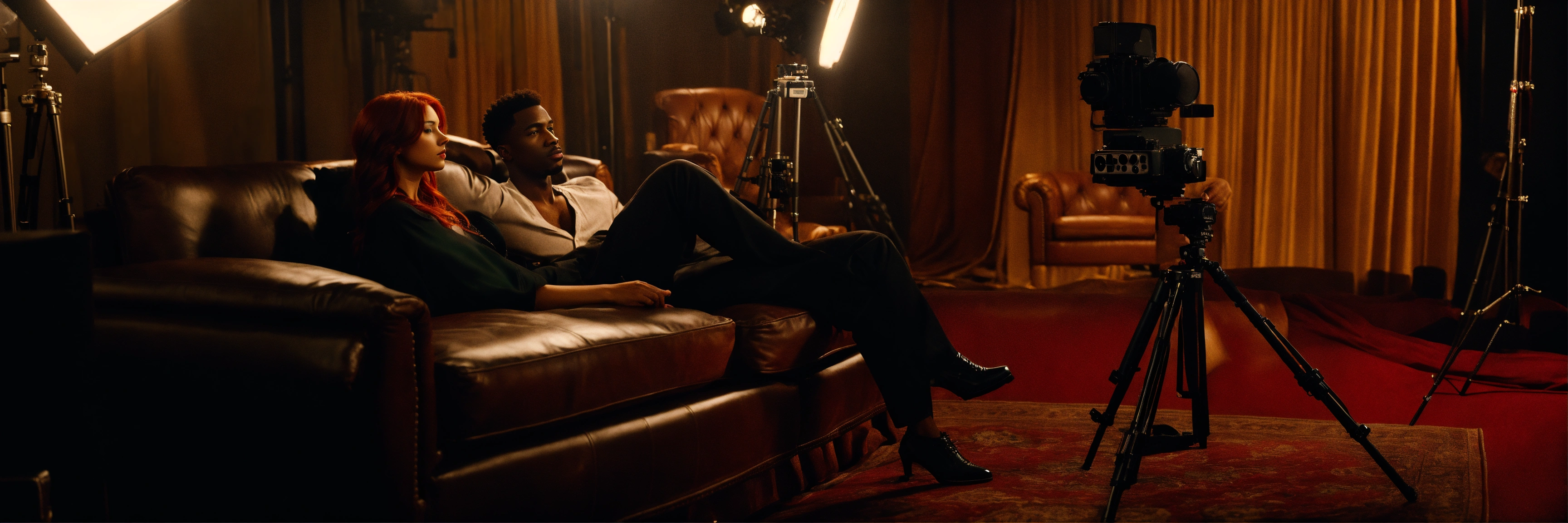 Dark aesthetic long shot, a charming redhead woman and dark black male gentleman, laying on a extra long leather sofa with film camera equipment behind them, on a hollywood set with film lights and a film camera fine details, attention to detail, shadow play, 8k