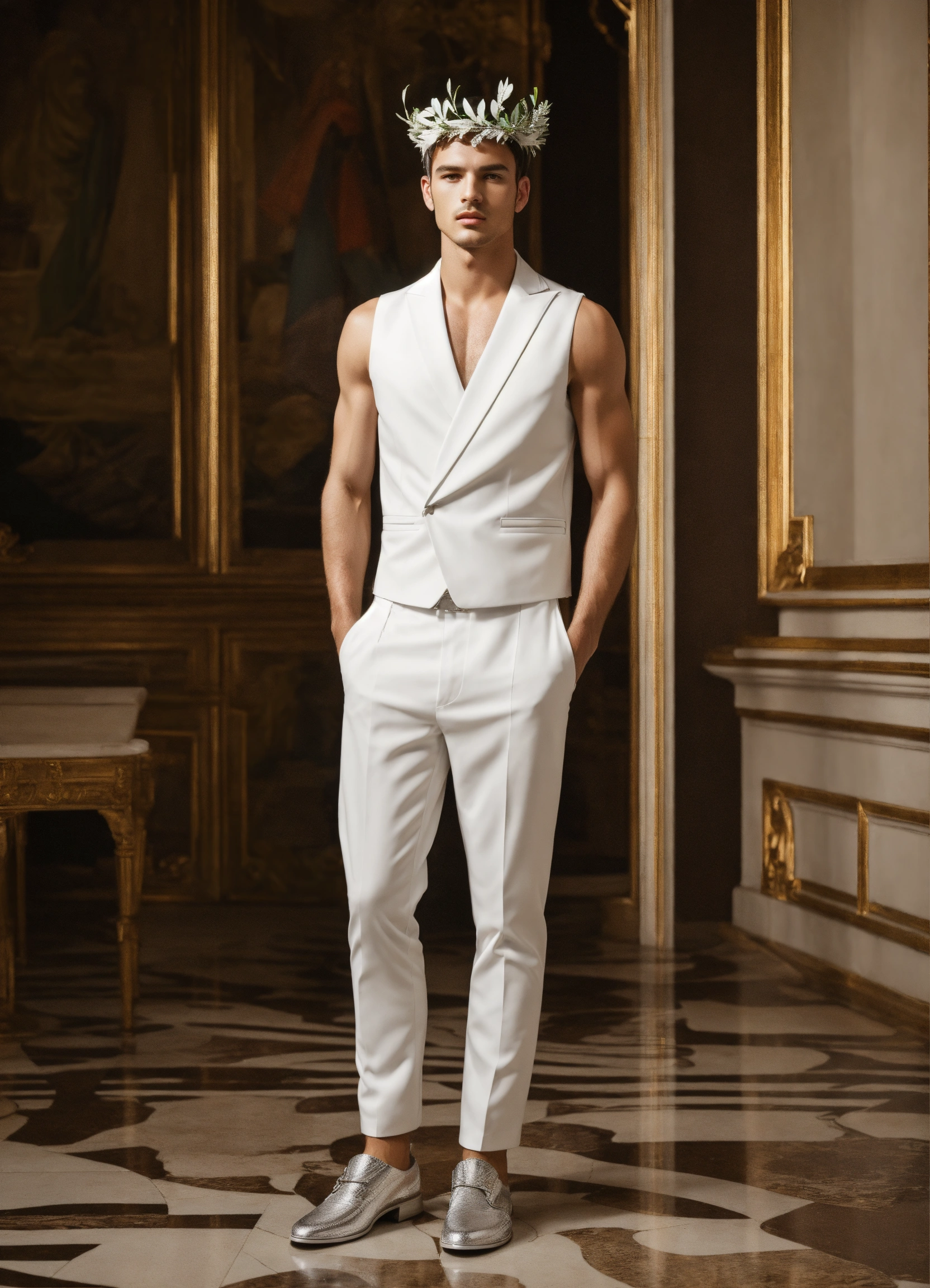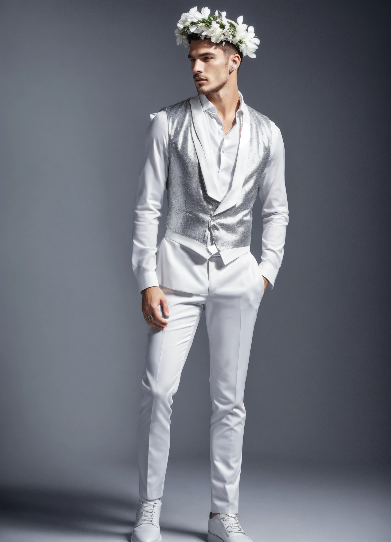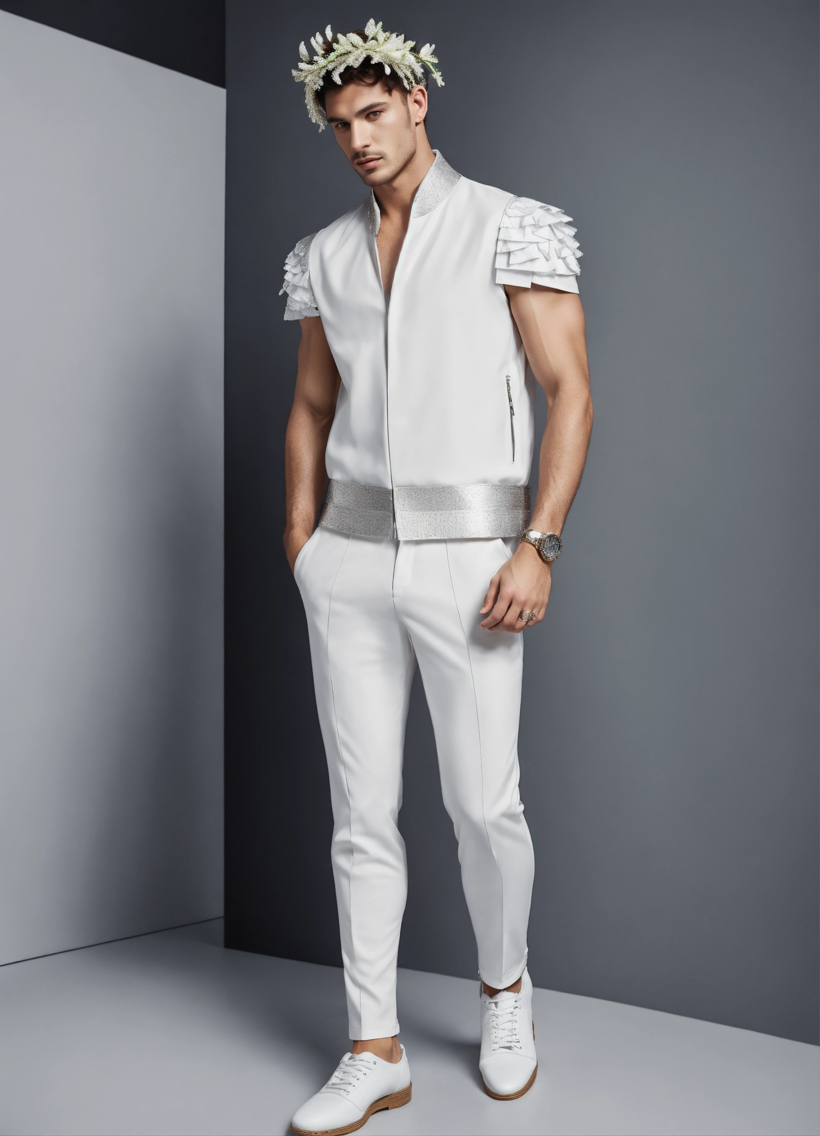 Men wears light white silver greek special modern high fashion clothes, sleeveless wit a laurel wreath on head, full body