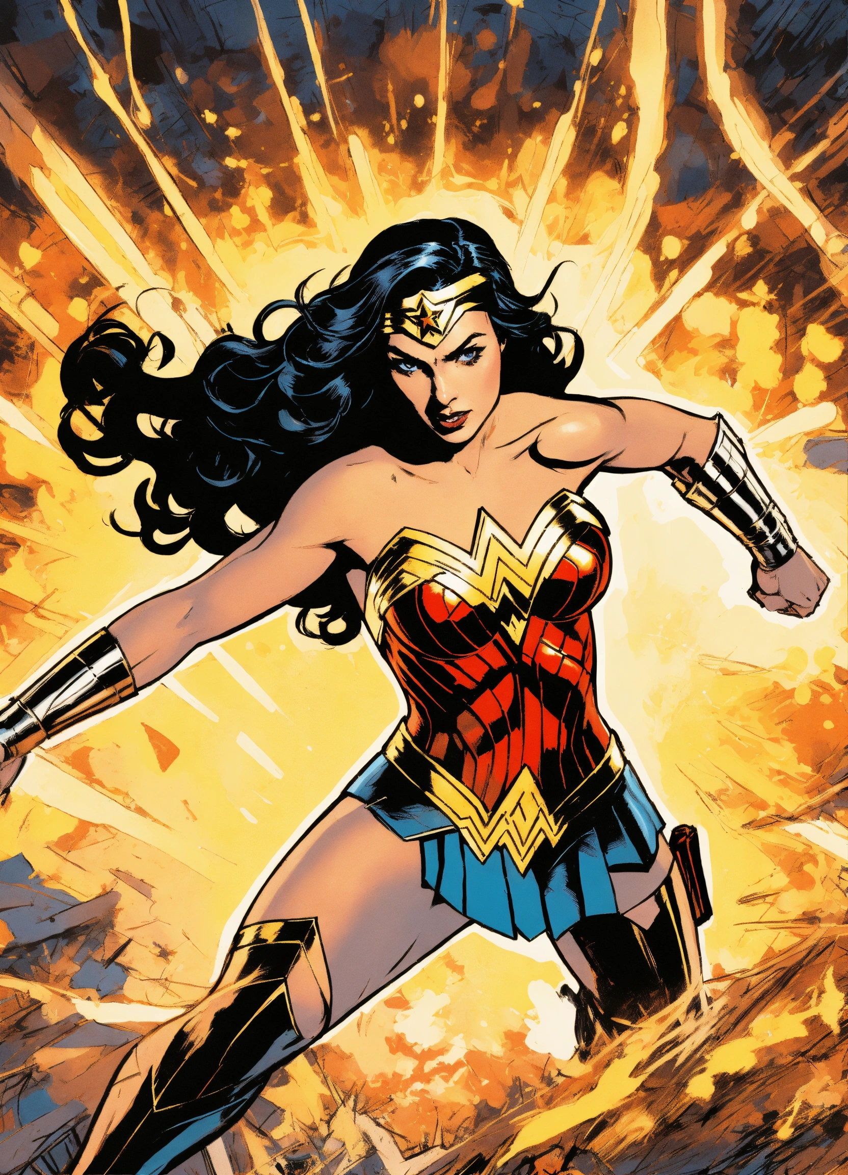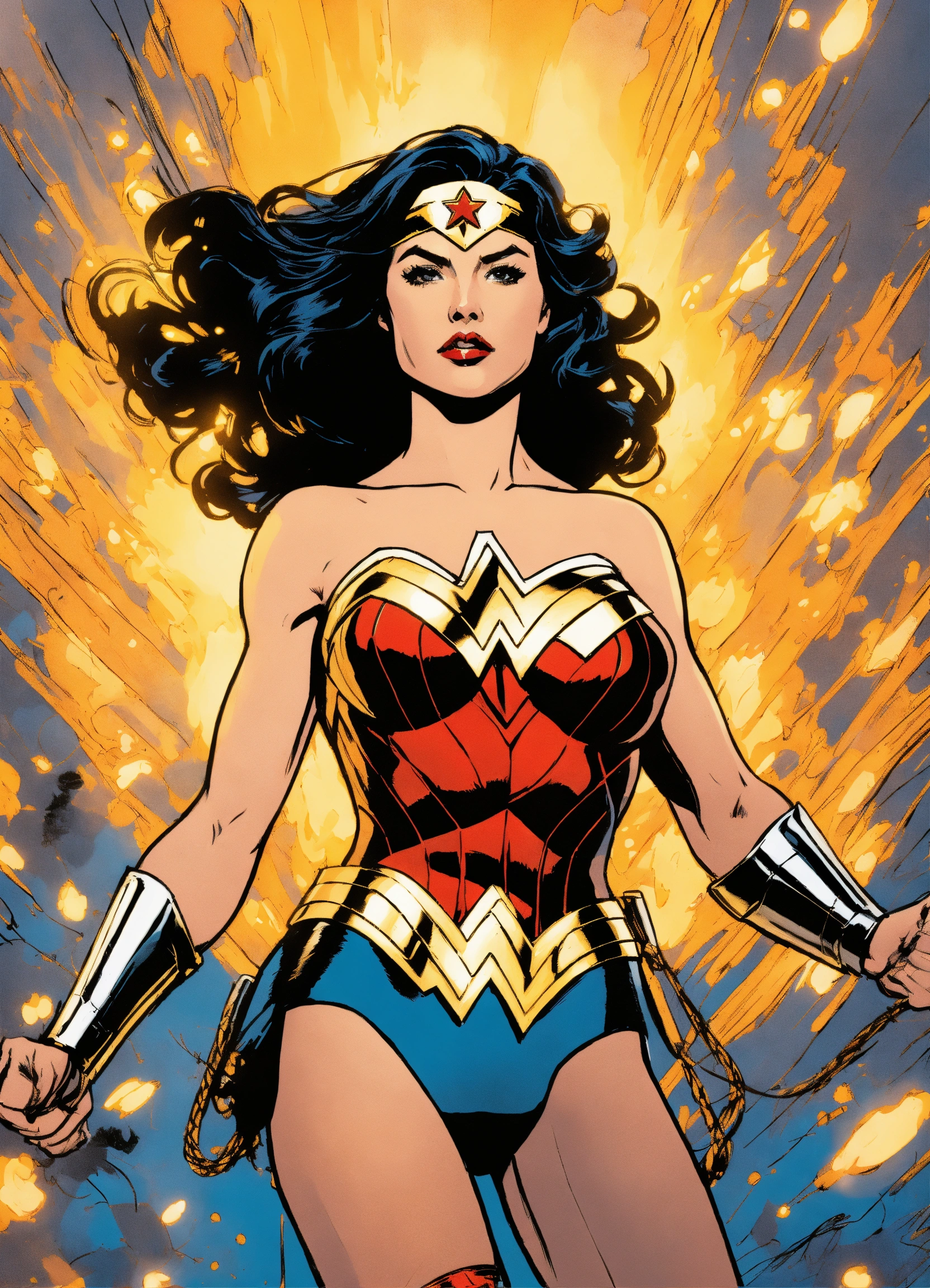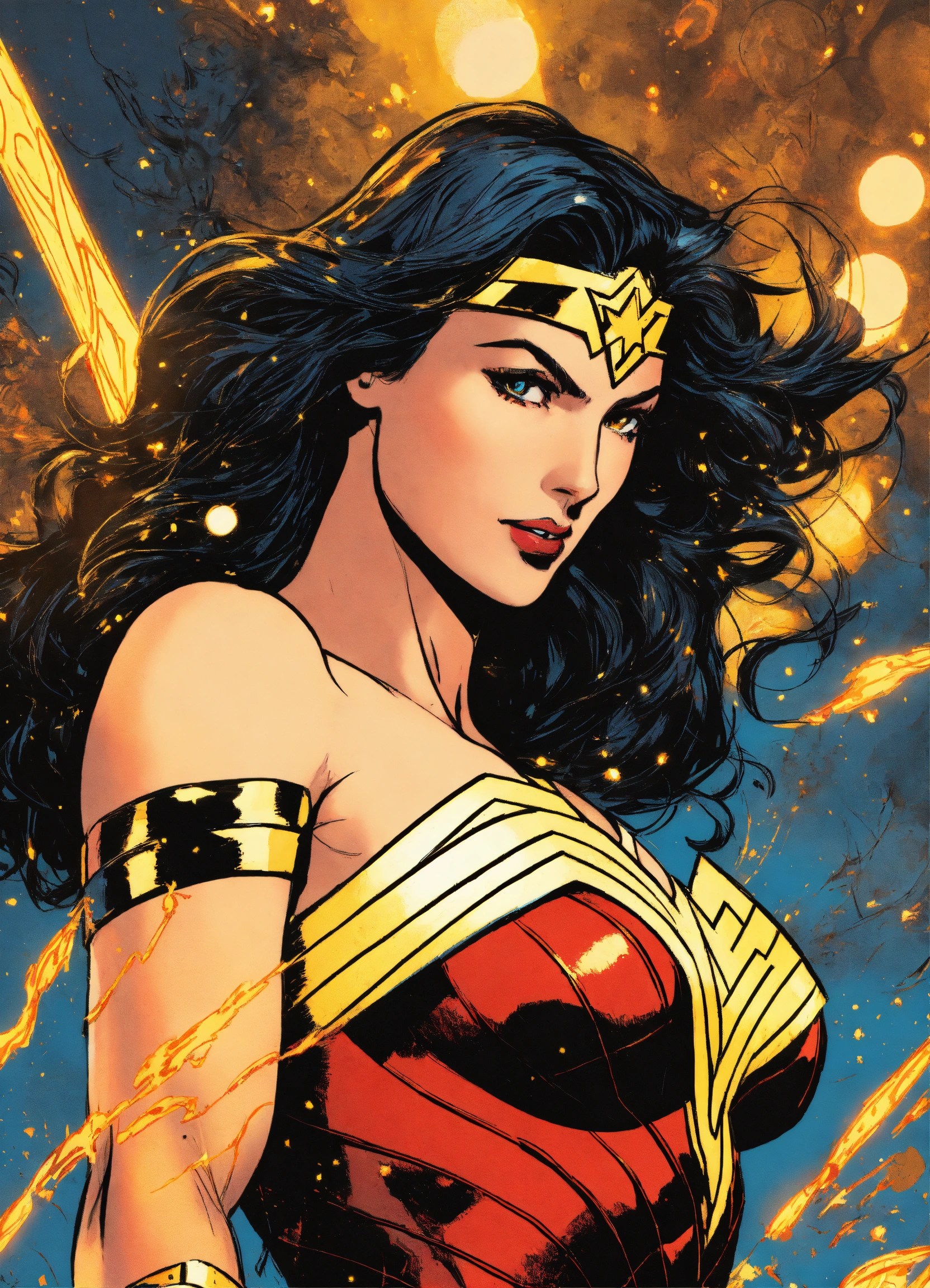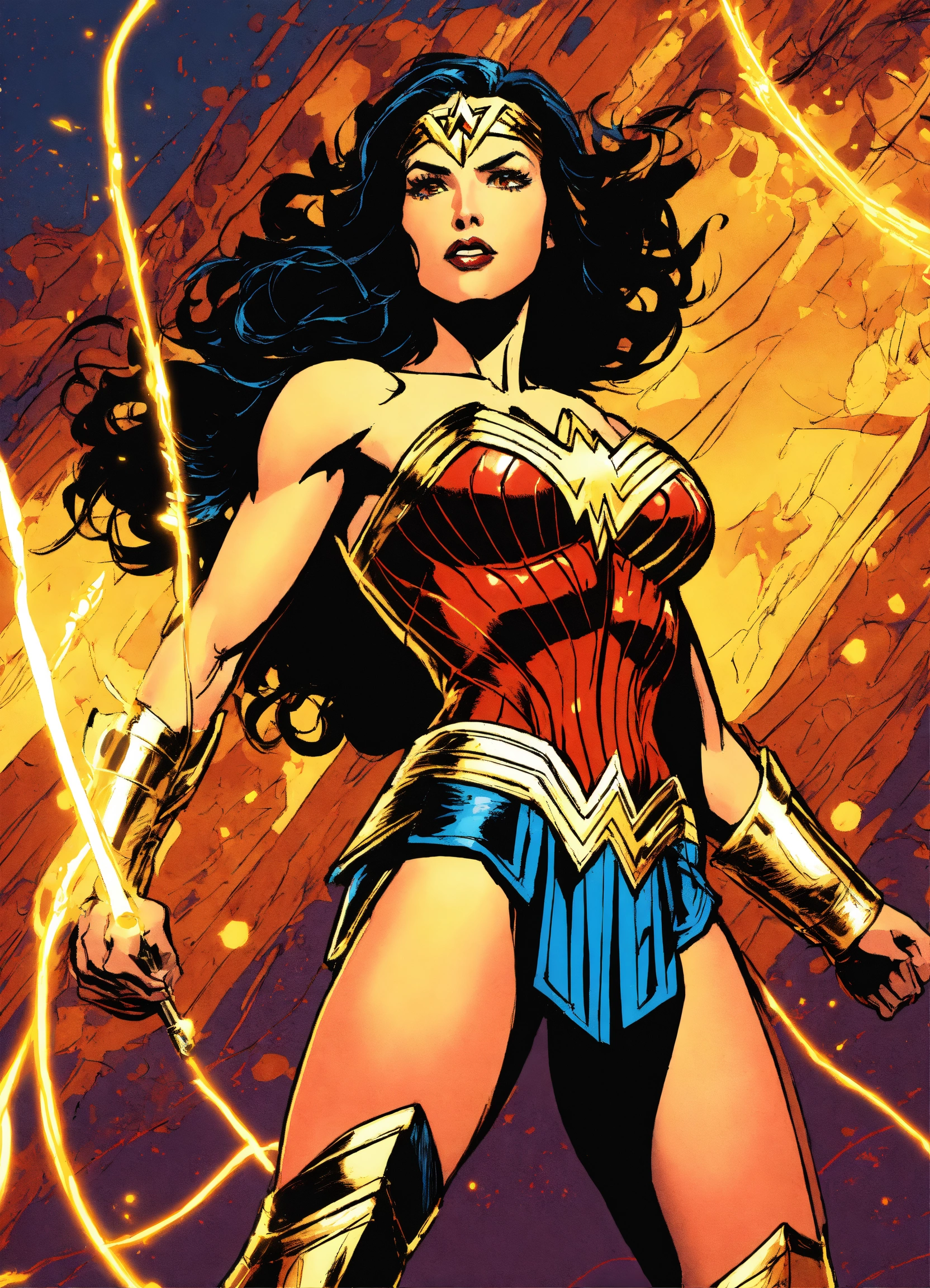 Pop art, wonder woman, action pose, glowing golden eyes, concept art, sharp focus, intricate, highly detailed, smooth, soft glow of a nightlight, art by jackson pollock, comic book art style