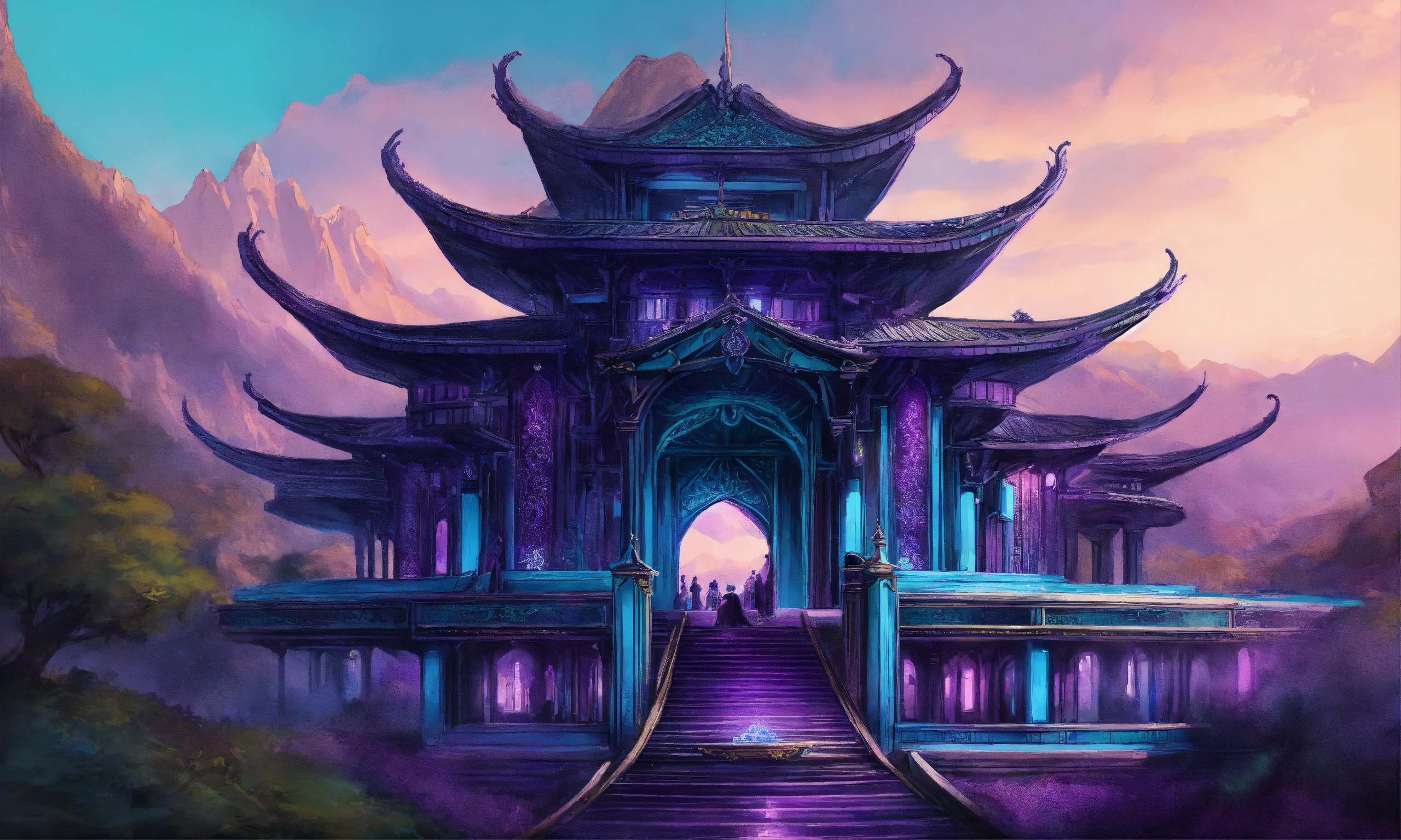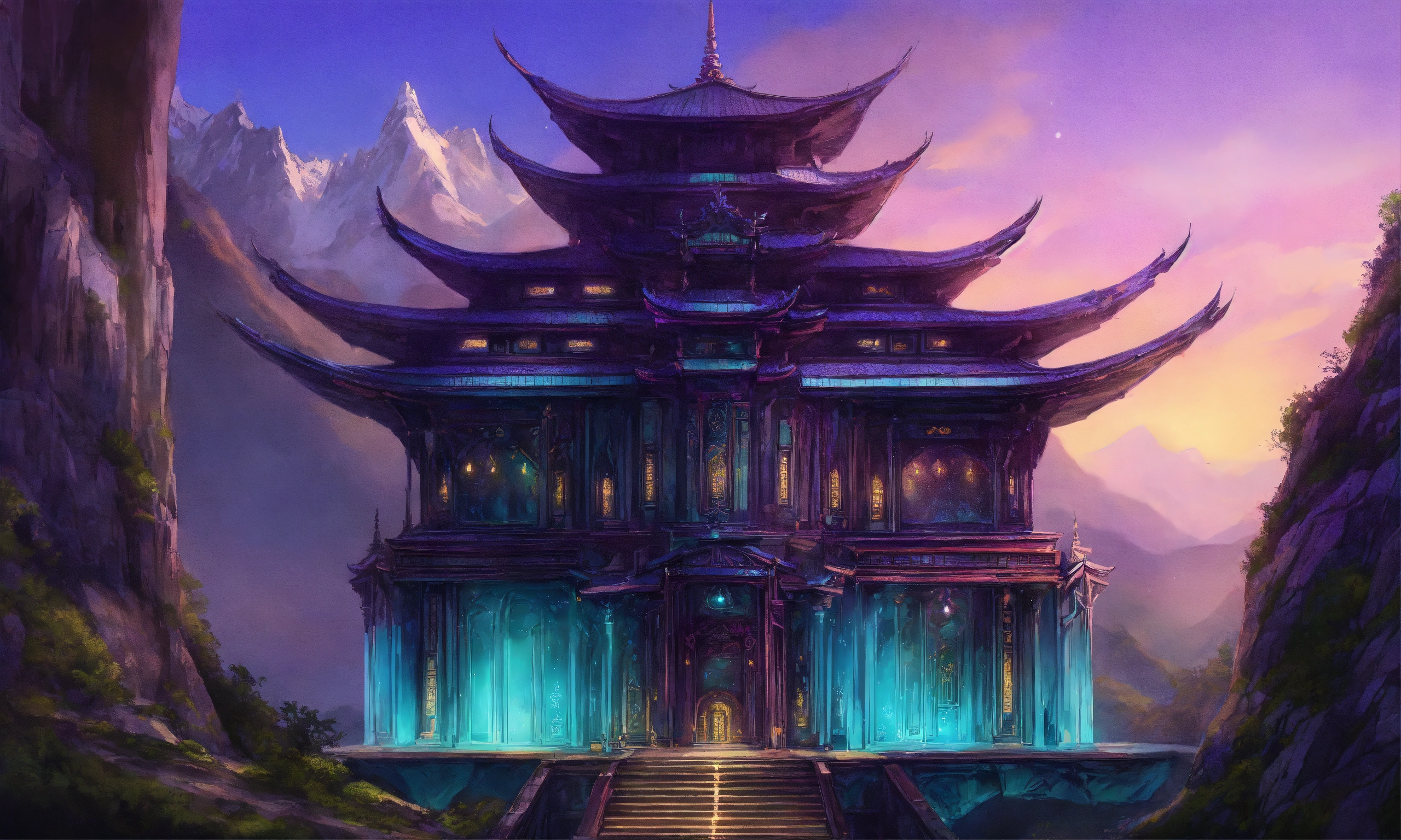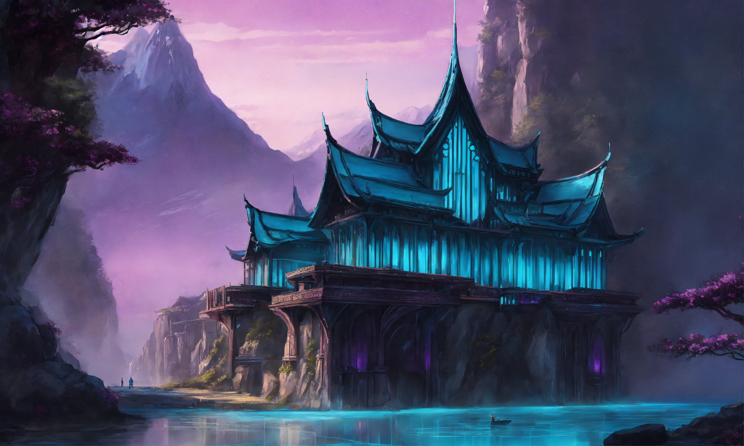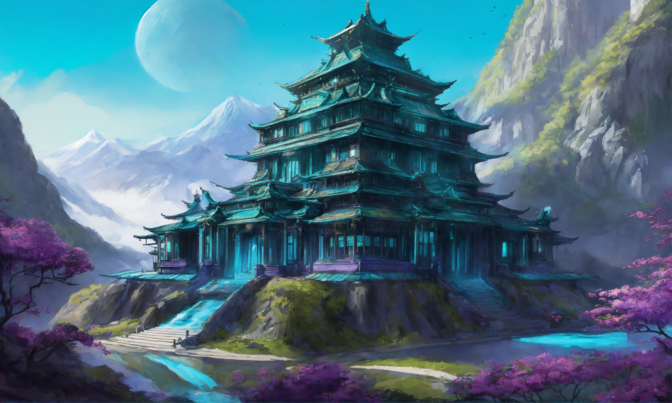 Drawing of a fully shown large black and purple and cyan elegant high elf sci fi palace in the mountains of asia, elven architecture, immensely detailed