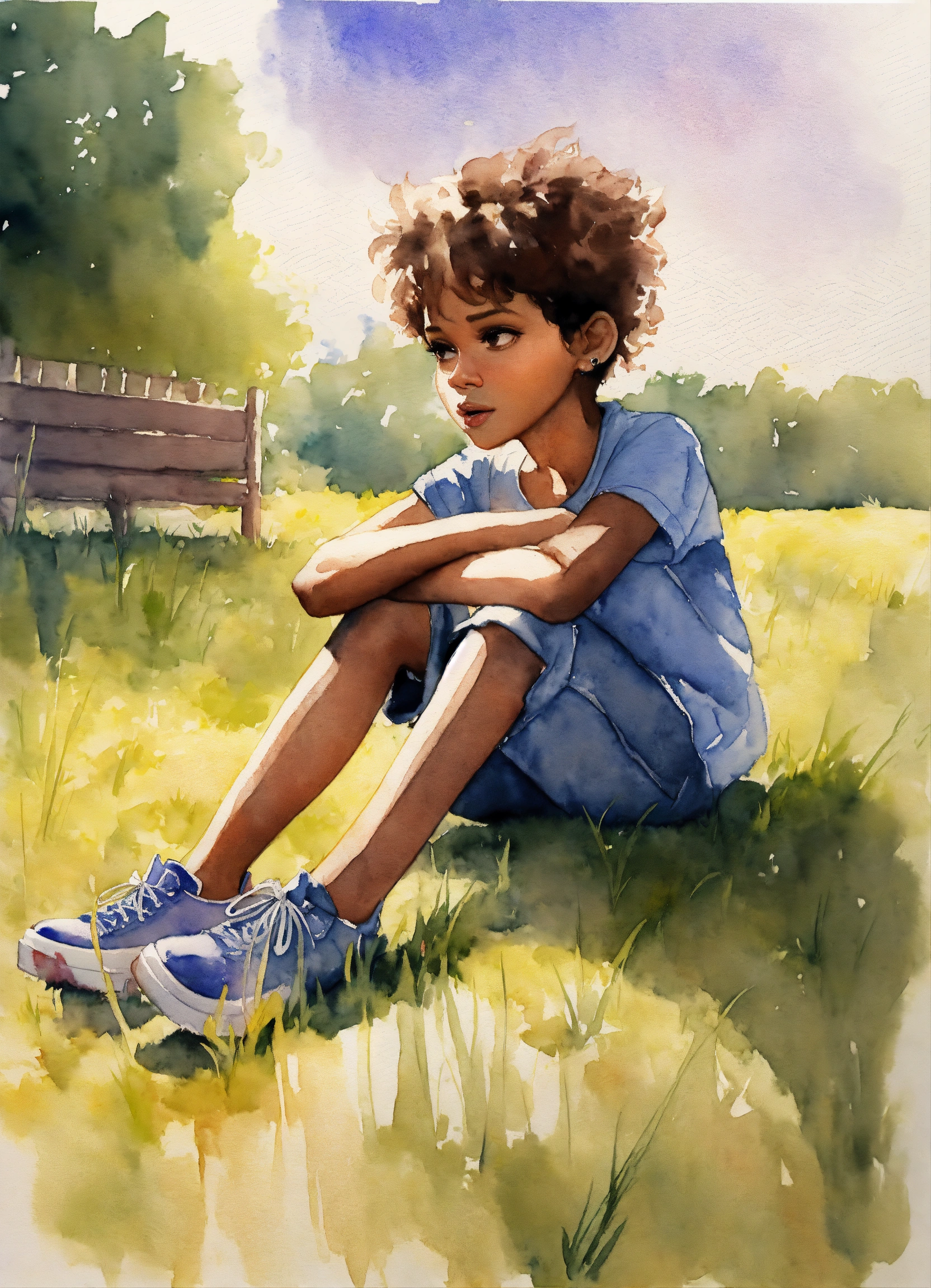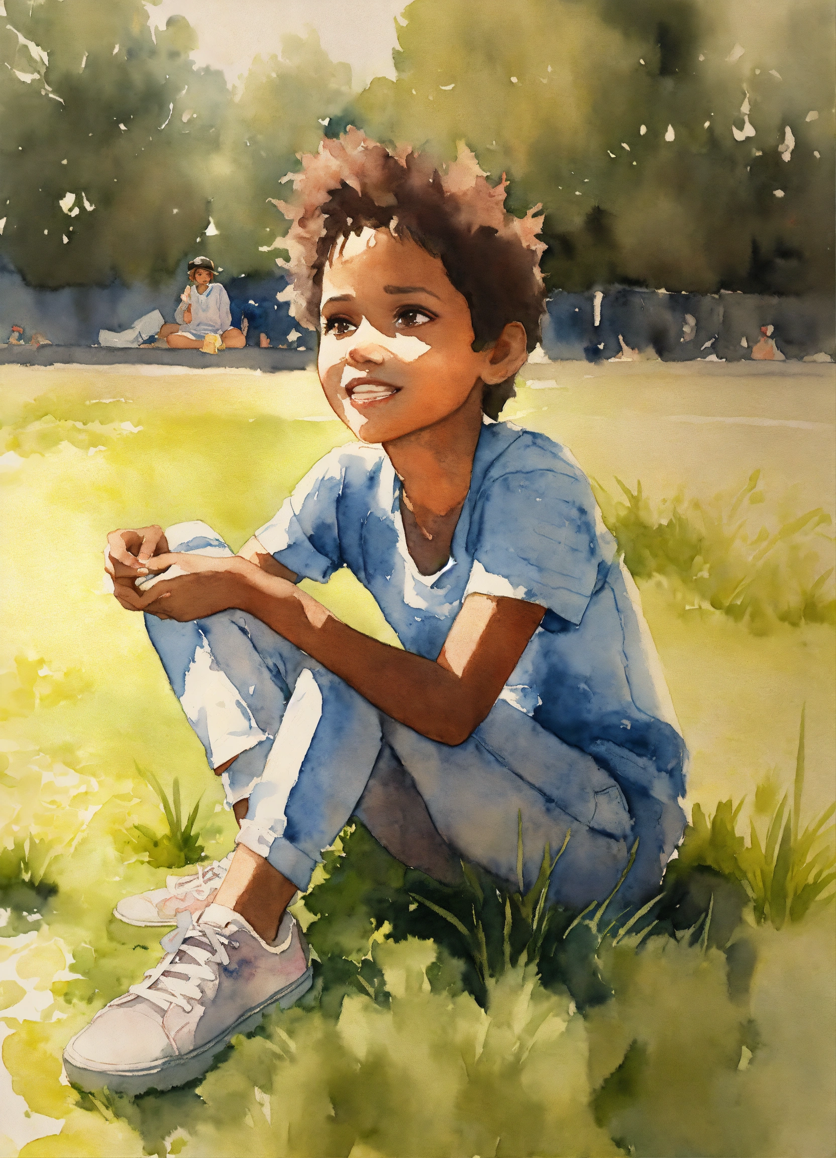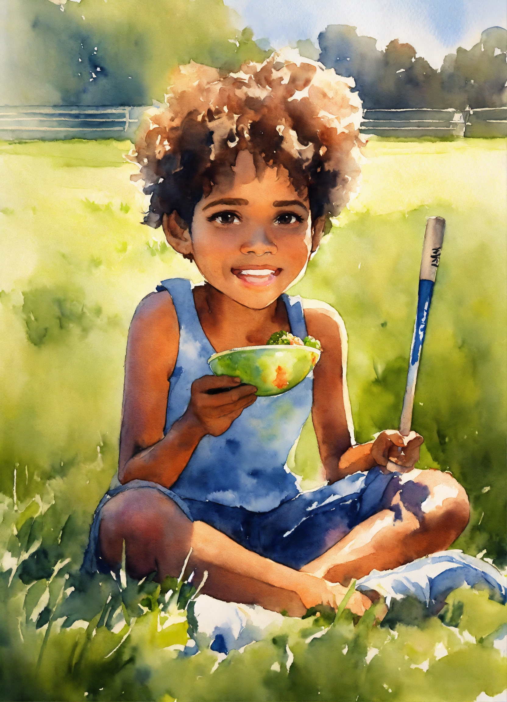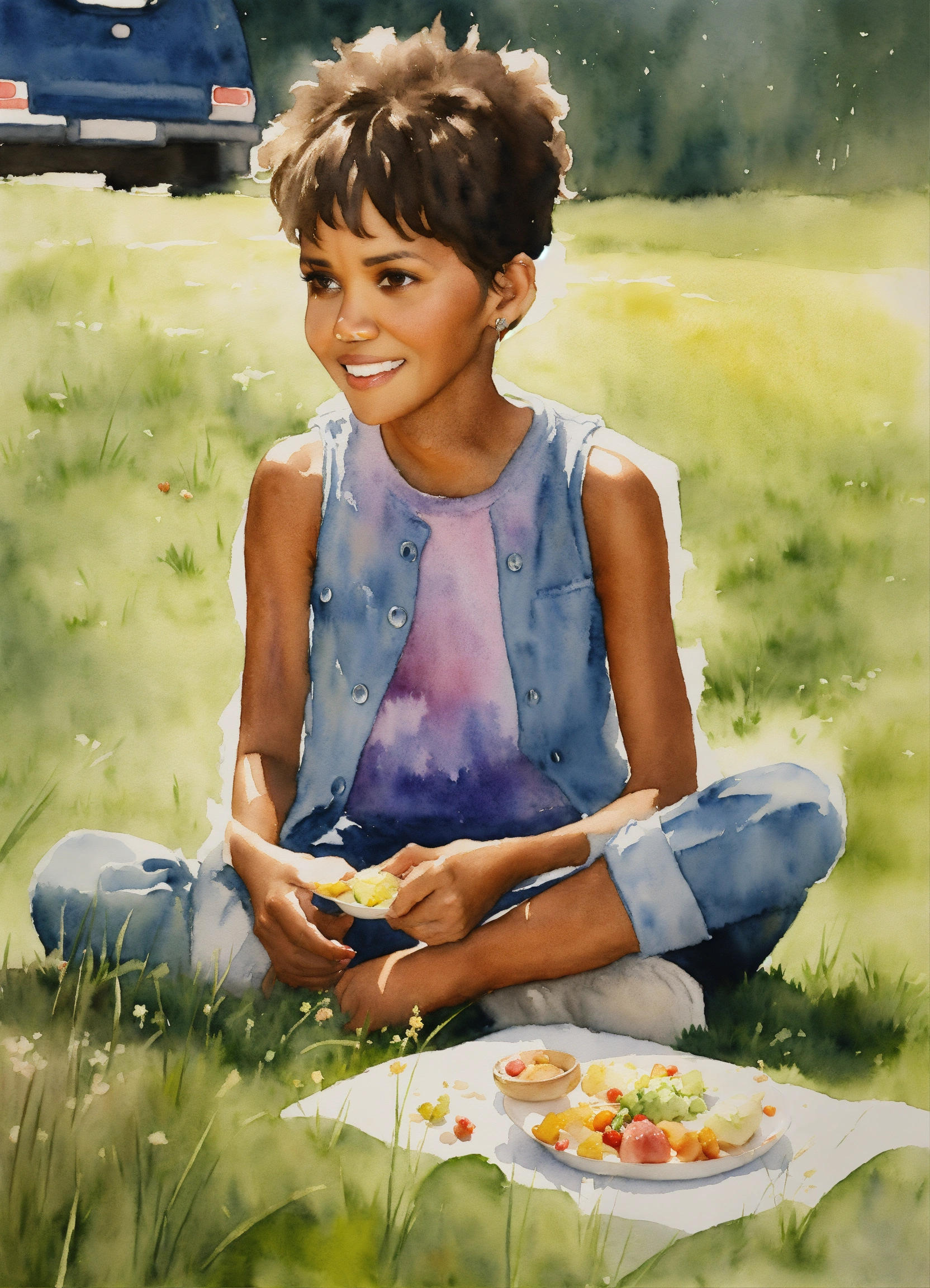 Watercolor pixar painting of 8 year old halle berry sitting on a grassy patch, enjoying food with the distant sound of a baseball game, pixar animation, natural features