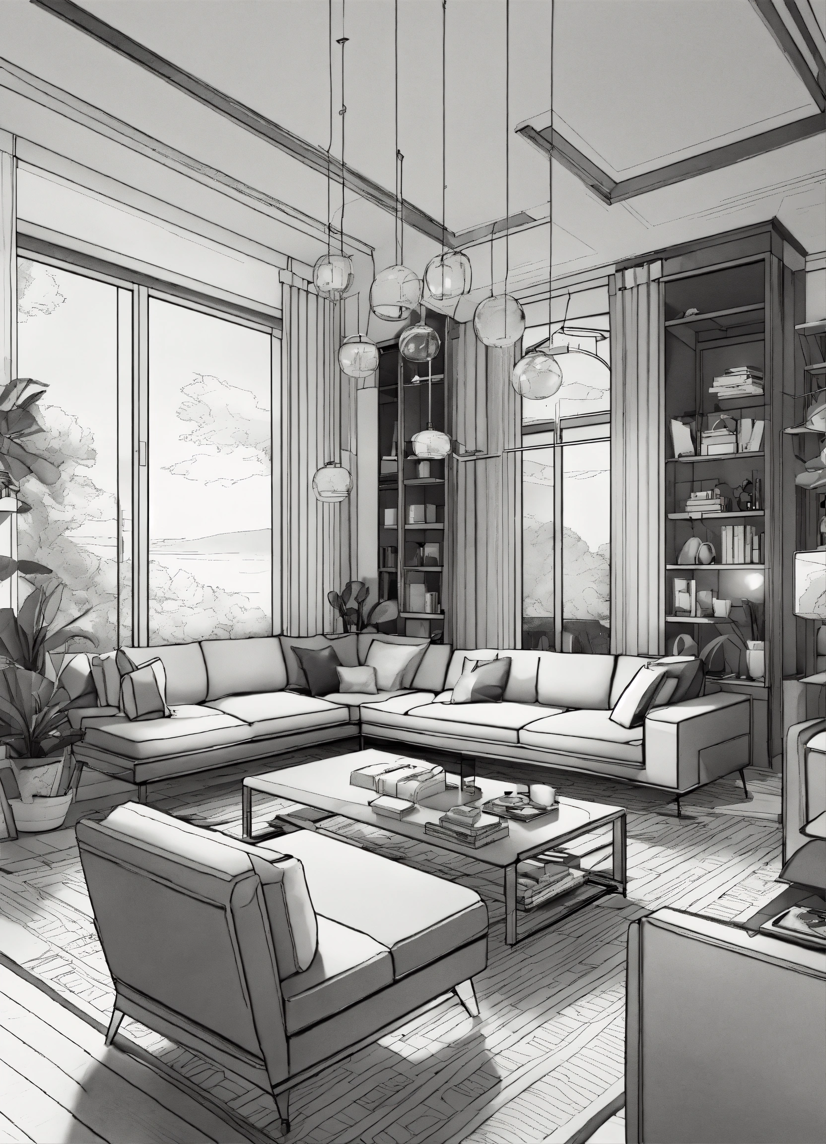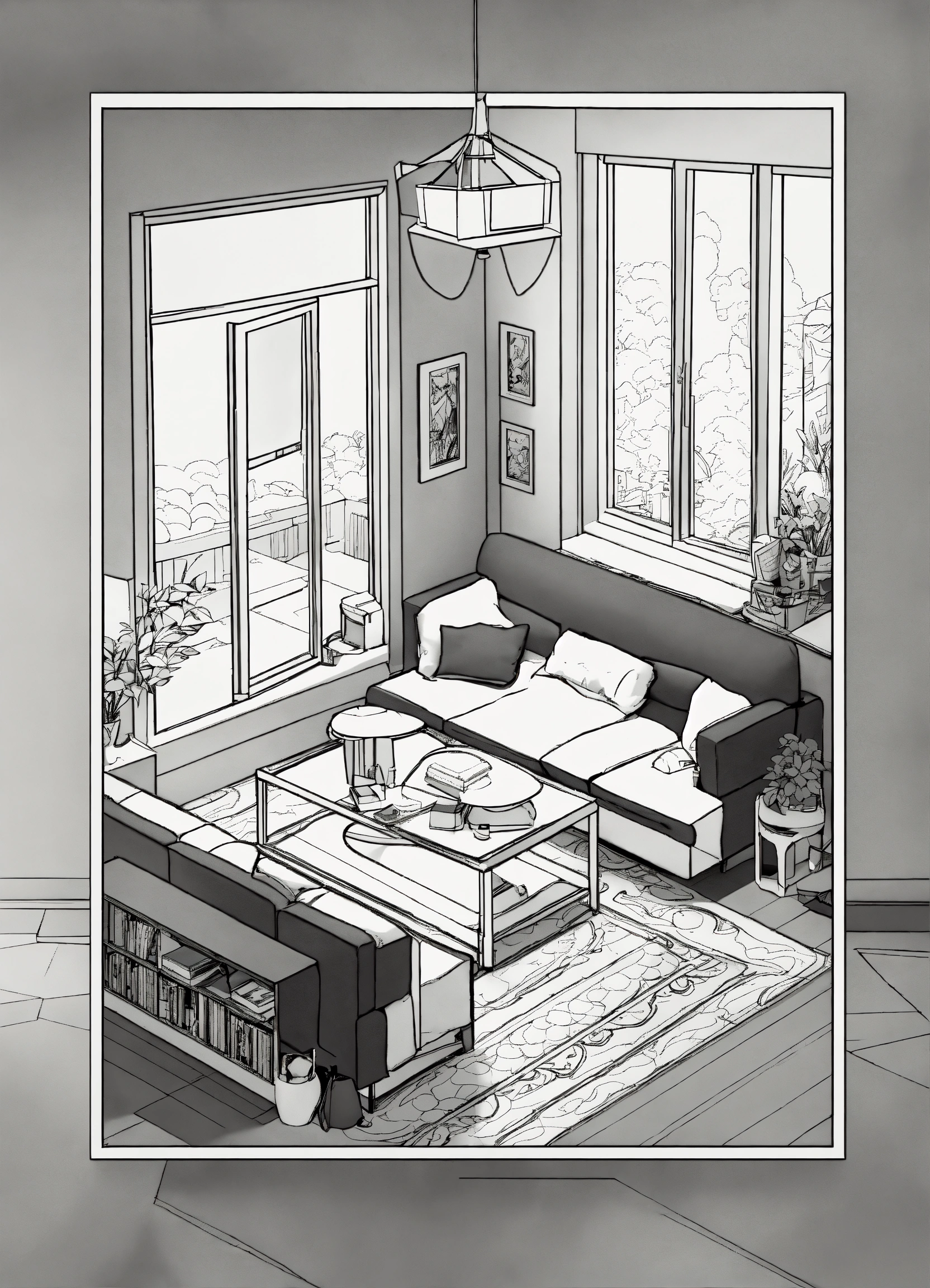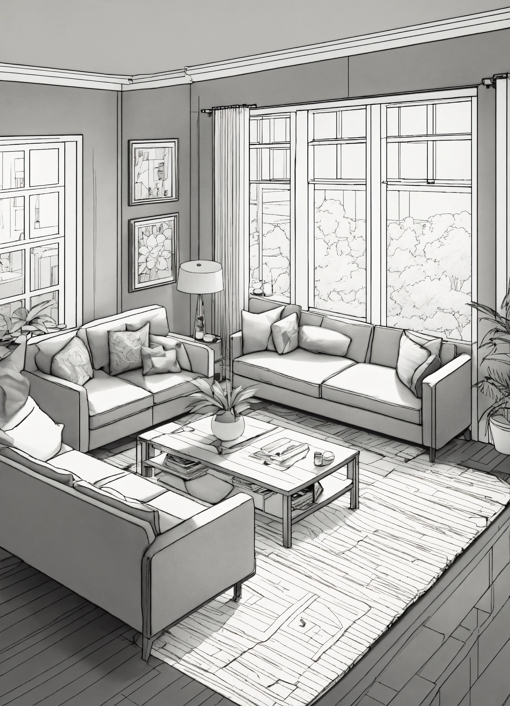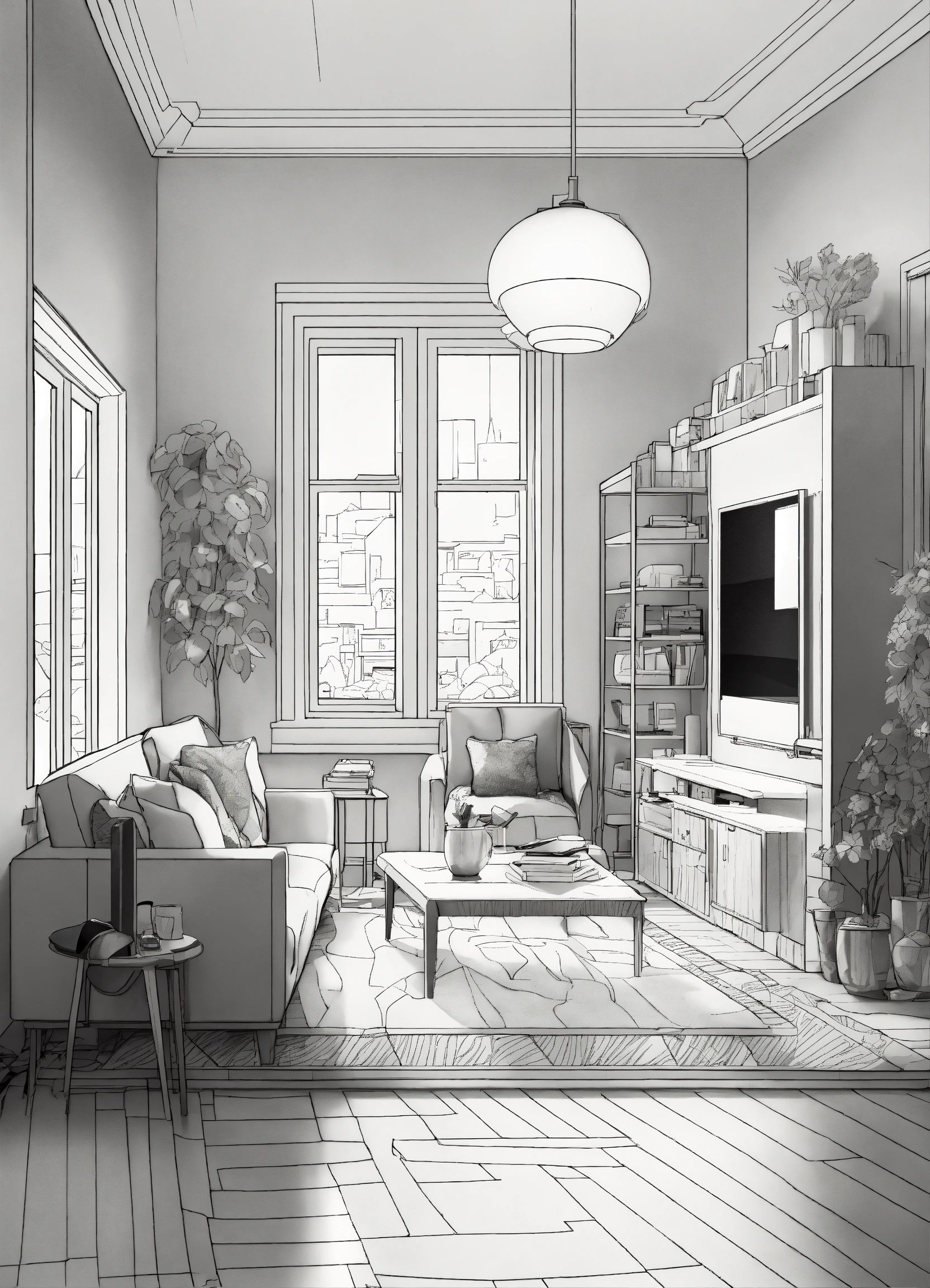 Coloring book page, isometric living room, 3d art, black and white, line art, soft lighting, high detail, artstation, concept art, behance