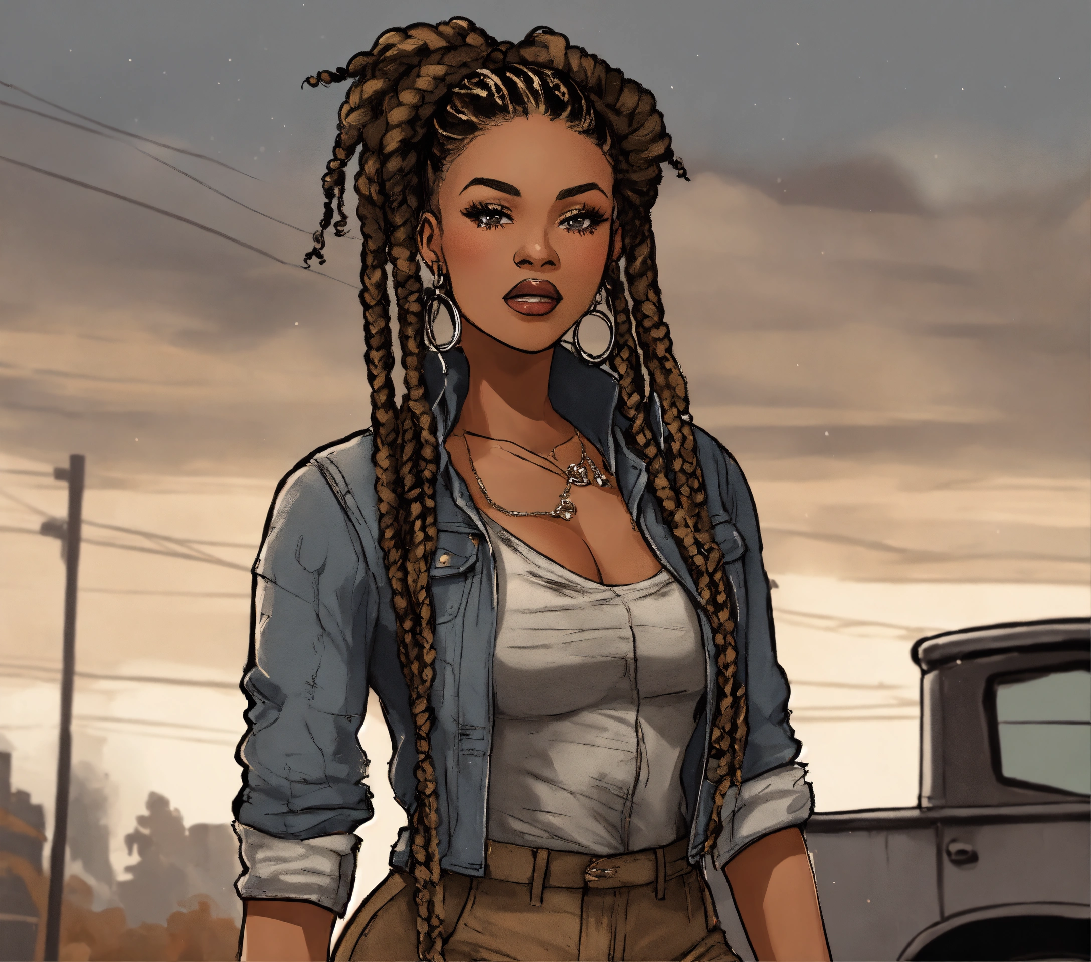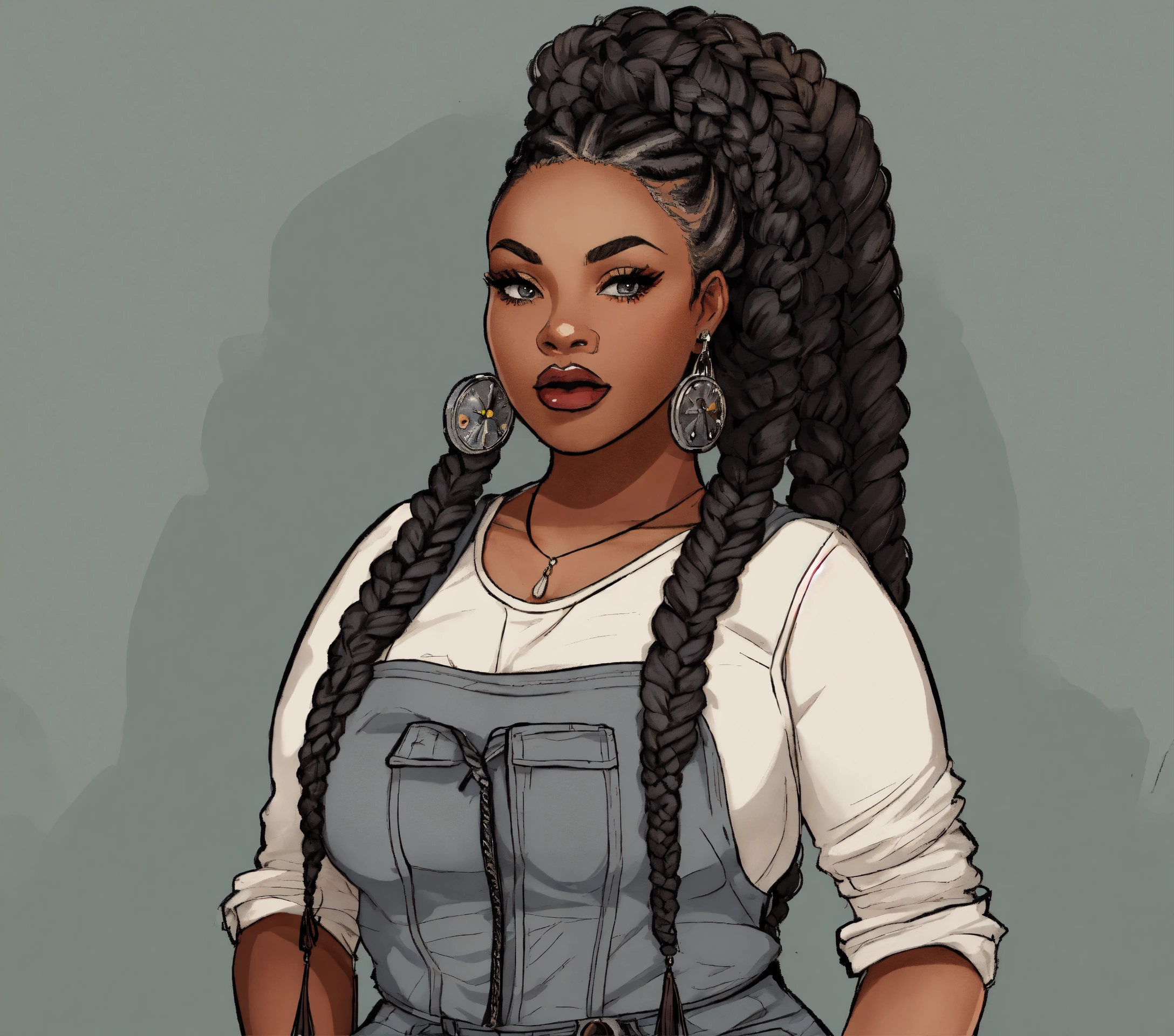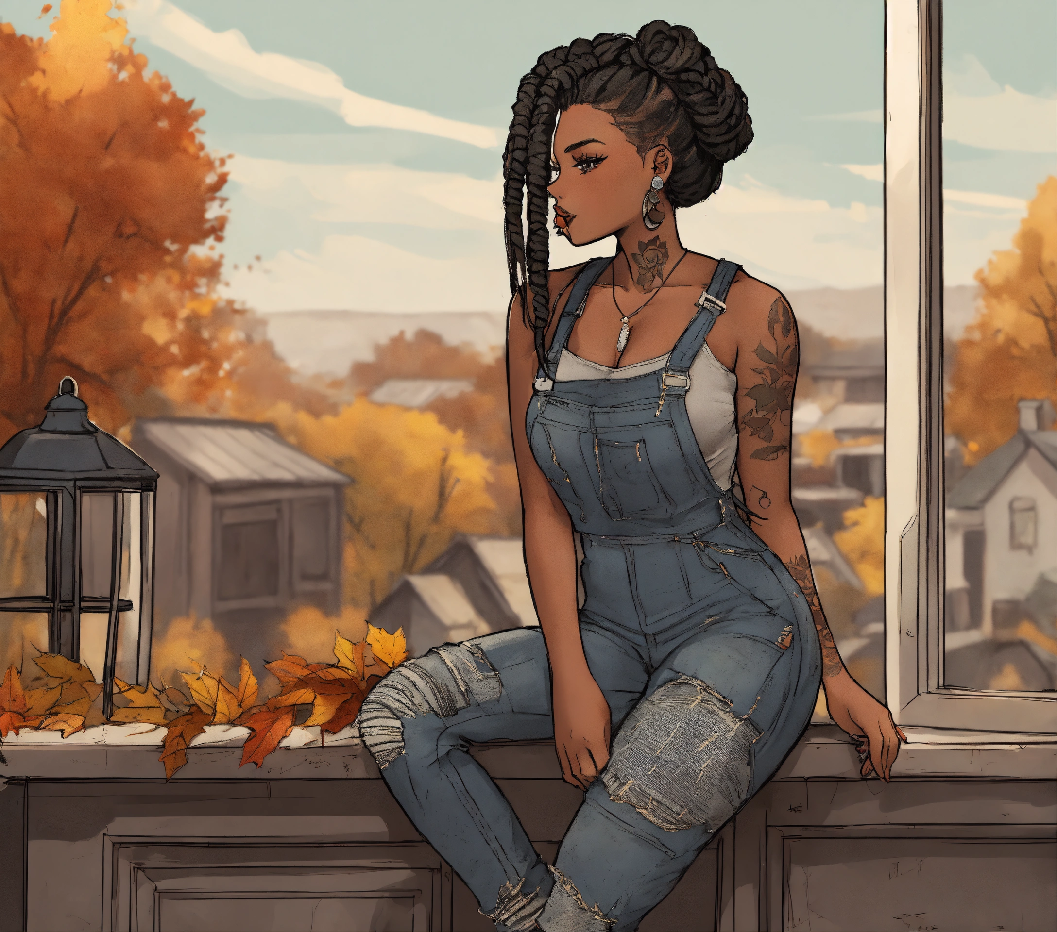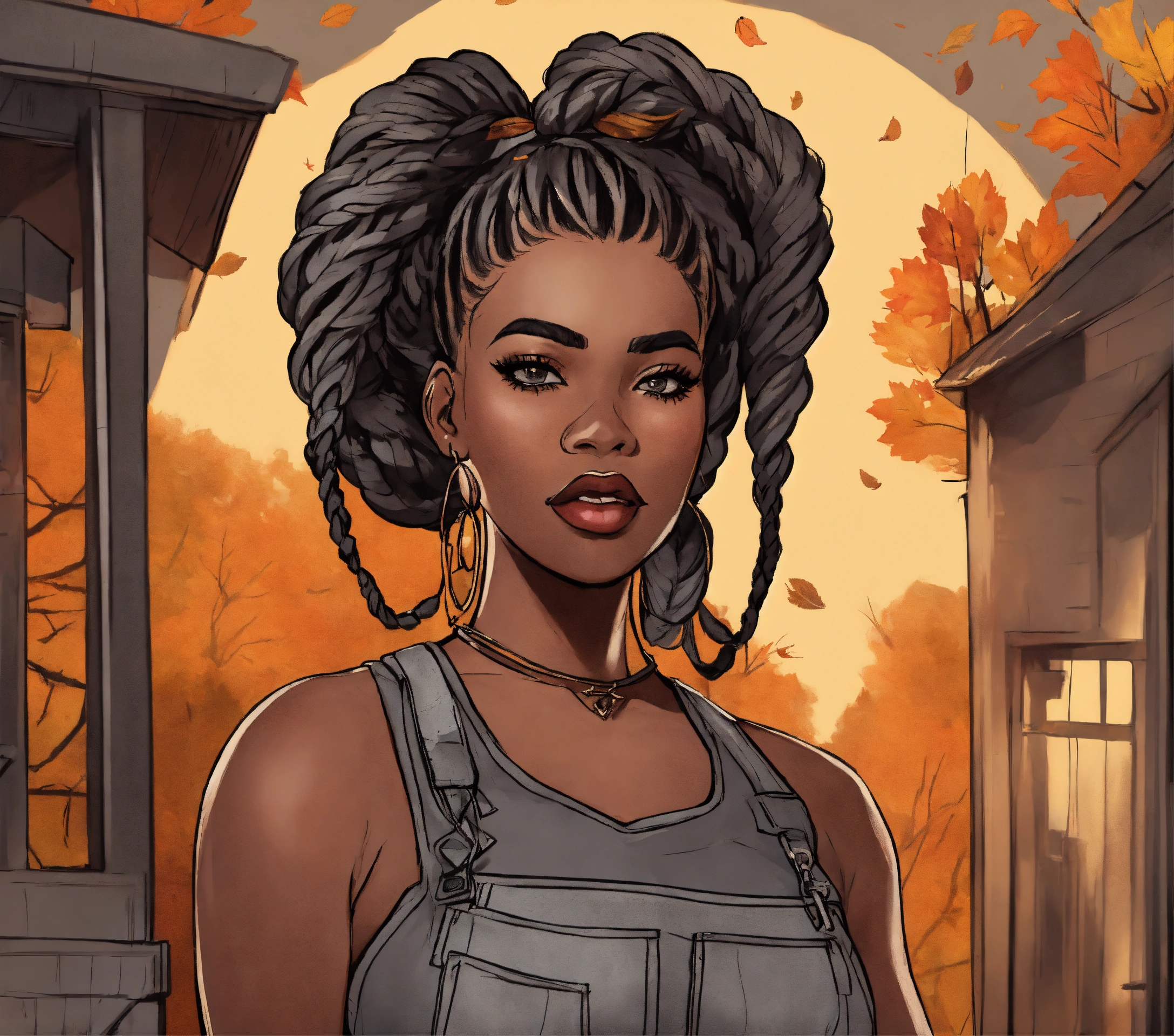 Cartoon, illustration, african american victorian-goth-rockabilly full figure woman frayed-distressed work jumpsuit over a grey ribbed tank top box- braid long hairstyle autumn theme