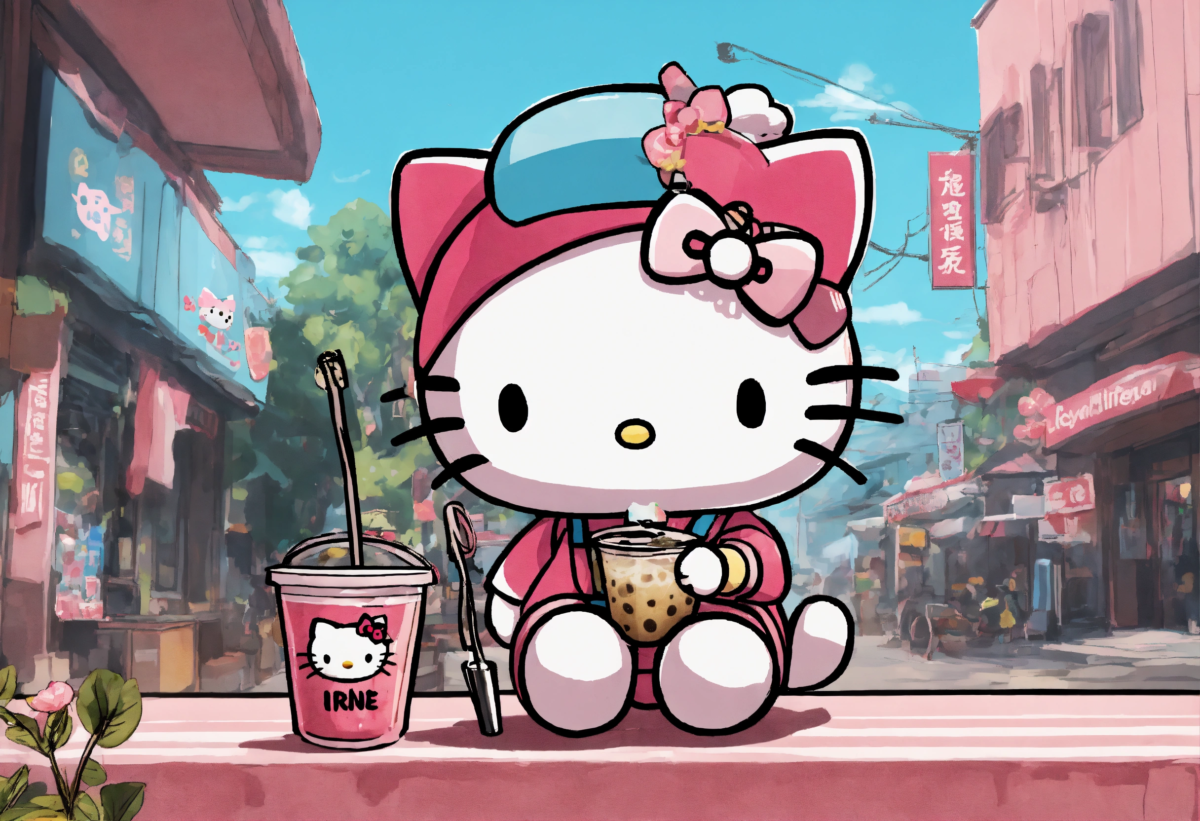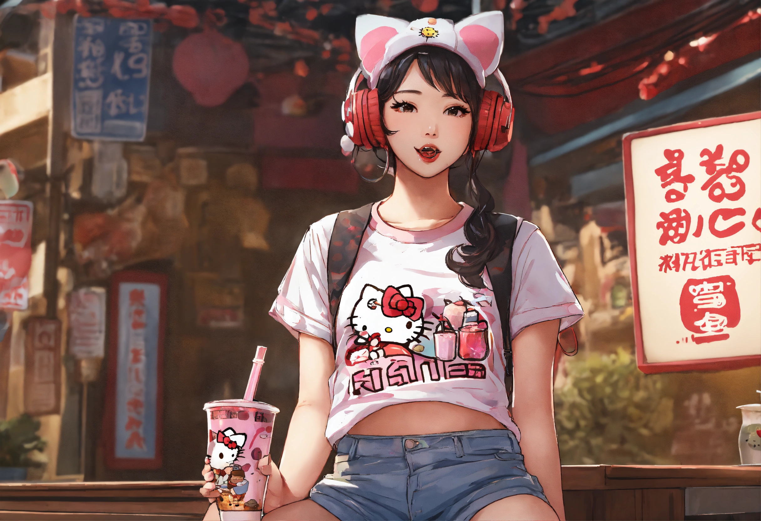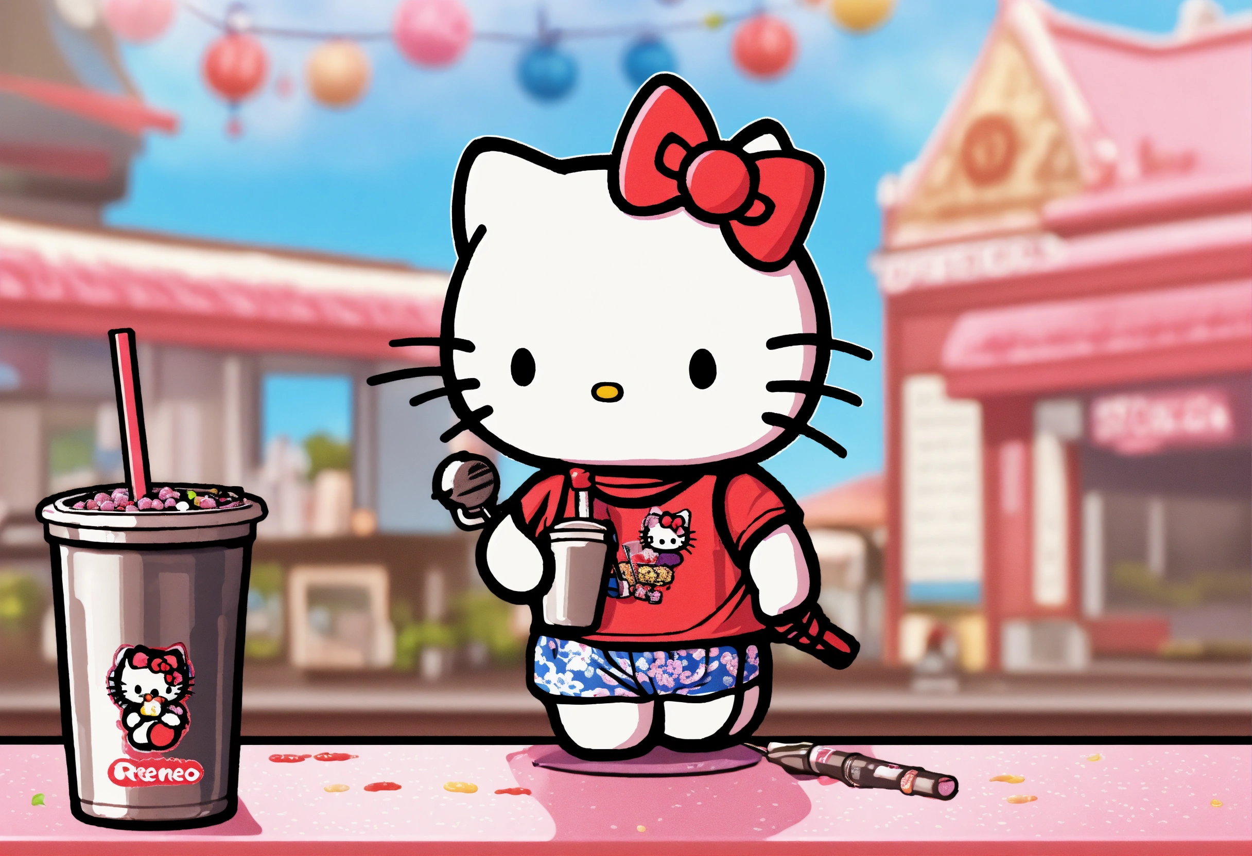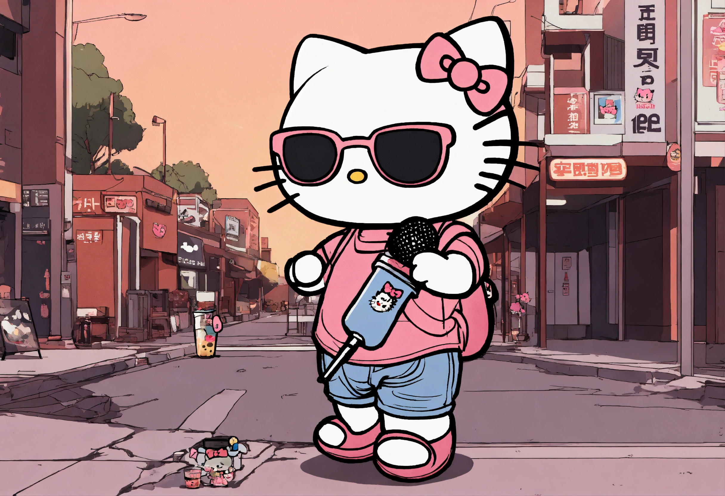 Hello kitty drinking boba tea and holding a microphone