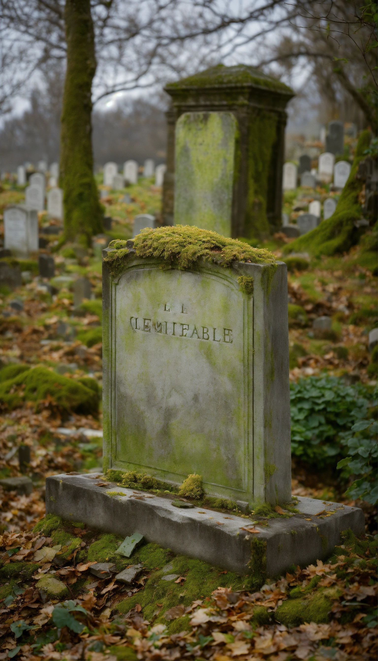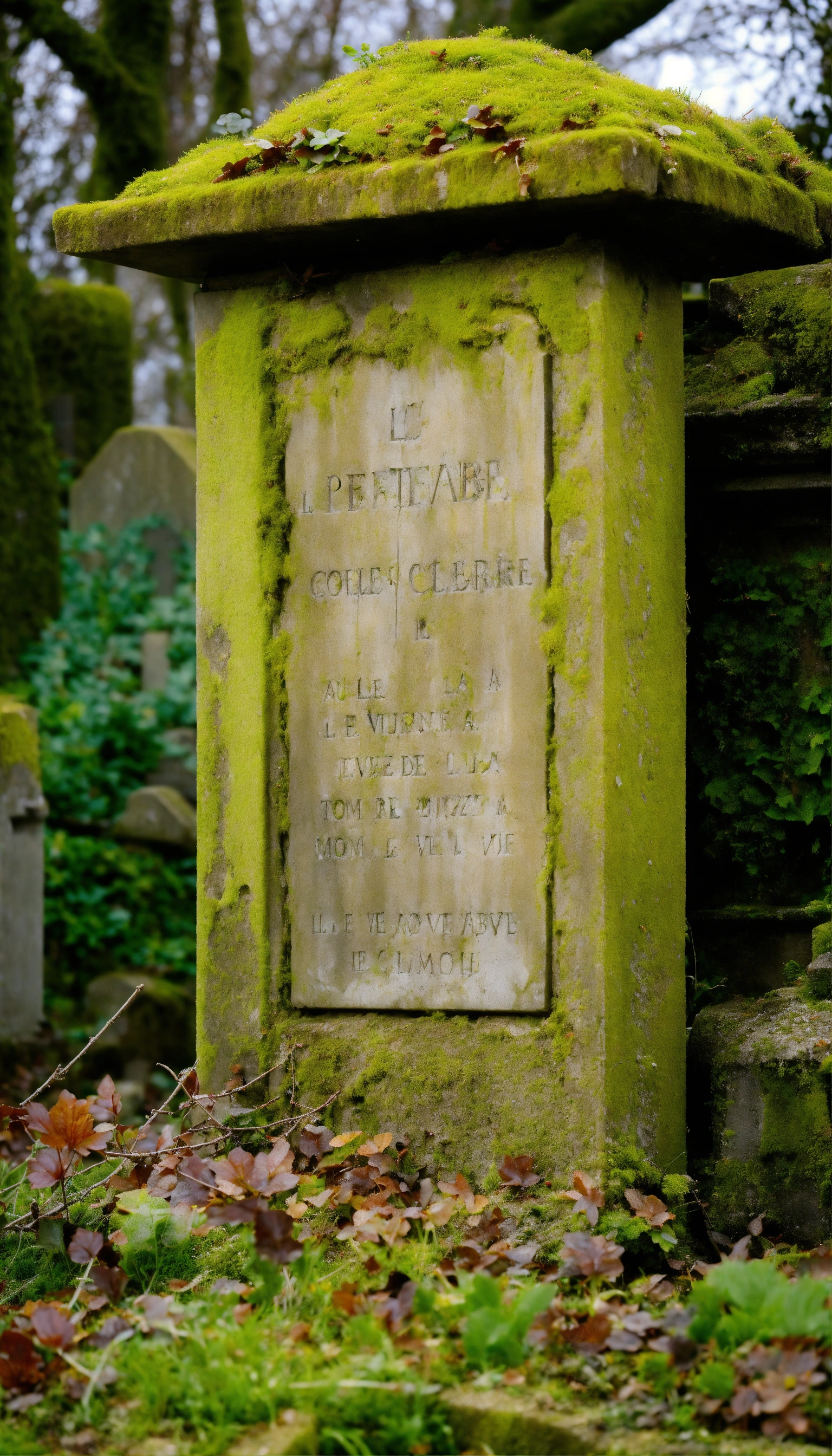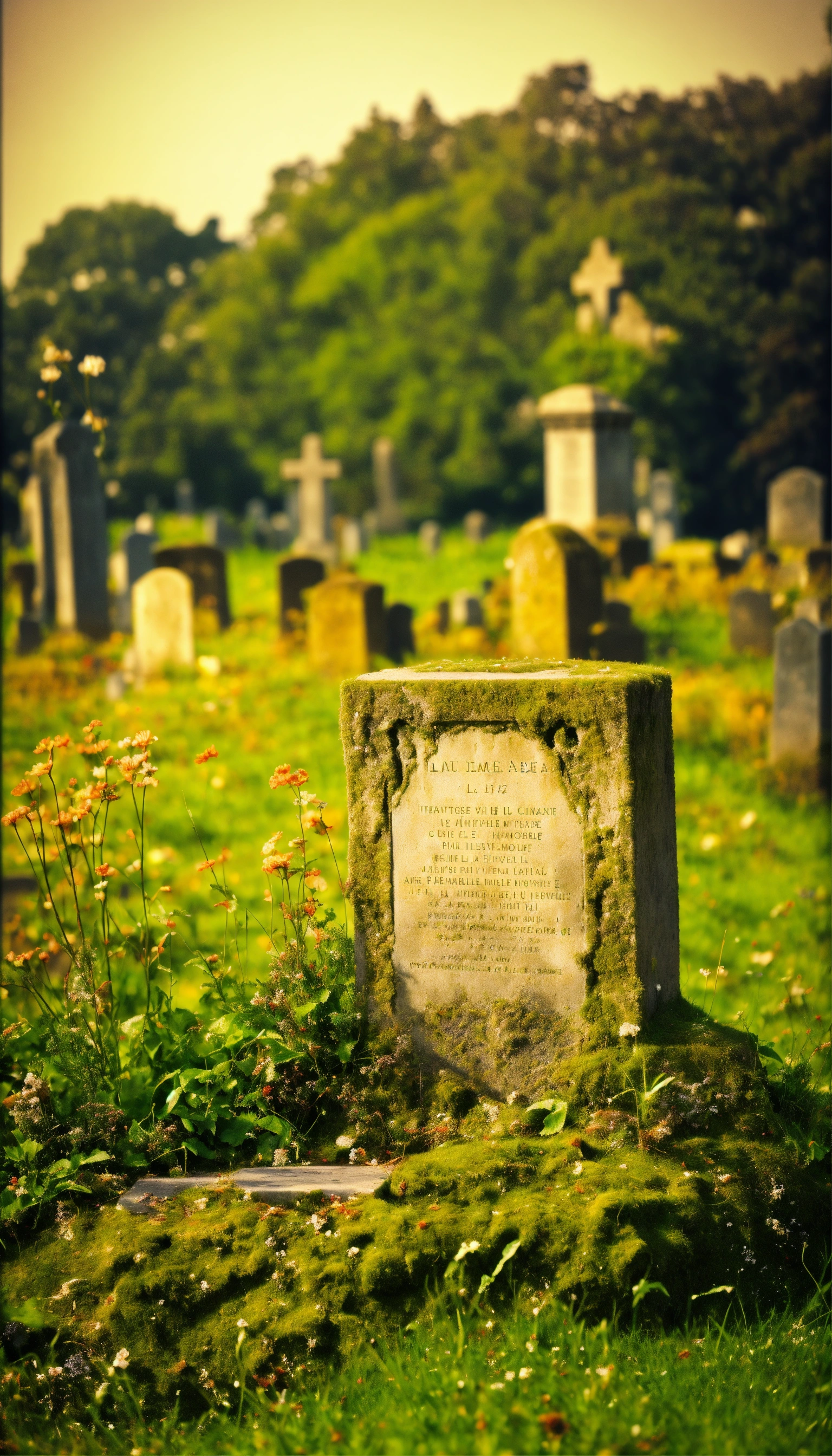 Créez une image d'une tombe solitaire dans un vieux cimetière abandonné. la pierre tombale, recouverte de mousse et de lichen, porte l'inscription presque effacée du nom du défunt et de la date de sa mort, qui remonte à plusieurs siècles. autour de la tombe, l'herbe est haute et sauvage, témoignant de l'absence de visiteurs depuis des générations.