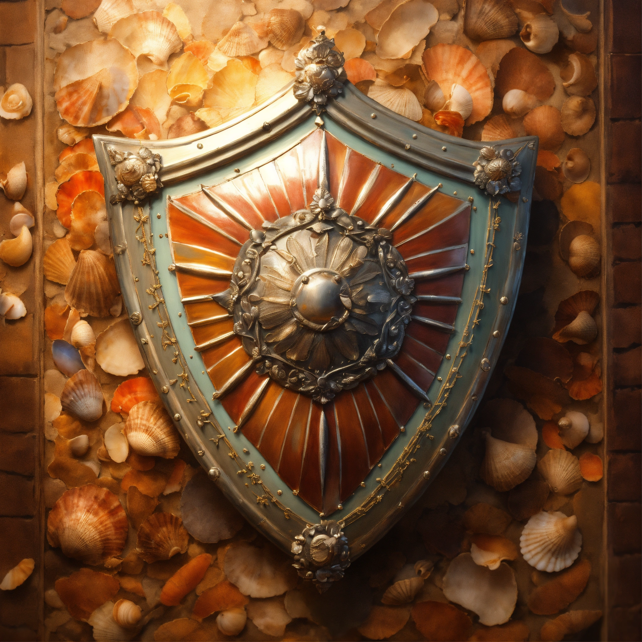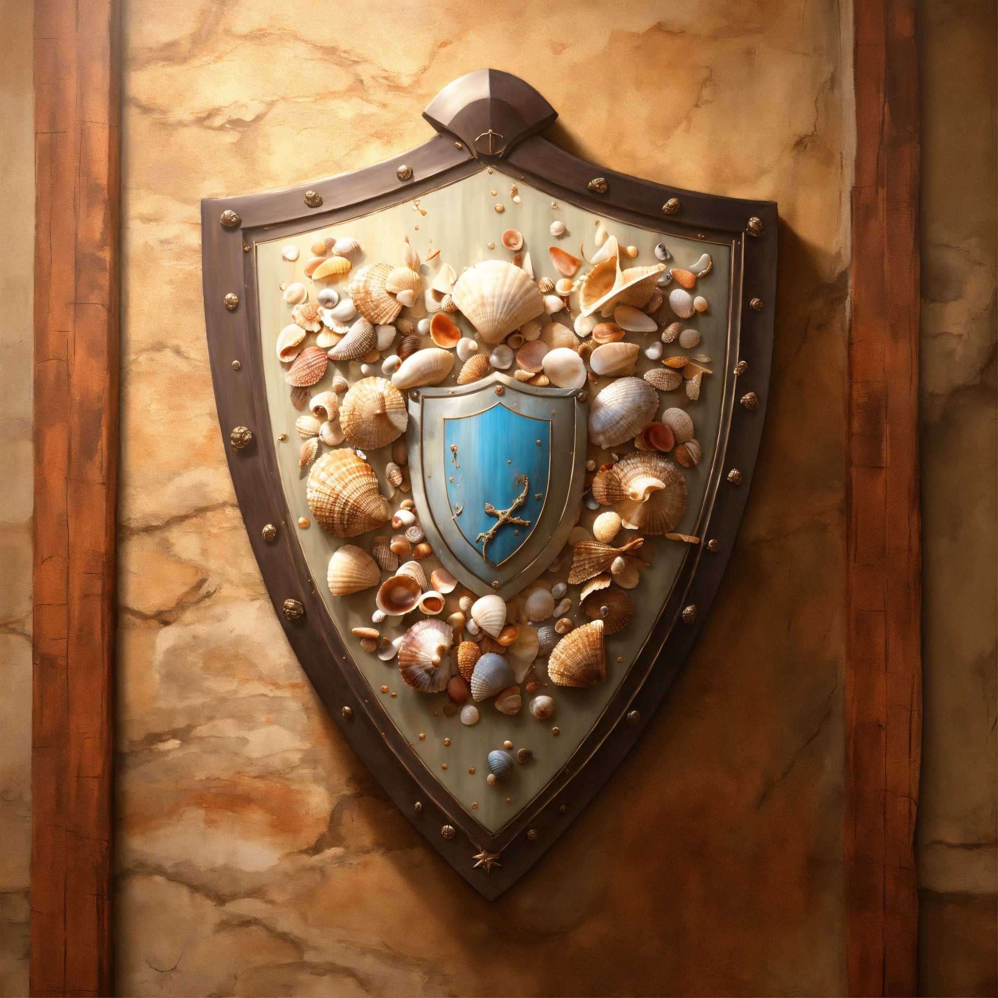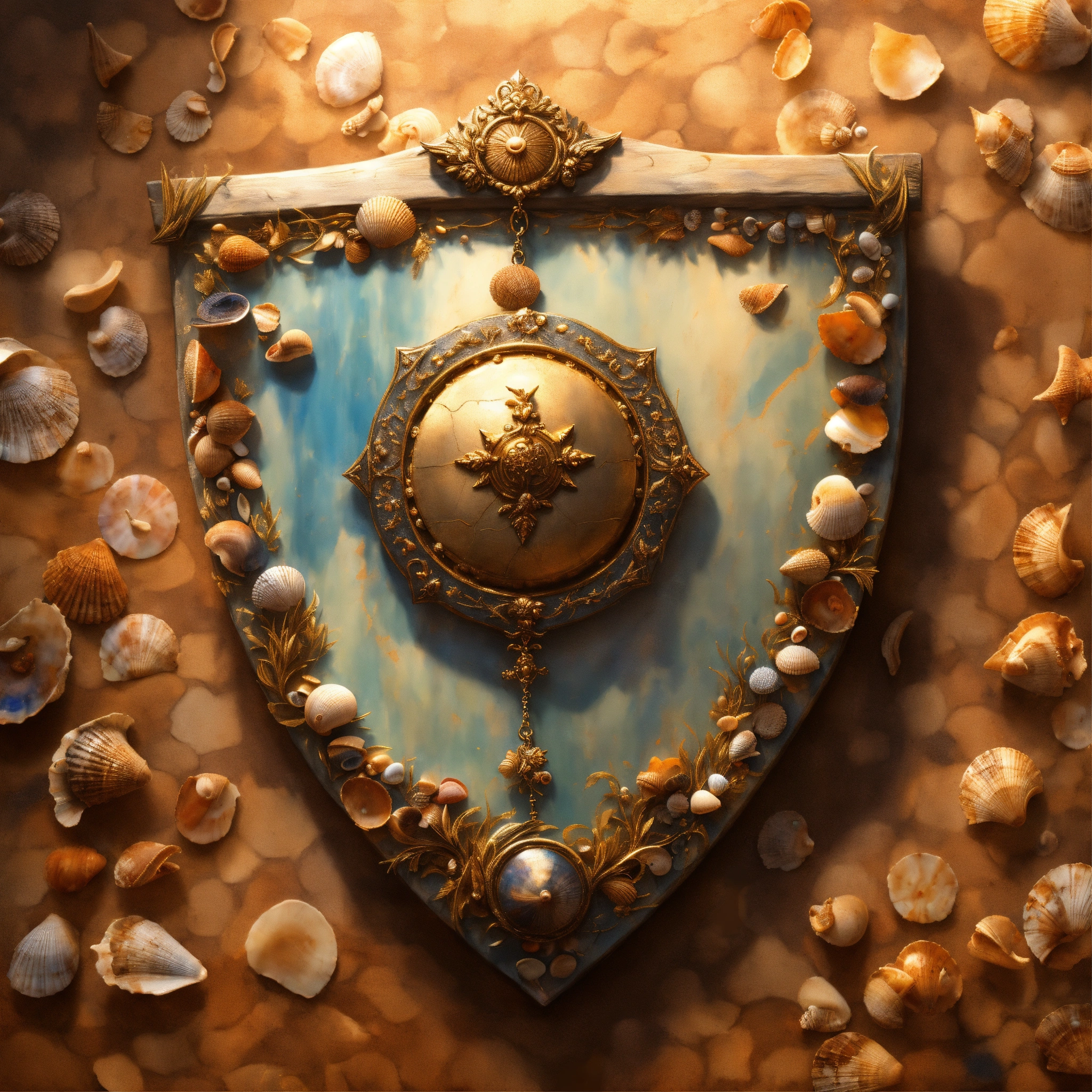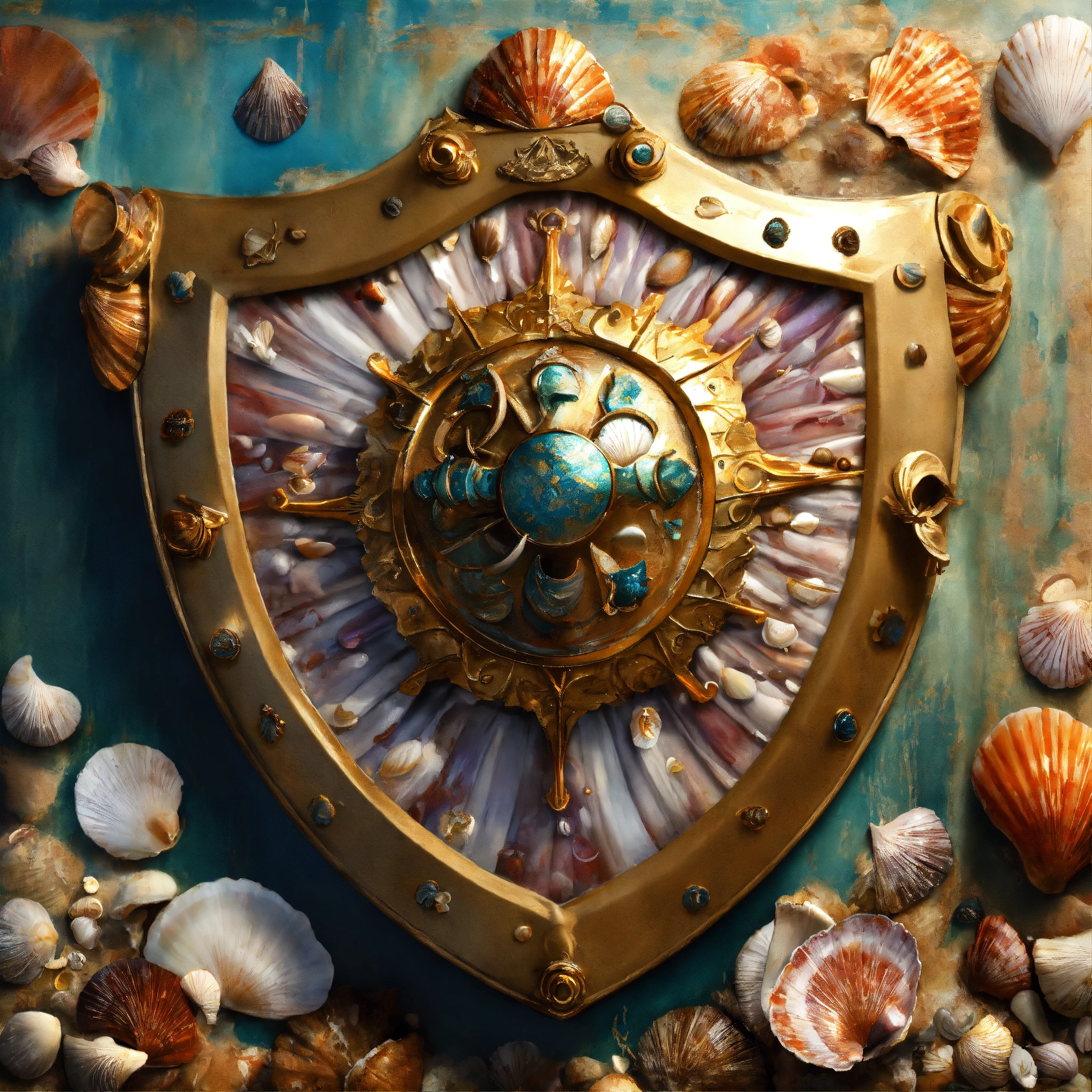 Concept art of a shield made out of seashells, hanged on a wall, painting style, highly detailed, brush strokes, 8k