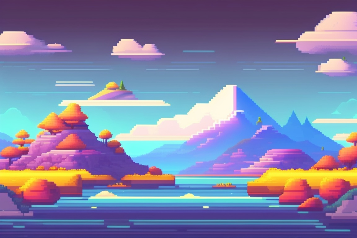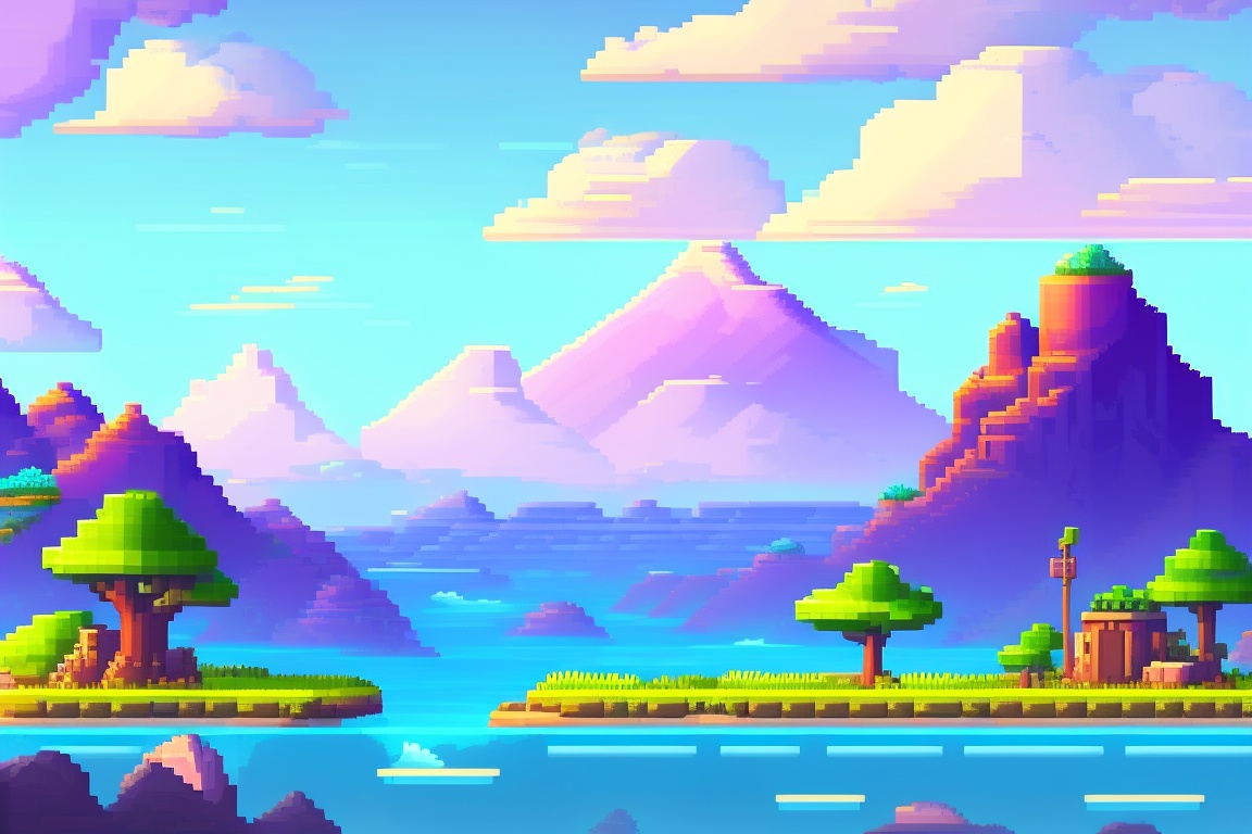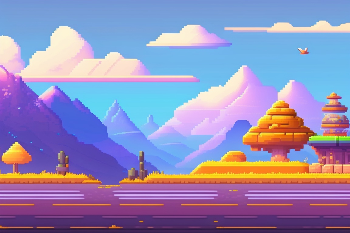 Game background, 2d platformer, flat land below, mountains and clouds in the distance, anime style, pixelart