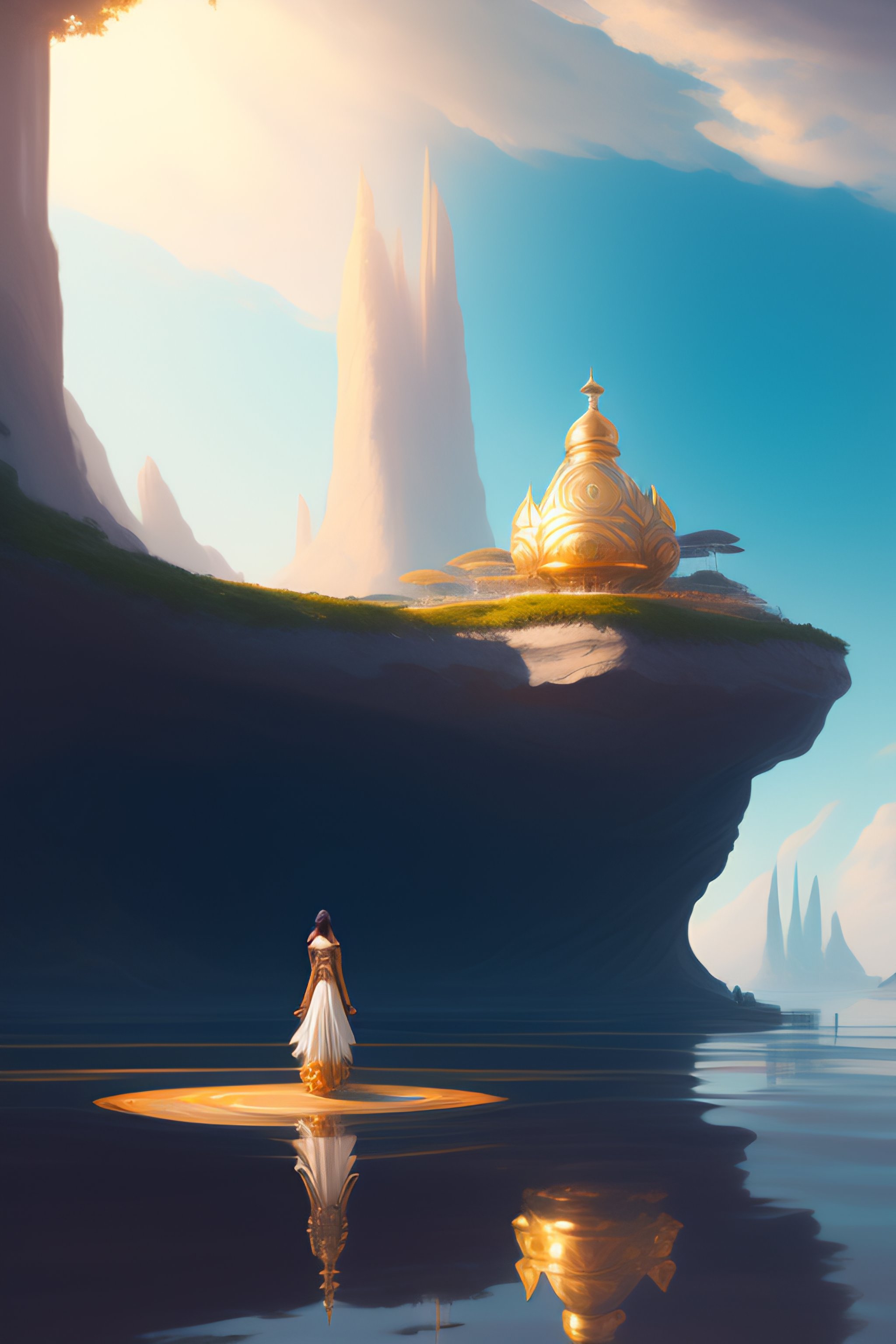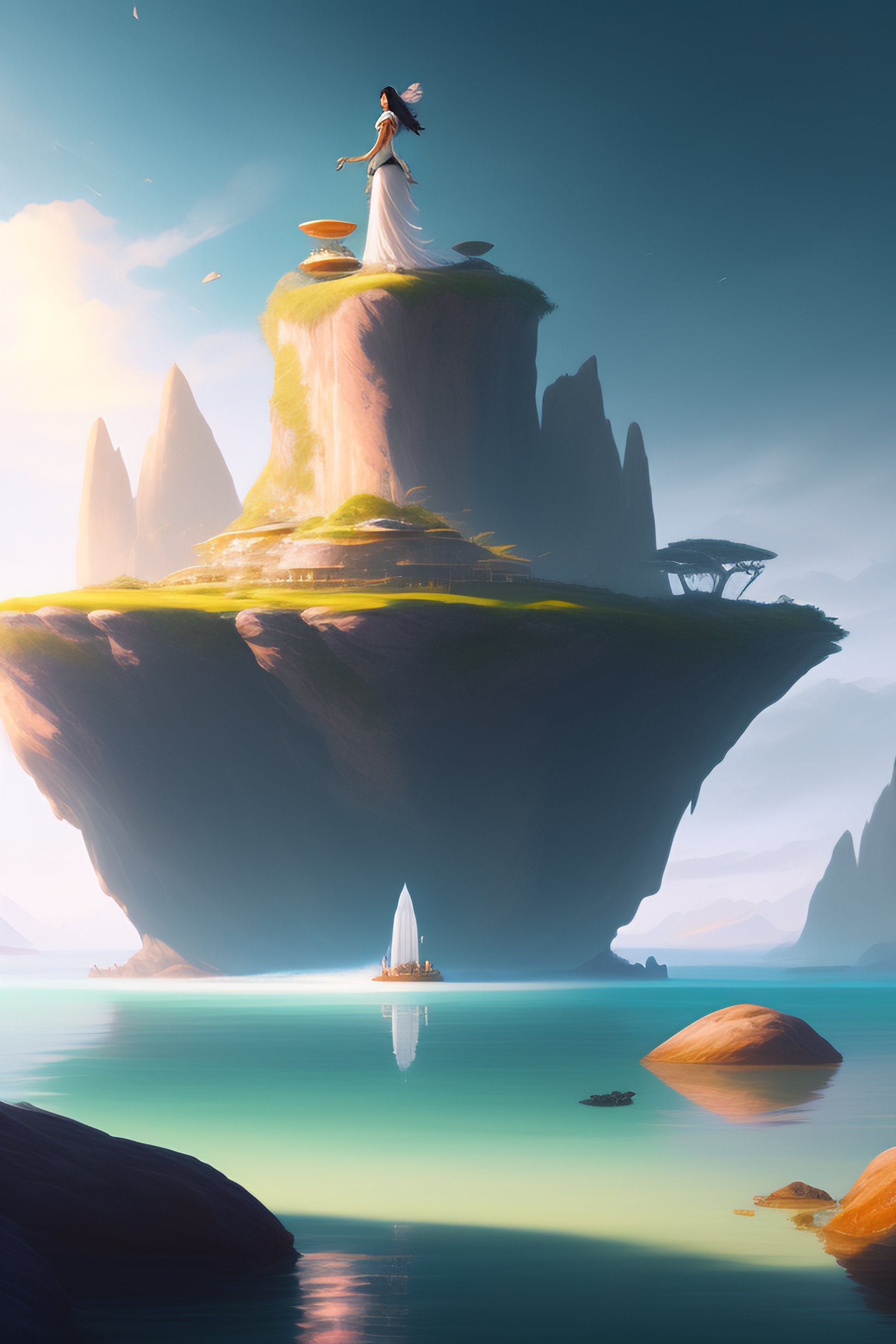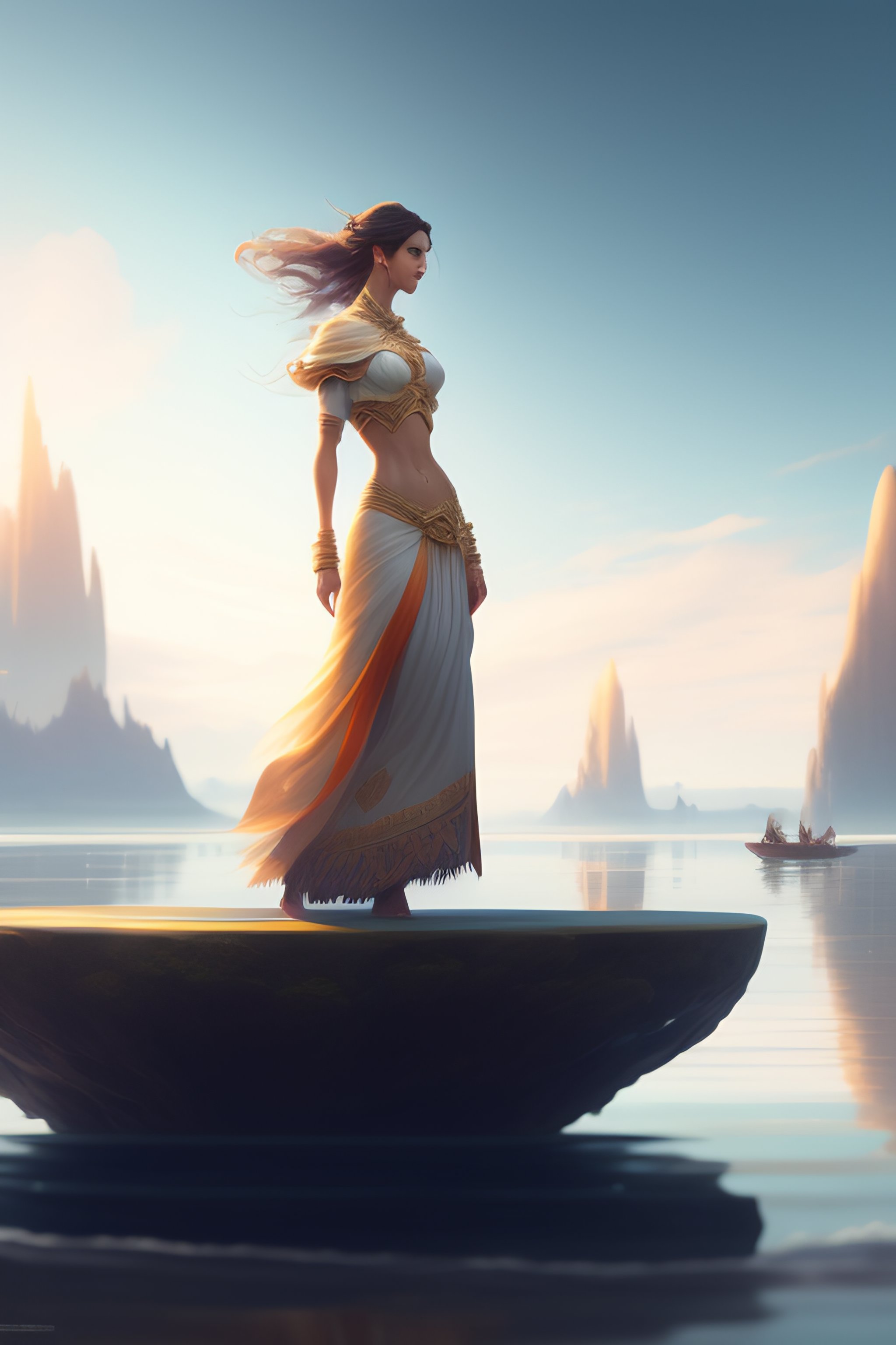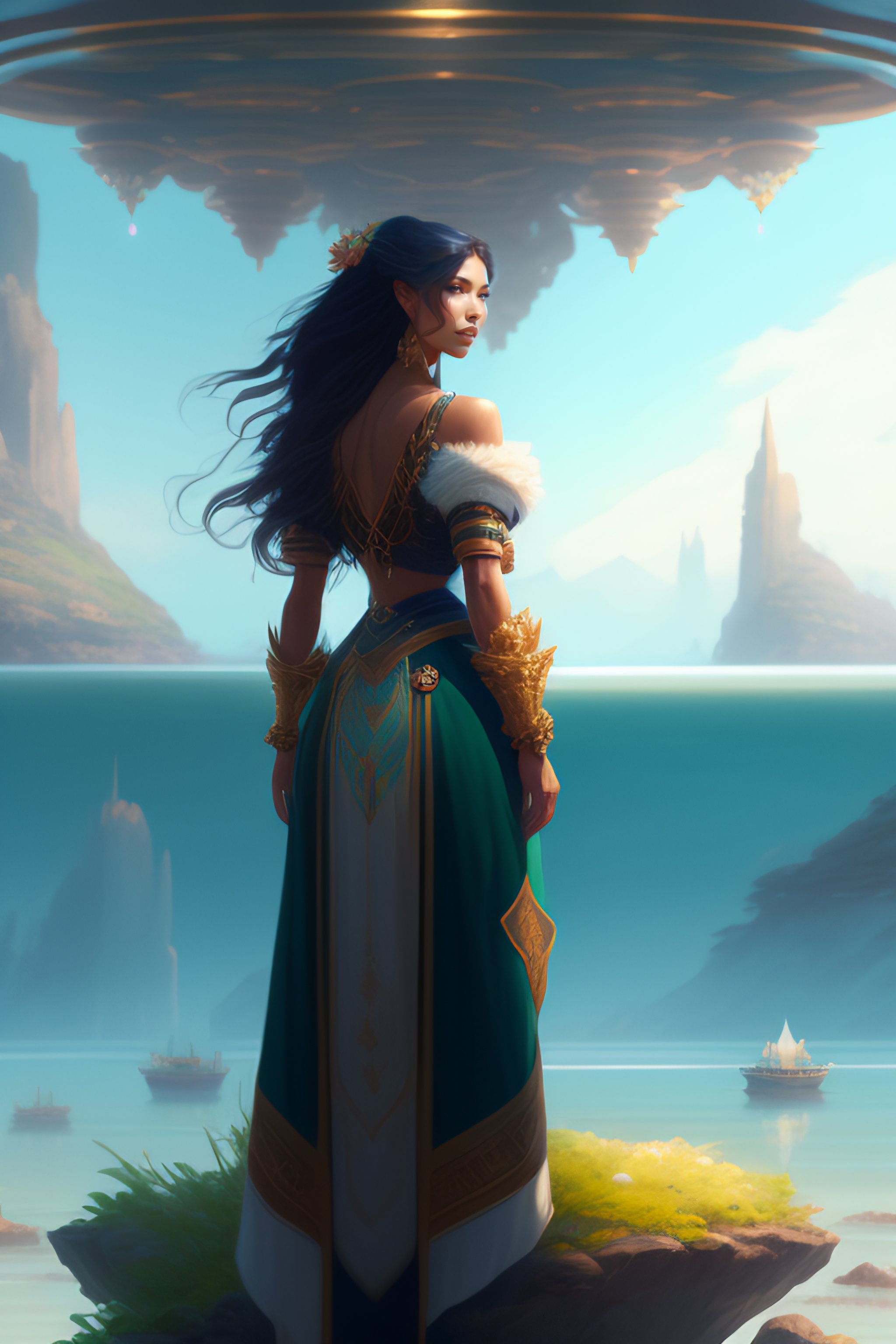 Full body corina kopf standing on a floating island with many other floating islands in the distance by stanley artgerm lau, greg rutkowski, alphonse mucha, concept art, character design, trending on artstation, rey tracing, epic fantasy, 8 k, 4 k, beautiful lighting, painting, rule of thirds