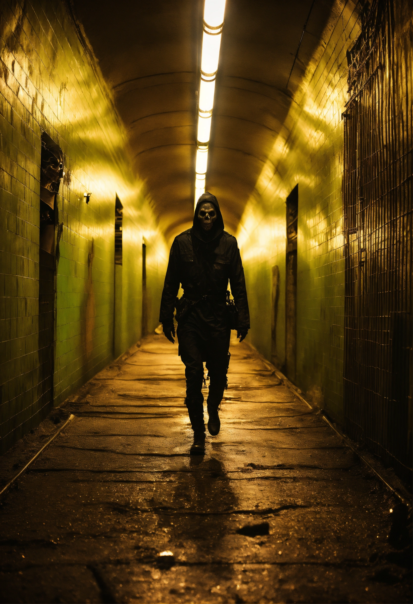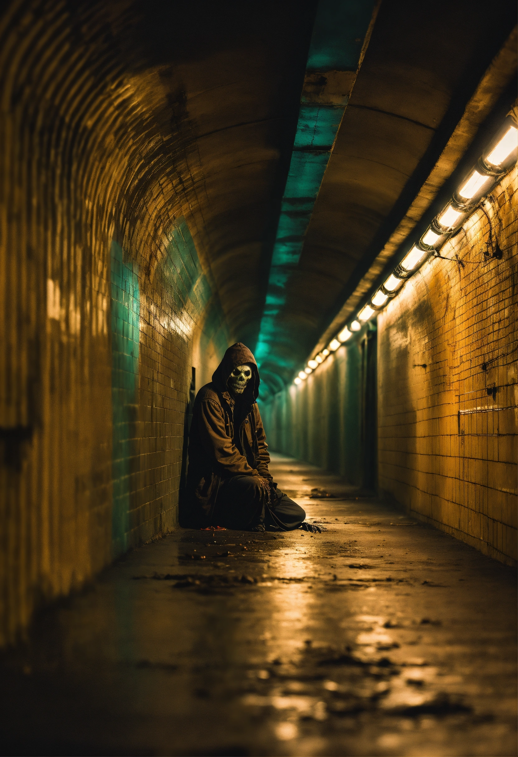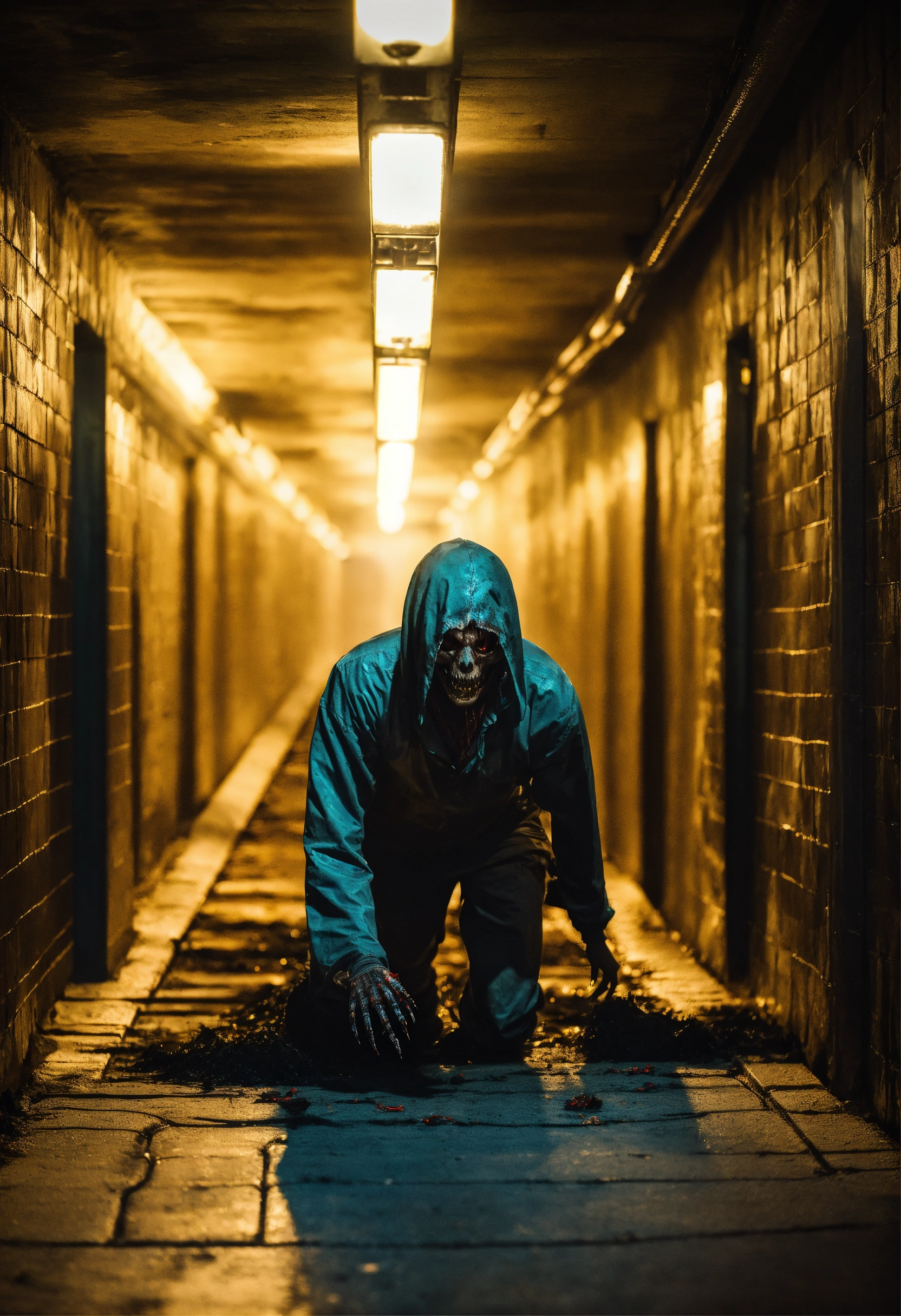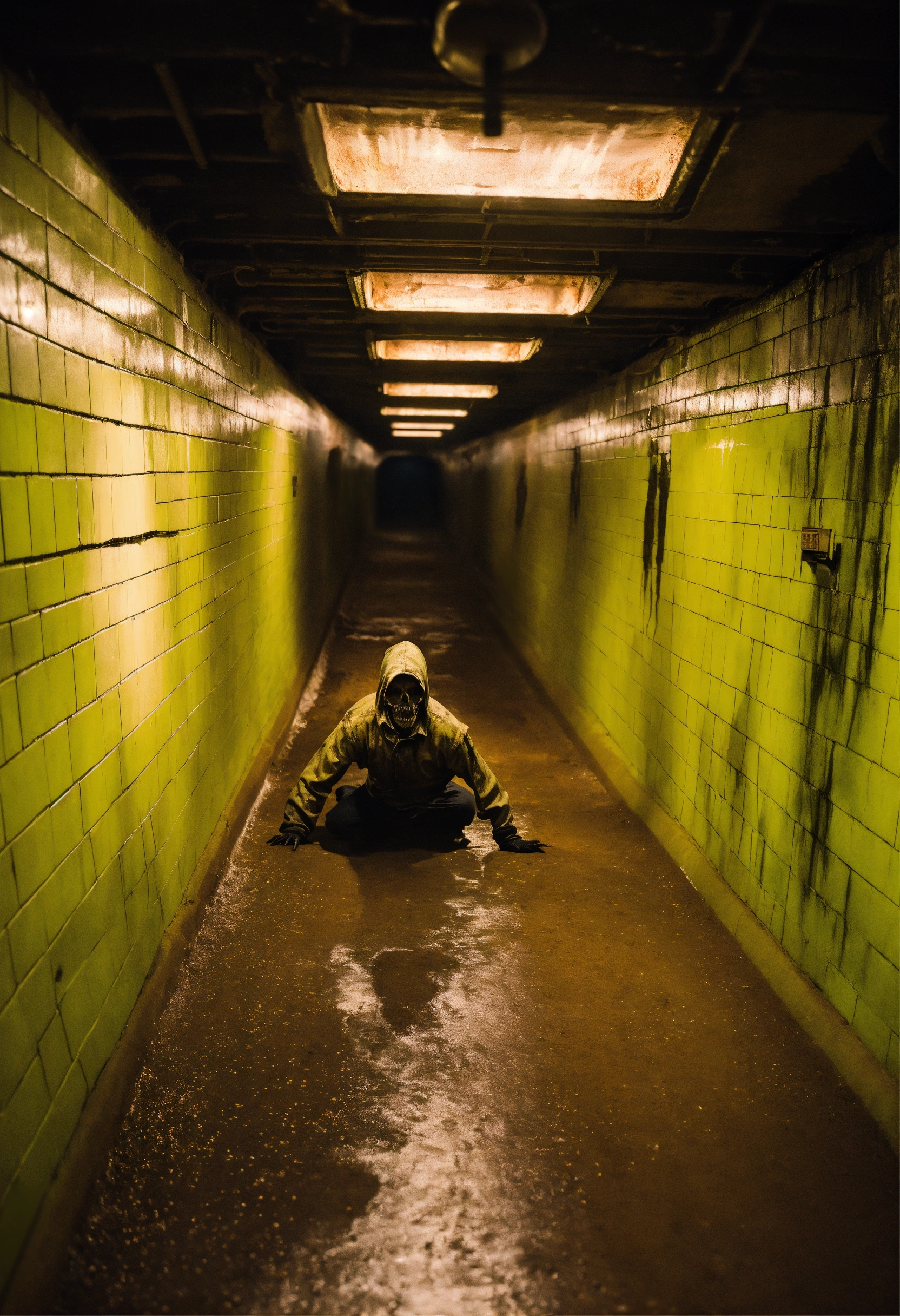 A ghoul crawling through a large subway tunnel highly realistic