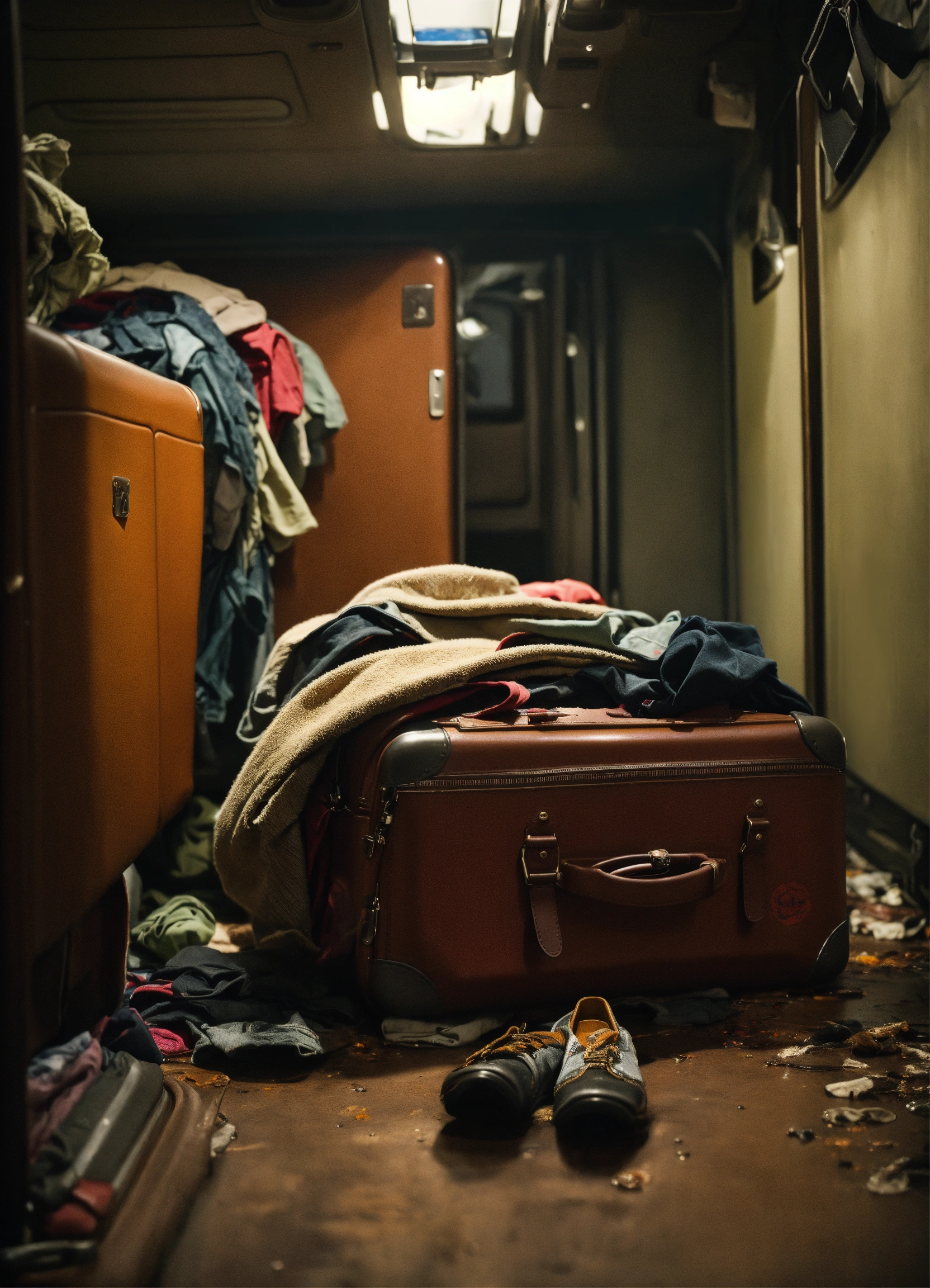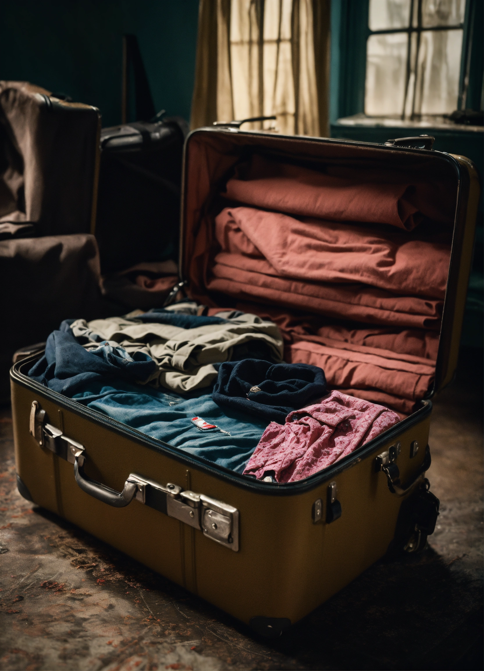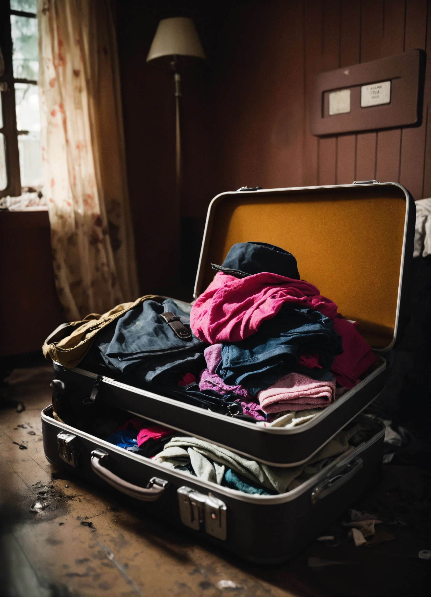 An open carry-on suitcase with messy girl's clothes (dark environment