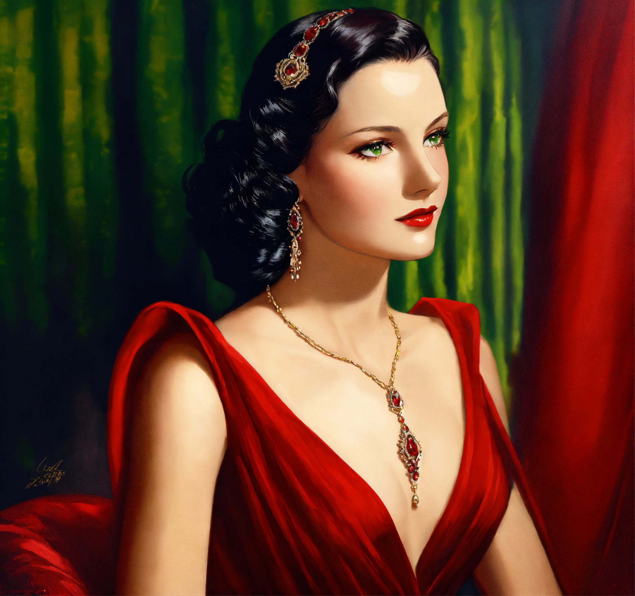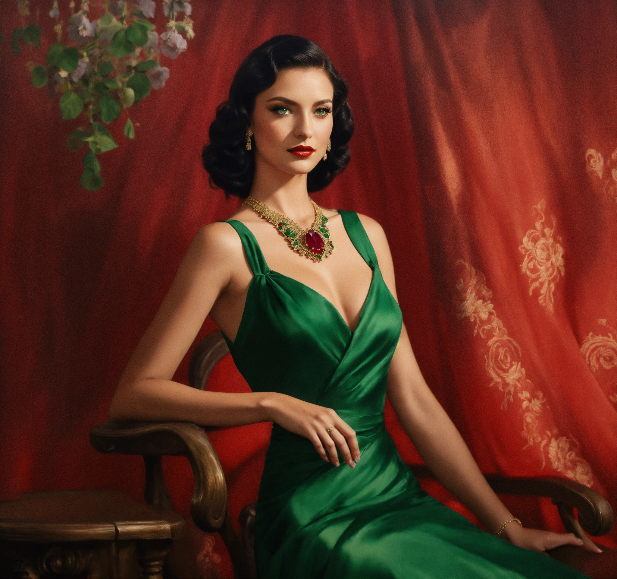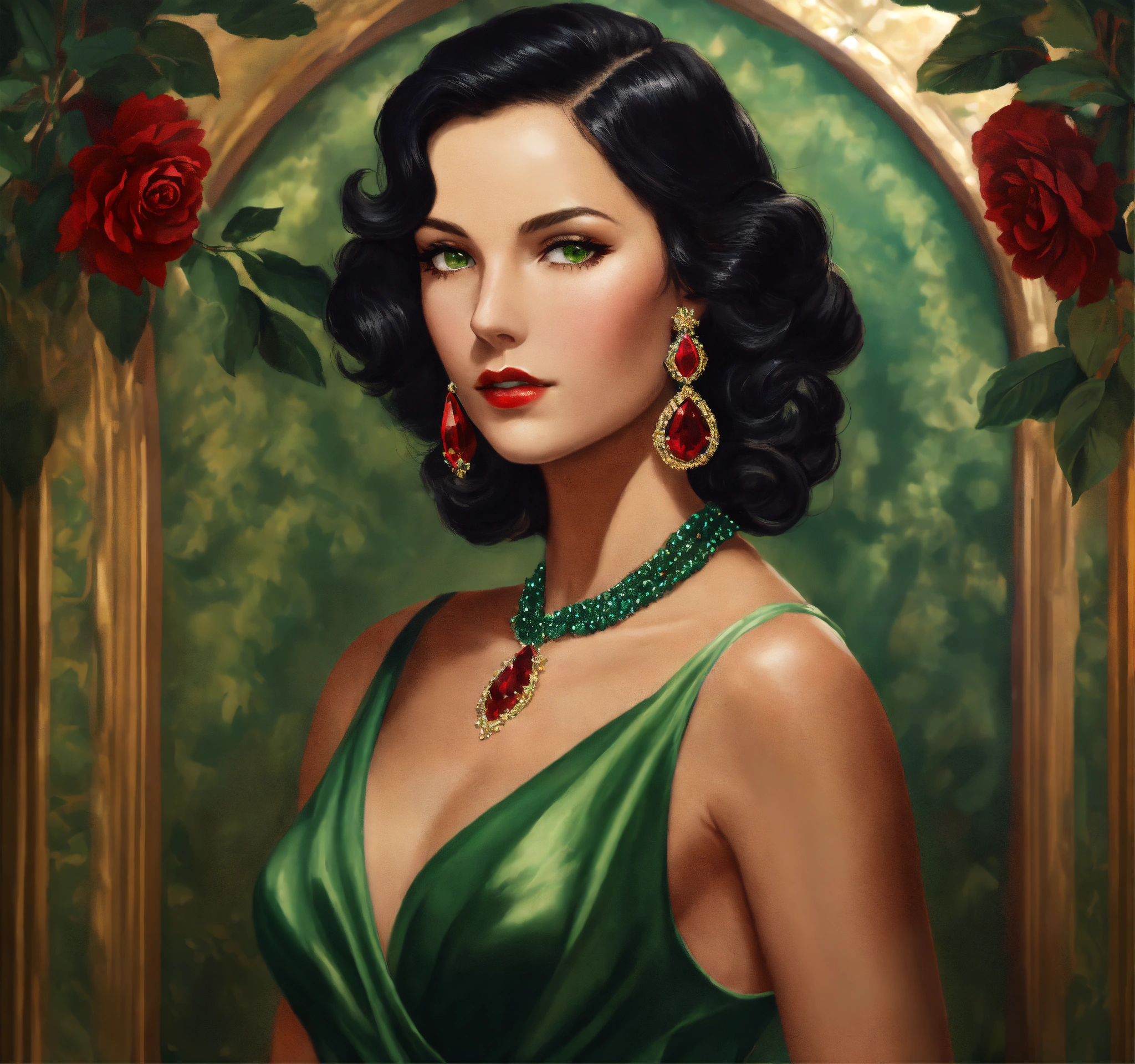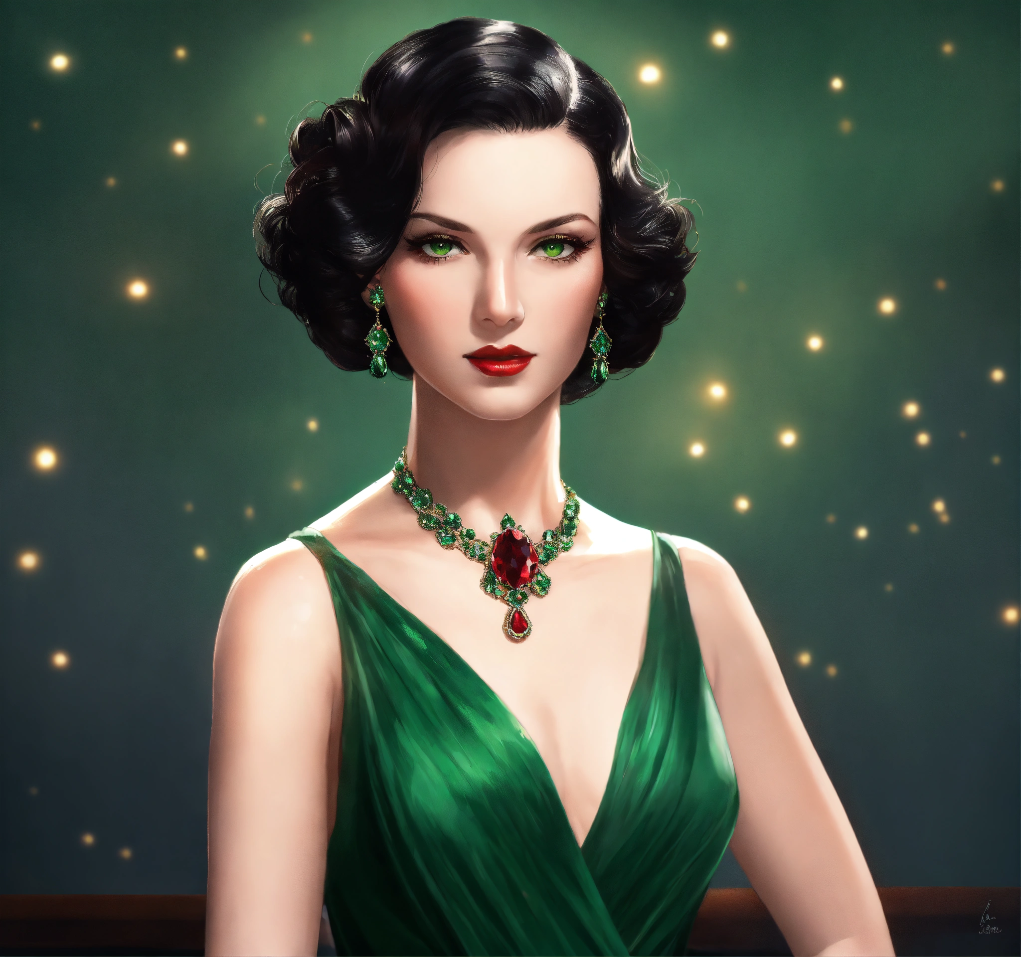 1938 dress woman black shoulder length hair green eyes red evening gown with ruby décolleté jewelry realistic