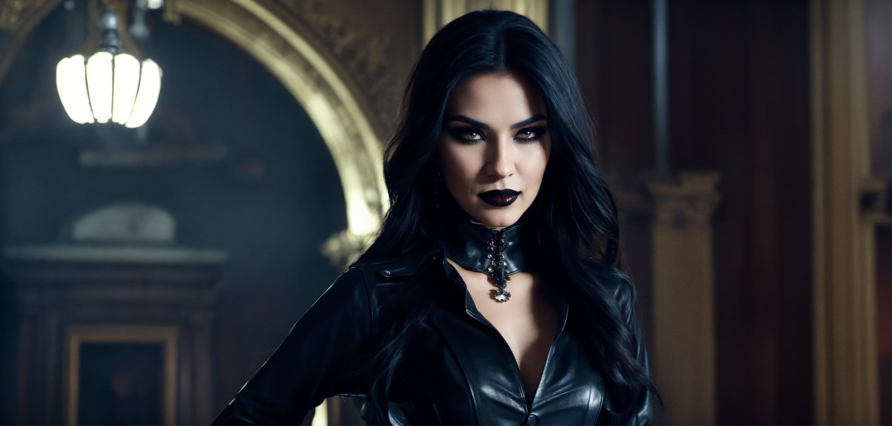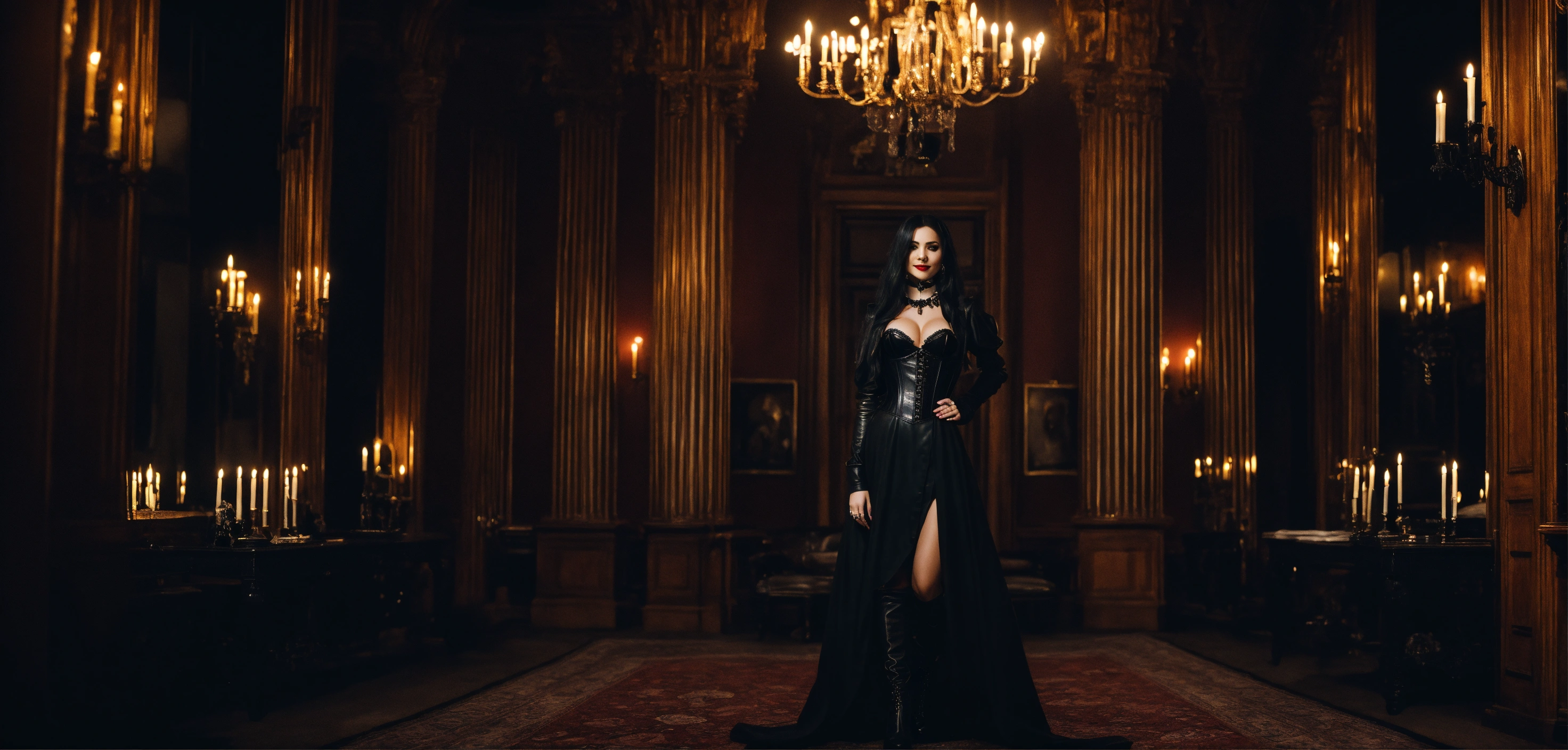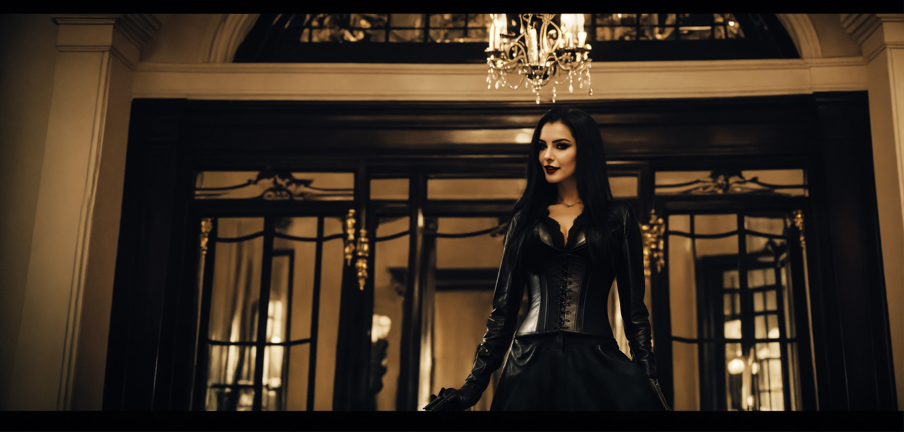 Cinematic look, two stunning arab seductress women fashion model, arrogant evil smile from above showing vampire teeth, black long straight hair, black leather corset, long strict victorian governess wide black long leather shirt dress with long big puff sleeves and big buttons, mansion hall at night haze, white office shirt collar, leather gloves, eyeliner makeup, black leather boots, human skull in one hand, underworld vampire movie style