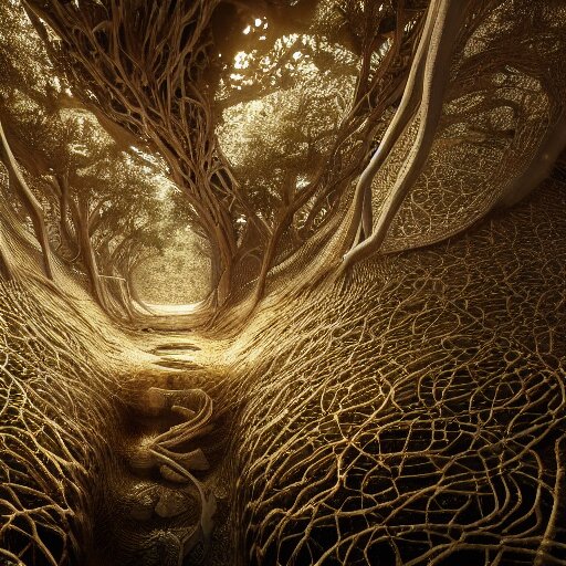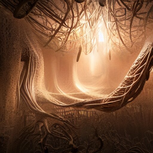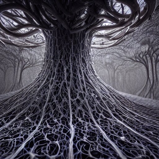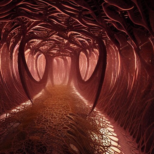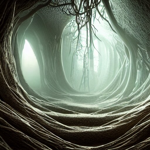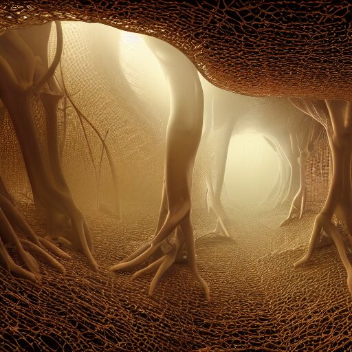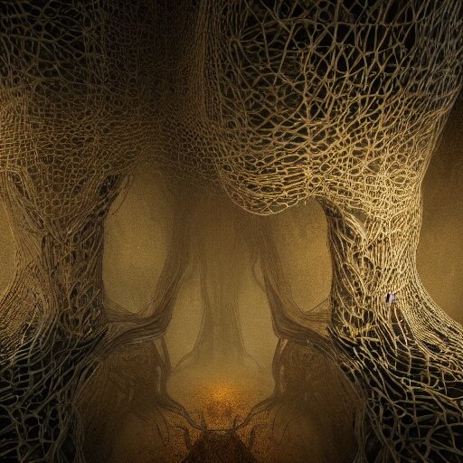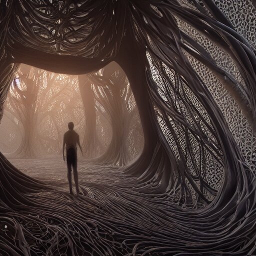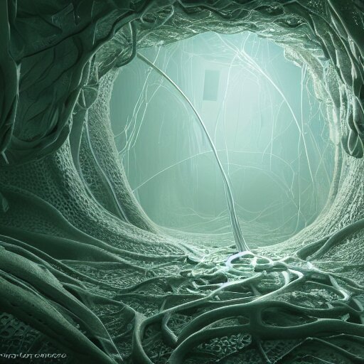 Biocomputer human organ inside a neural network made like antique lace in a biomechanical cave forest, environment, matte painting, diffused lighting, highly detailed cinematic, atmosphere, diffused lighting, highly detailed digital art, trending on artstation, depth of field, wide angle