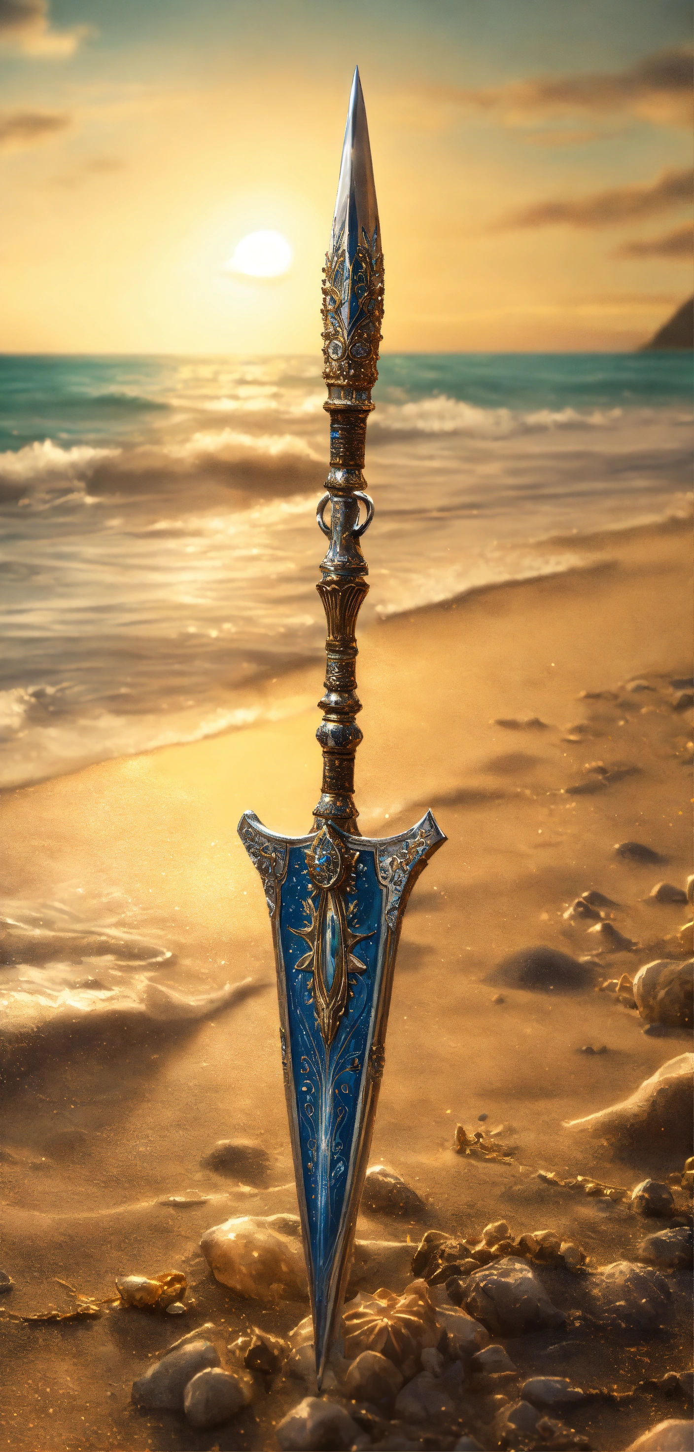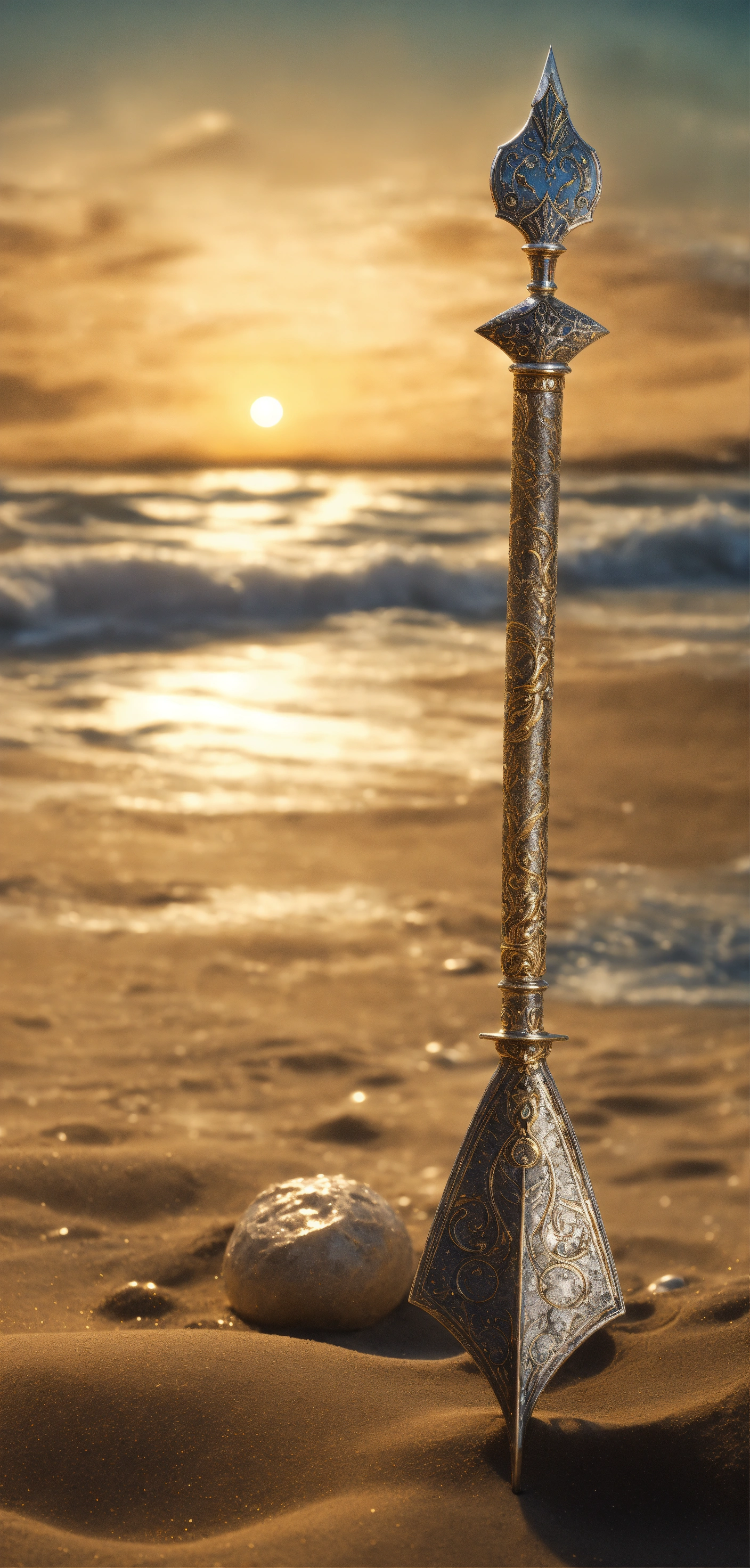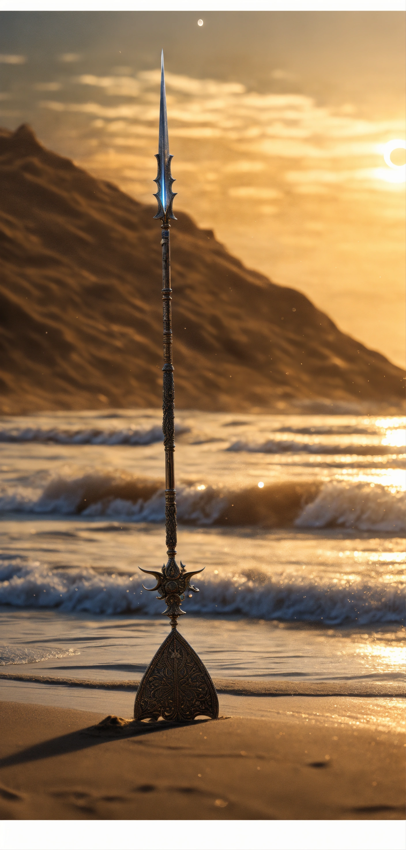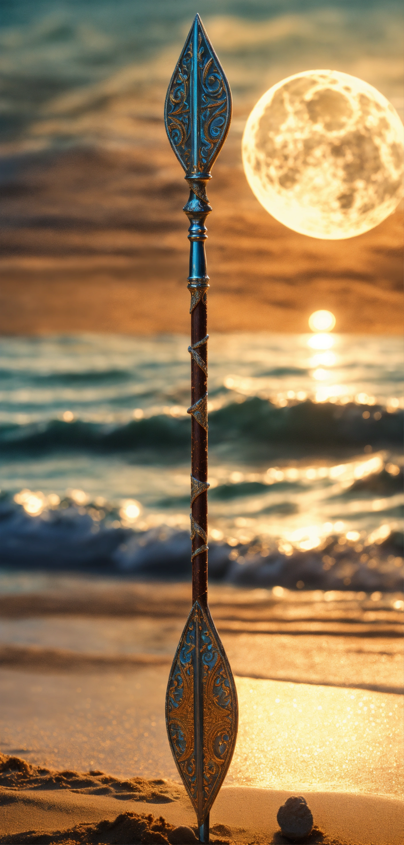 8k, picture of a narrow and delicate gezackte throwing spear of the sea people with barbs made of lunar-silver, highly ornamented, very detailed, ultra realistic, stuck with the bottom end deep in the sand on the beach in a lonely bay, moonlight, fantasy, medieval