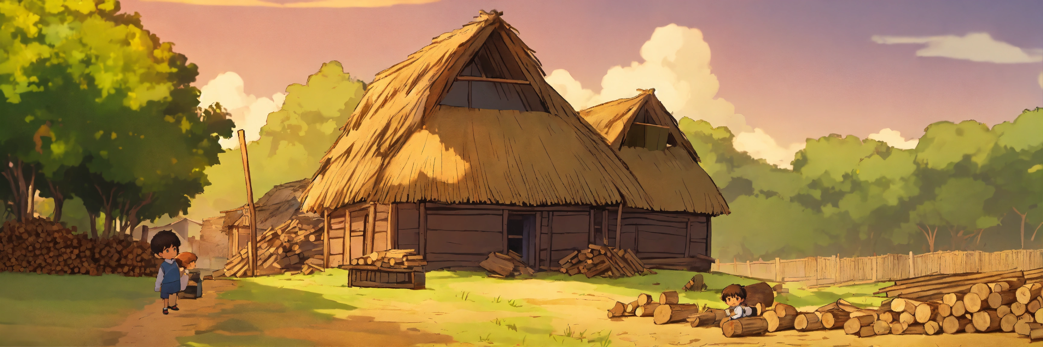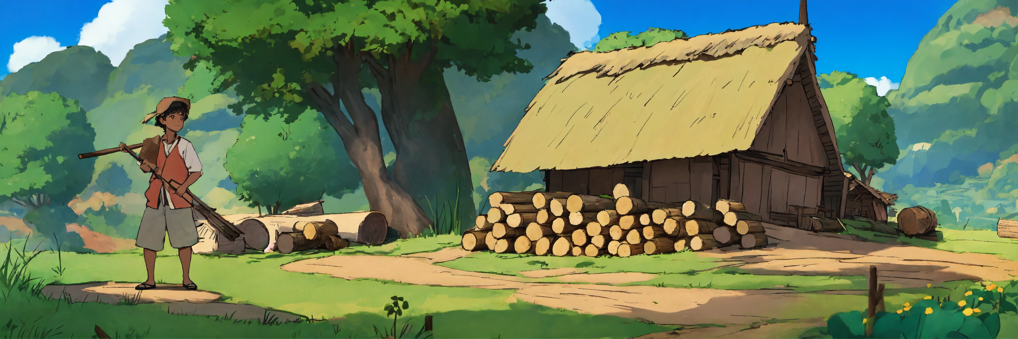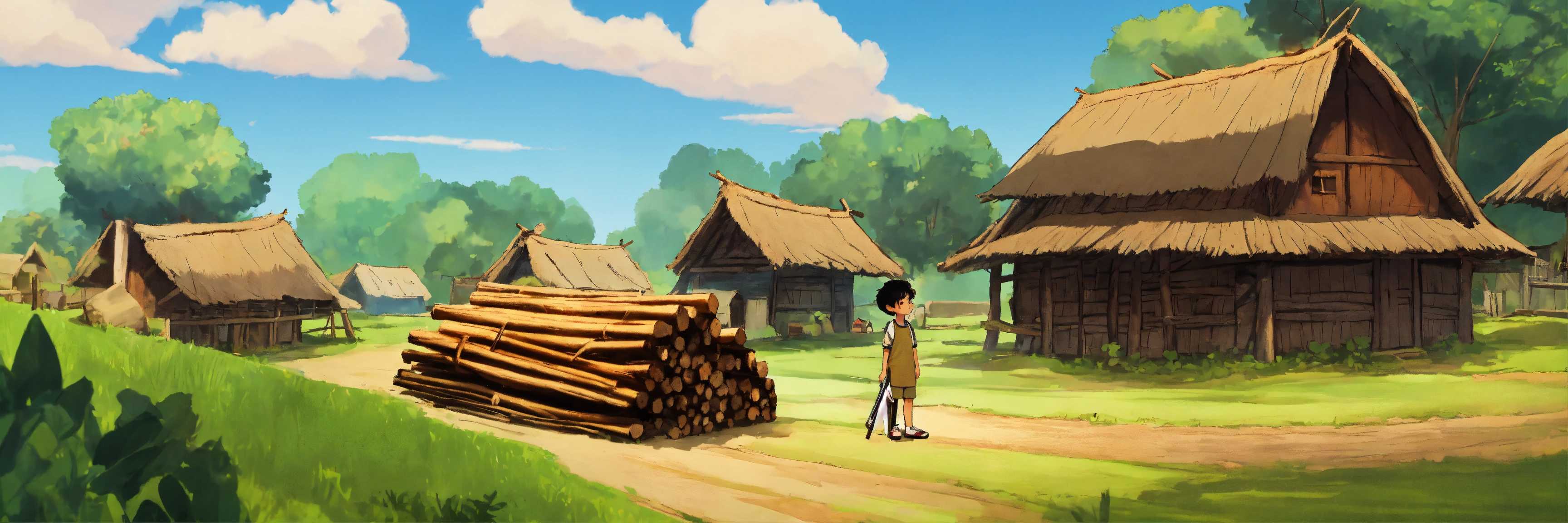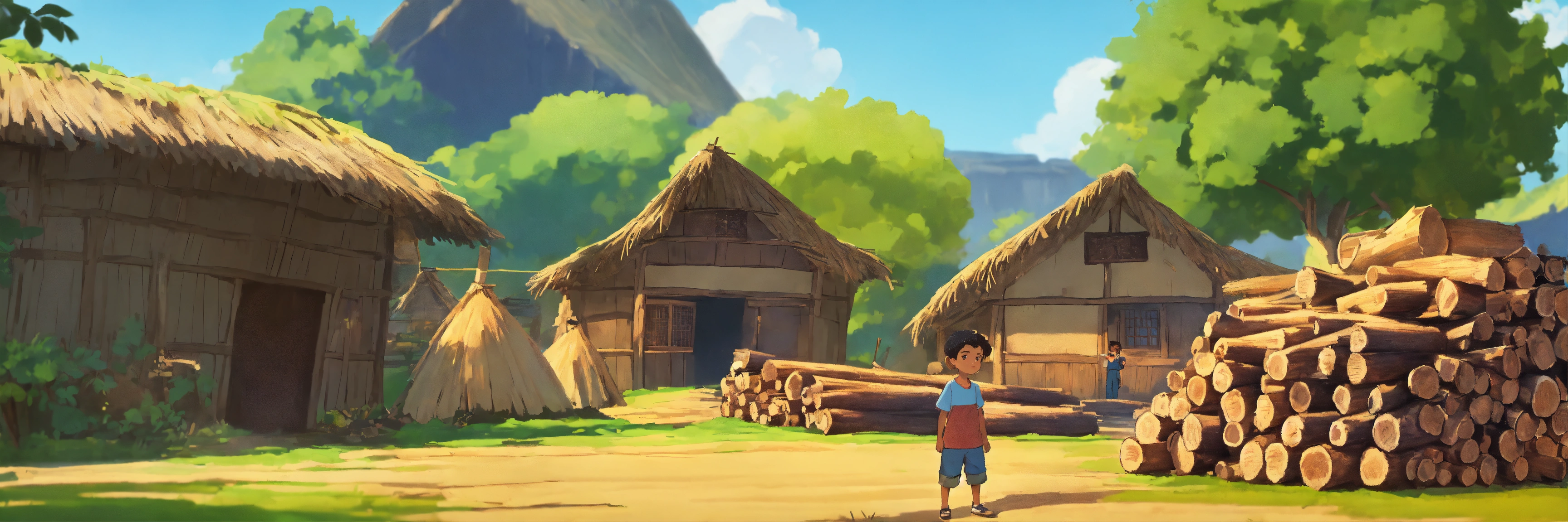 An image of a small, humble village with thatched-roof houses, and a young boy named ramu standing beside a pile of logs. in cartoon animated