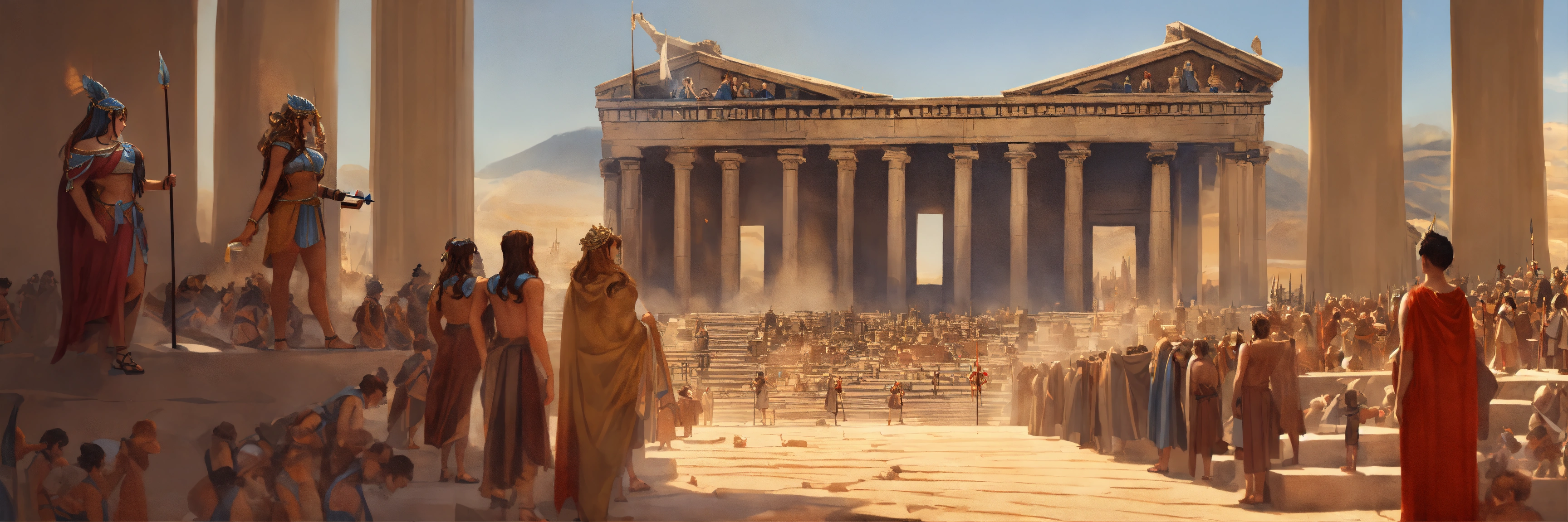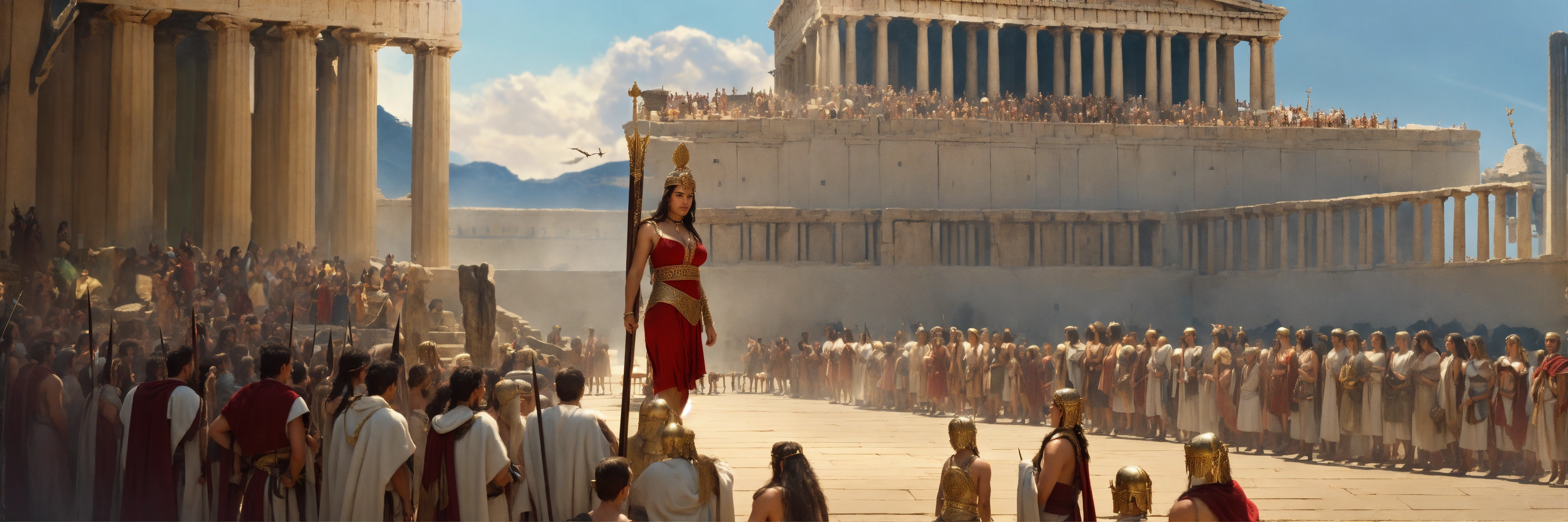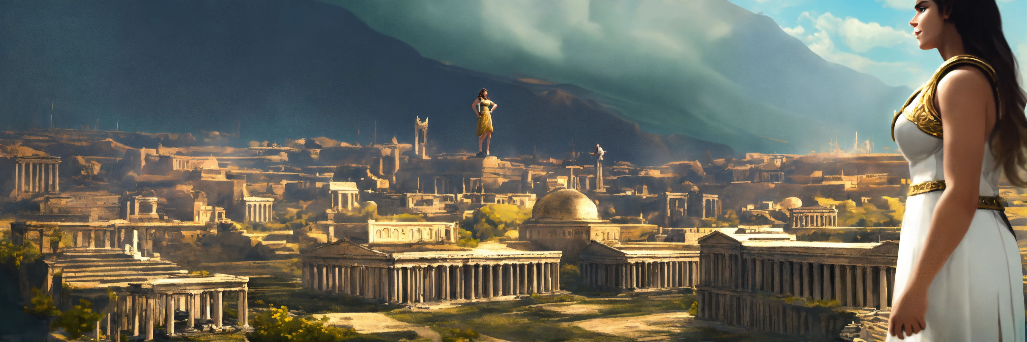 A ((gigantic)) (massive2) ancient greek goddess examines a (((tiny))) model city, tiny citizens gather before her, smirk, minuscule, minute, tiny, archaic, gladiator sandals, (((beautiful))), looming, low angle, bug's eye view, close up, standing, robes, fantasy, active pose, ominous, threatening, spears, violent, dramatic, majestic