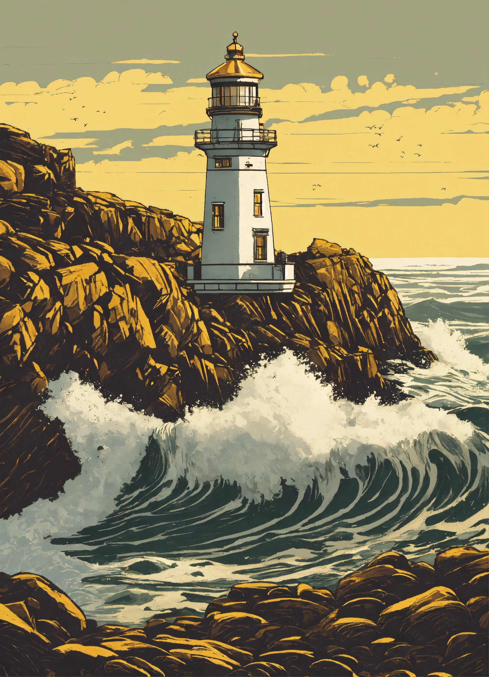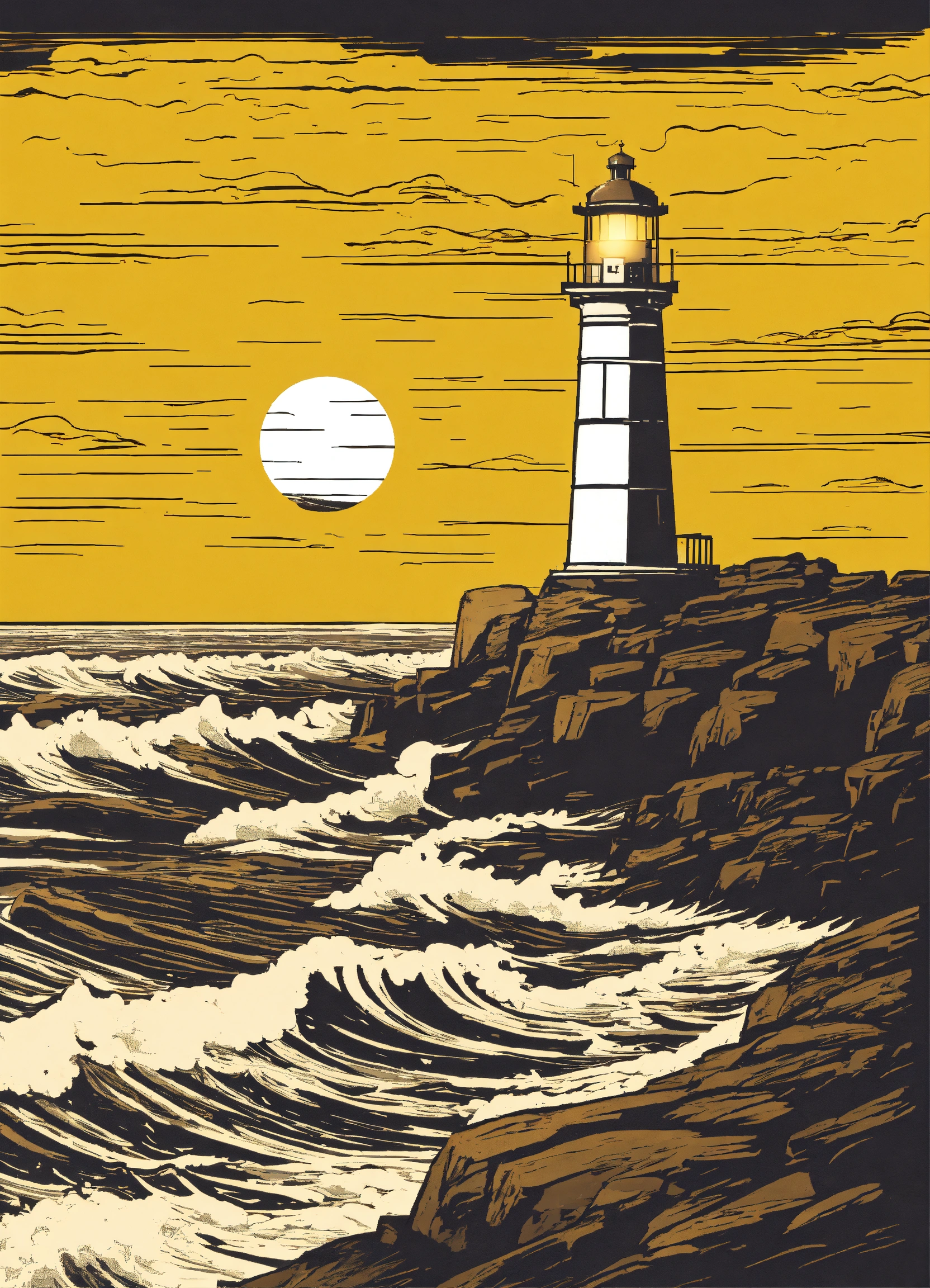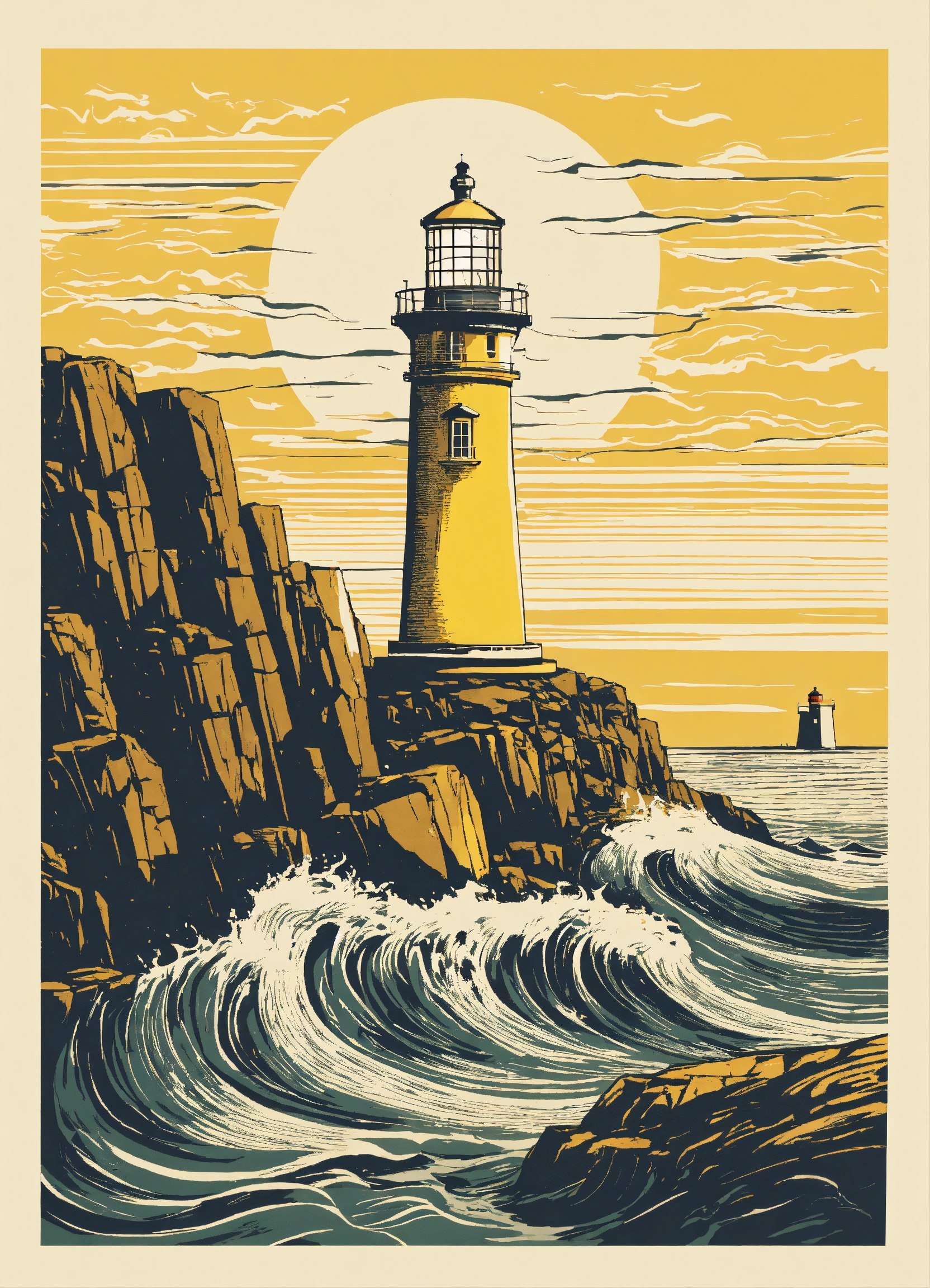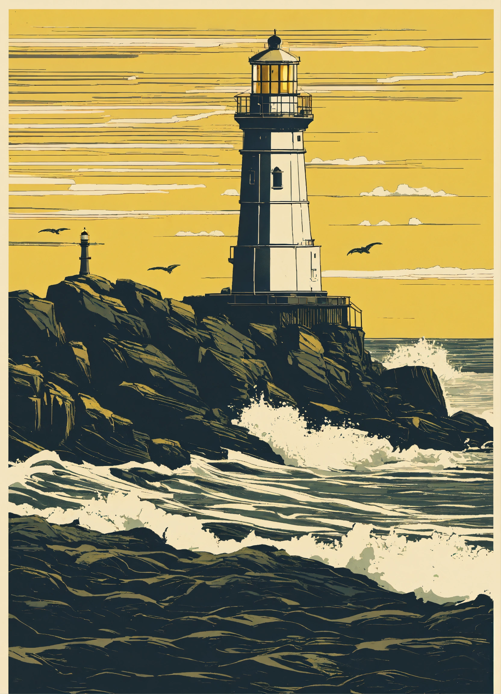 Yellow and white lighthouse standing on a rocky outcrop surrounded with waves letterpress