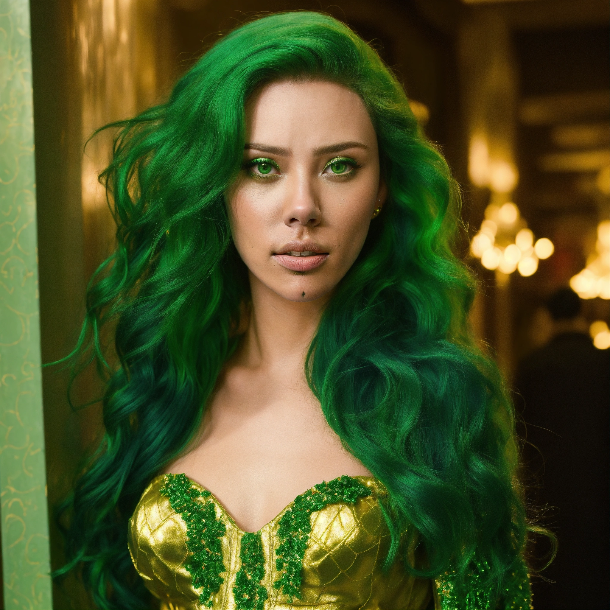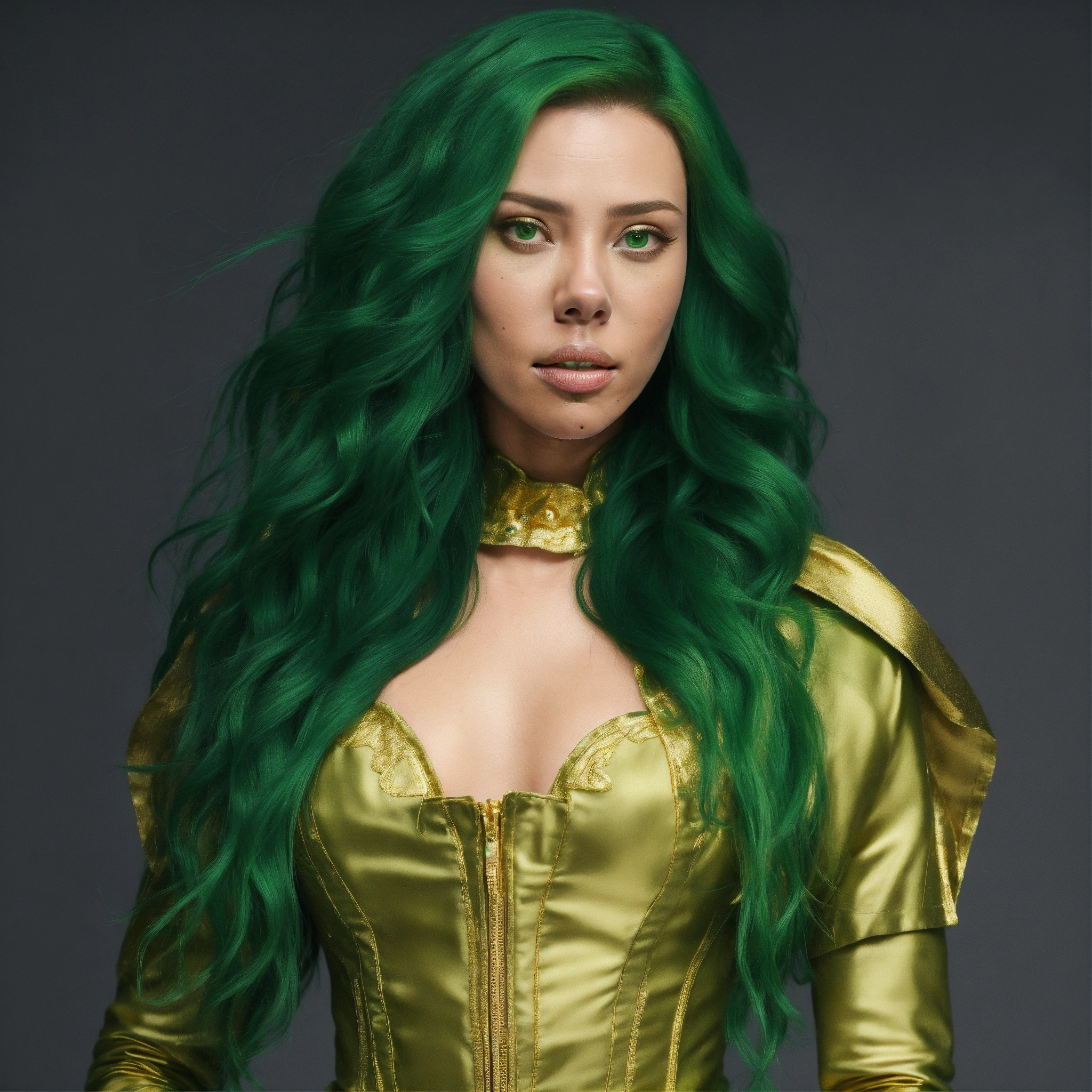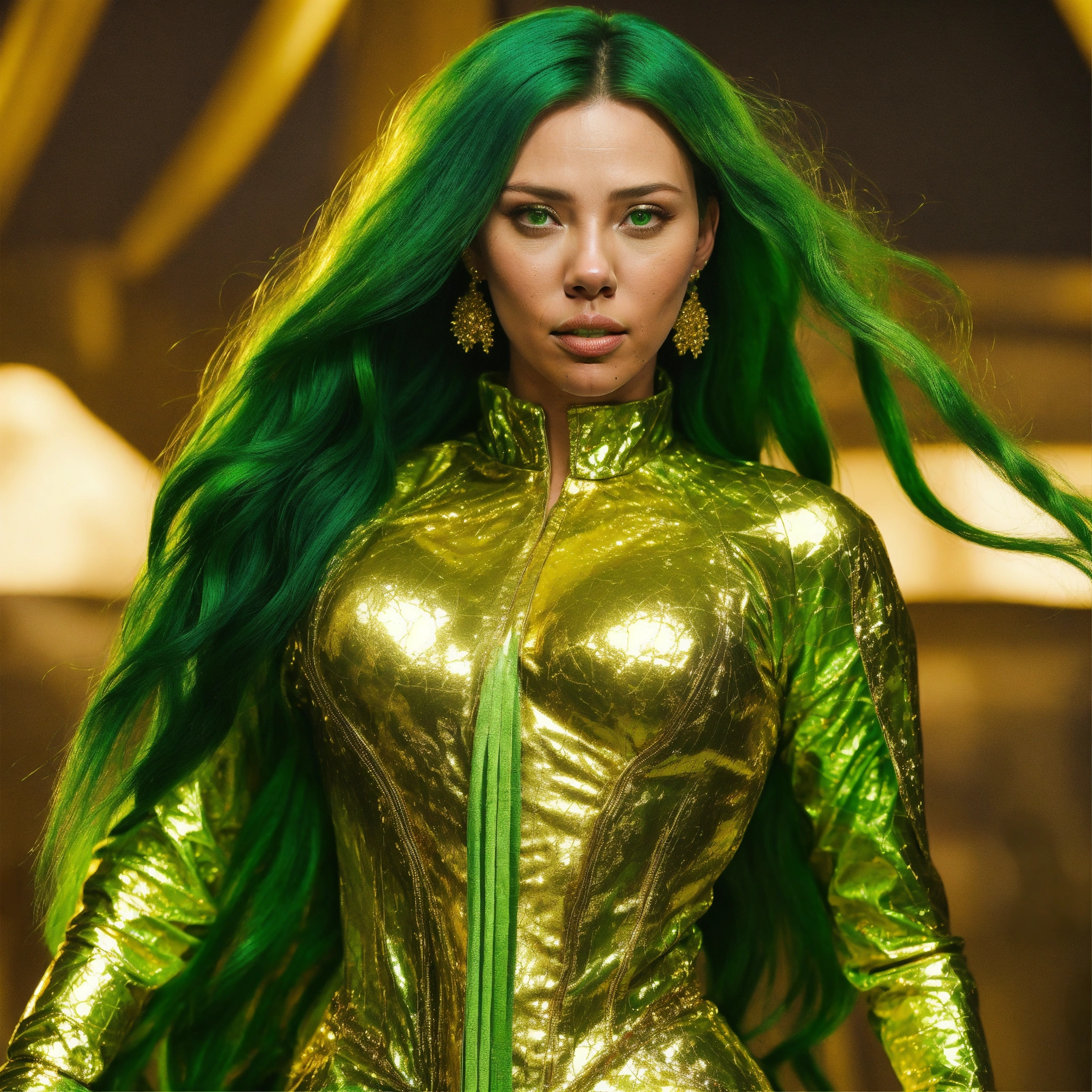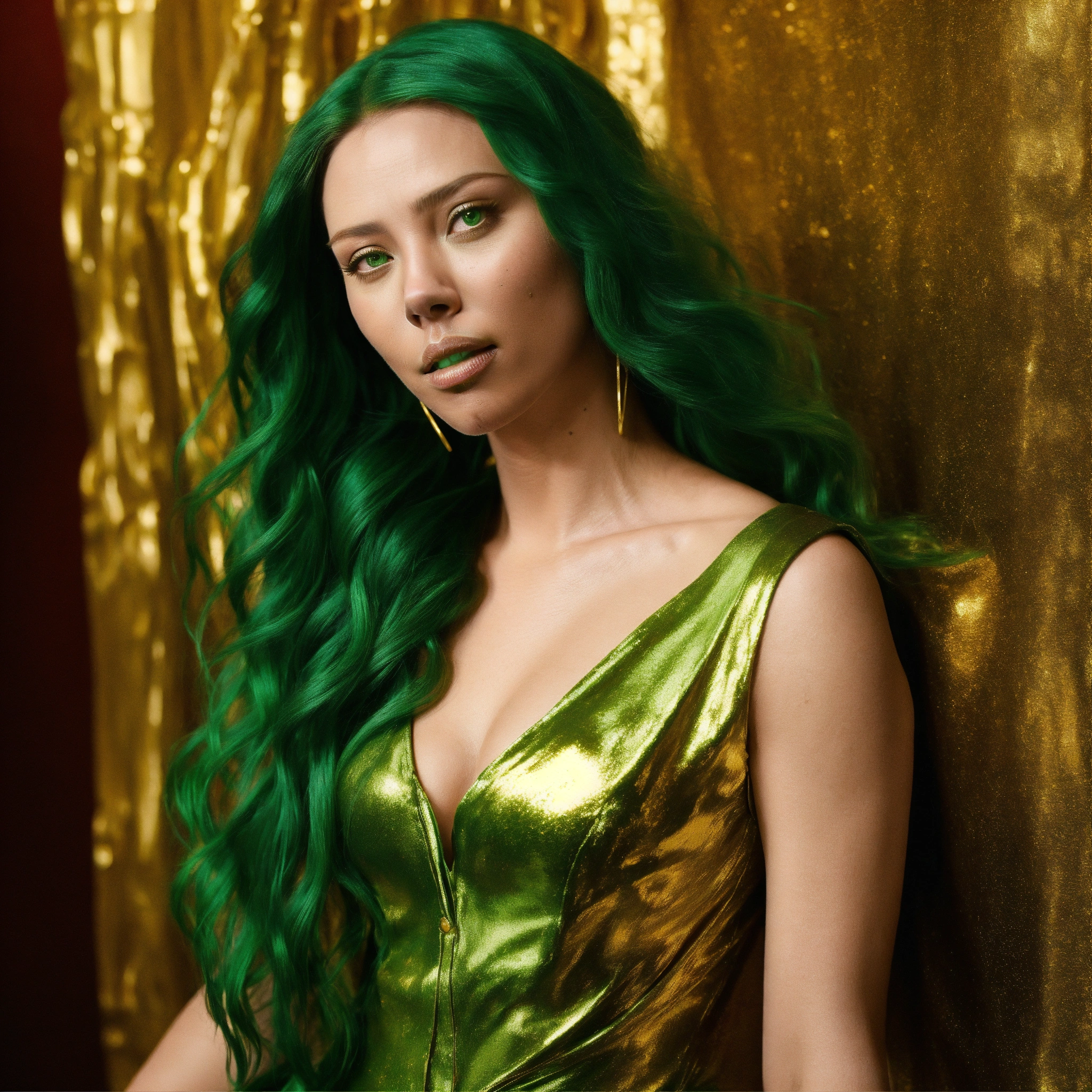 Gold full body scarlett johanssonin with long silky green hair, full body outfit, golden face, green eyes, green makeup, green lips