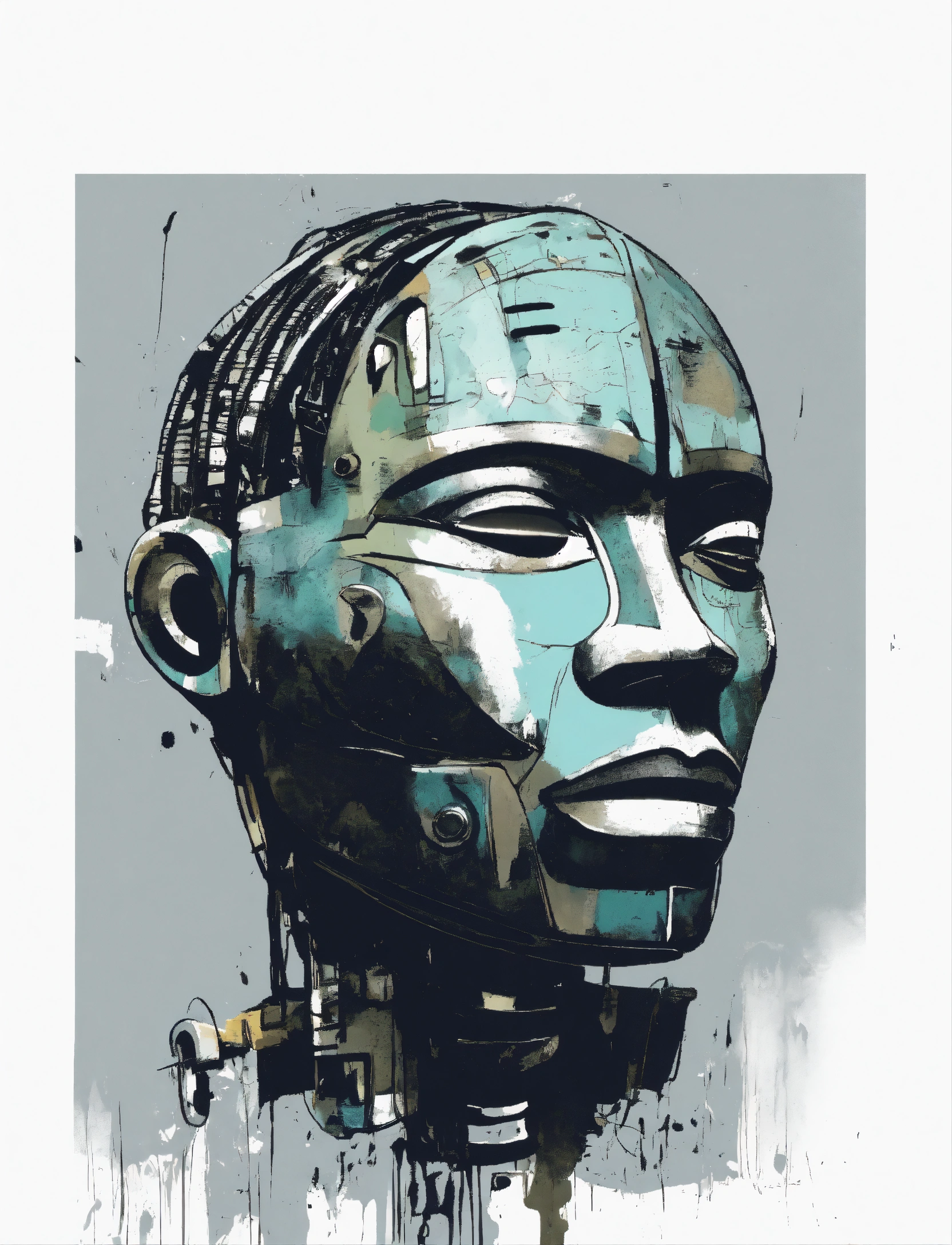 African tribal mask robot comic manga style abstract edgy expressionism simple colors warhol style