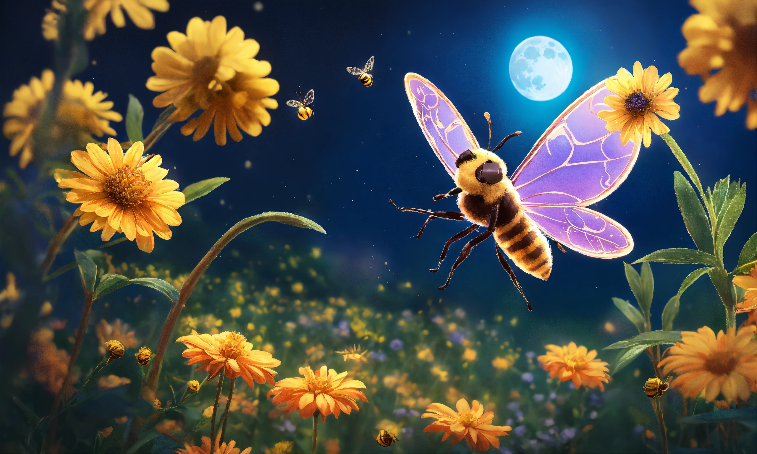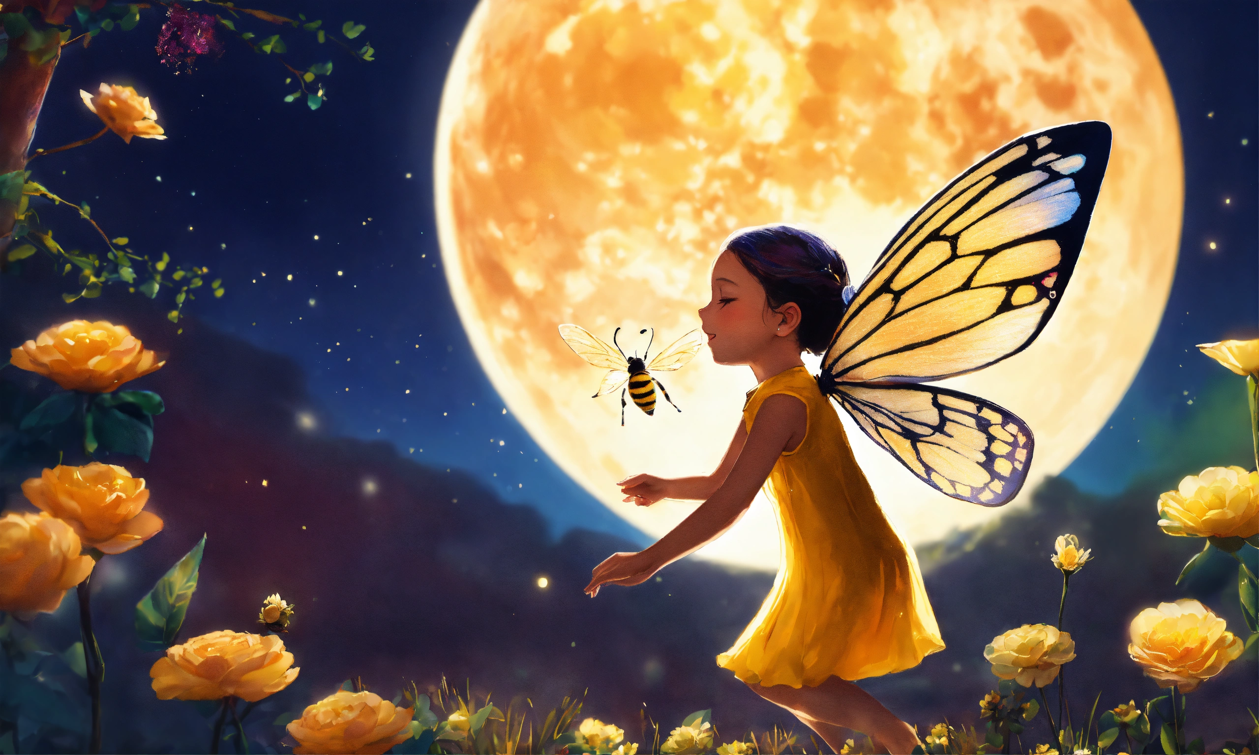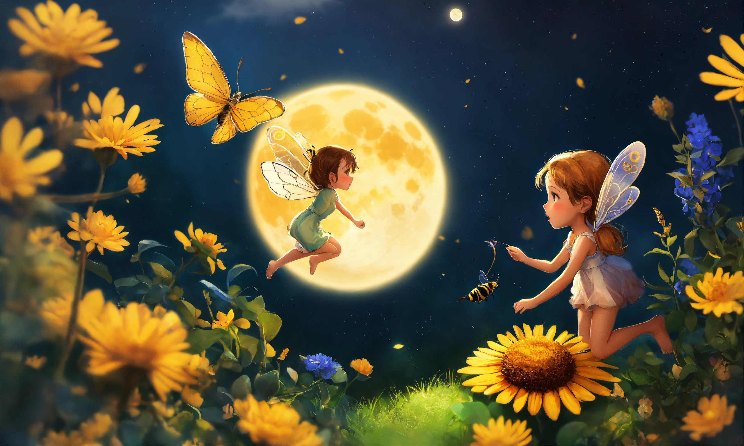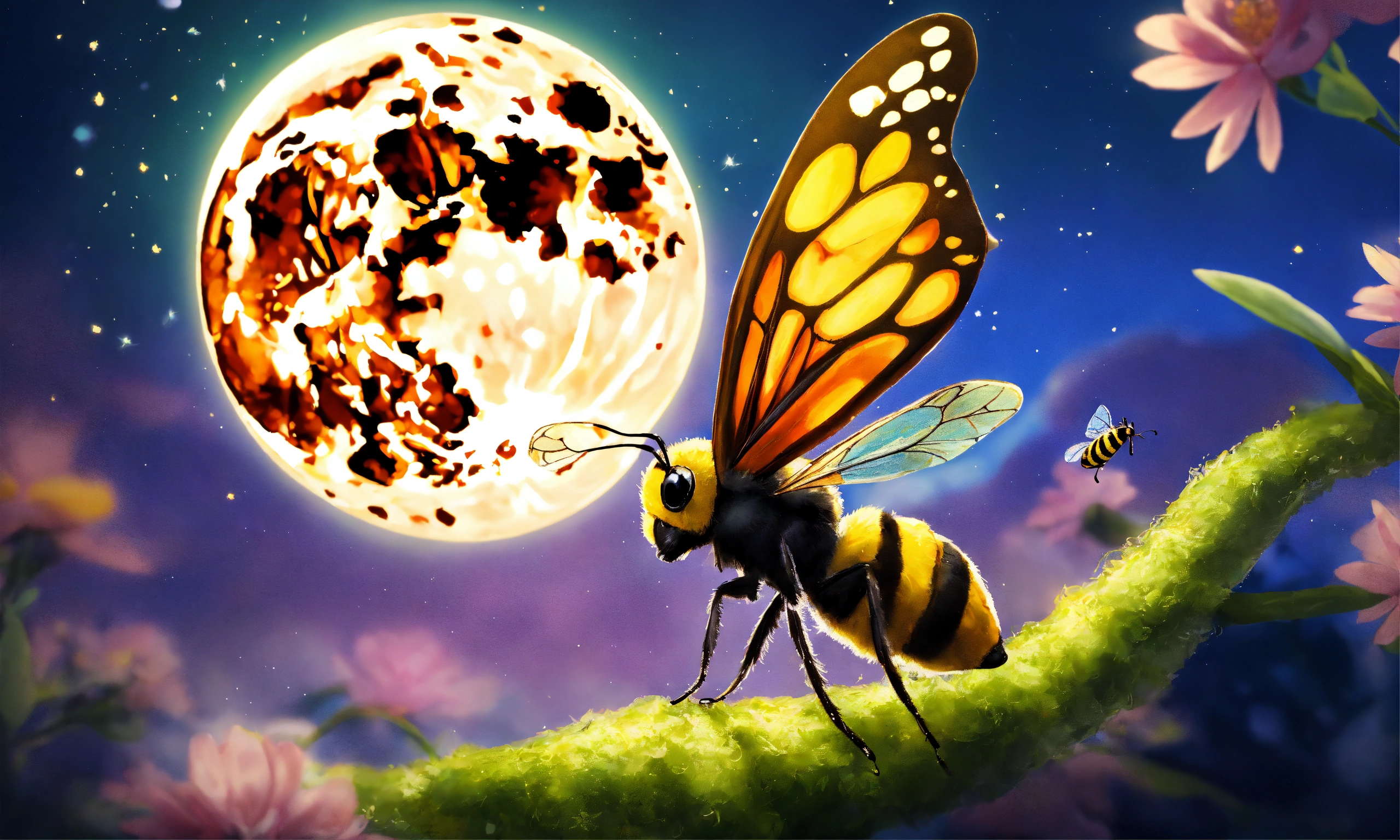La mariposa luna, volando elegantemente junto a la abeja maya, compartiendo su sabiduría, vibrant, dibujo para niños, 8k