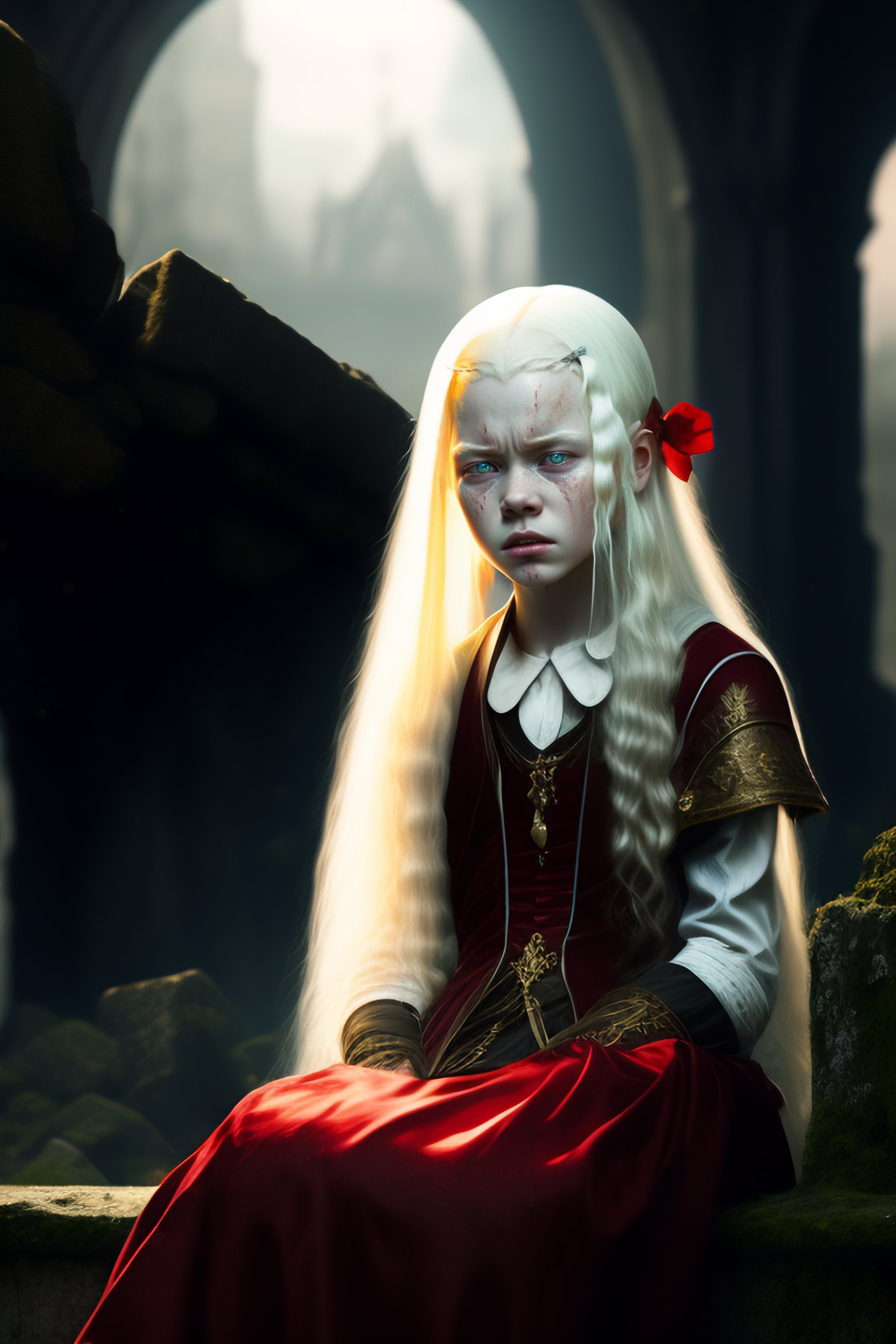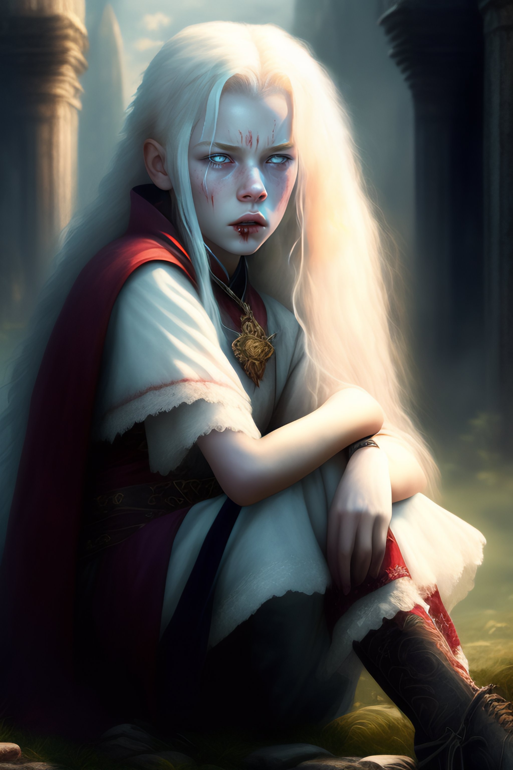 12 years old crying albino vampire female sitting on the floor of a ruined temple, bloody tears, dark gothic environment