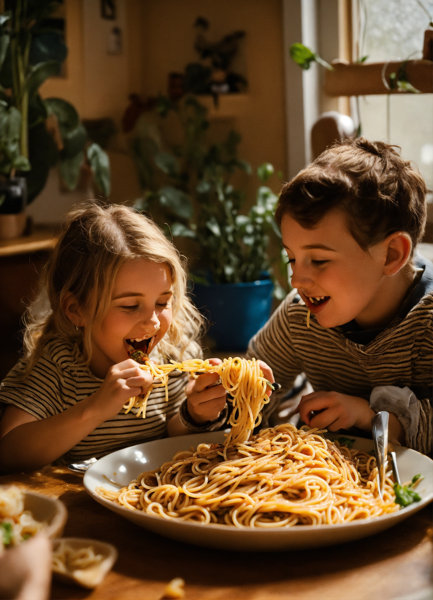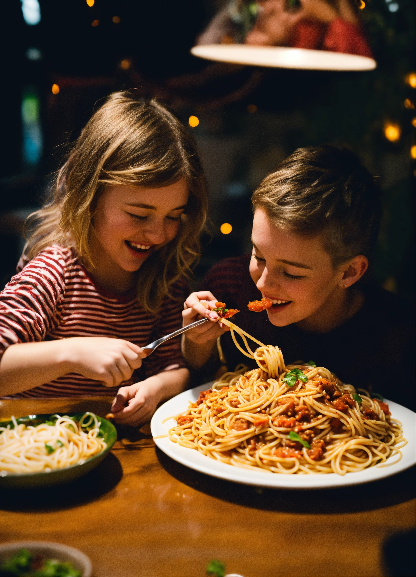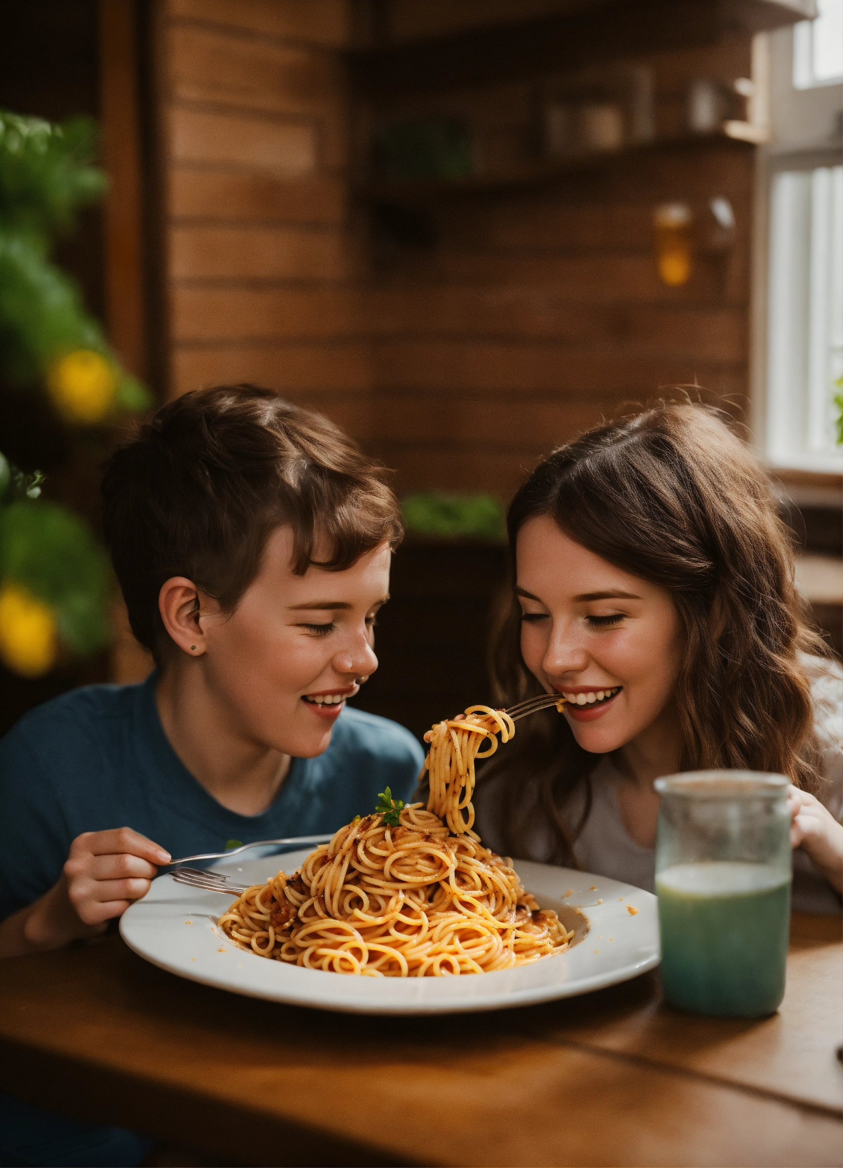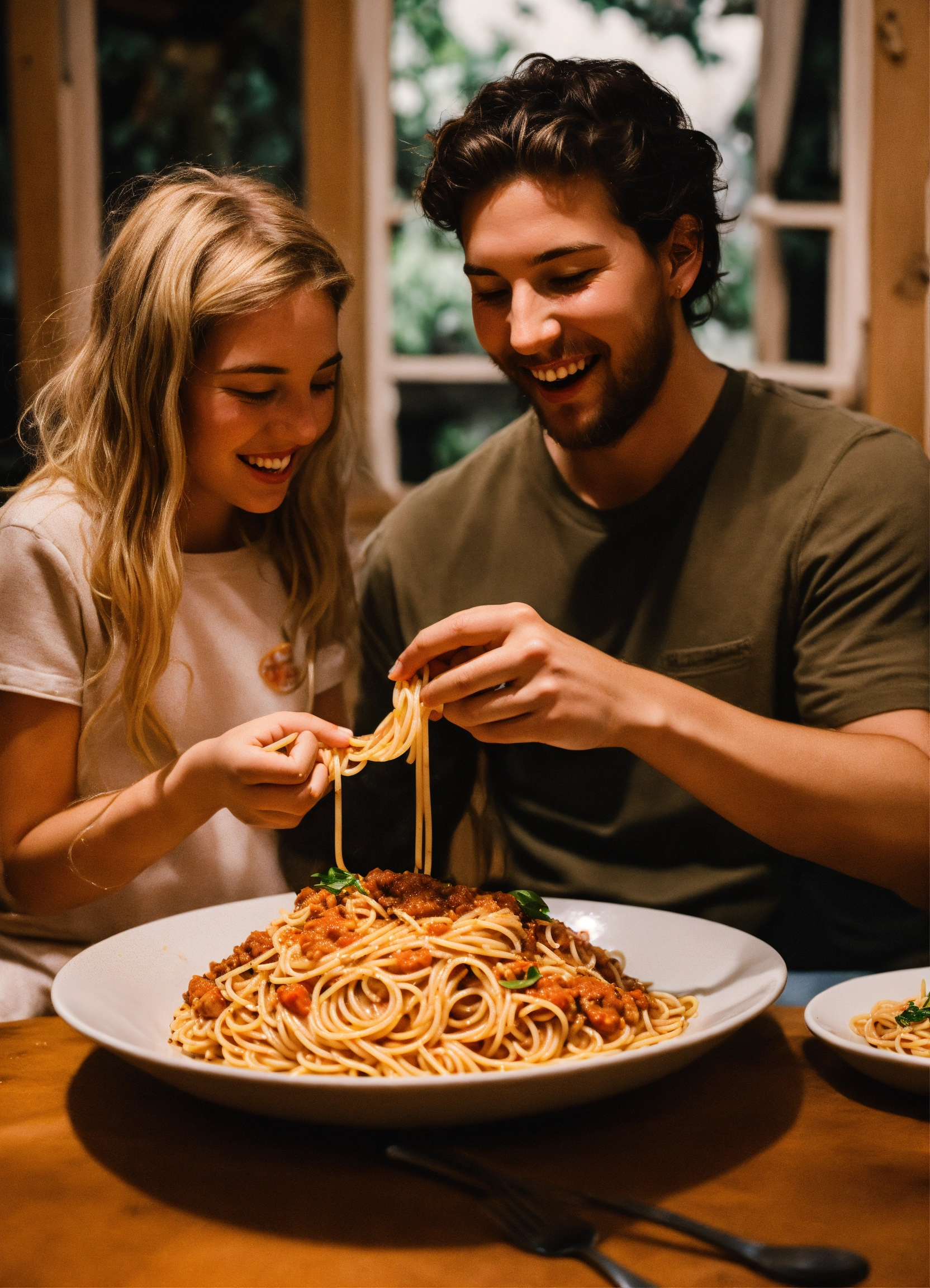 Photo of ellie and joel happily eating spaghetti