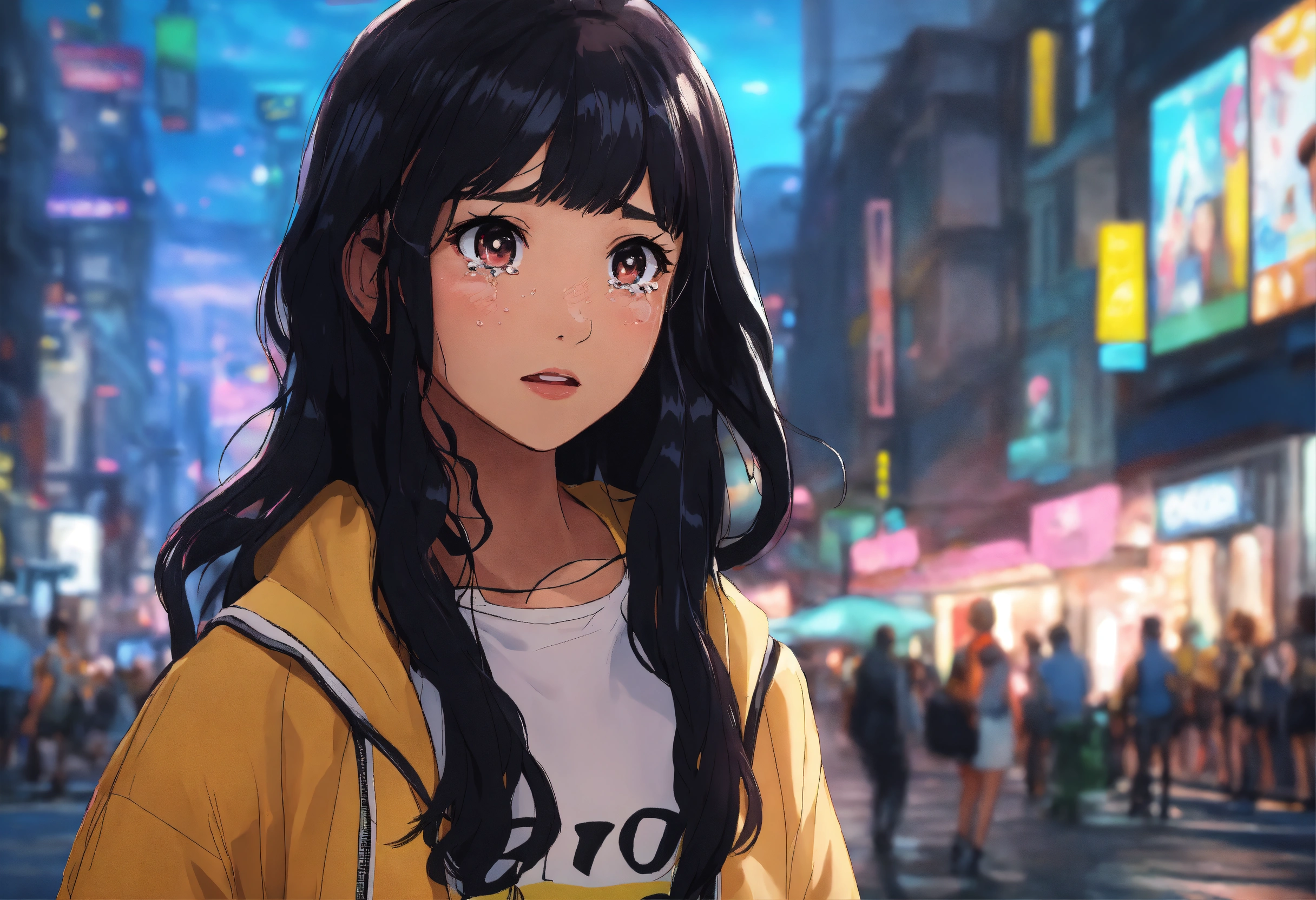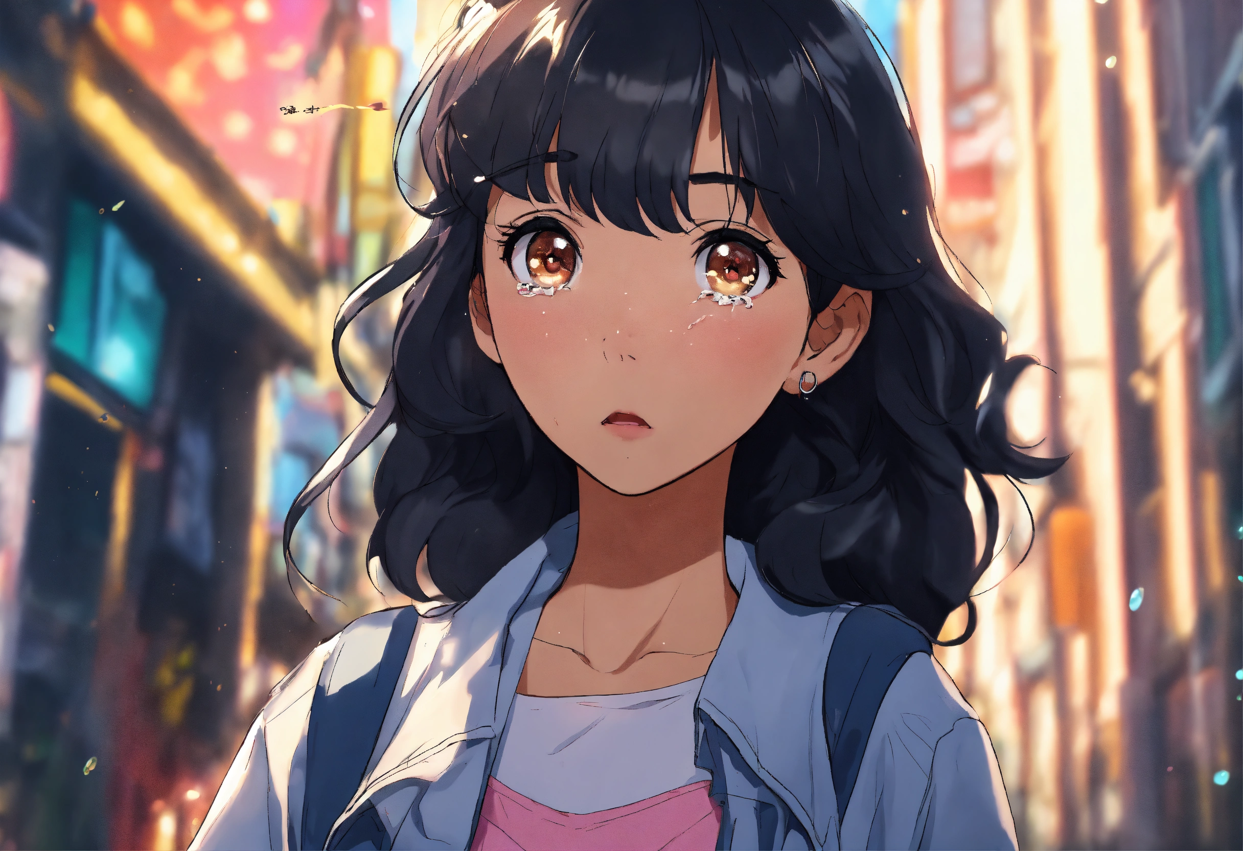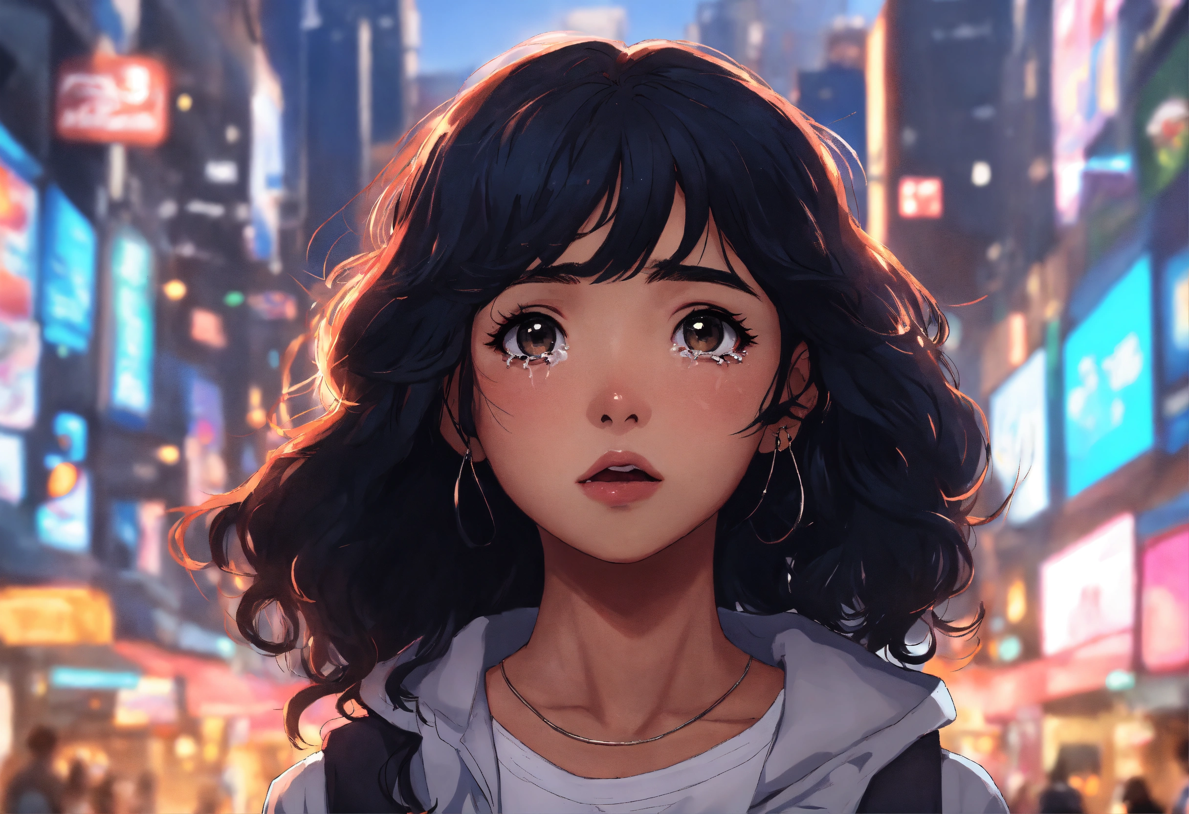 Anime; cartoon; ultra realistic; young girl mixed race, named laura rijo, wavy black hair; in a anime city, ultra realistic, toca boca life world perfect, no imperfection, 4k, shocked, crying